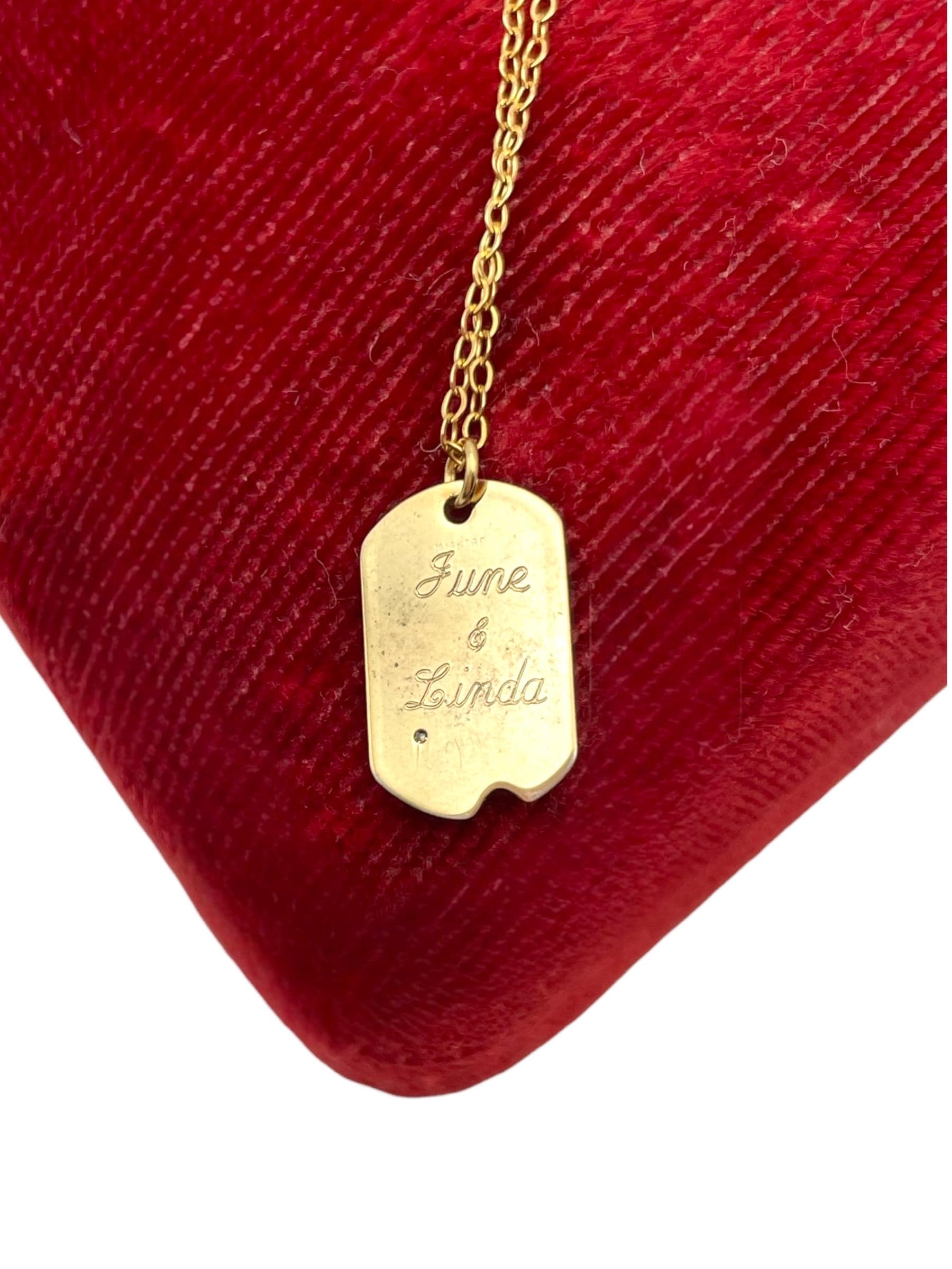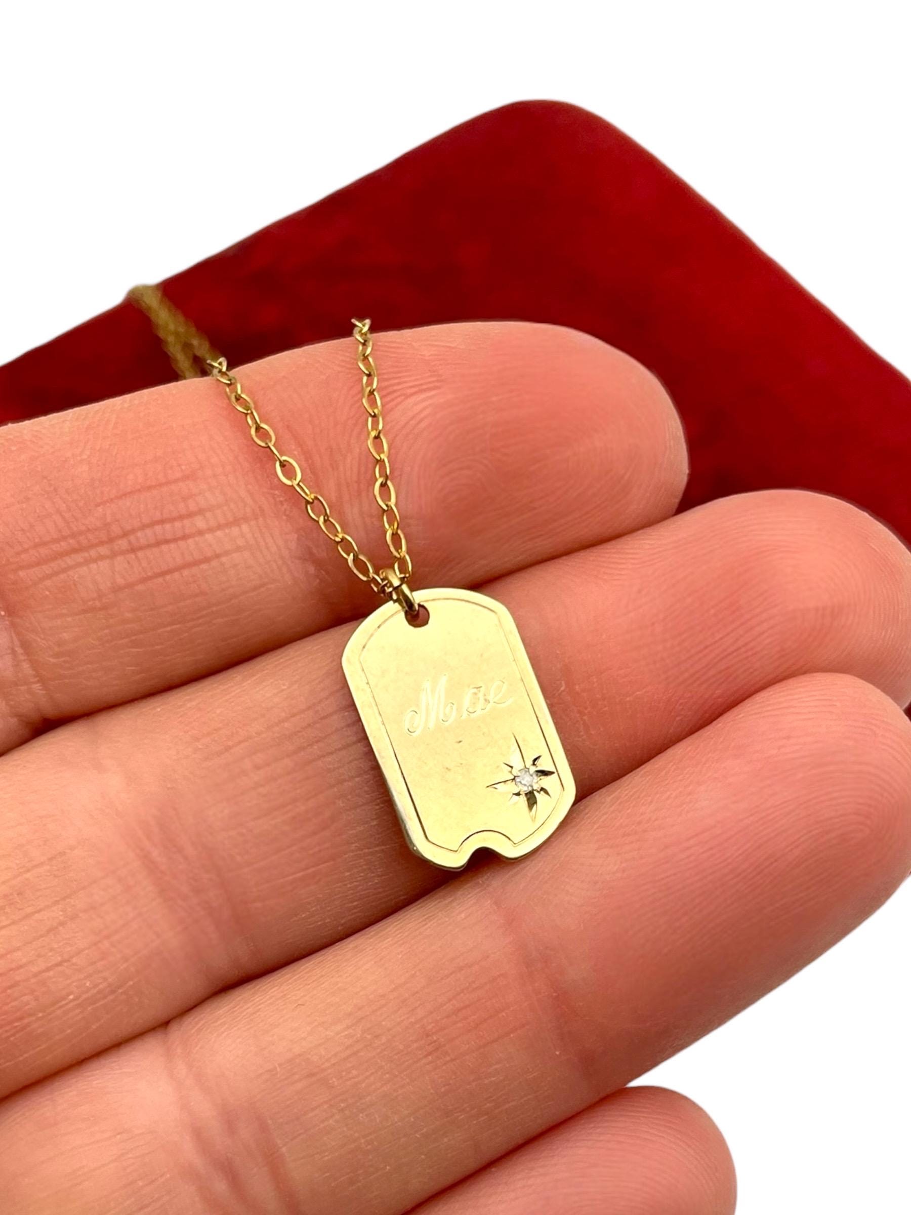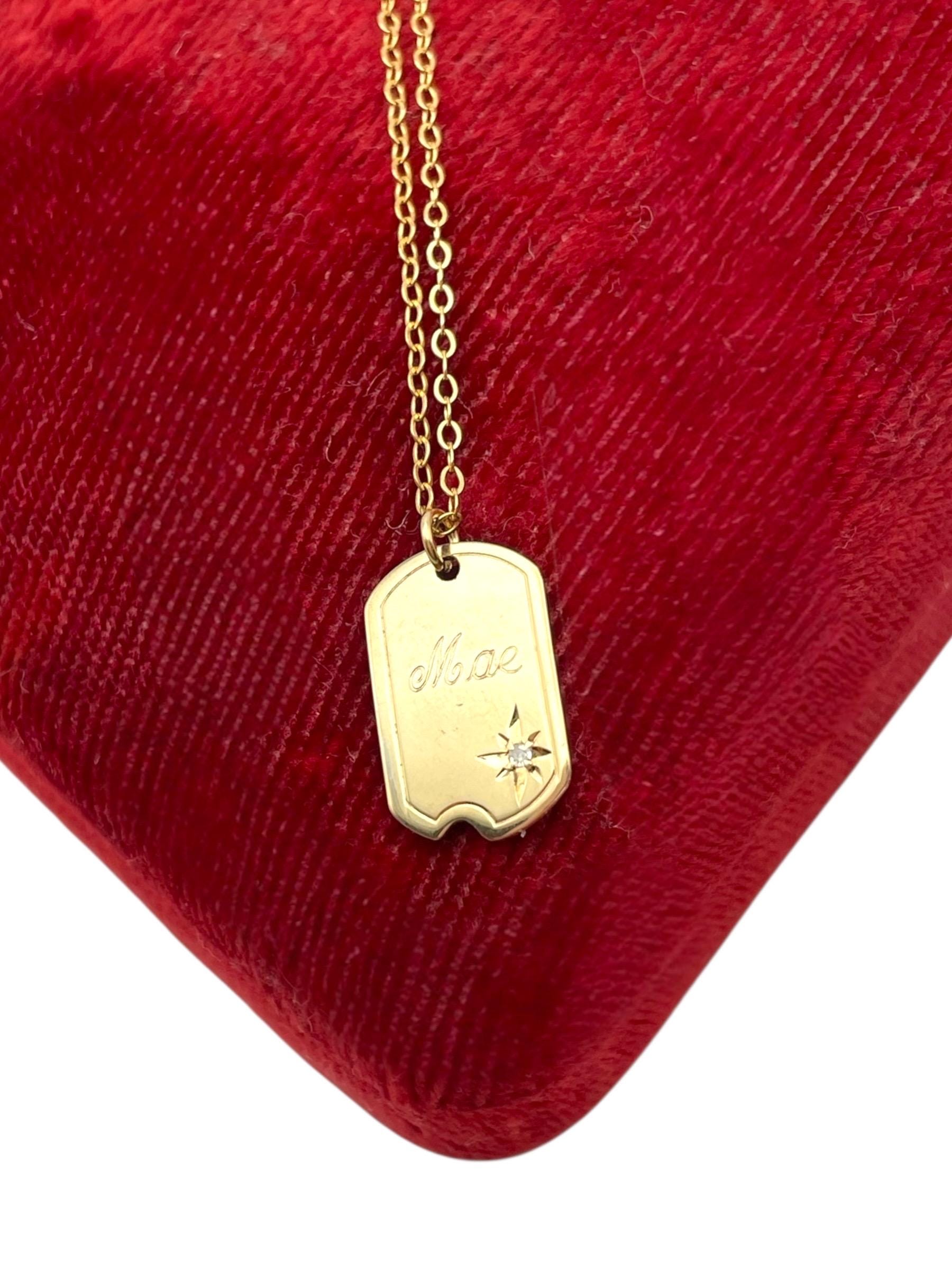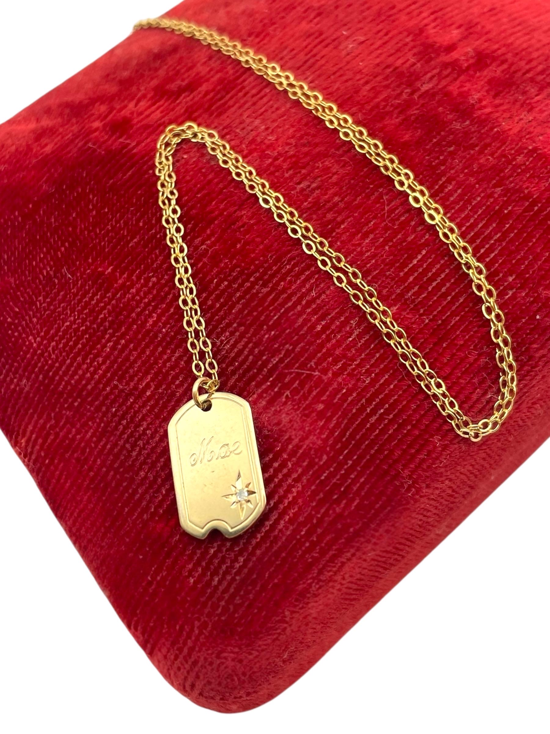 Vintage Gold Dog Tag - 14K Gold Filled Pendant with Name "Mae" Diamond Chip on 14K GF Chain 1950s Jewelry