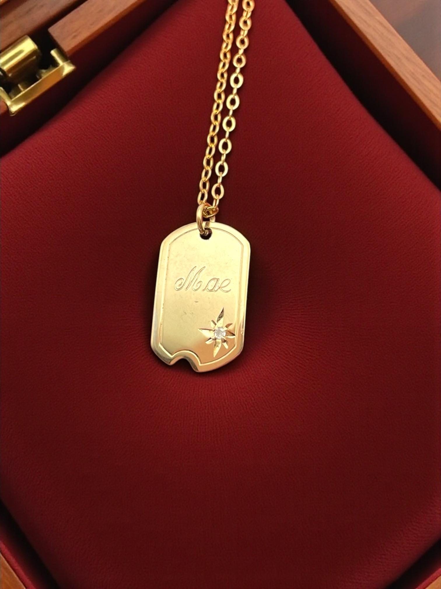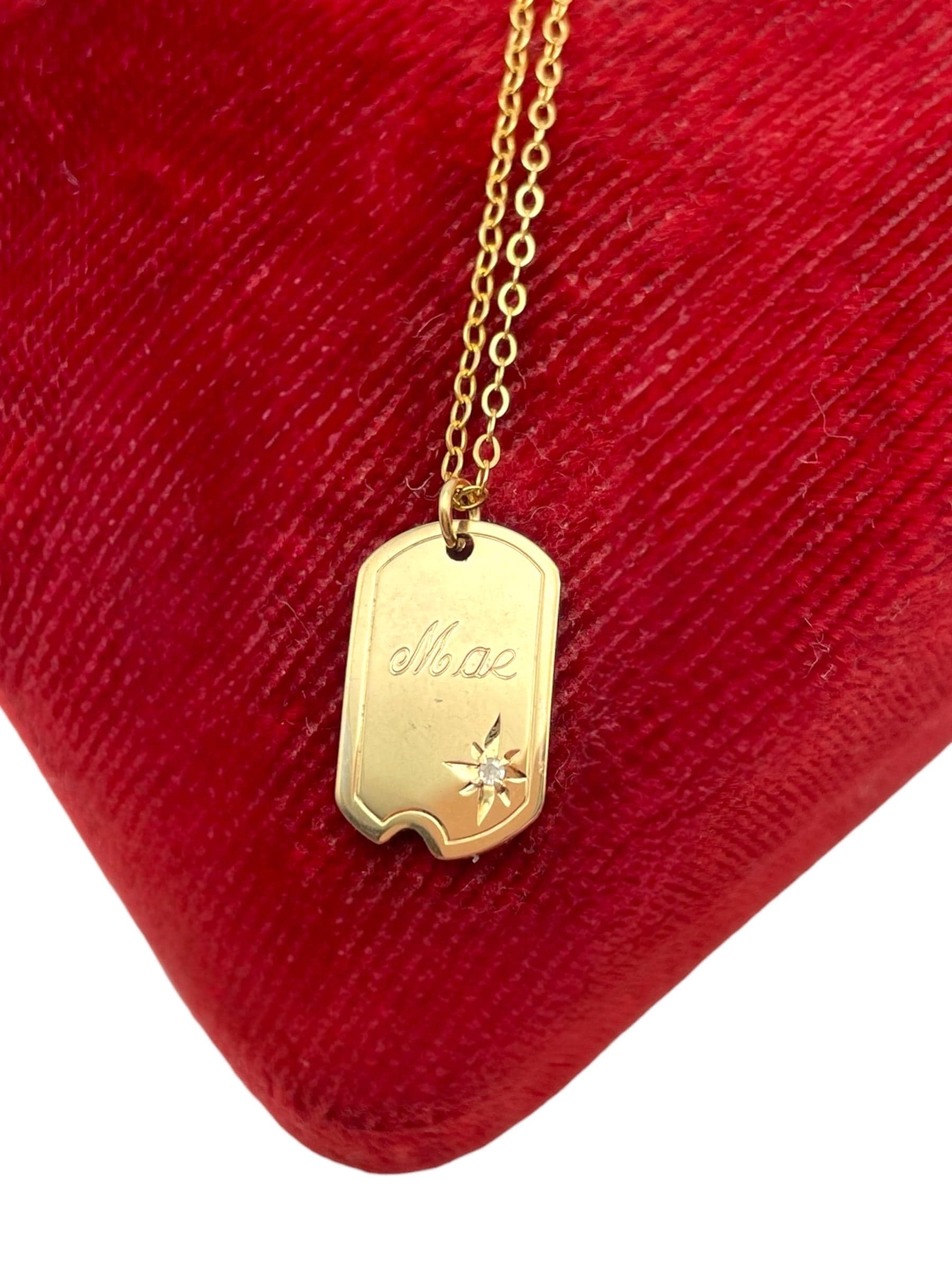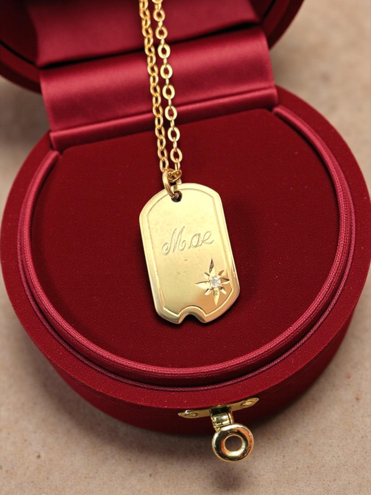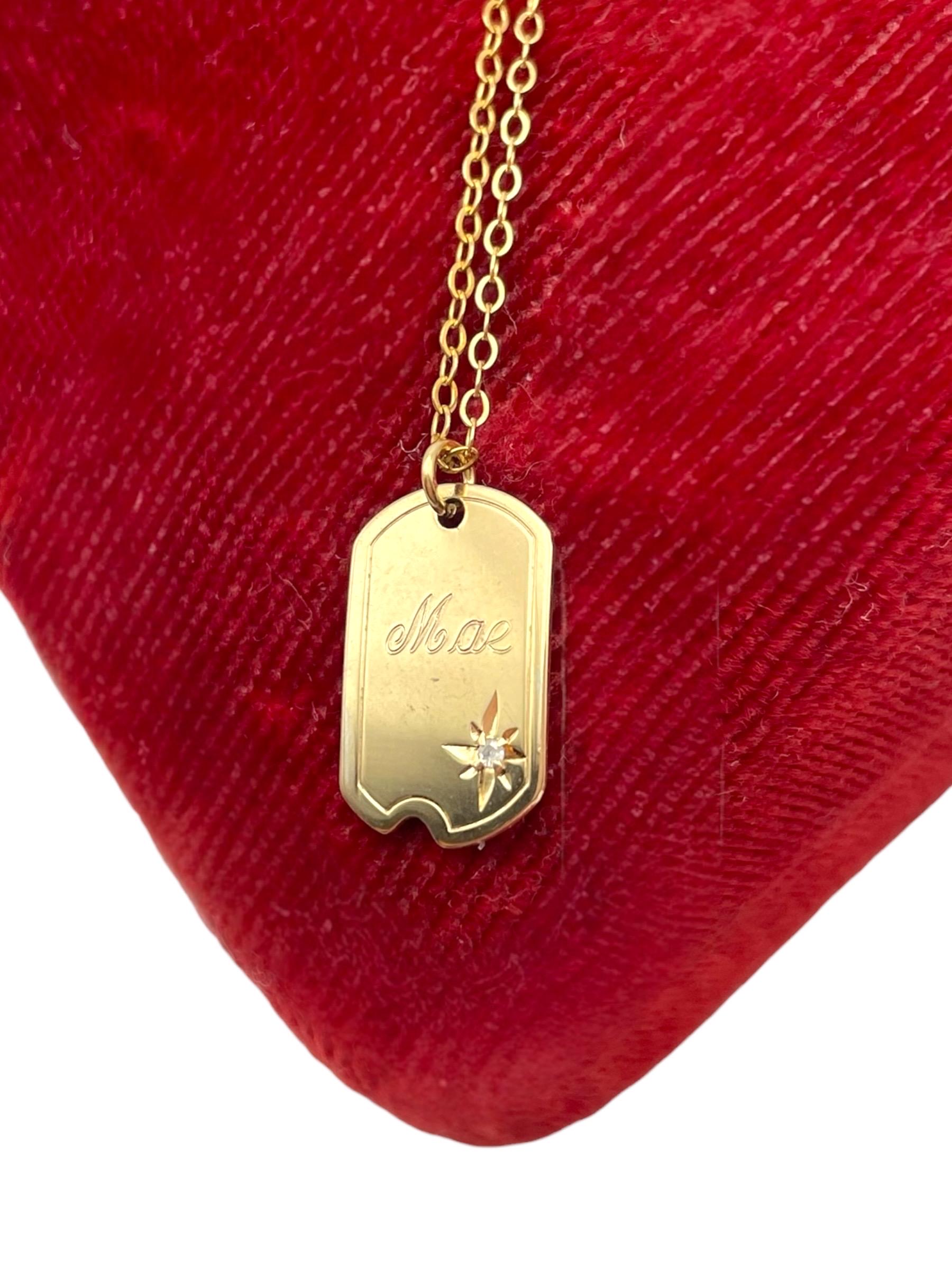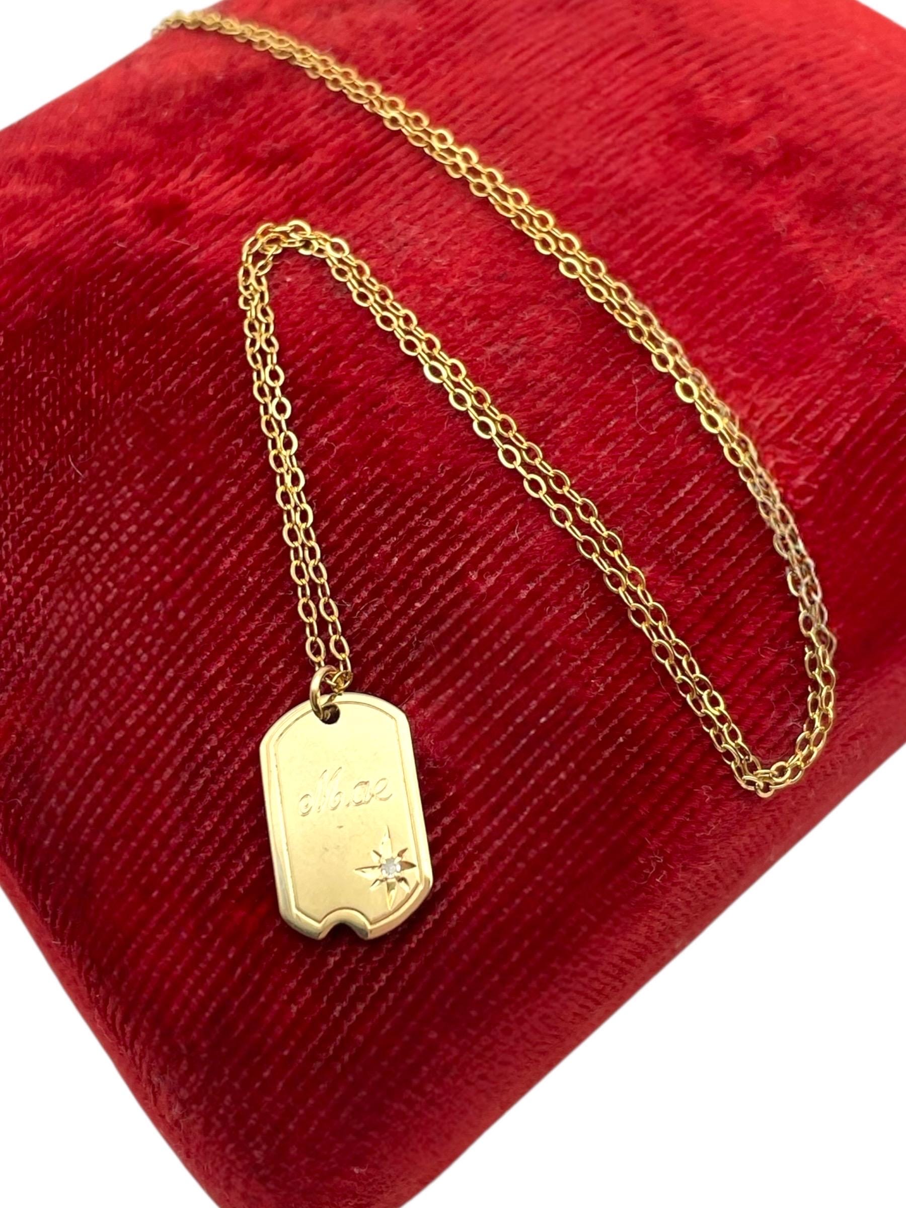 Vintage Gold Dog Tag - 14K Gold Filled Pendant with Name "Mae" Diamond Chip on 14K GF Chain 1950s Jewelry