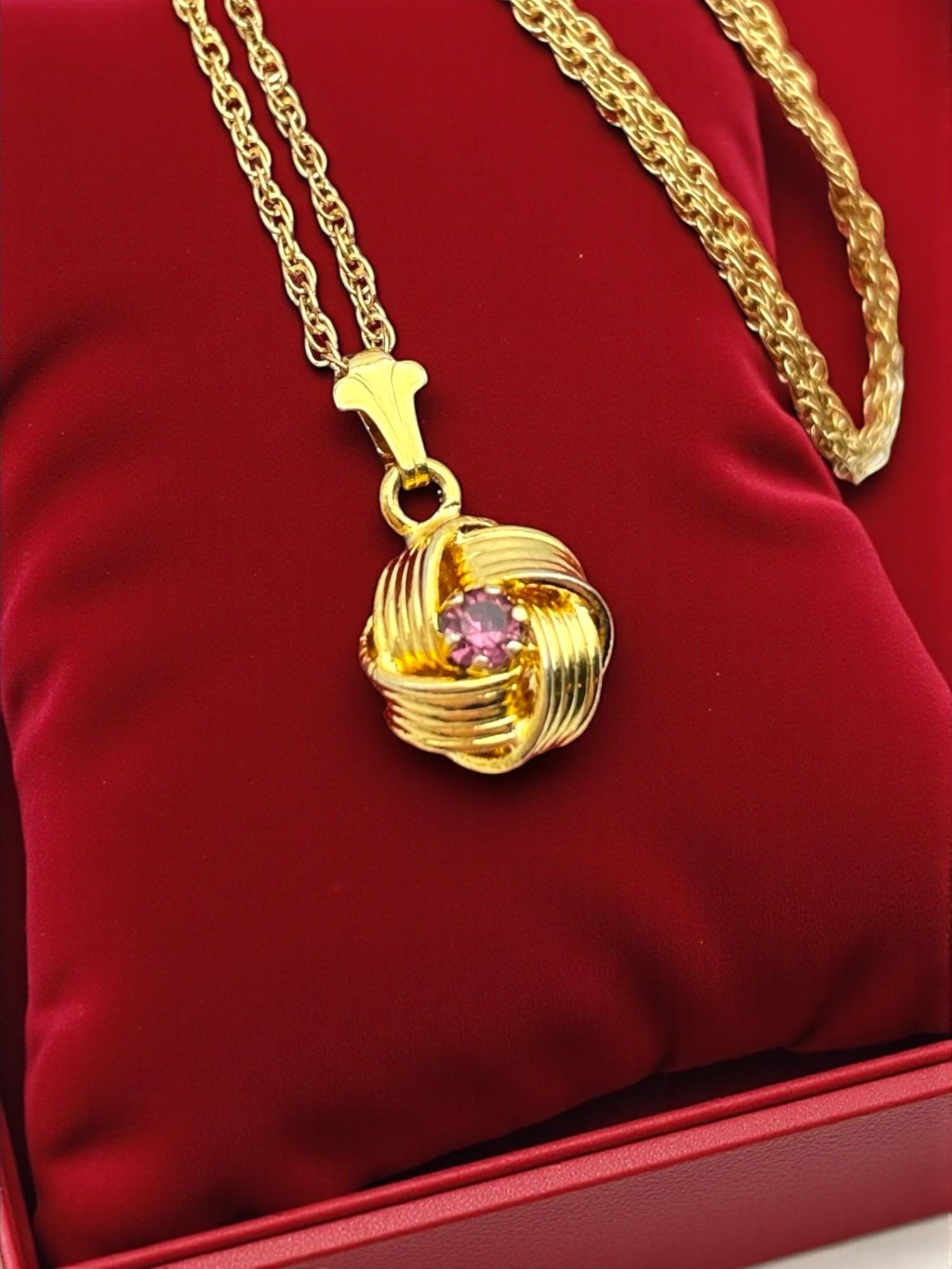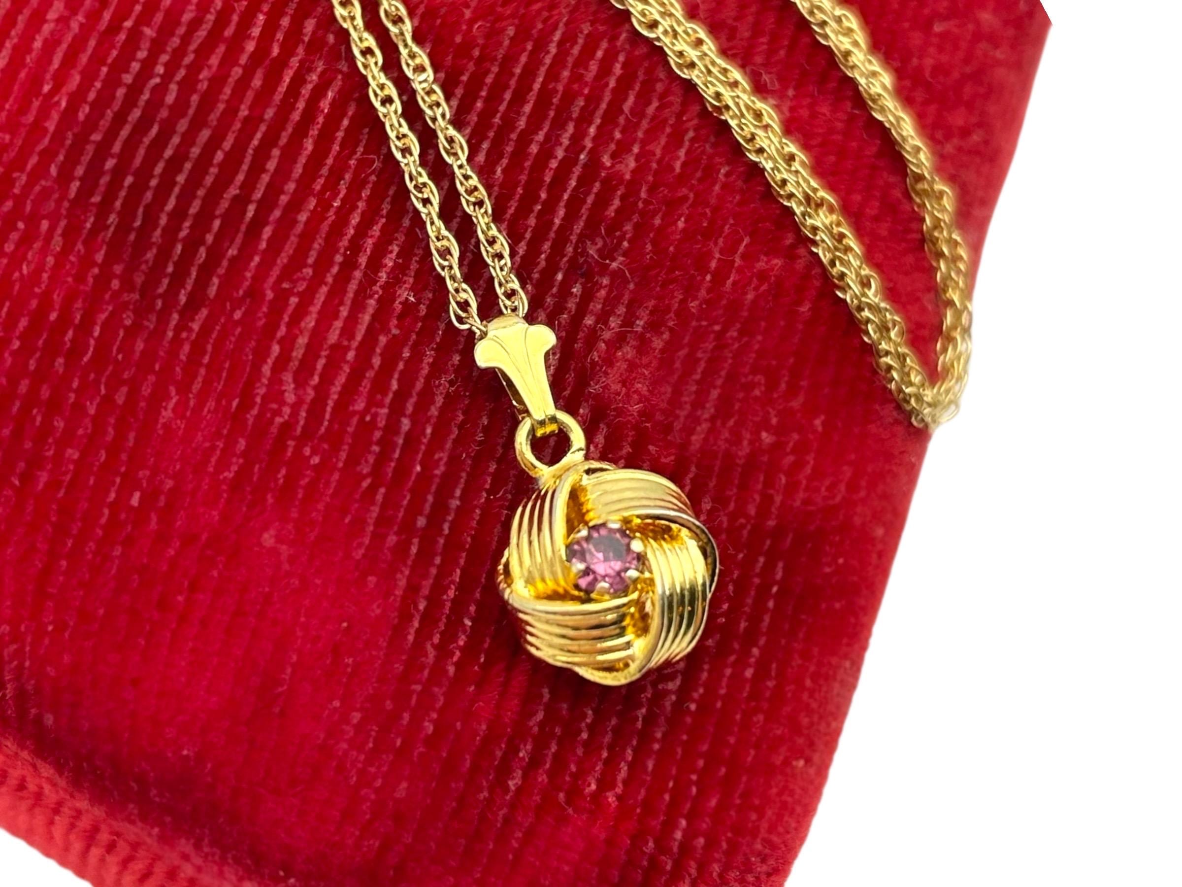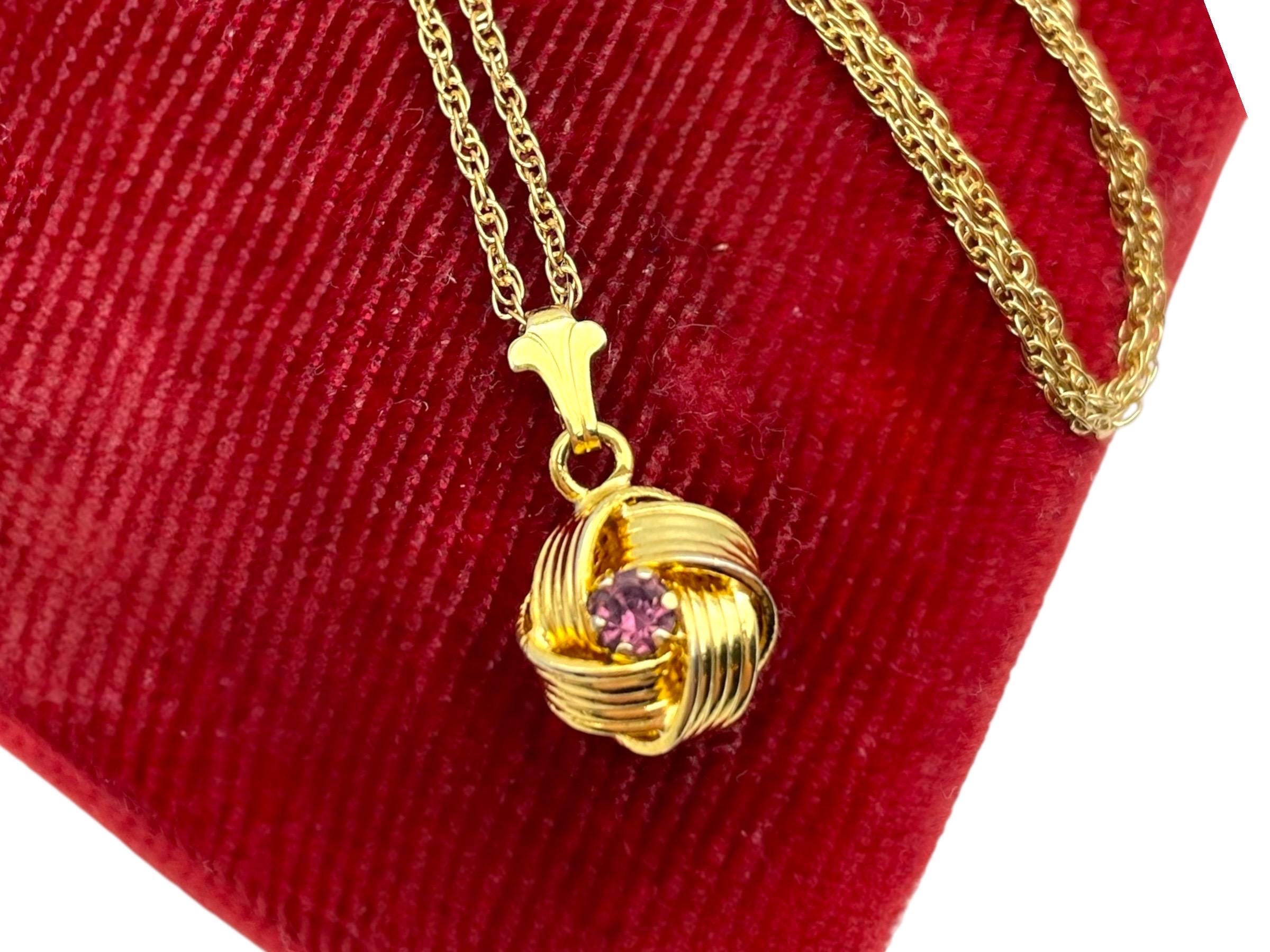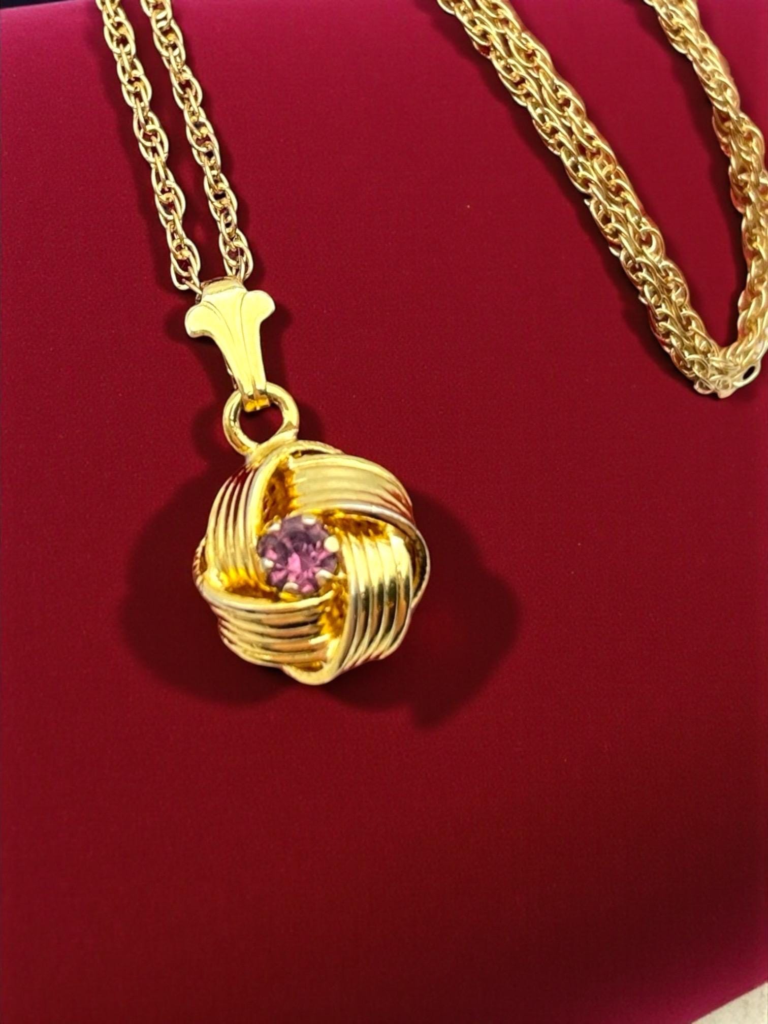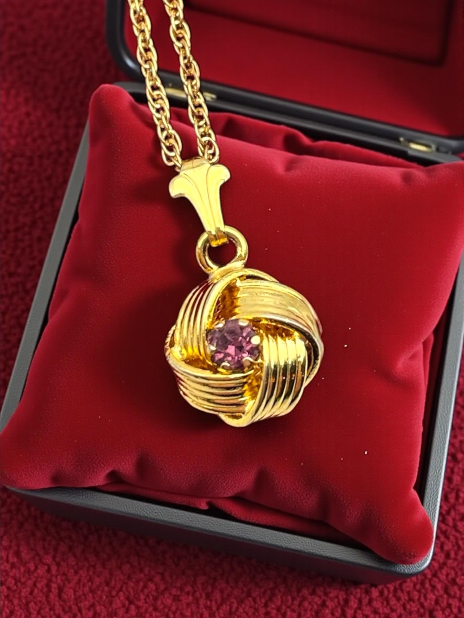 Description: Beautiful gold colored pendant with purple rhinestone center. Love knot is gold tone metal, chain is gold filled. A love knot is a symbolic design, often found in jewelry, representing eternal love, commitment, and connection, characterized by intricate, interwoven loops with no beginning or end, similar to an infinity symbol, and has roots in ancient cultures (Roman, Celtic) as tokens of affection and protection.