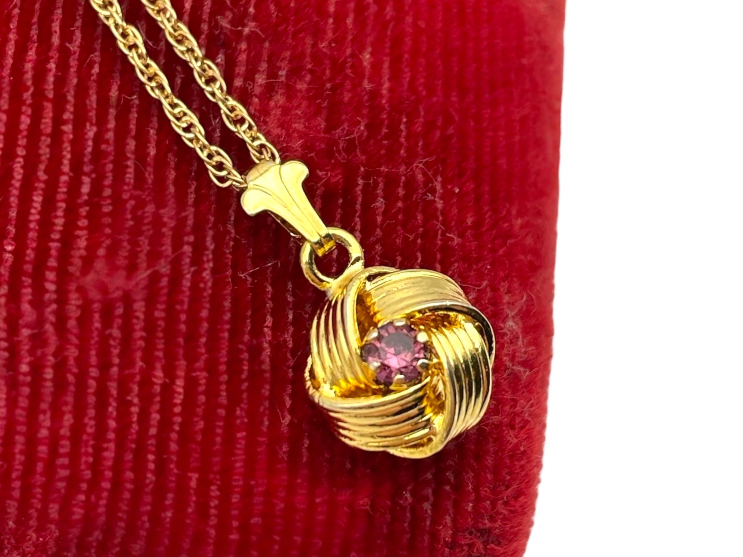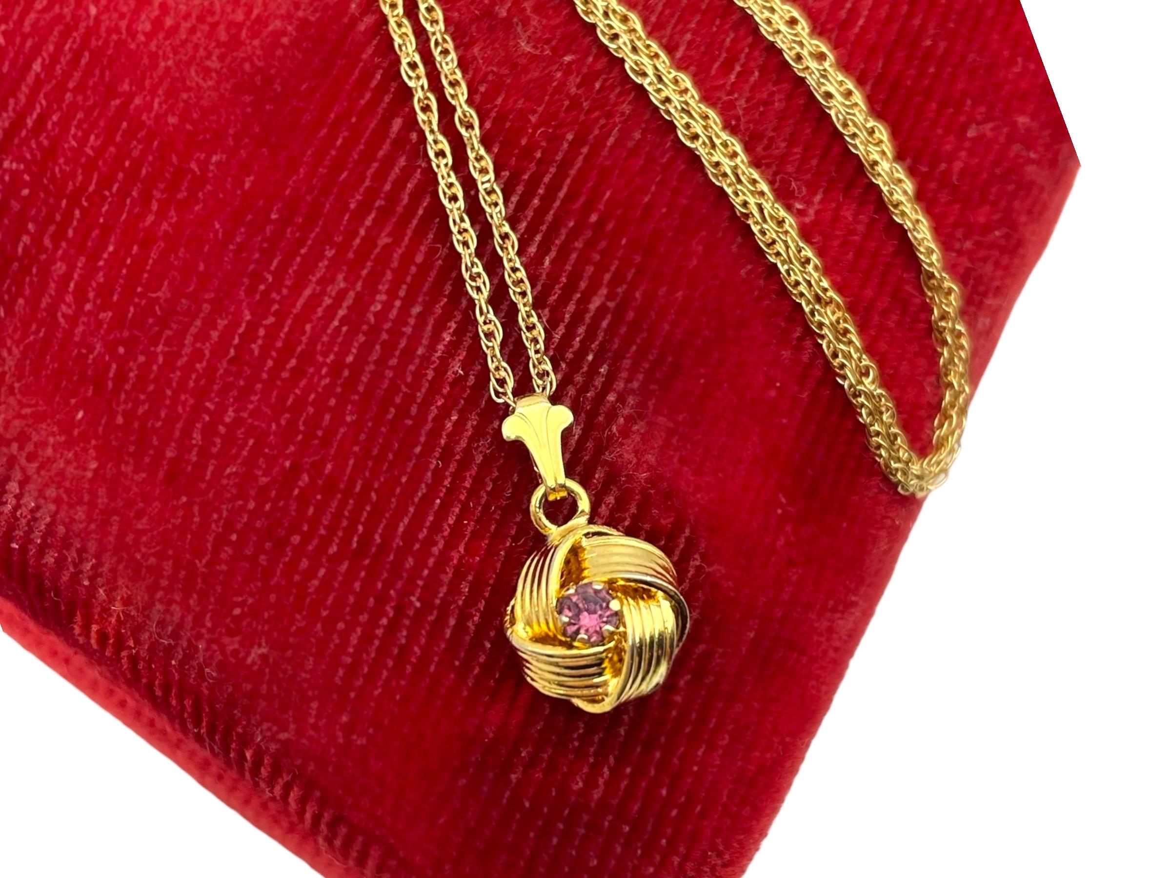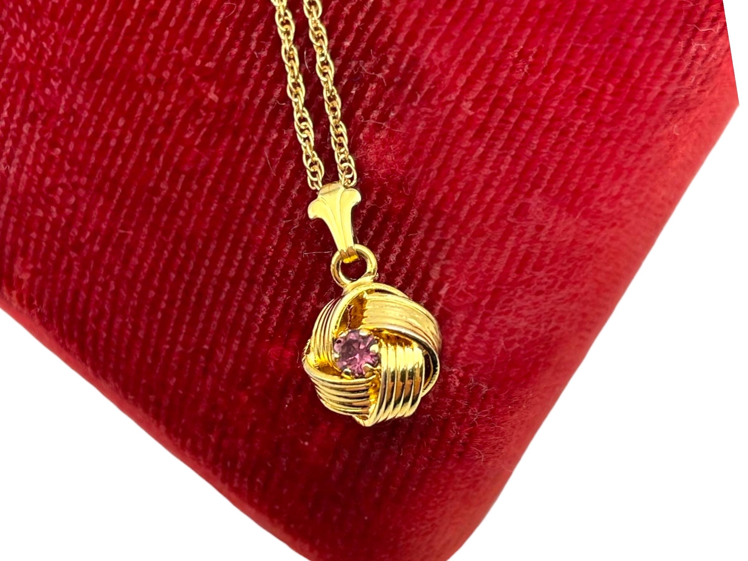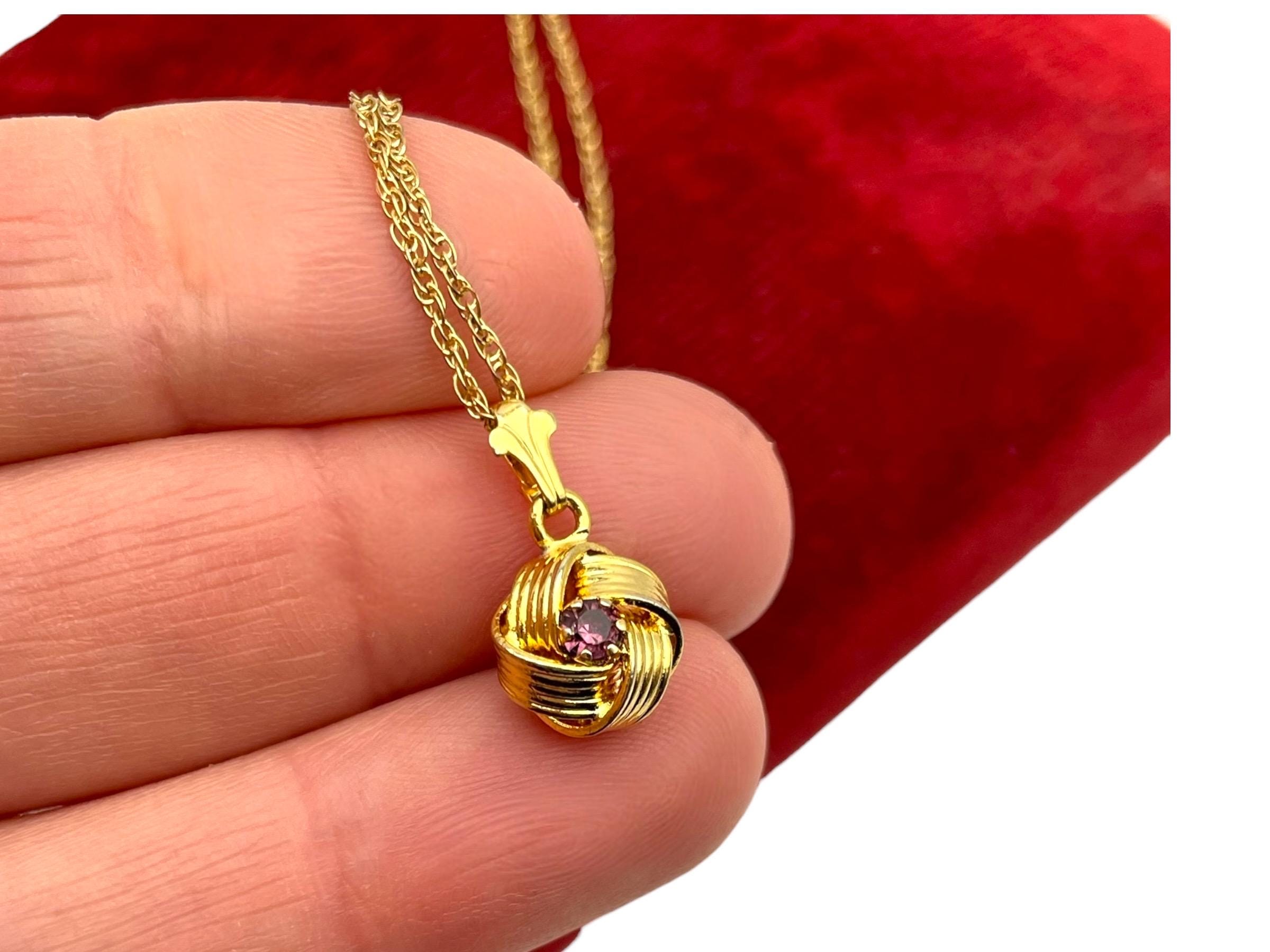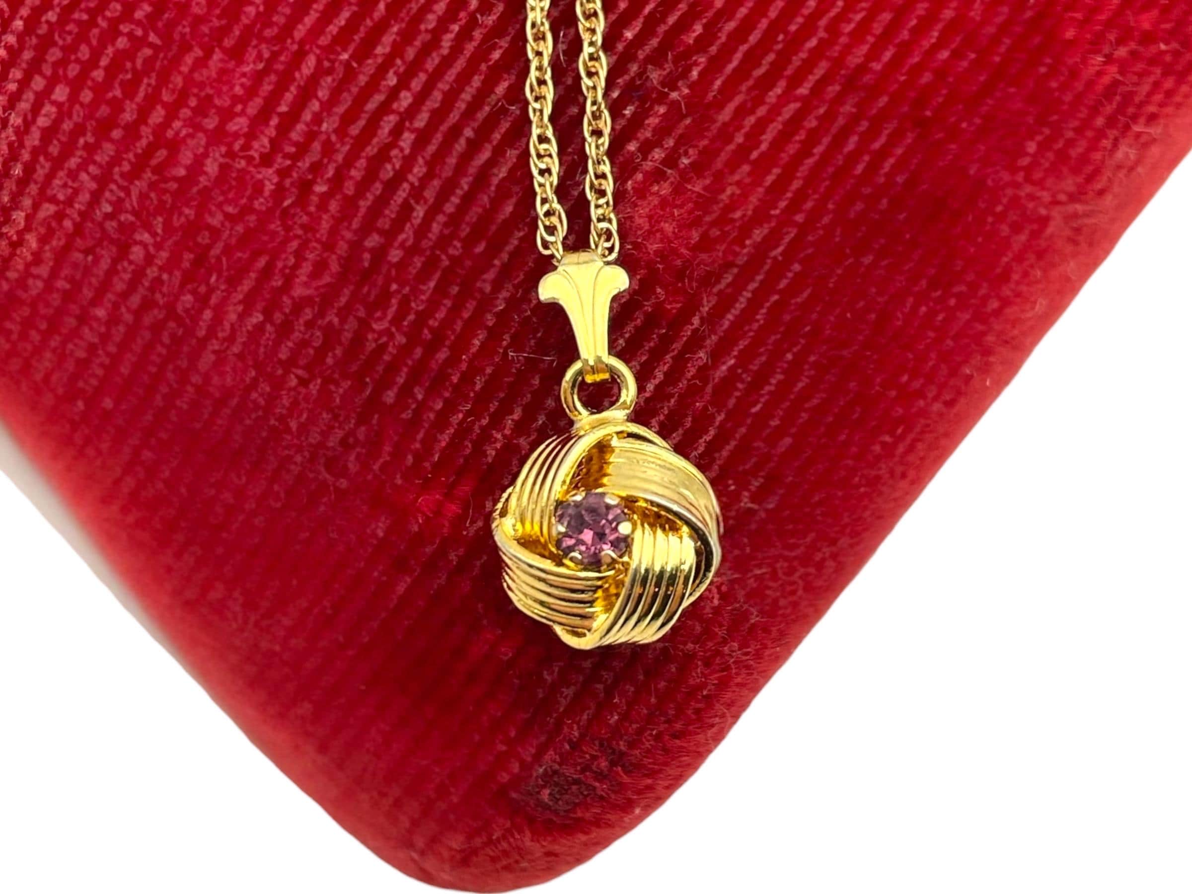 Description: Beautiful gold colored pendant with purple rhinestone center. Love knot is gold tone metal, chain is gold filled. A love knot is a symbolic design, often found in jewelry, representing eternal love, commitment, and connection, characterized by intricate, interwoven loops with no beginning or end, similar to an infinity symbol, and has roots in ancient cultures (Roman, Celtic) as tokens of affection and protection.