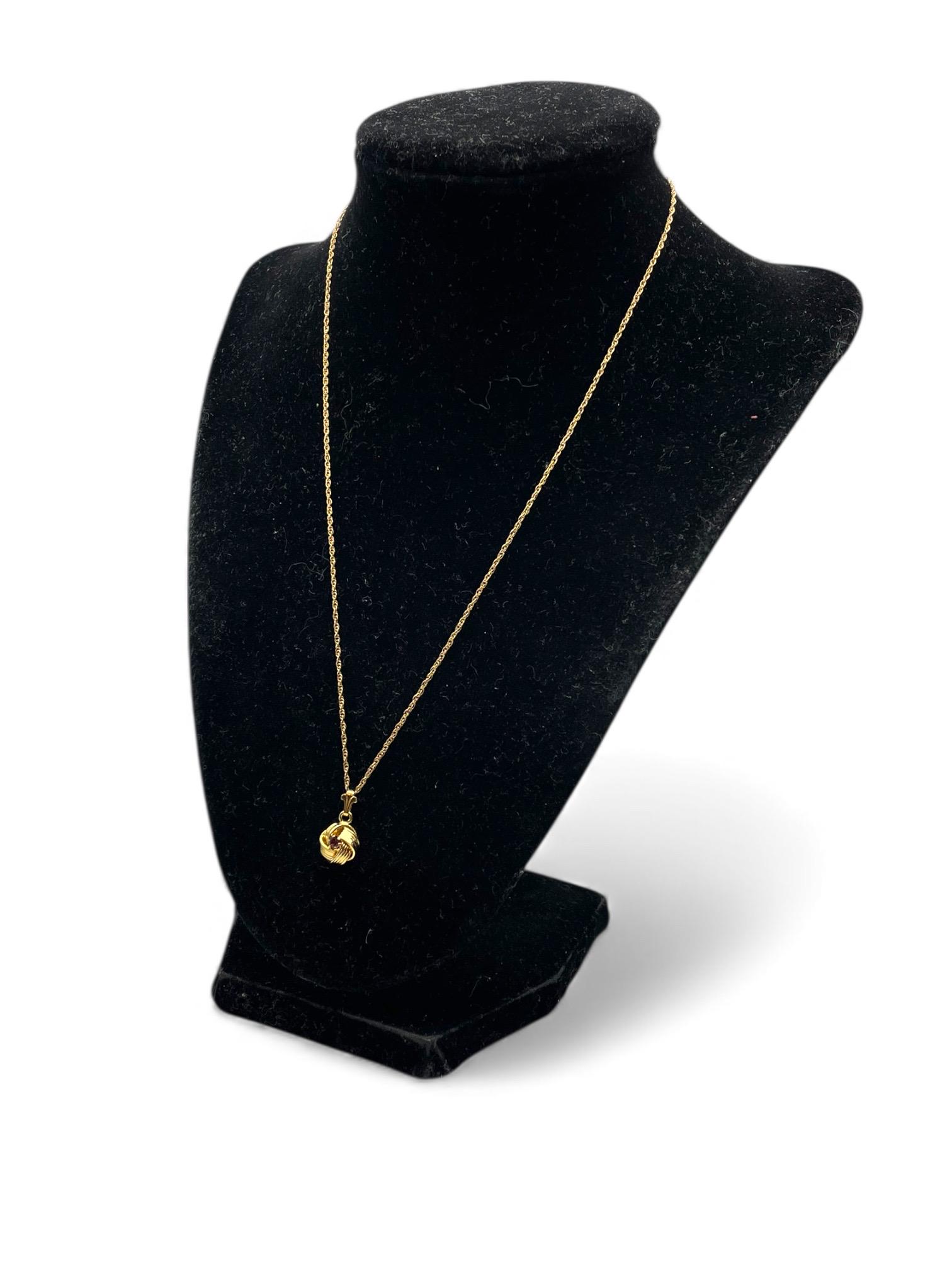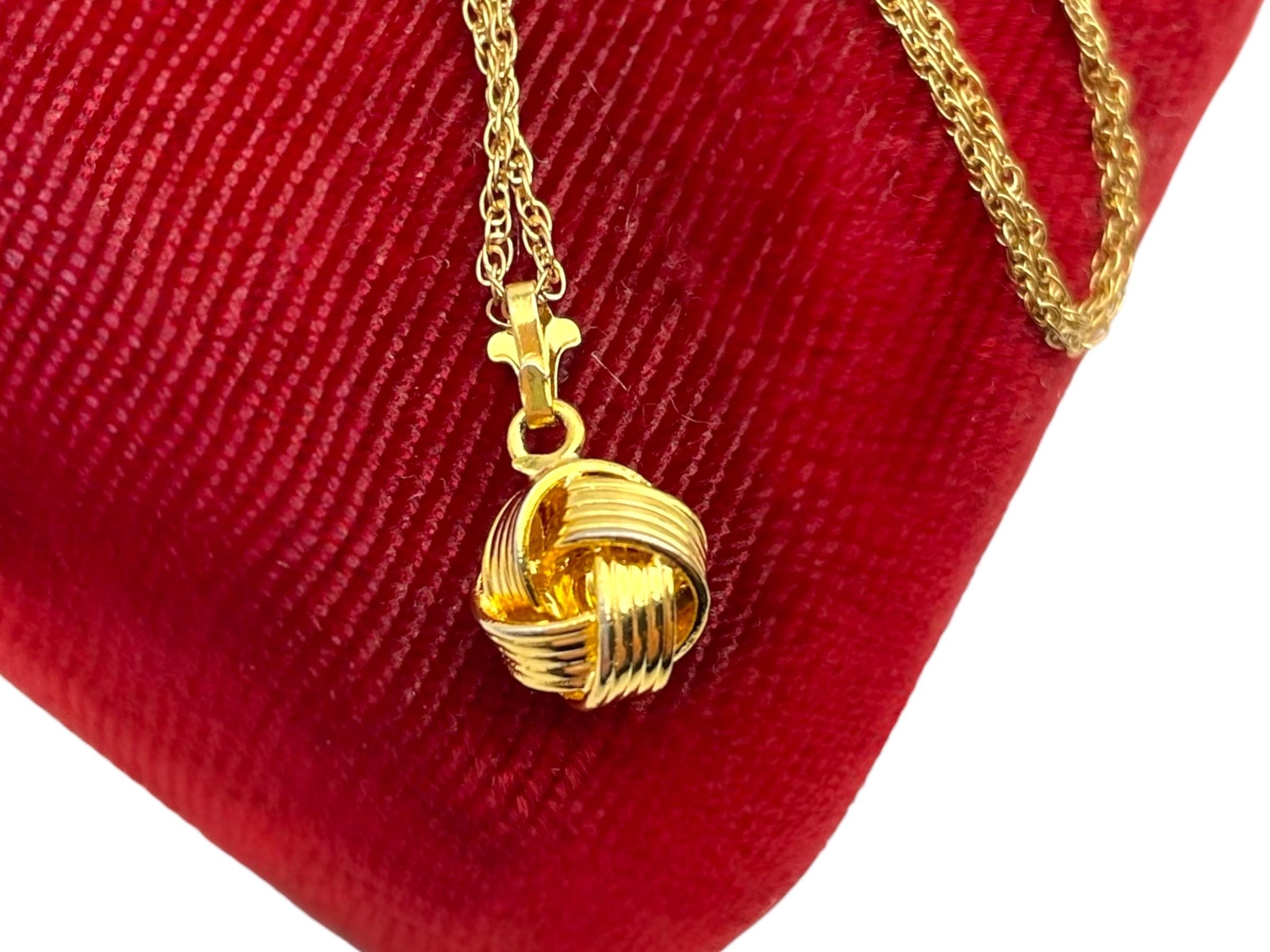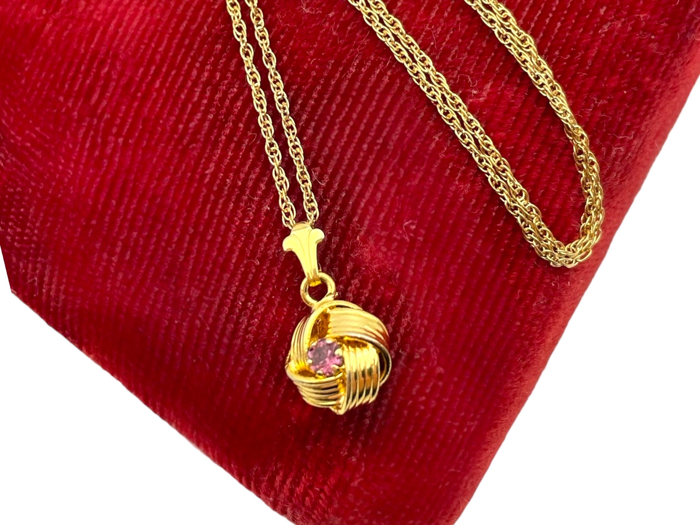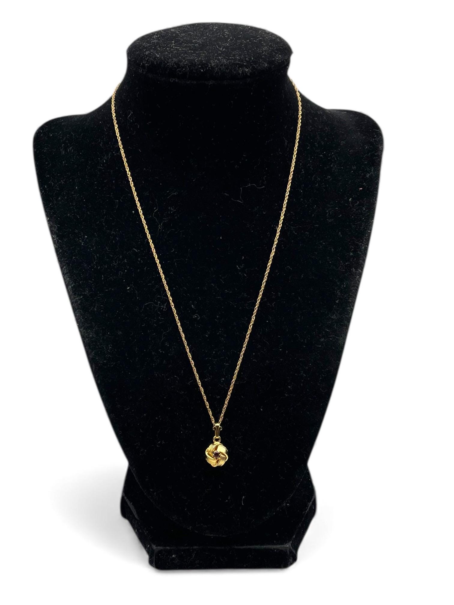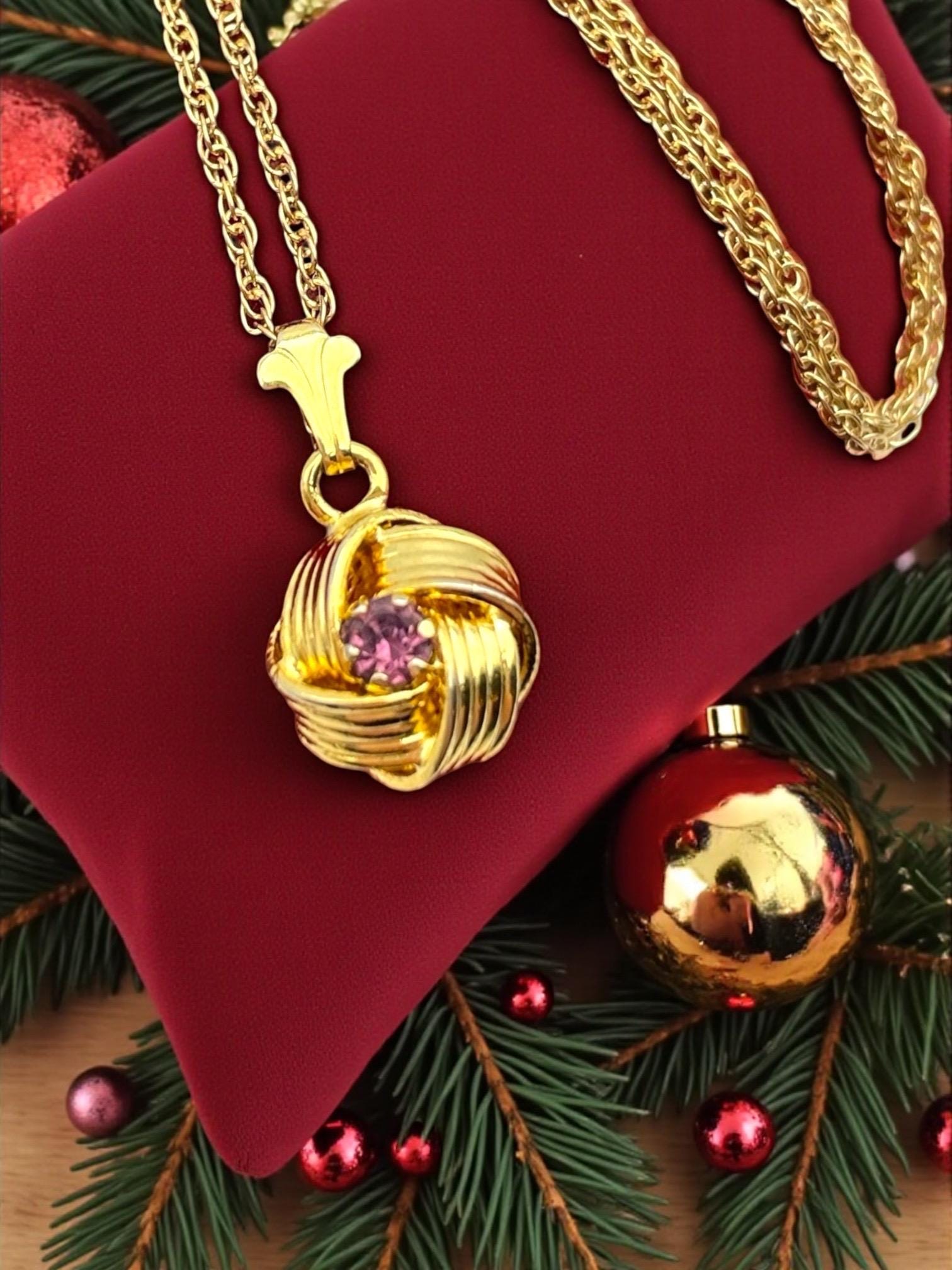 Description: Beautiful gold colored pendant with purple rhinestone center. Love knot is gold tone metal, chain is gold filled. A love knot is a symbolic design, often found in jewelry, representing eternal love, commitment, and connection, characterized by intricate, interwoven loops with no beginning or end, similar to an infinity symbol, and has roots in ancient cultures (Roman, Celtic) as tokens of affection and protection.
