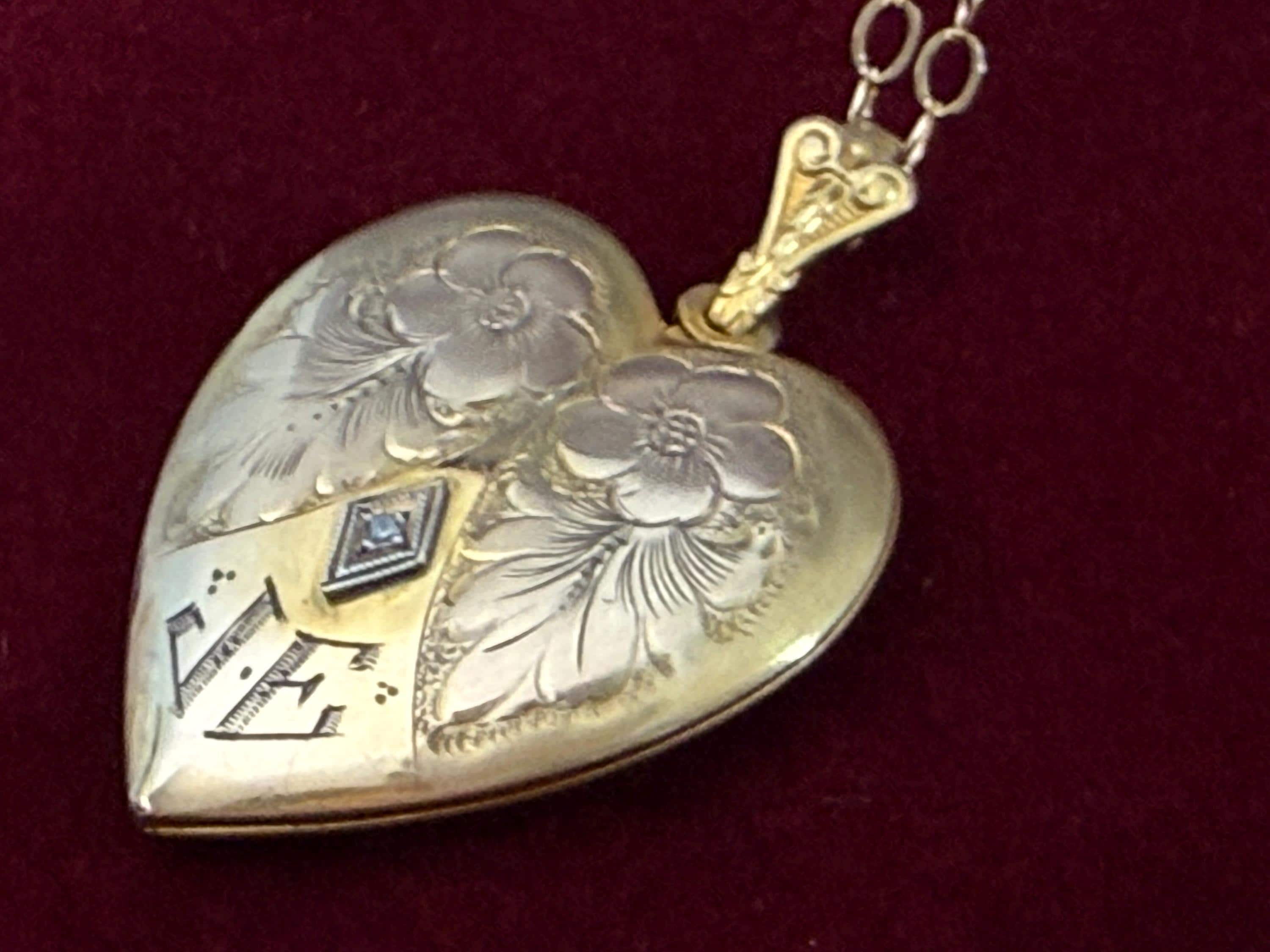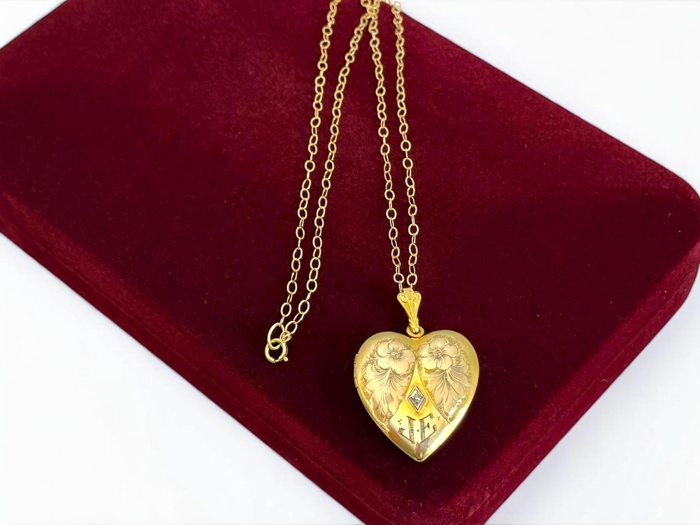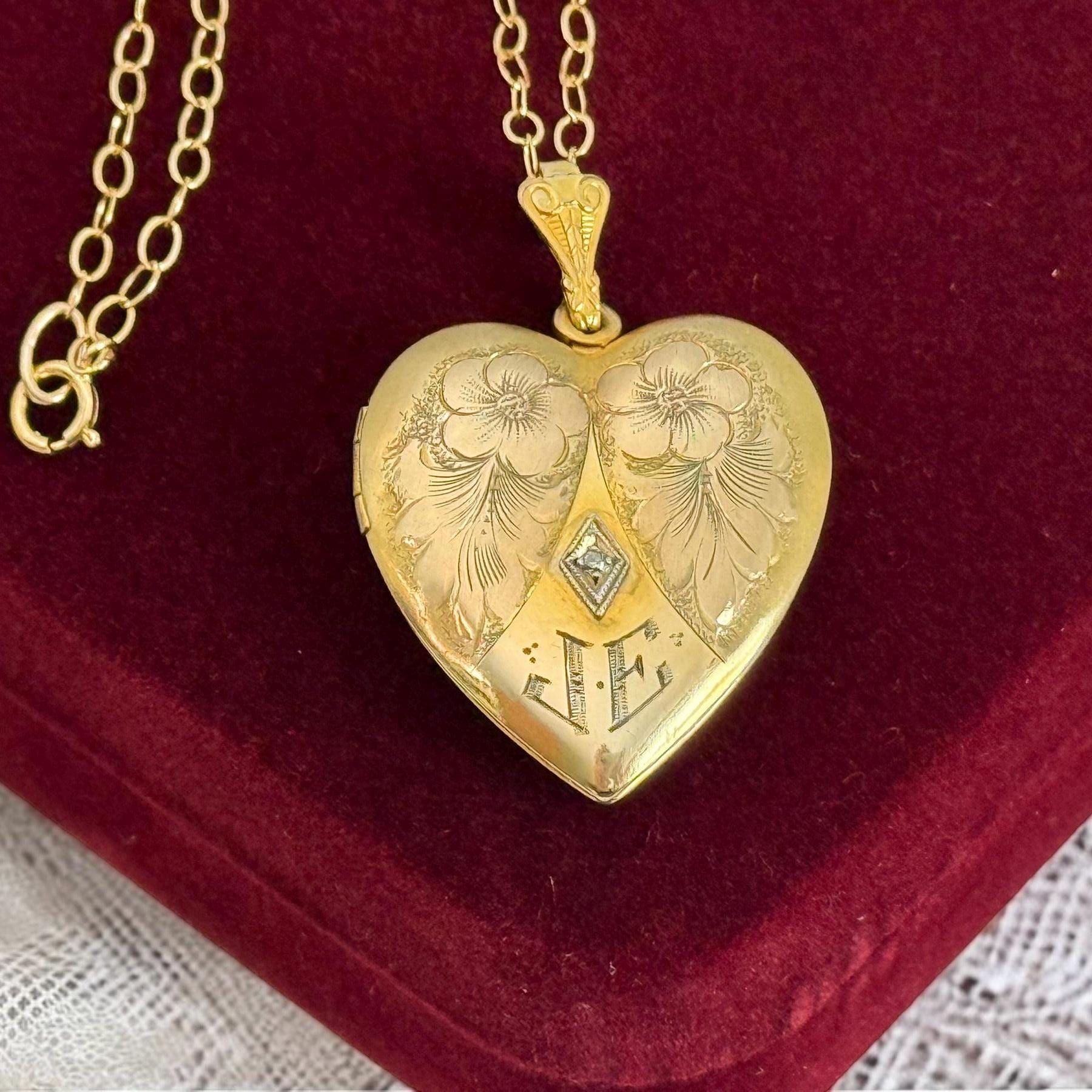 A wonderful and ornate vintage gold filled heart shaped locket necklace with an elaborately decorated and etched floral front that features a small round diamond in the center and at the bottom, the initials JE. The diamond stone is set inside a white gold filled diamond shape. The locket is circa early to mid 1900s. The back of the locket is plain with no design.