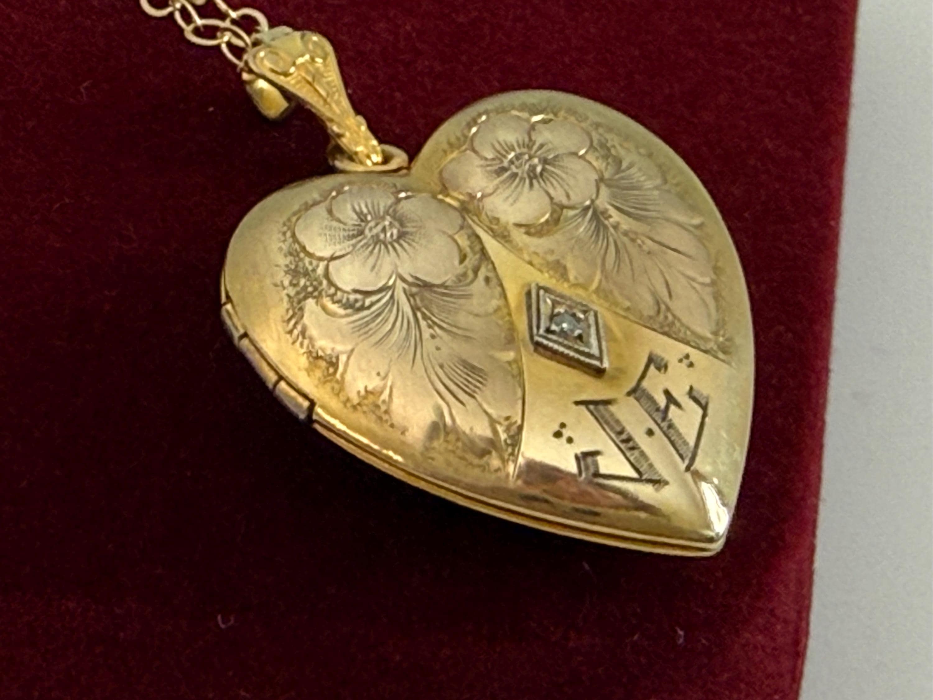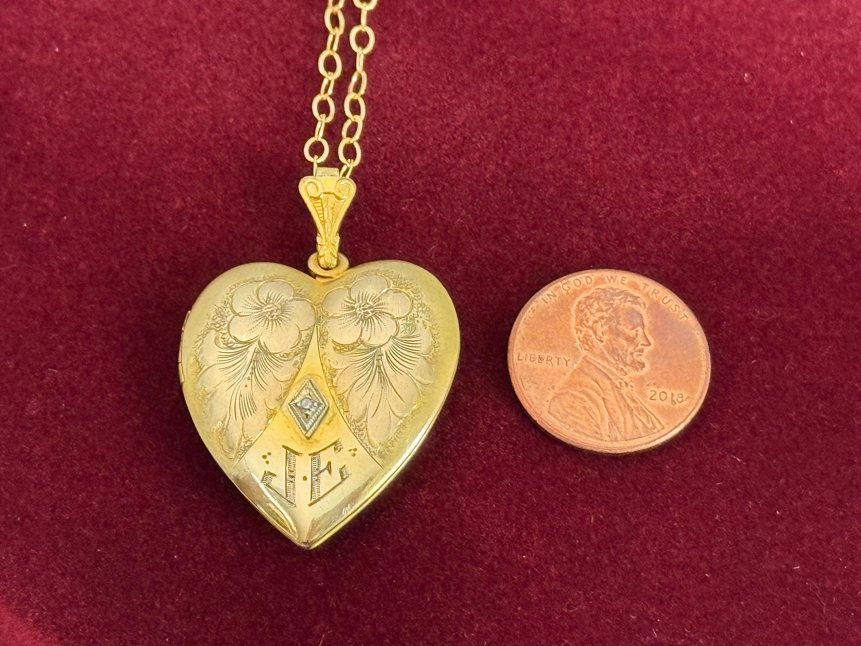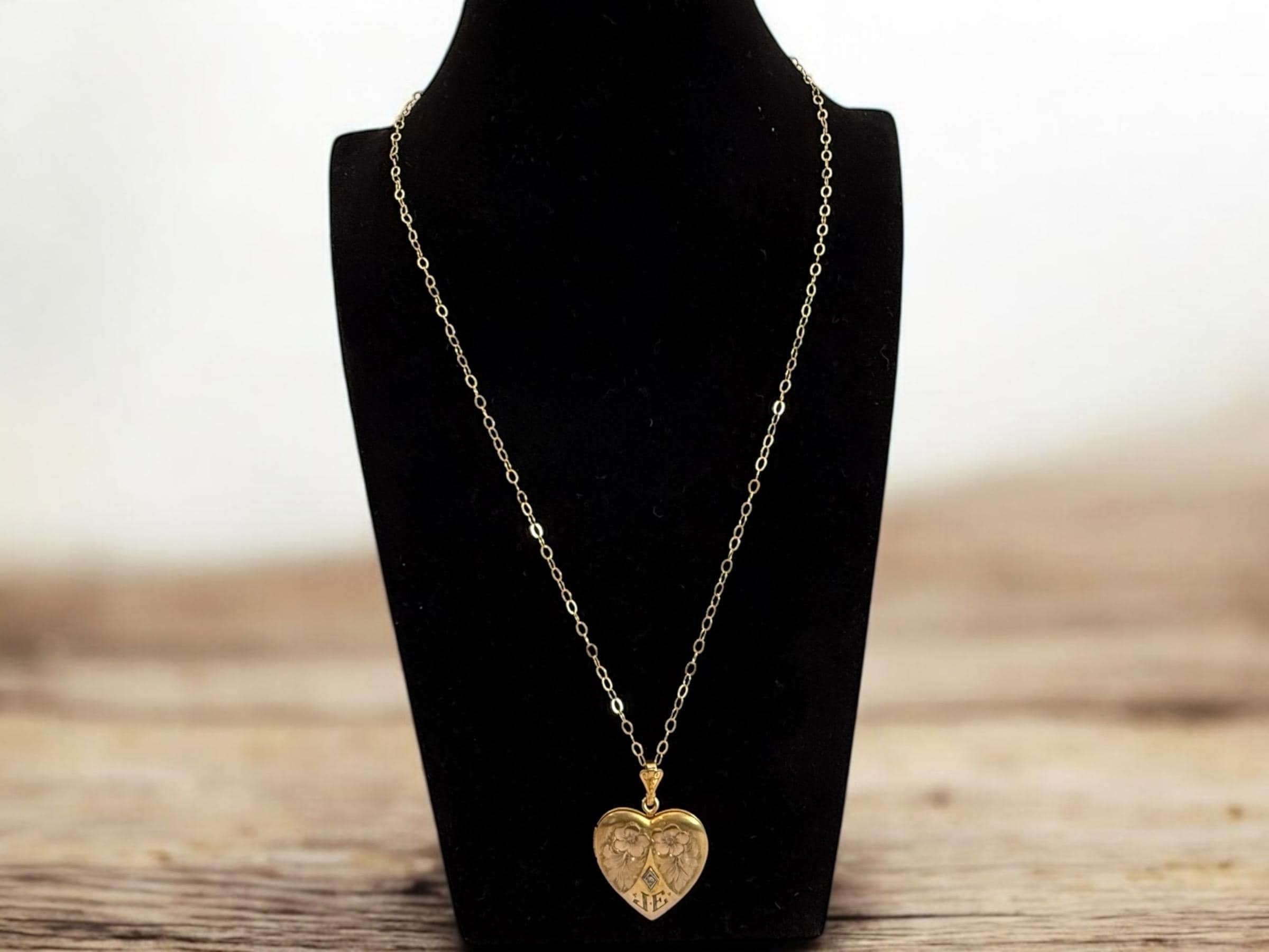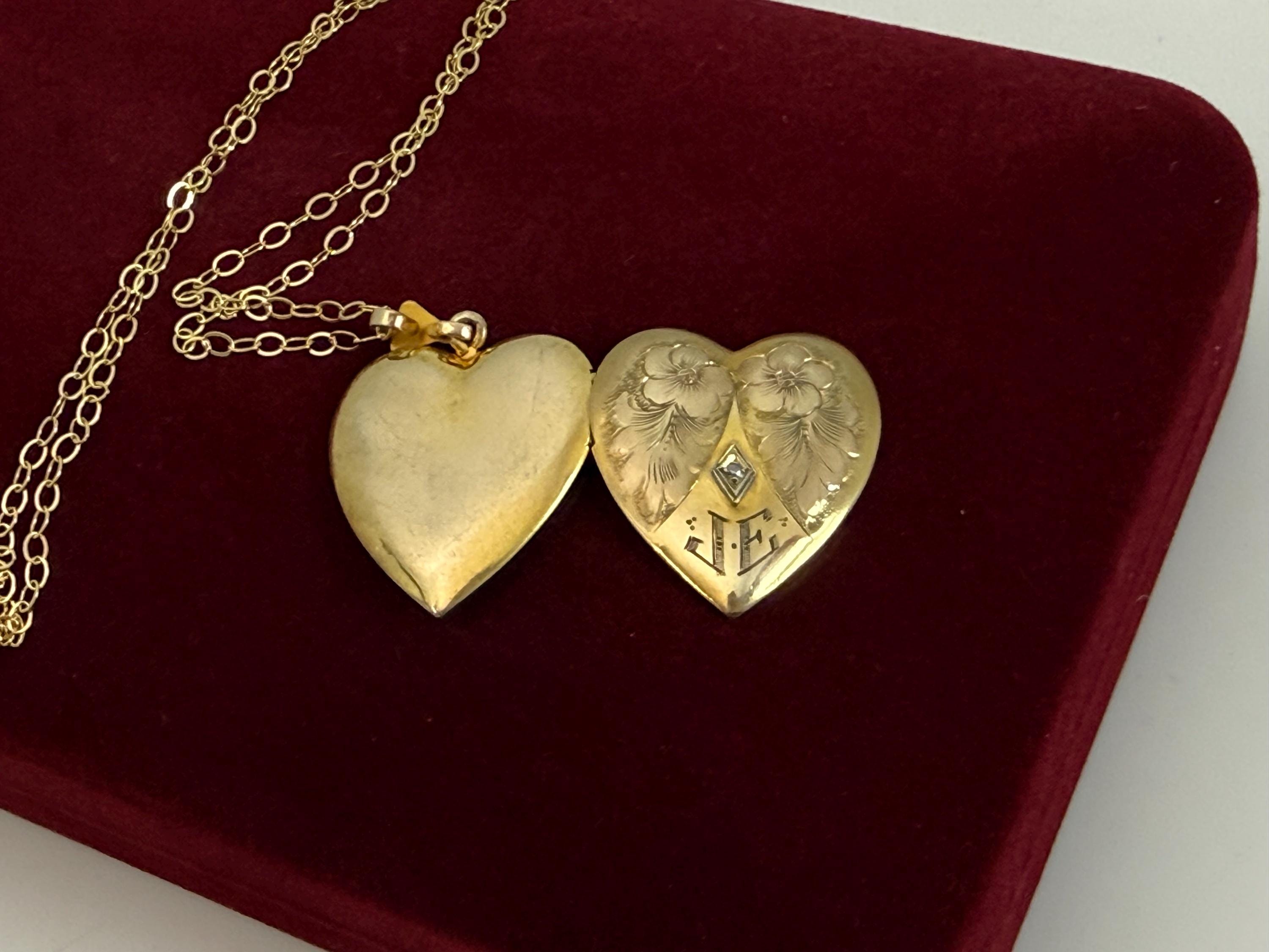 A wonderful and ornate vintage gold filled heart shaped locket necklace with an elaborately decorated and etched floral front that features a small round diamond in the center and at the bottom, the initials JE. The diamond stone is set inside a white gold filled diamond shape. The locket is circa early to mid 1900s. The back of the locket is plain with no design.