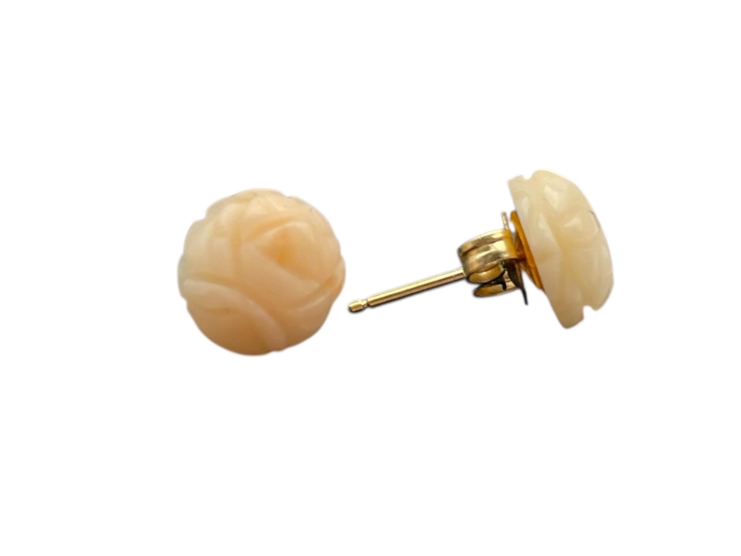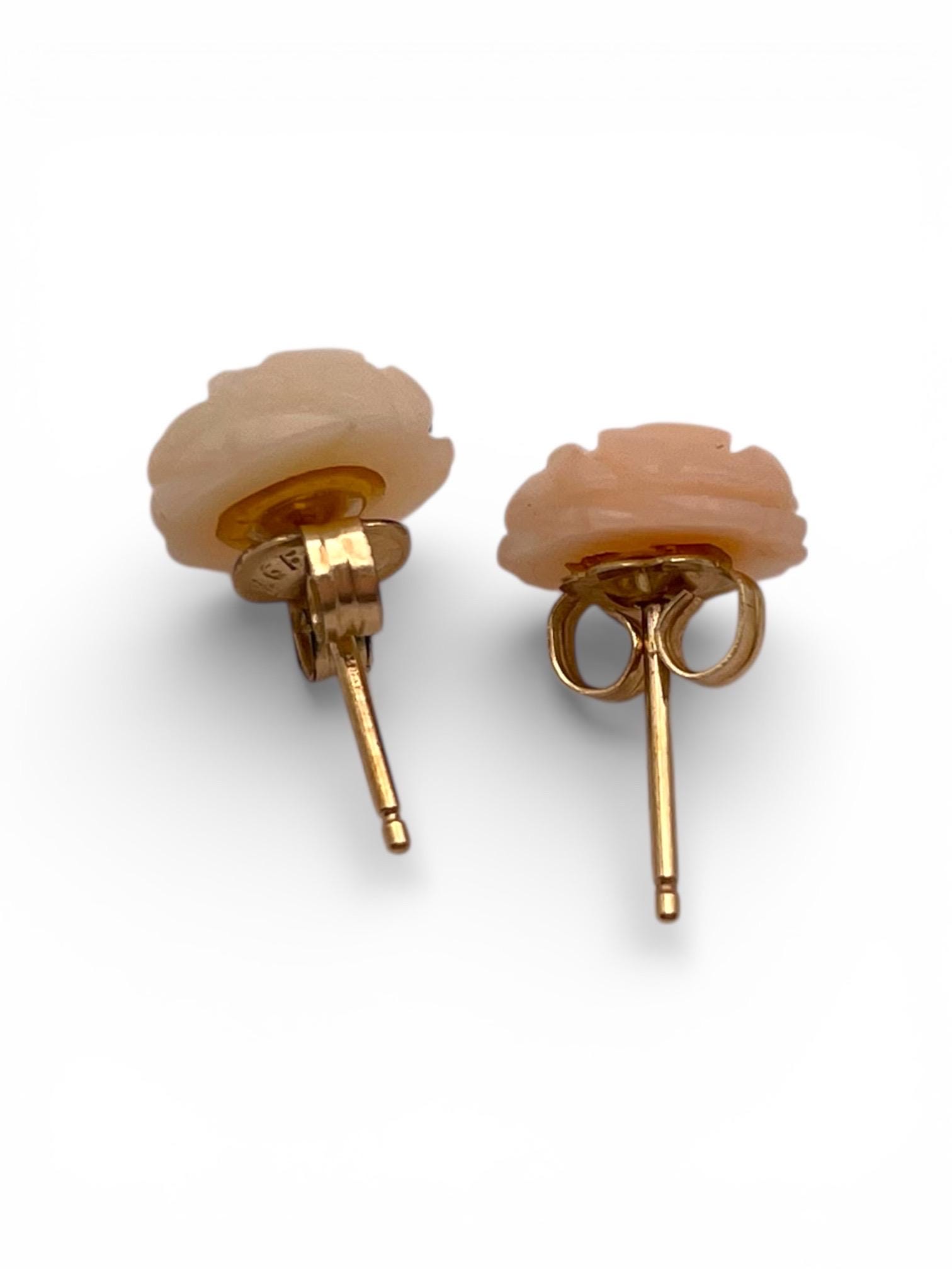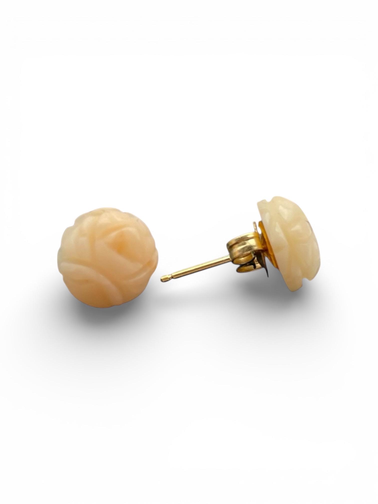 Adorable and dainty 14K yellow gold post and angel skin colored carved coral earrings. Posts are 14K, backs are 14K GF.