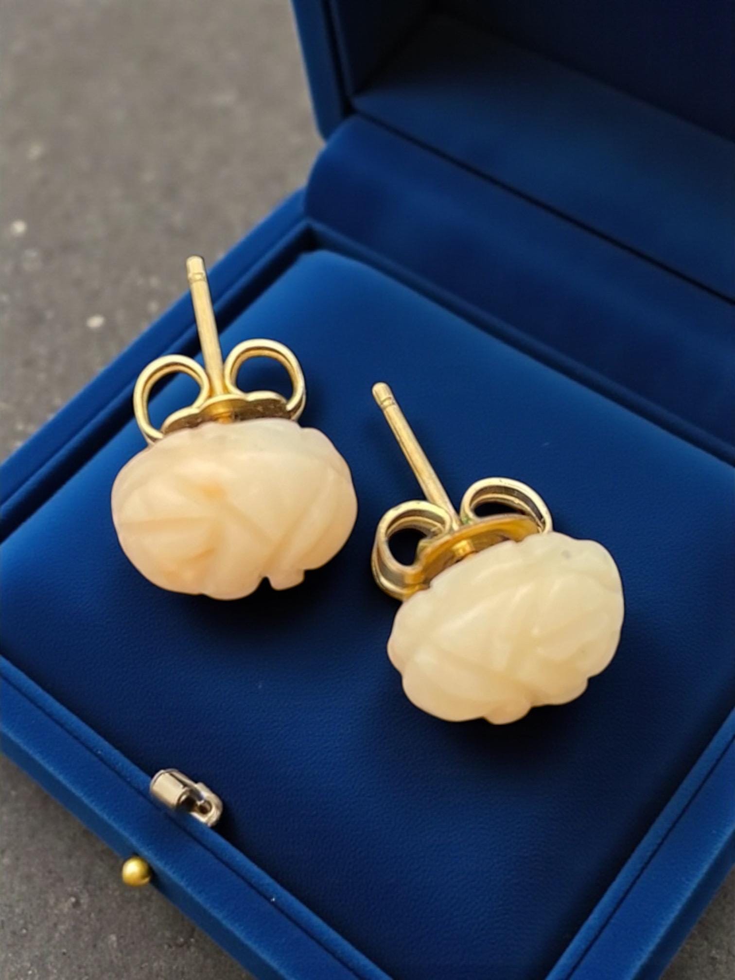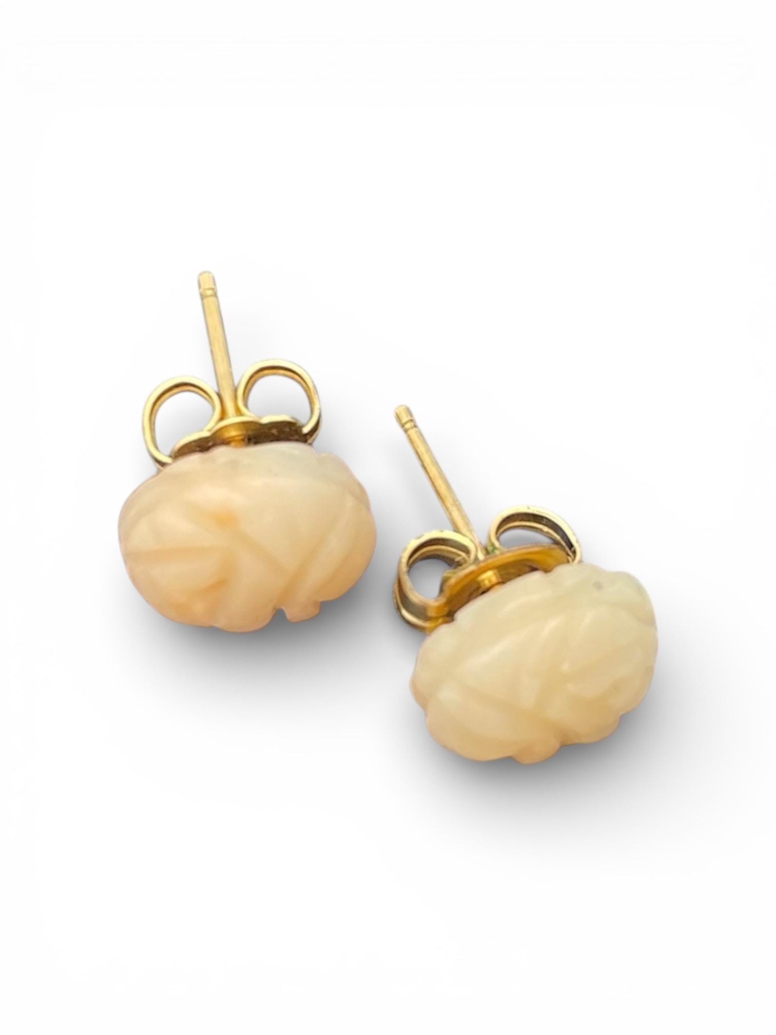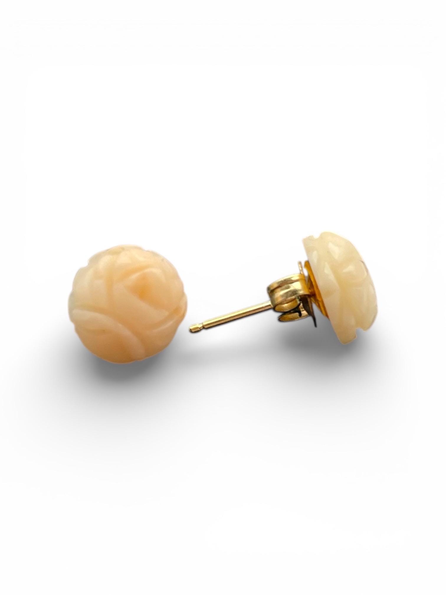Adorable and dainty 14K yellow gold post and angel skin colored carved coral earrings. Posts are 14K, backs are 14K GF.