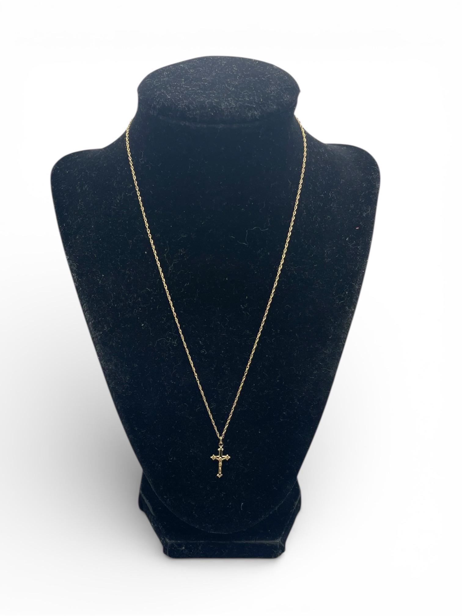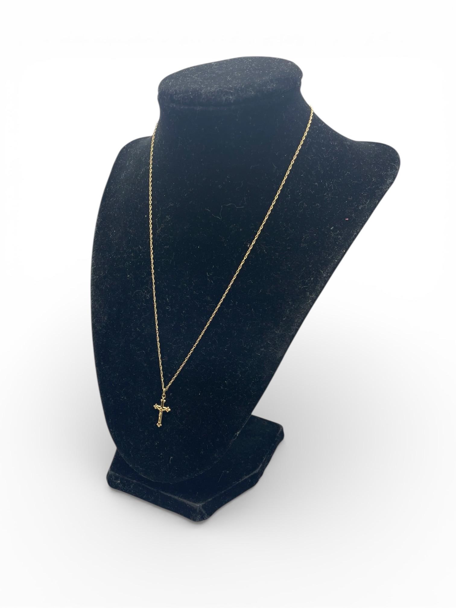 A religious cross pendant necklace. This 14K gold filled cross is very petite. Marked PPC for Princess Pride Creations.