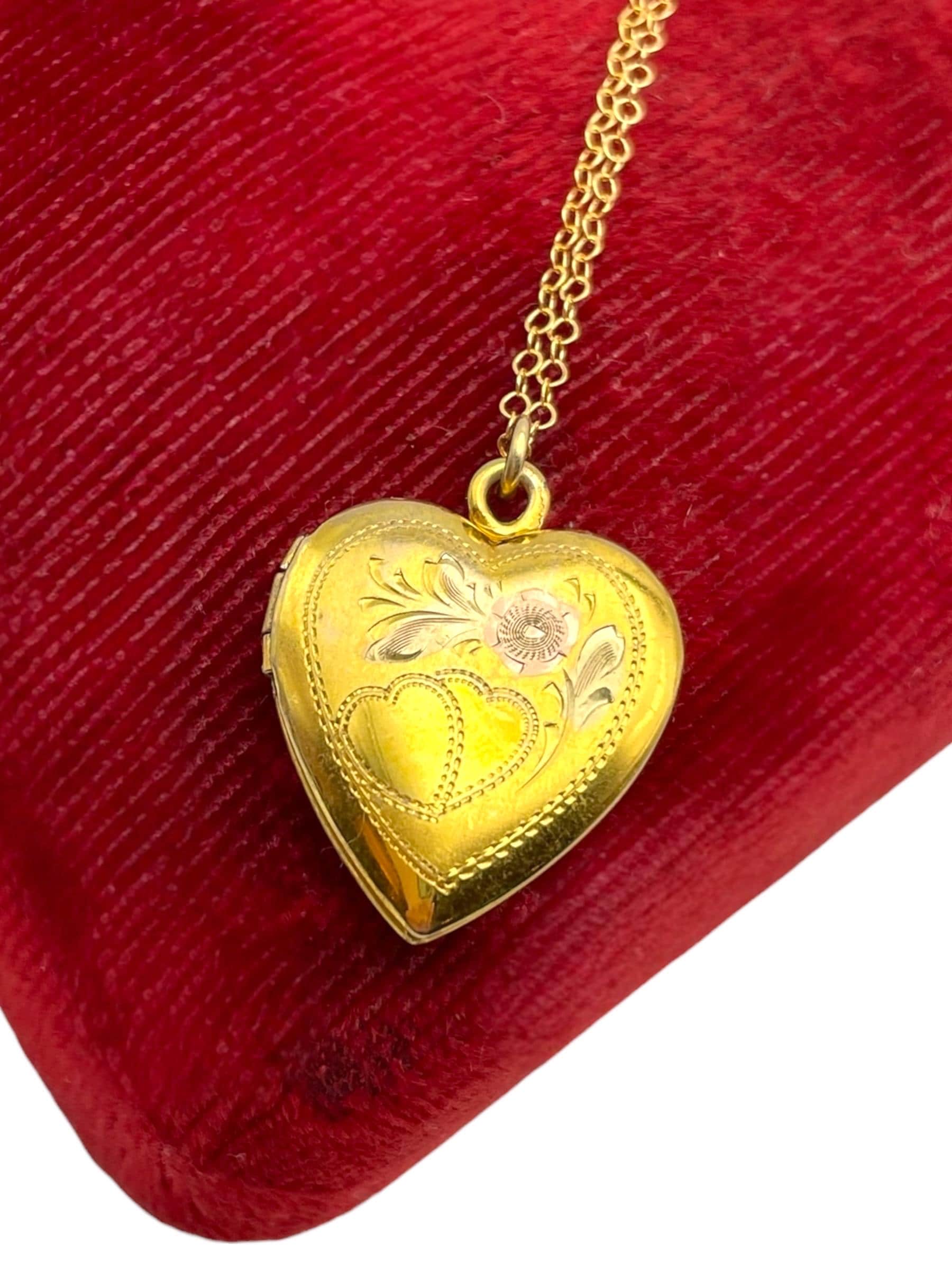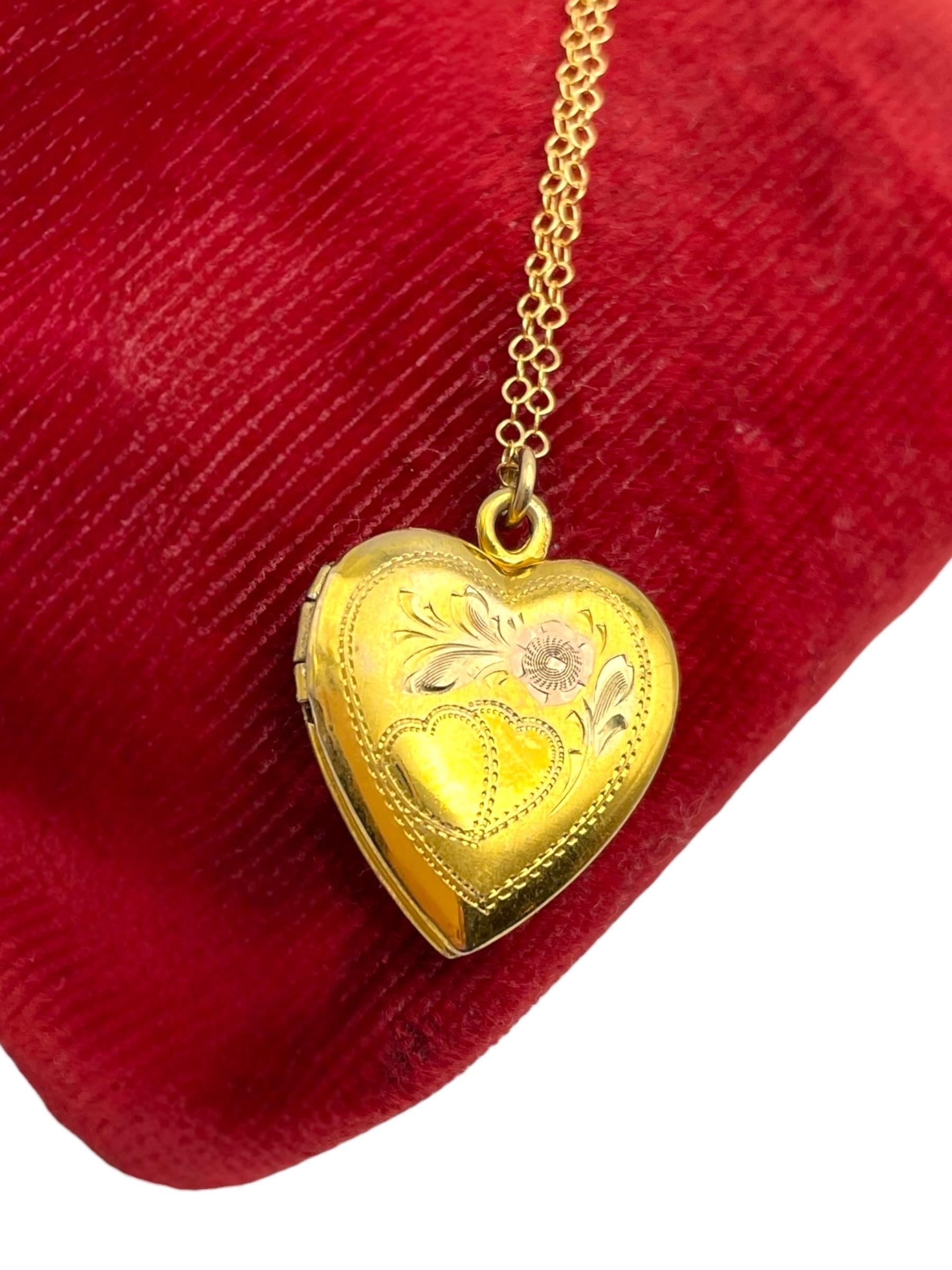 A vintage vermeil (gold over silver) heart shaped locket that is etched on the front and hangs in a new14K gold filled chain. The mid century era necklace has an etched floral and heart design on the front. The back is plain with no design and a shiny finish.