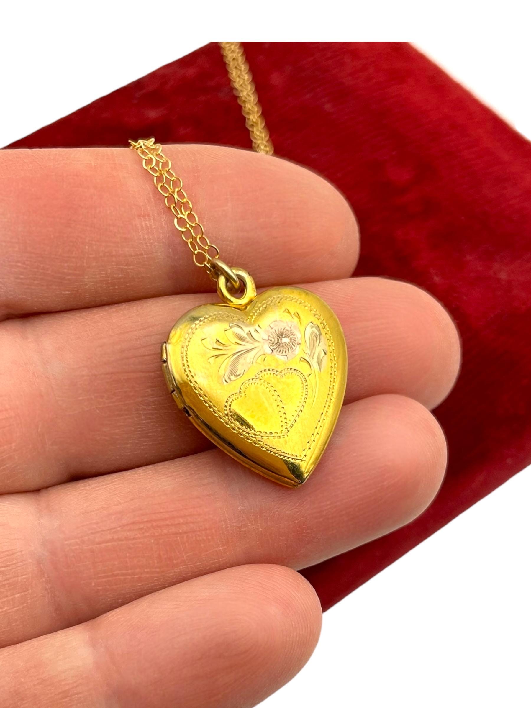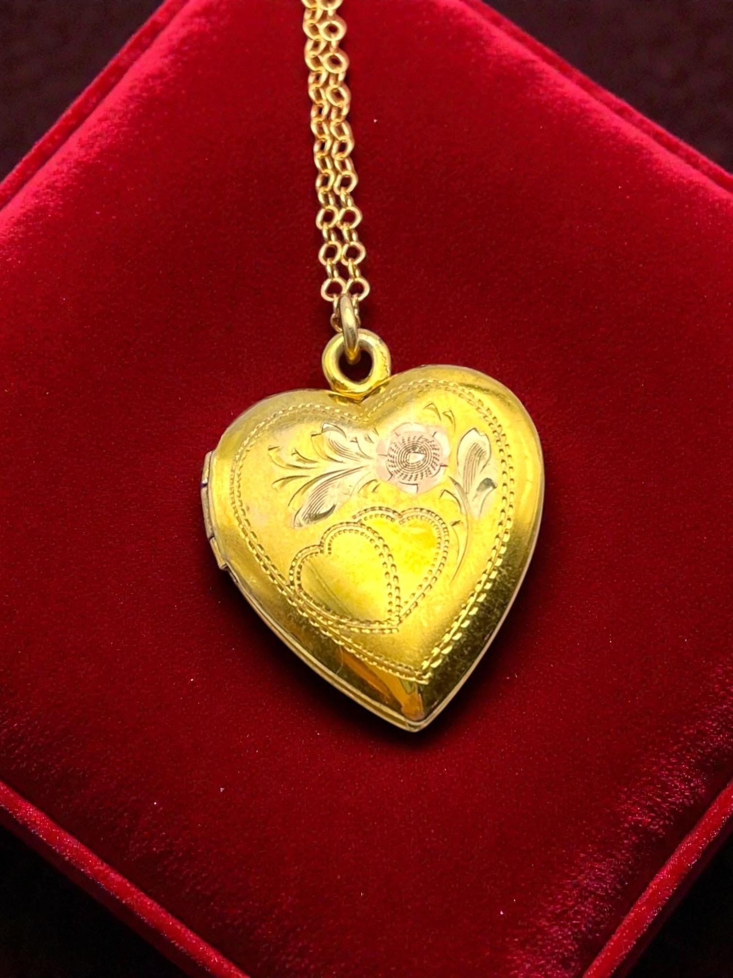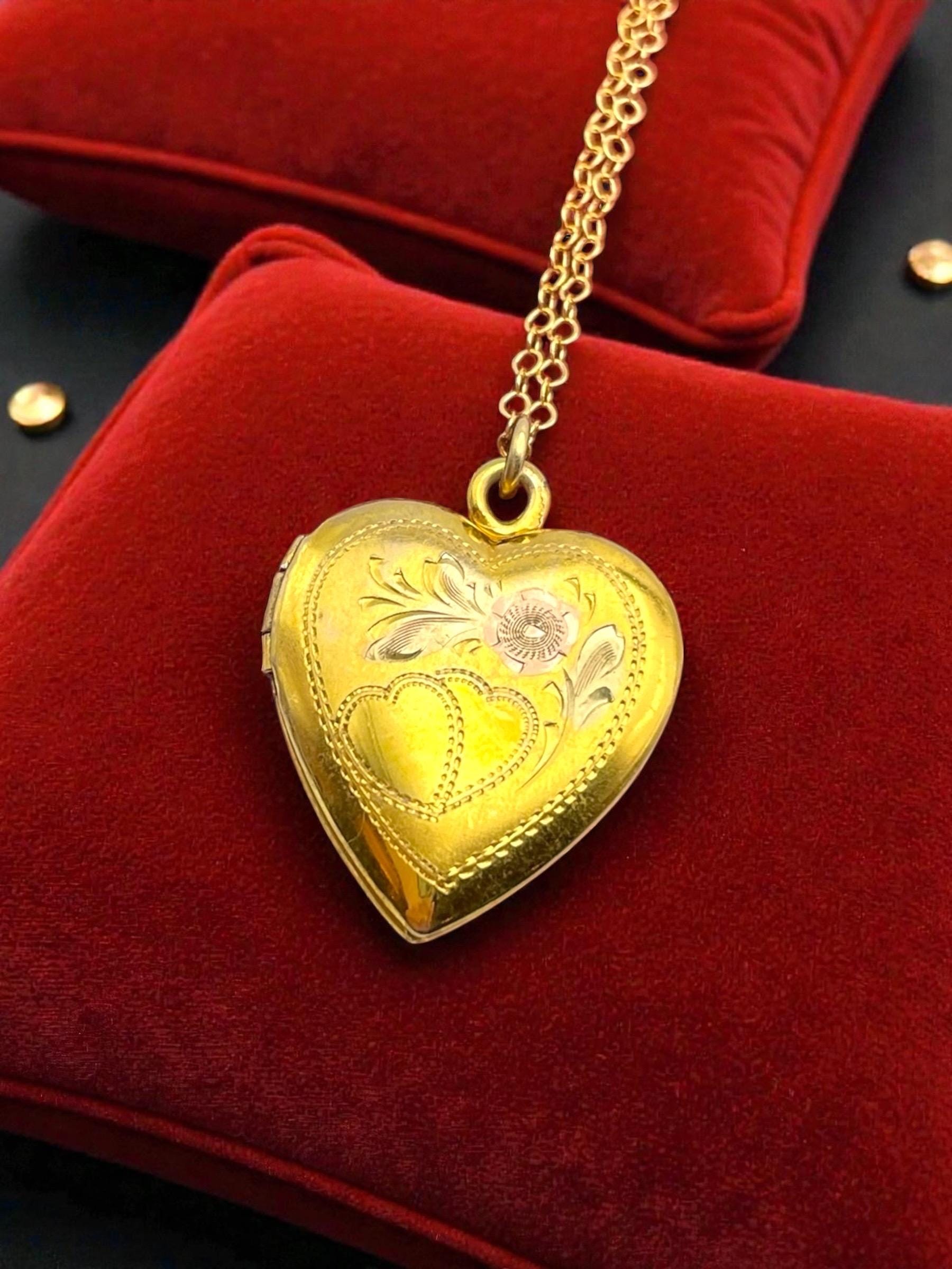 Vintage Vermeil Heart Locket Necklace: 12K Gold on Sterling Etched Floral Keepsake