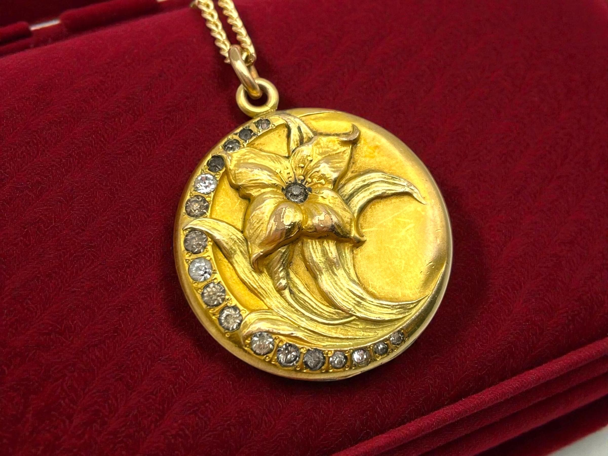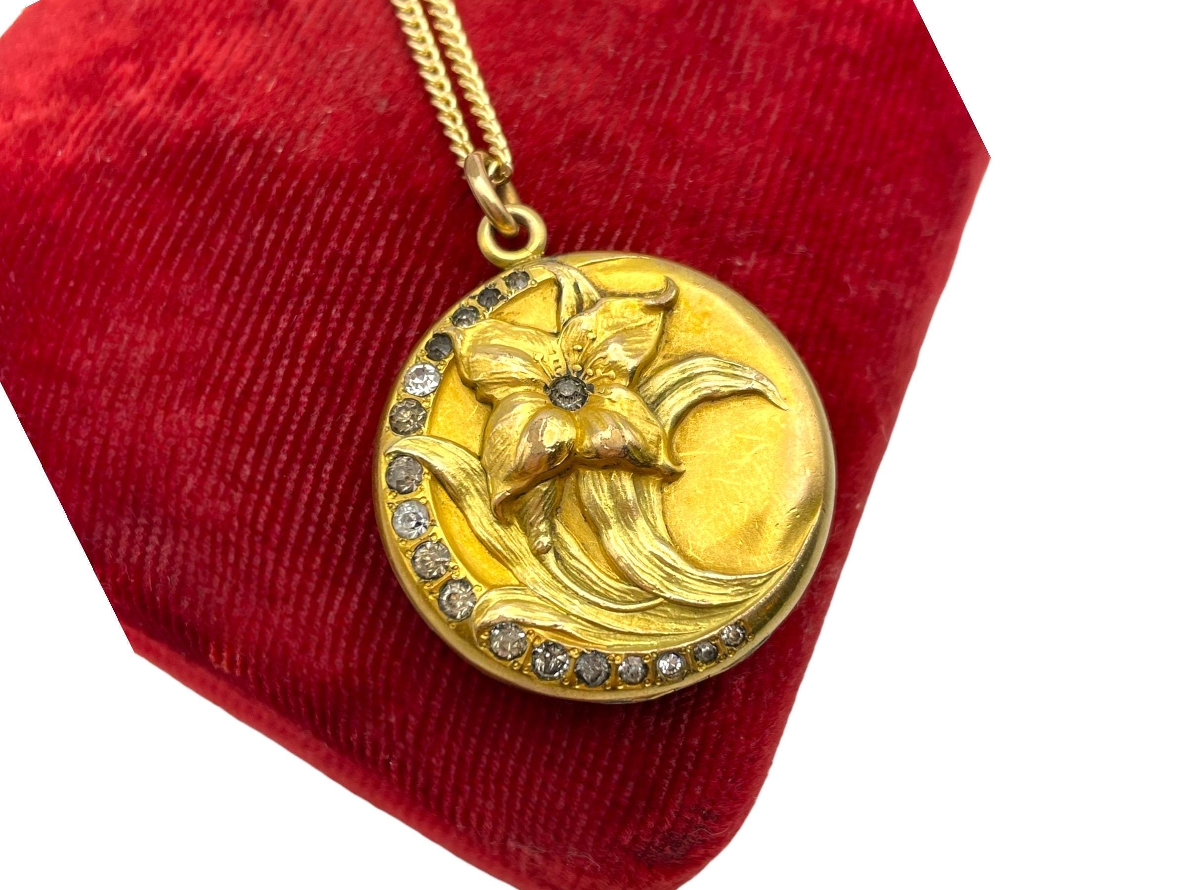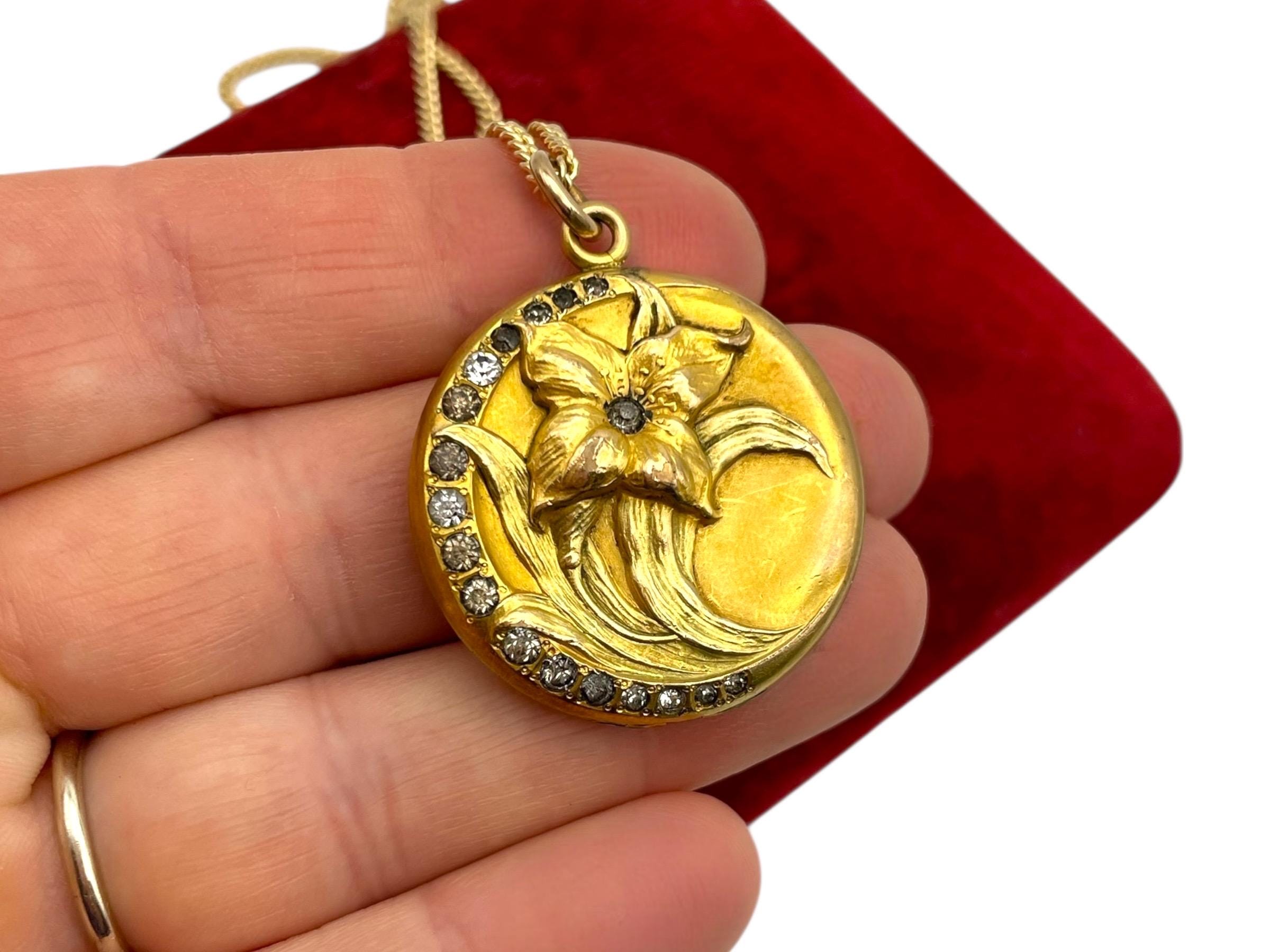Lovely antique Art Nouveau gold filled photo locket on a new 14K gold filled chain. The front features an ornate repousse (raised) design with a large flower in bloom with a paste (glass/rhinestone) center. Paste stones decorate the side of the locket. The back of the locket is plain with no design. The locket is hallmarked on the inside W&H. See notes below.