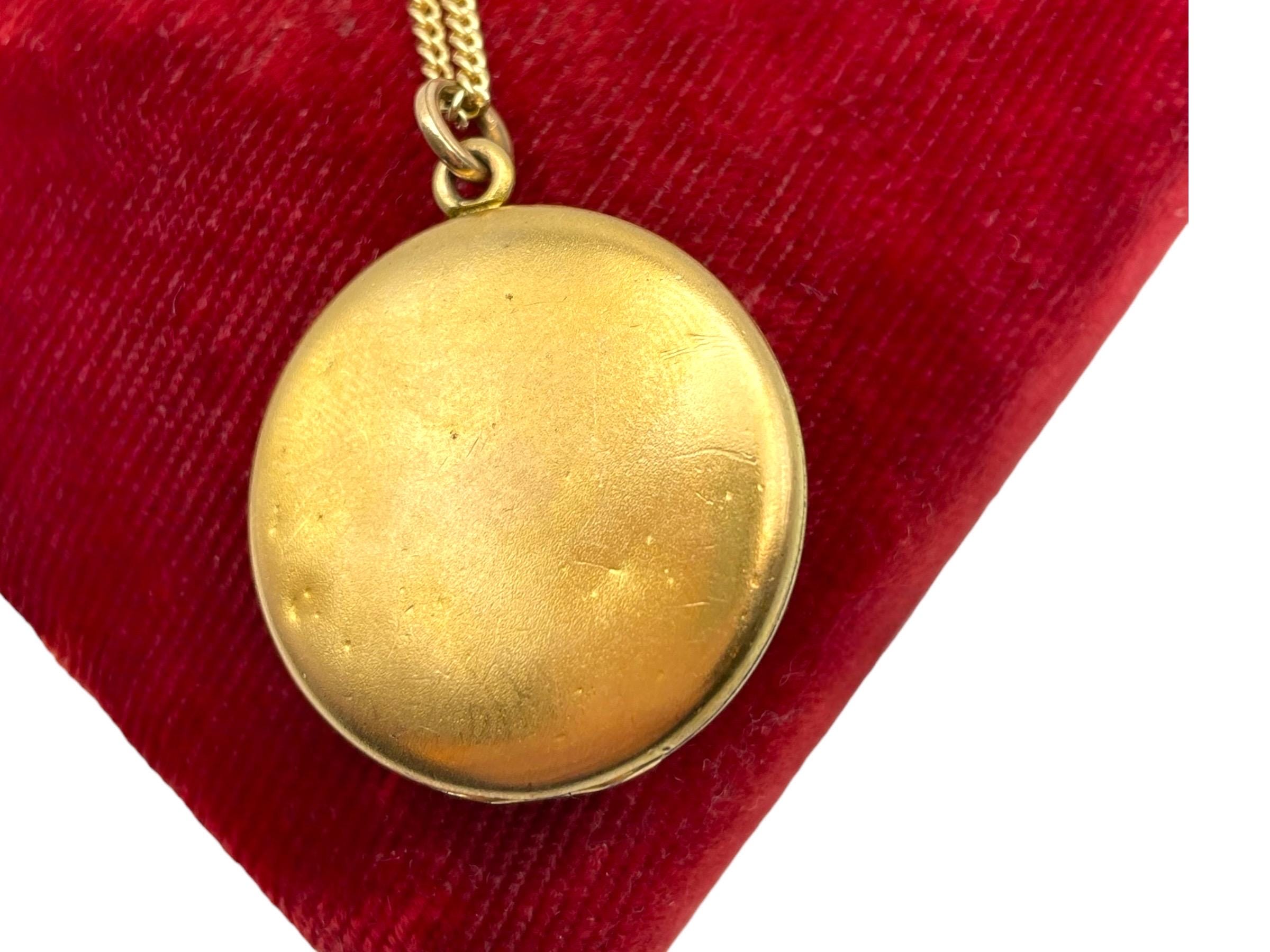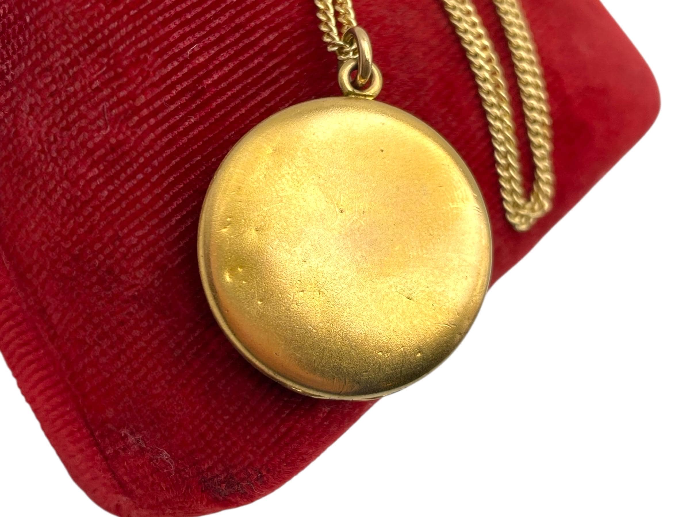 This vintage large sized locket hangs from a new, 22" long, gold filled curb link chain that has a spring ring closure. The new curb chain is 14K gold filled. The locket can be purchased with or without the chain.