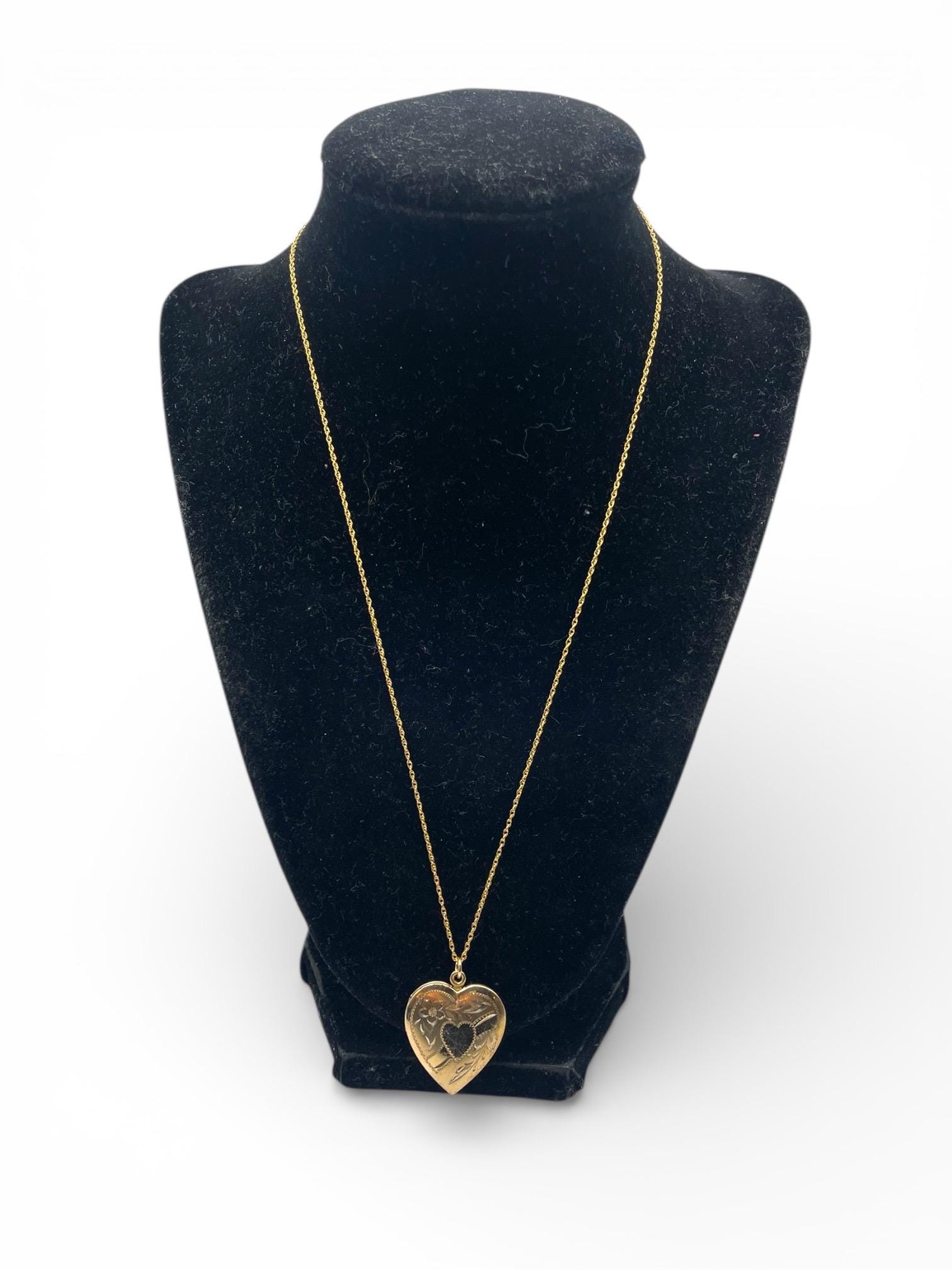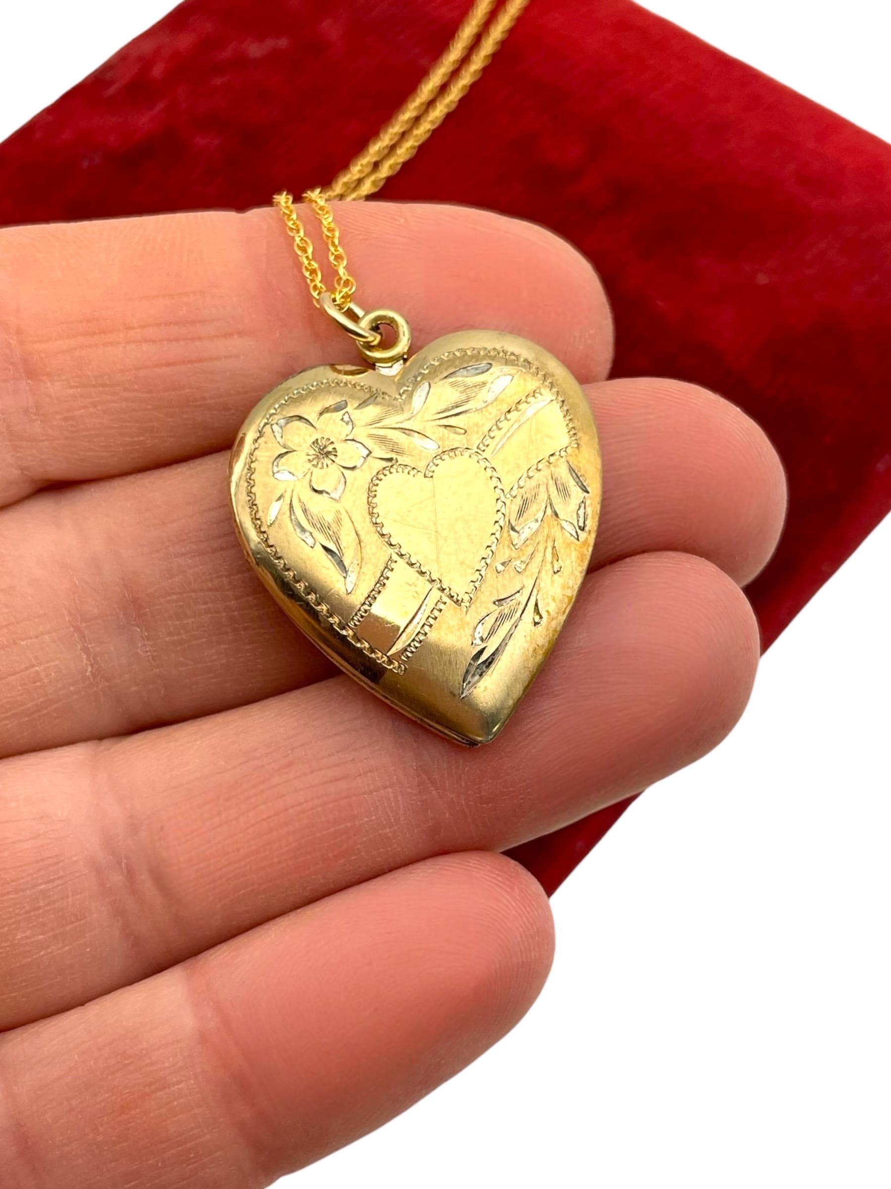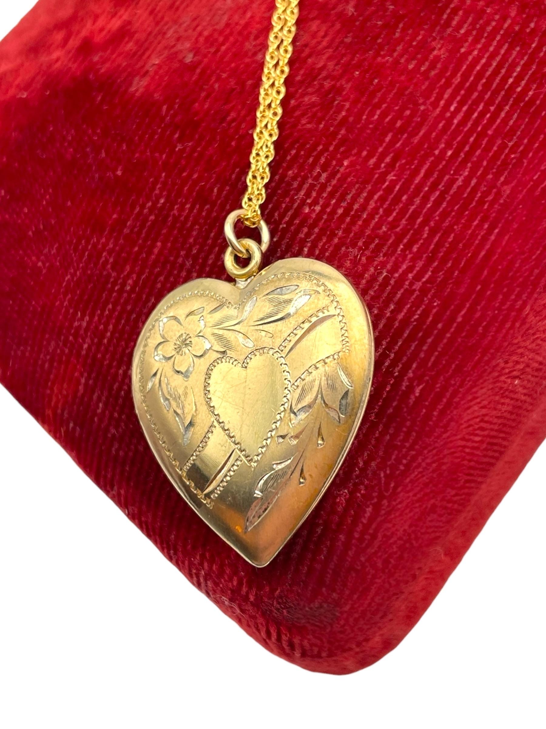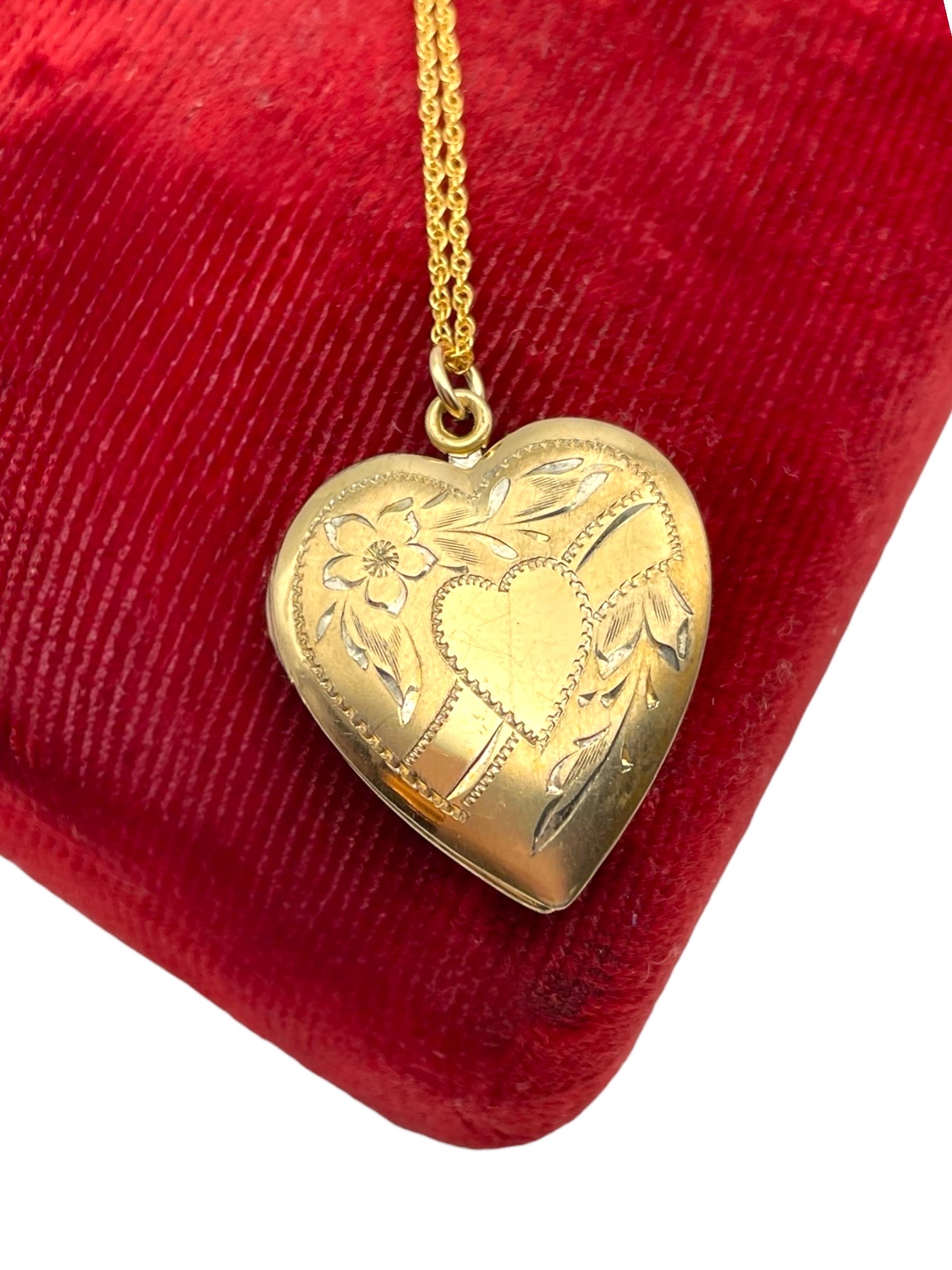 A vintage vermeil (gold fill over sterling silver) heart shaped locket that is etched on the front and hangs on a new 14K gold filled chain. The mid century era locket has an etched design on the front of a heart in the center with flower and leaves surrounding it. The back is plain with a shiny finish.