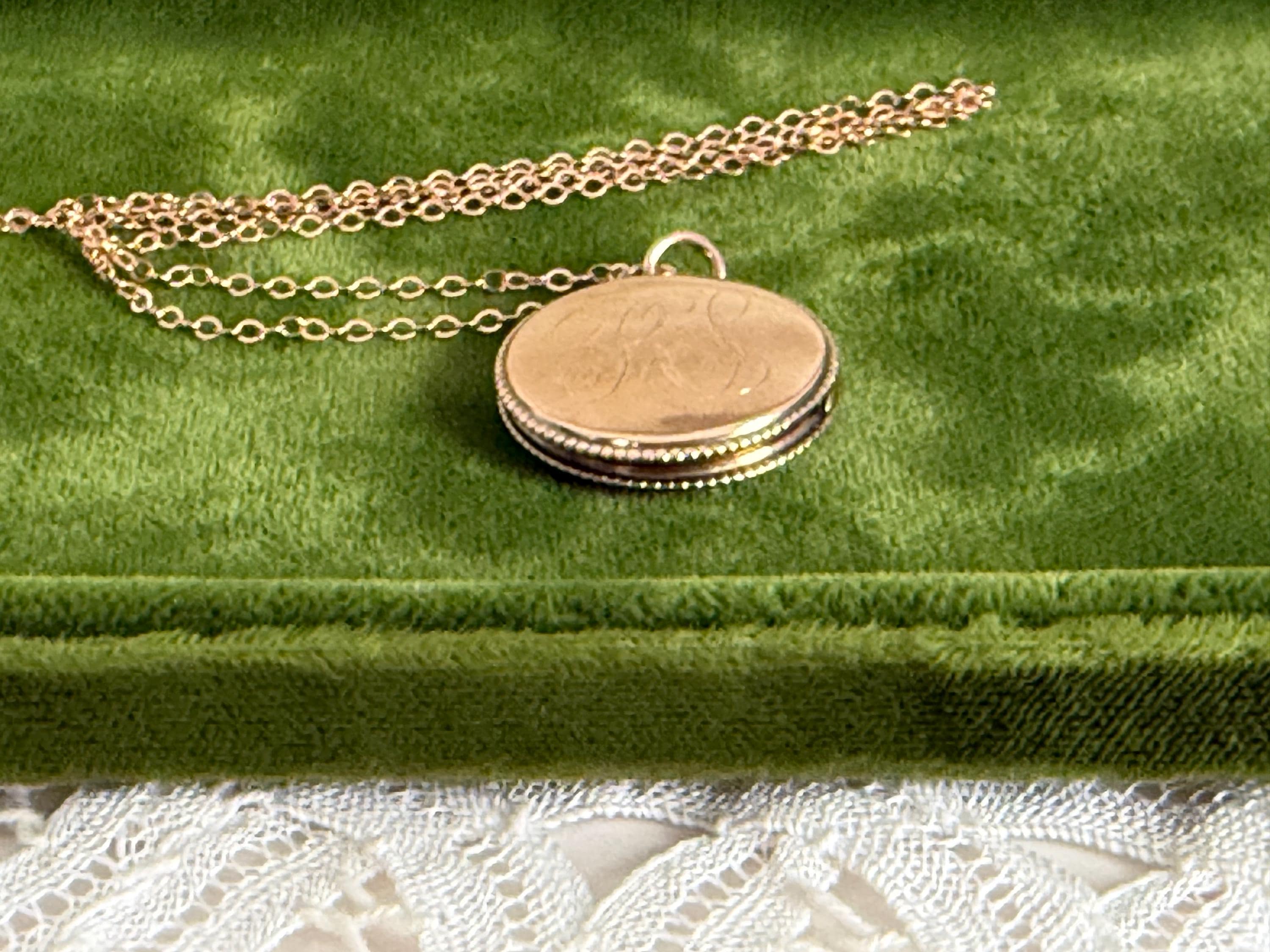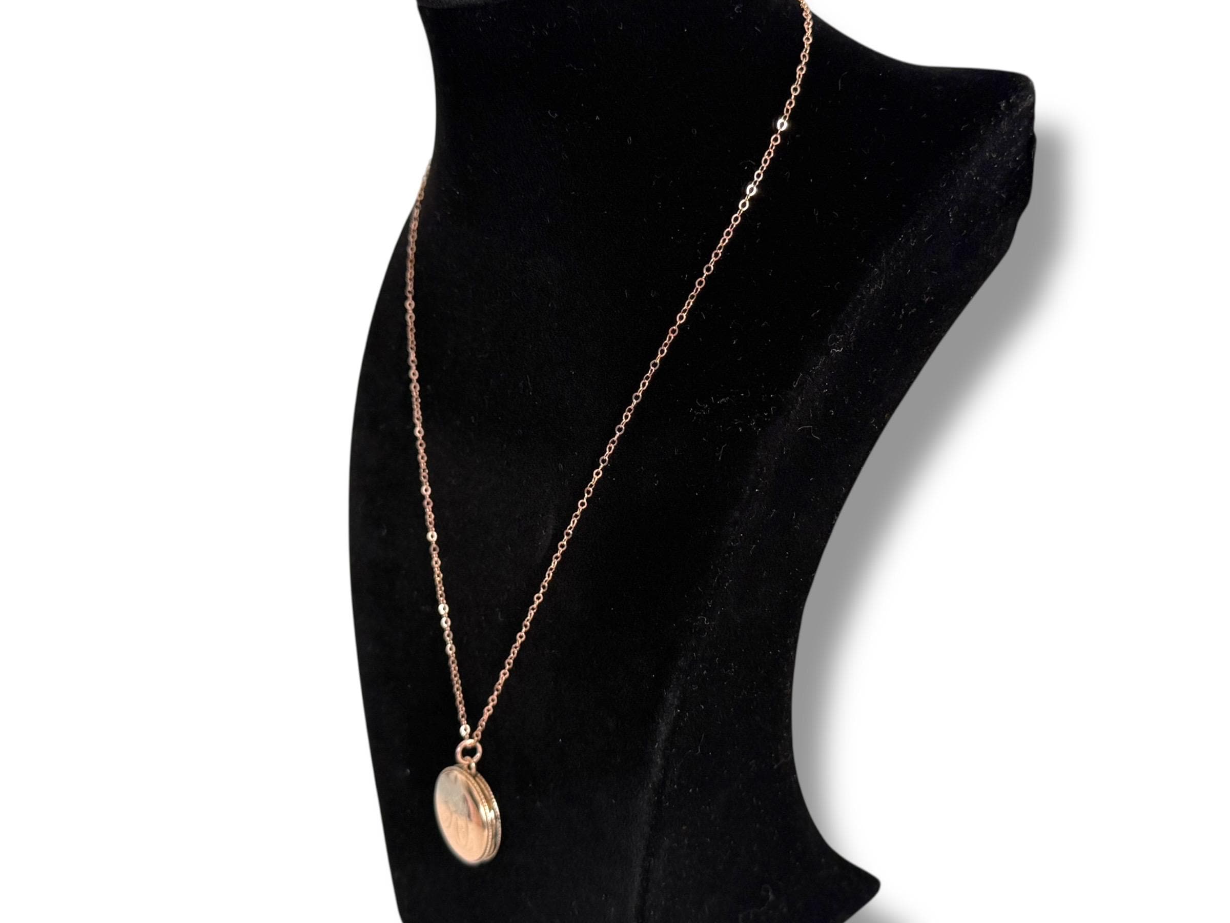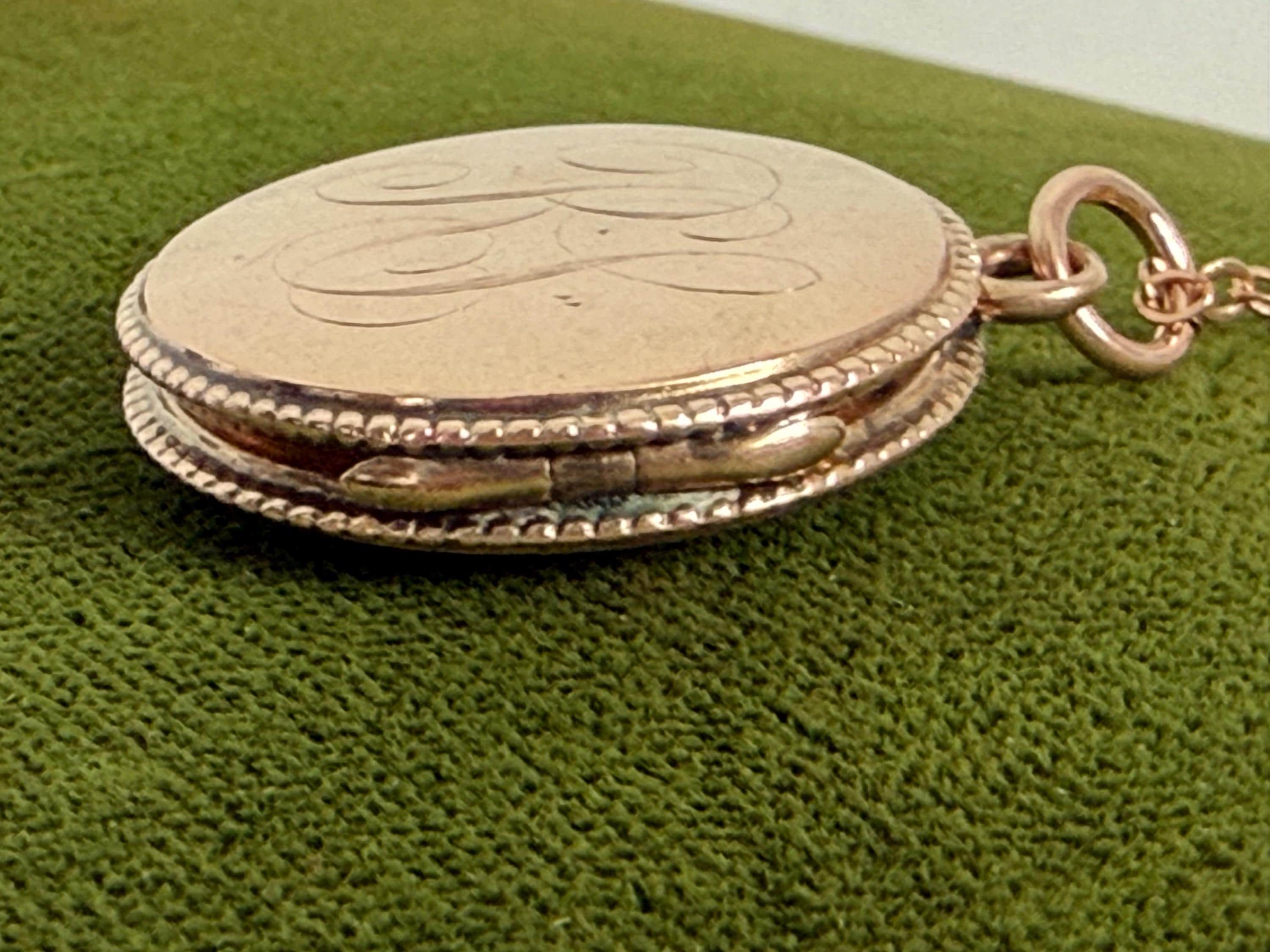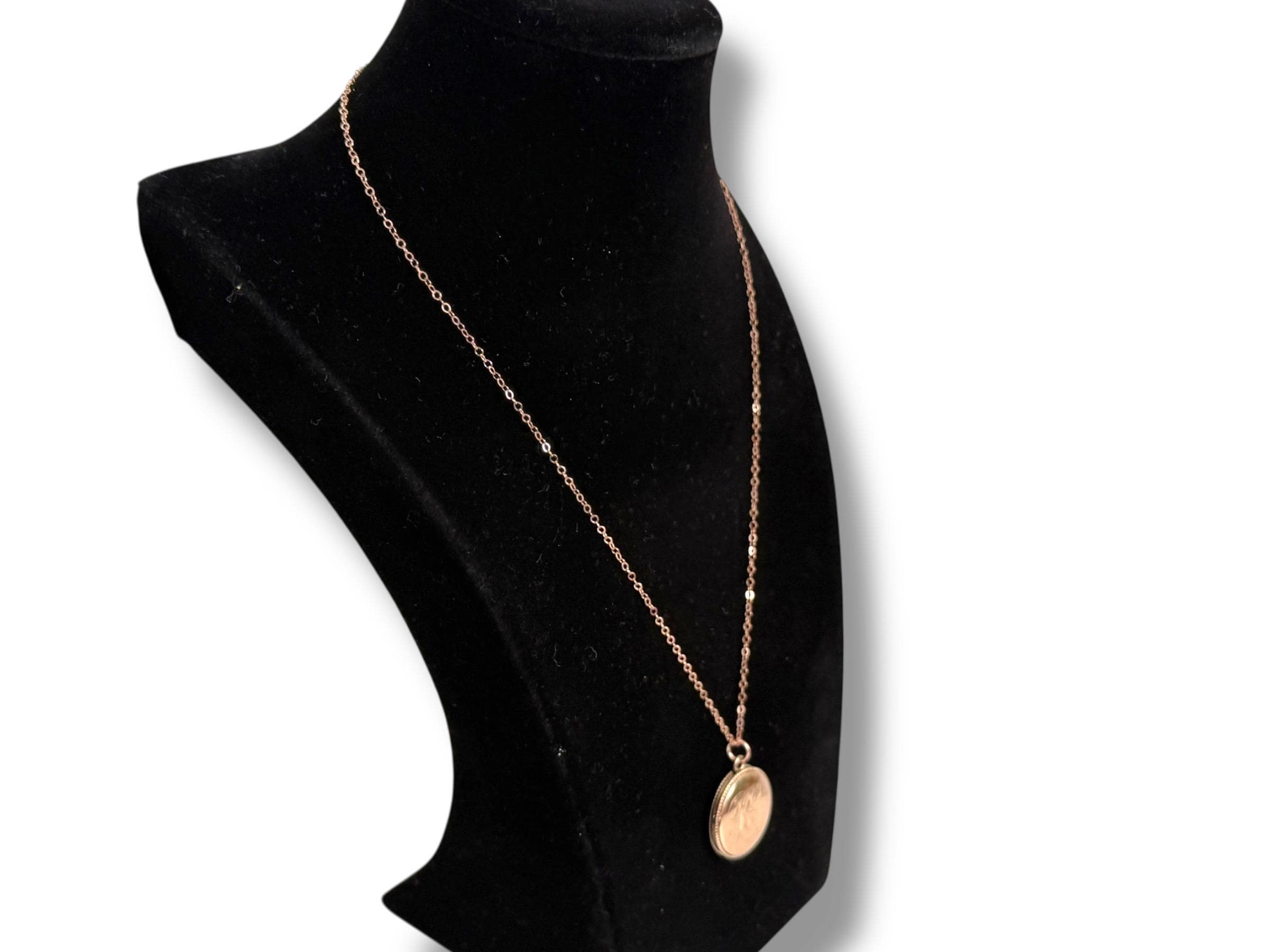 The vintage locket hangs from a new 18'' 14K rose GF cable chain. The spring ring clasp opens and closes securely.