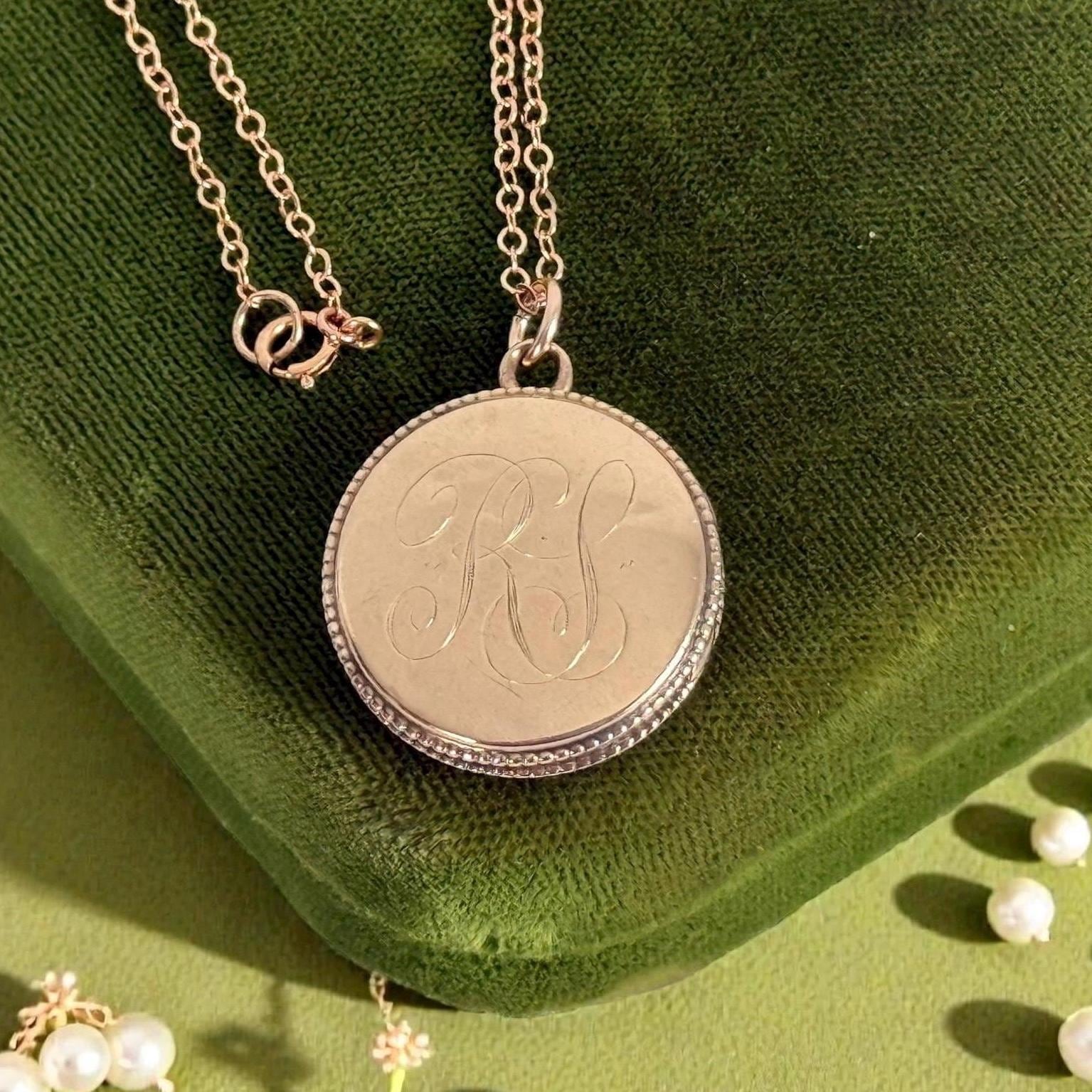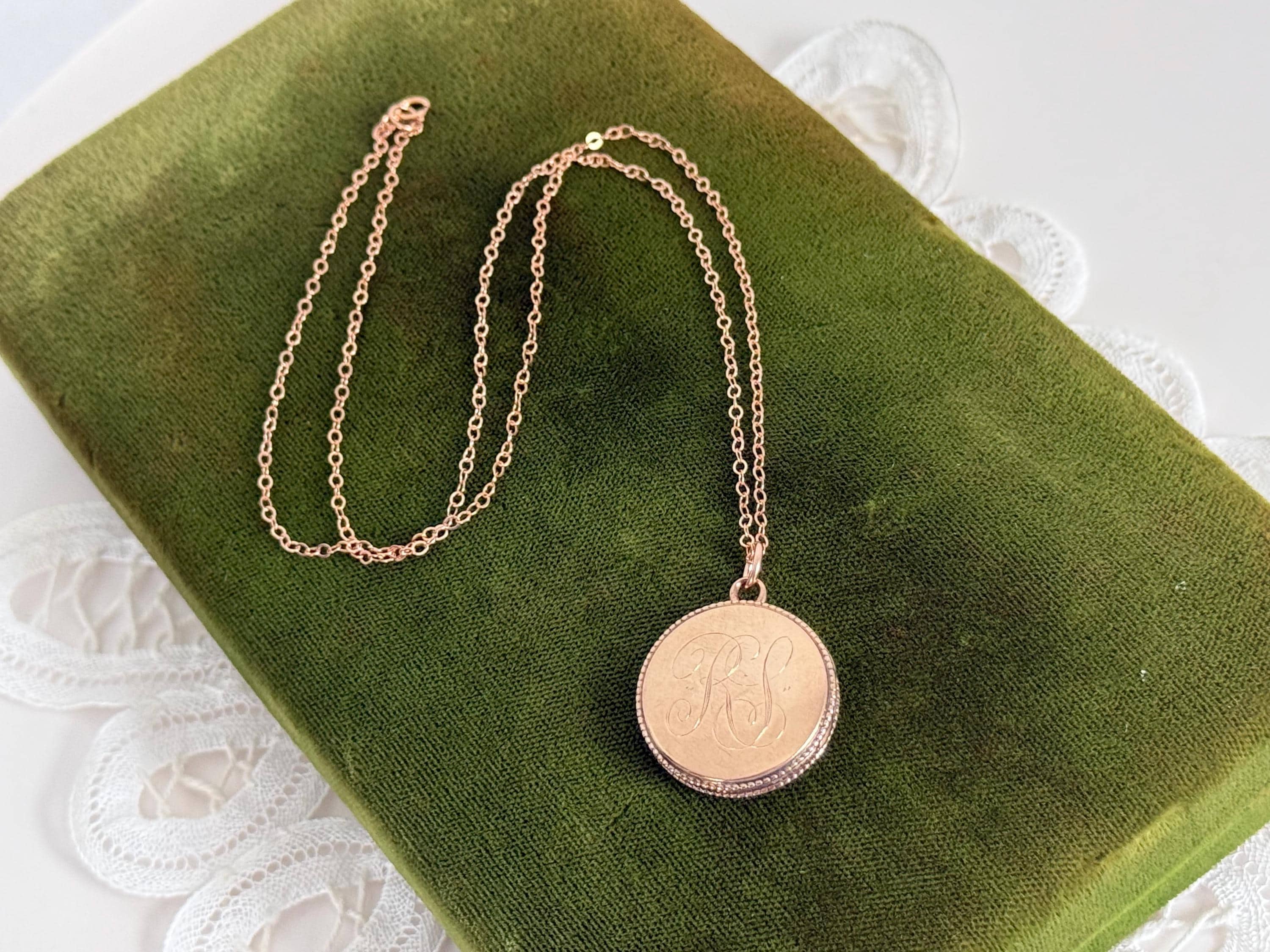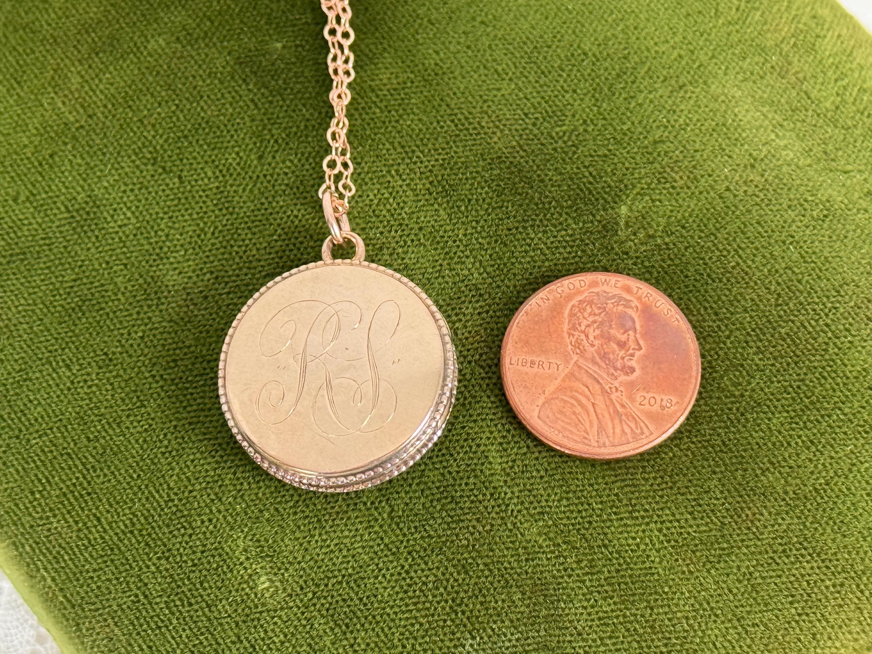 Sweet vintage round rose gold filled locket that hangs on a new 14K gold filled chain. The pendant has a monogram of RS the front in an old cursive font. The back is plain with no design. The side edges of this form locket have a tiny rope trim.