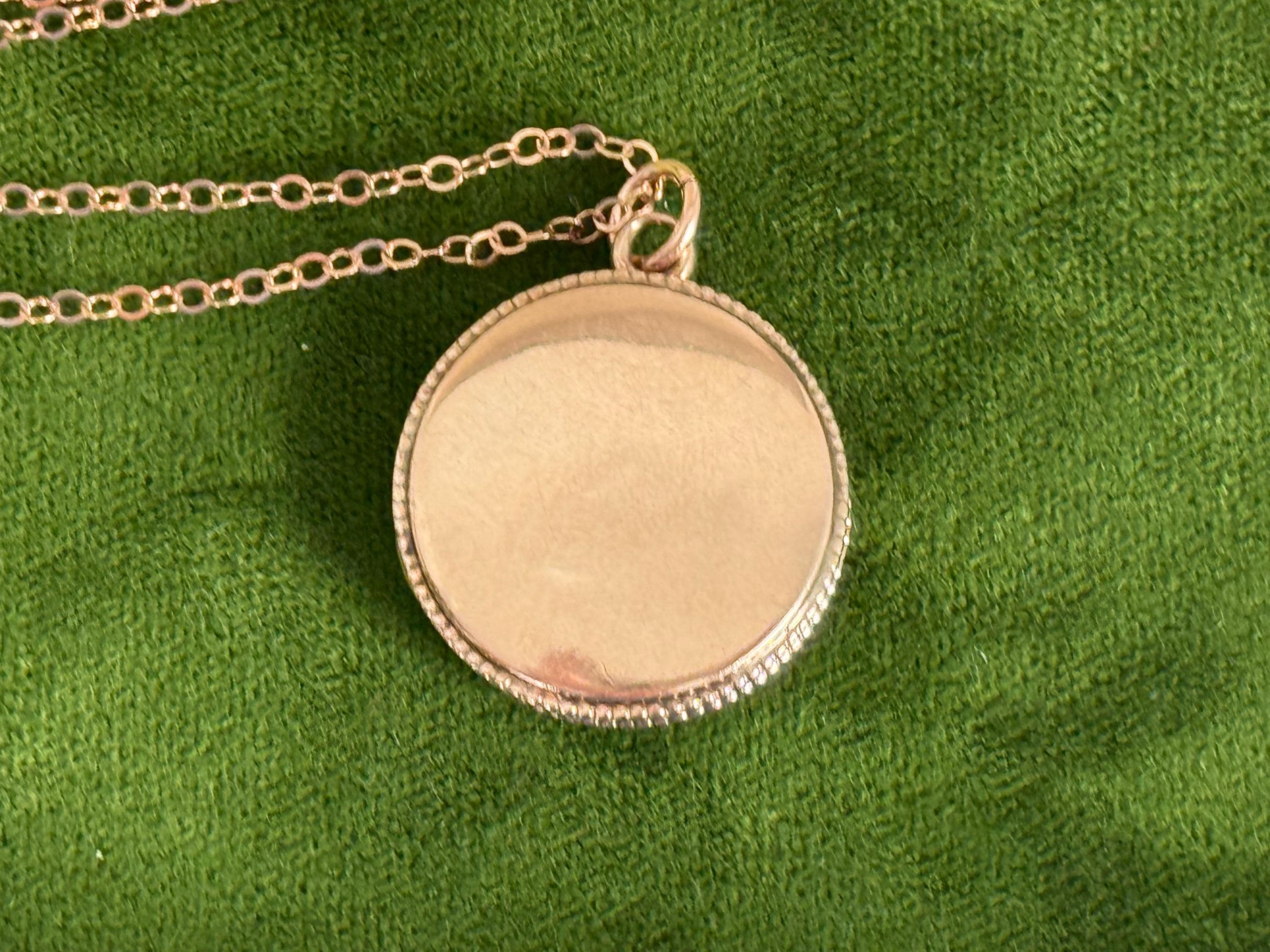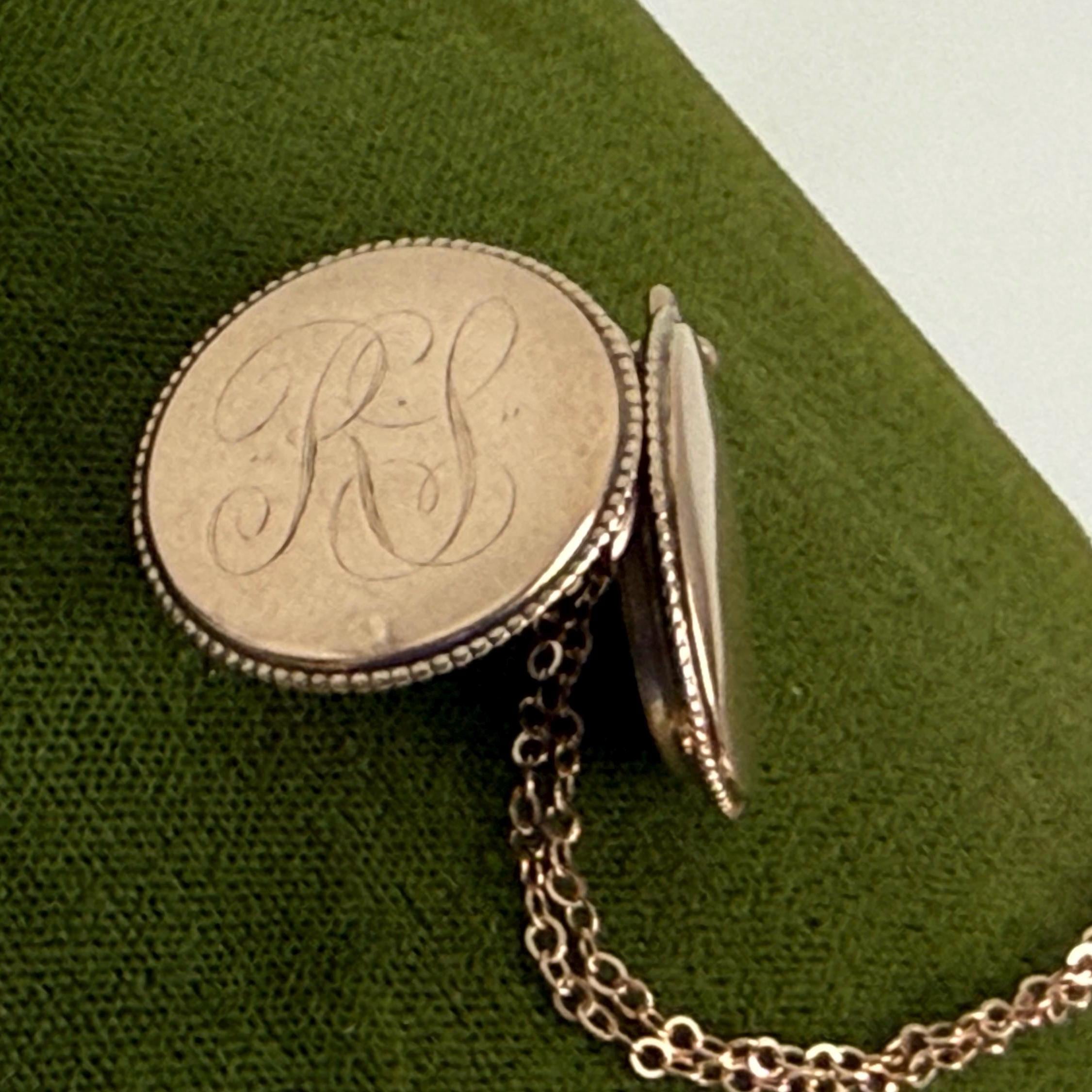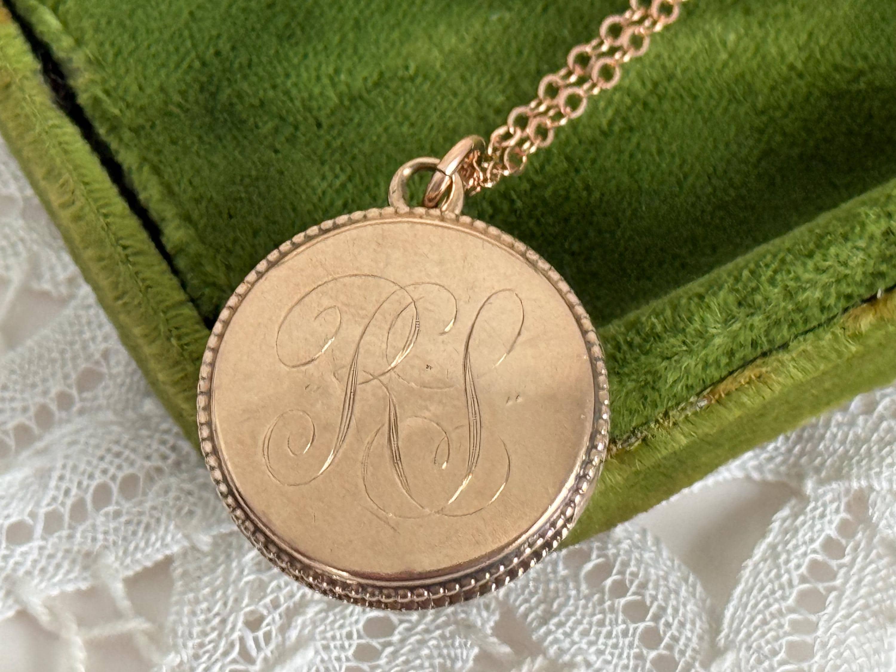 Sweet vintage round rose gold filled locket that hangs on a new 14K gold filled chain. The pendant has a monogram of RS the front in an old cursive font. The back is plain with no design. The side edges of this form locket have a tiny rope trim.