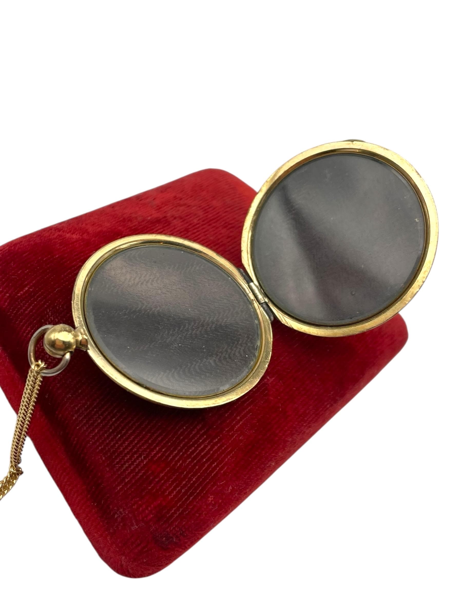 The locket is circa late 1800s. This rather large locket is a classic piece and makes a bold statement when worn. Large, shiny, gold and absolutely gorgeous designs on both sides!
