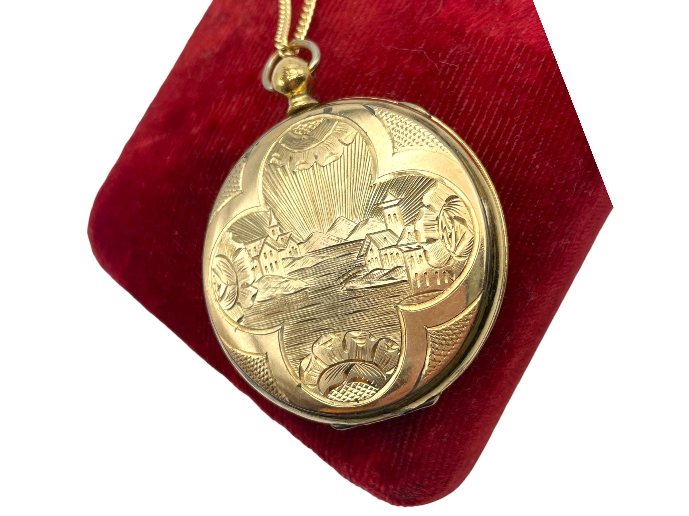 Lovely, detailed and very large vintage 19th century etched and engraved gold plated locket that has two beautifully made sides. One side has a swirling floral design, the other a landscape with houses and hills in the background.