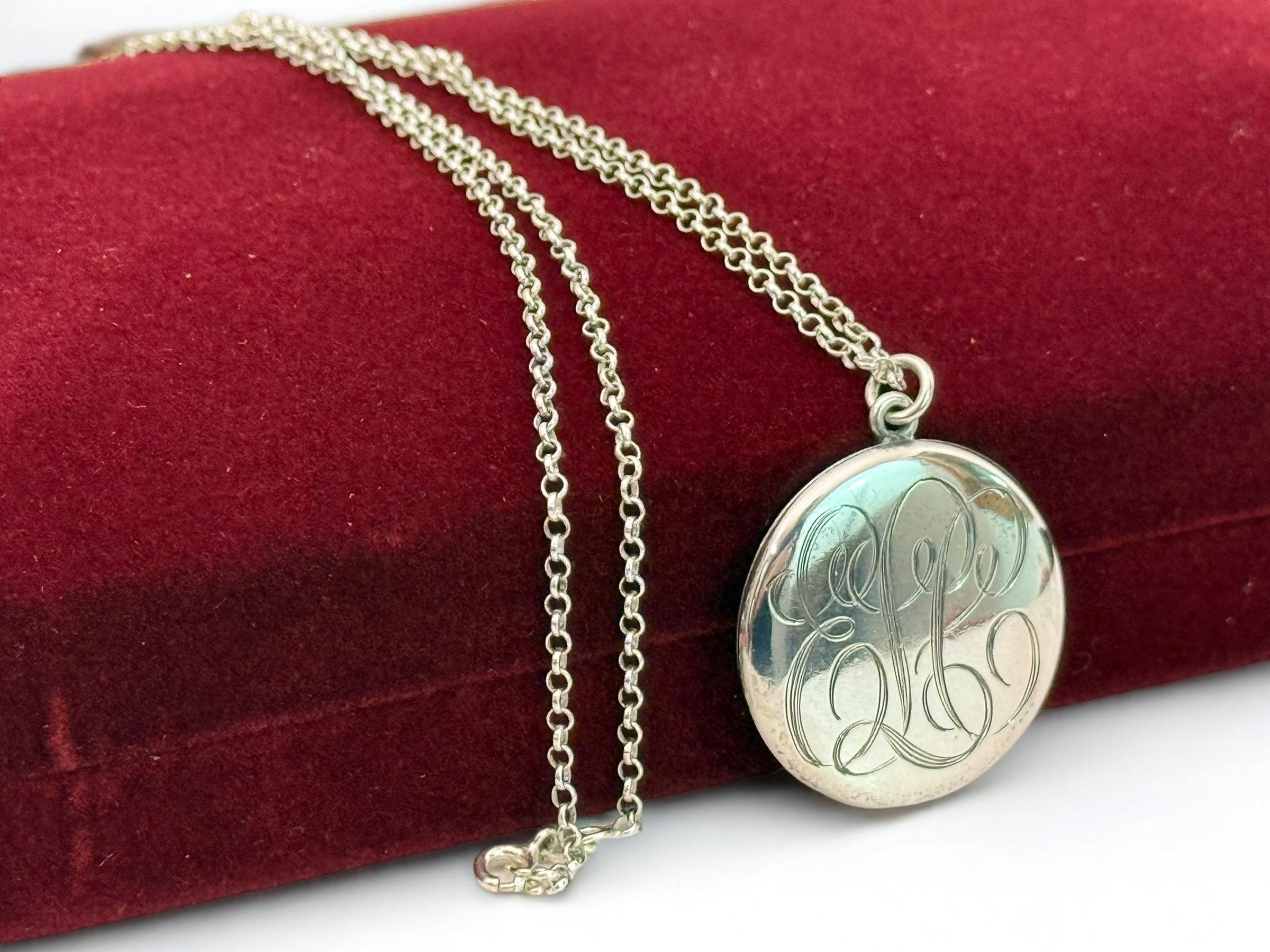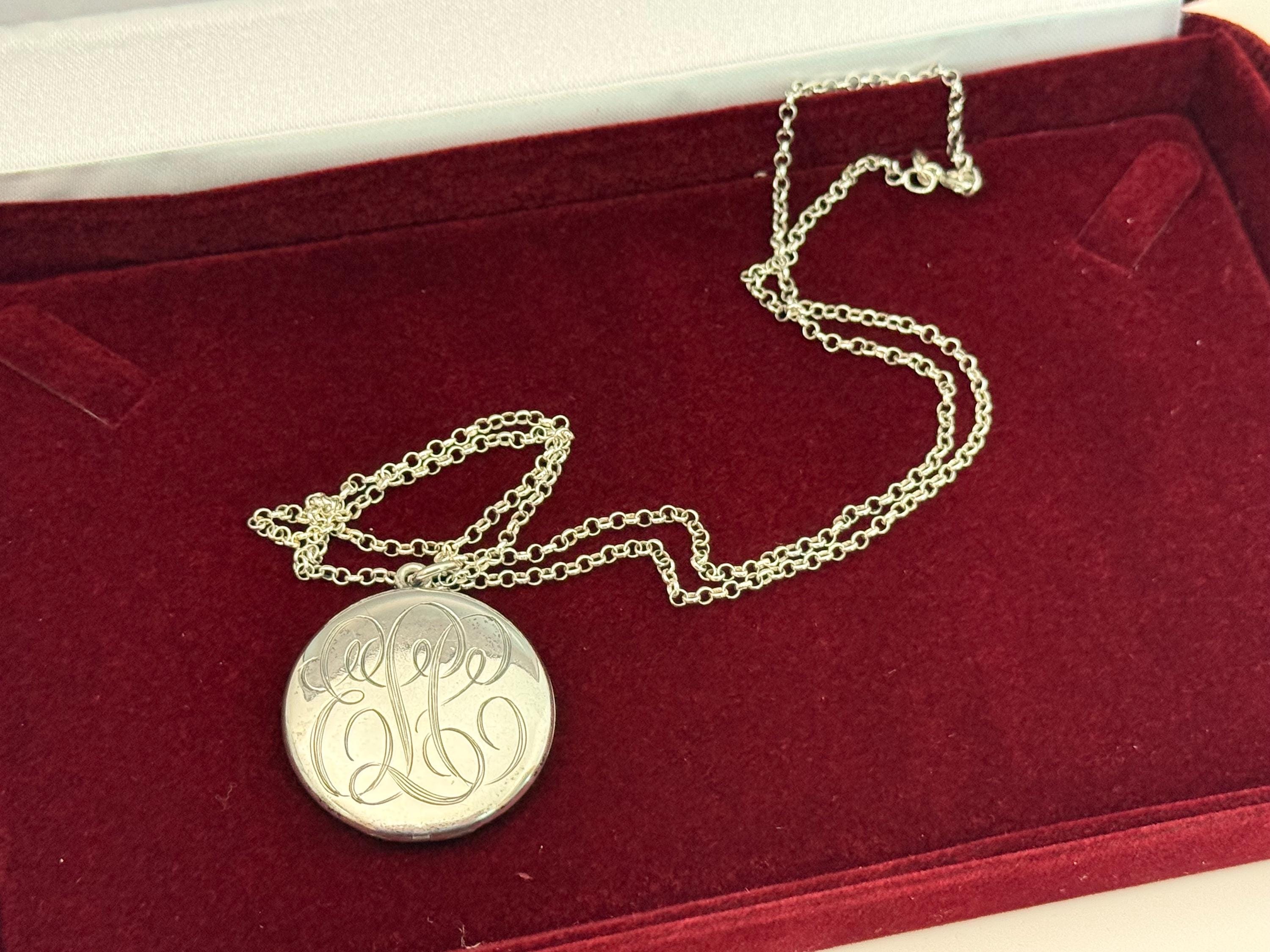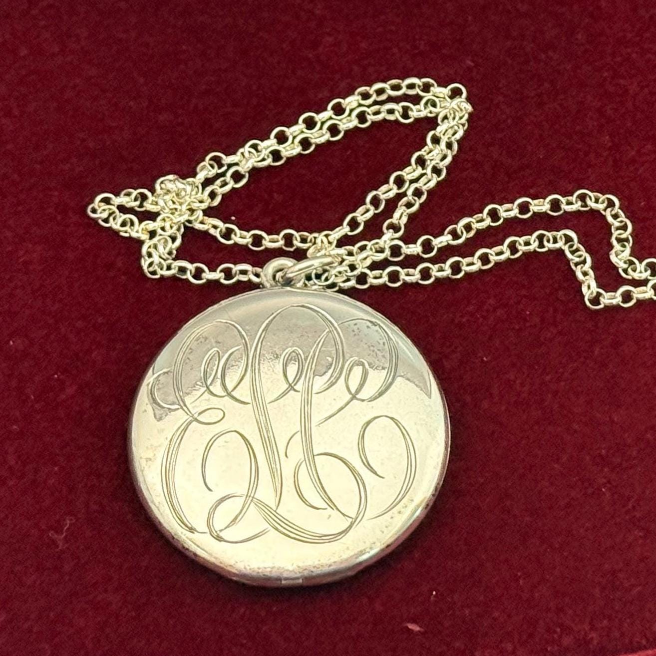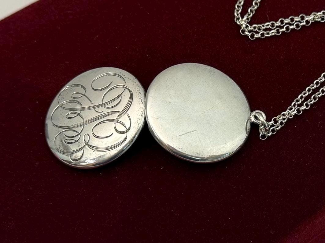 Beautiful Sterling Silver vintage round locket, hand engraved with a cursive font monogram of ELC hanging from a Sterling Silver chain. The front of this large oval locket is monogrammed in an old cursive font with the initials ELC, while the back side is plain. Both the front and the back have a shiny finish. There is a round loop bale on the top of the locket itself. The locket closes securely. Both of the inner wells are marked STERLING.