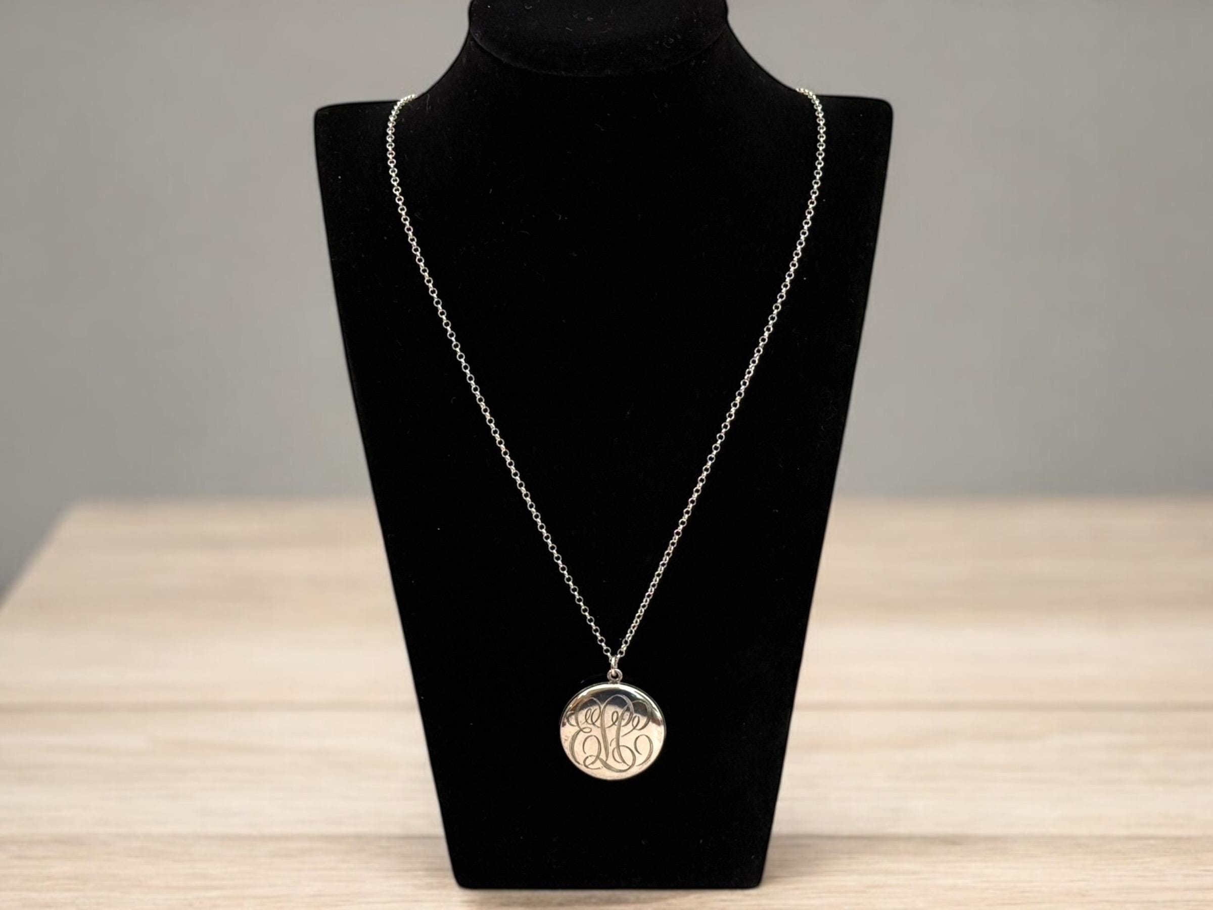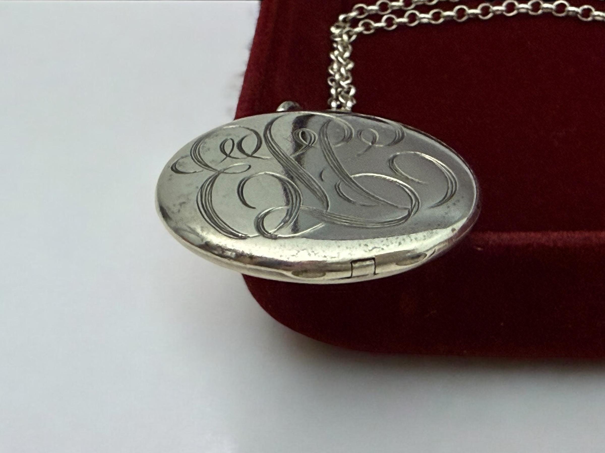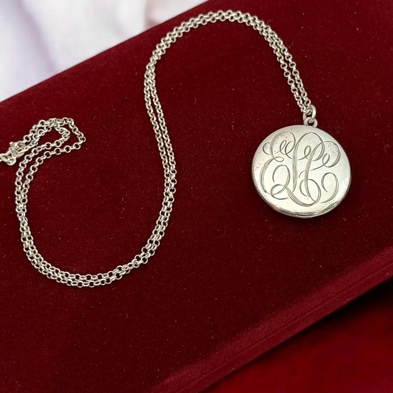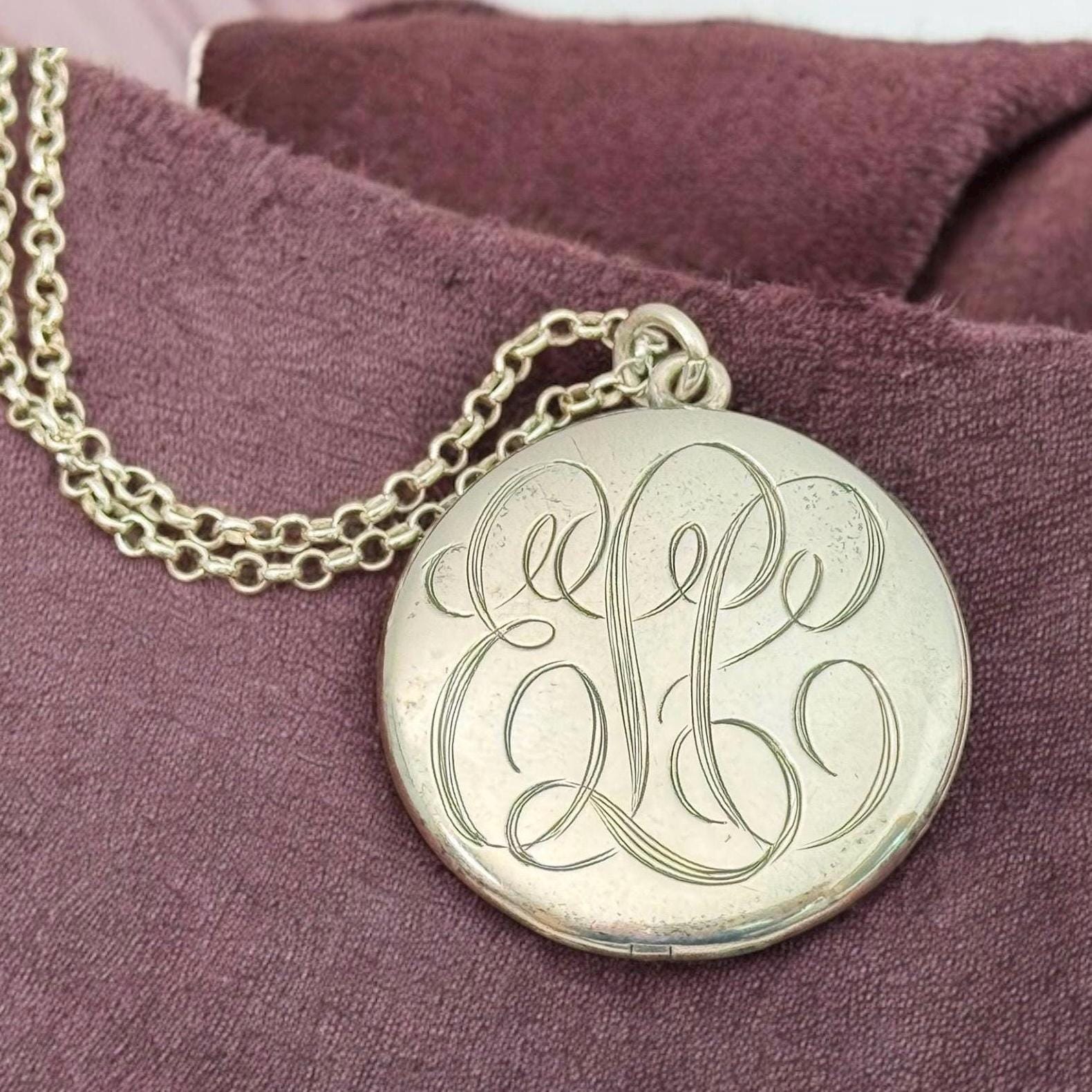 Beautiful Sterling Silver vintage round locket, hand engraved with a cursive font monogram of ELC hanging from a Sterling Silver chain. The front of this large oval locket is monogrammed in an old cursive font with the initials ELC, while the back side is plain. Both the front and the back have a shiny finish. There is a round loop bale on the top of the locket itself. The locket closes securely. Both of the inner wells are marked STERLING.