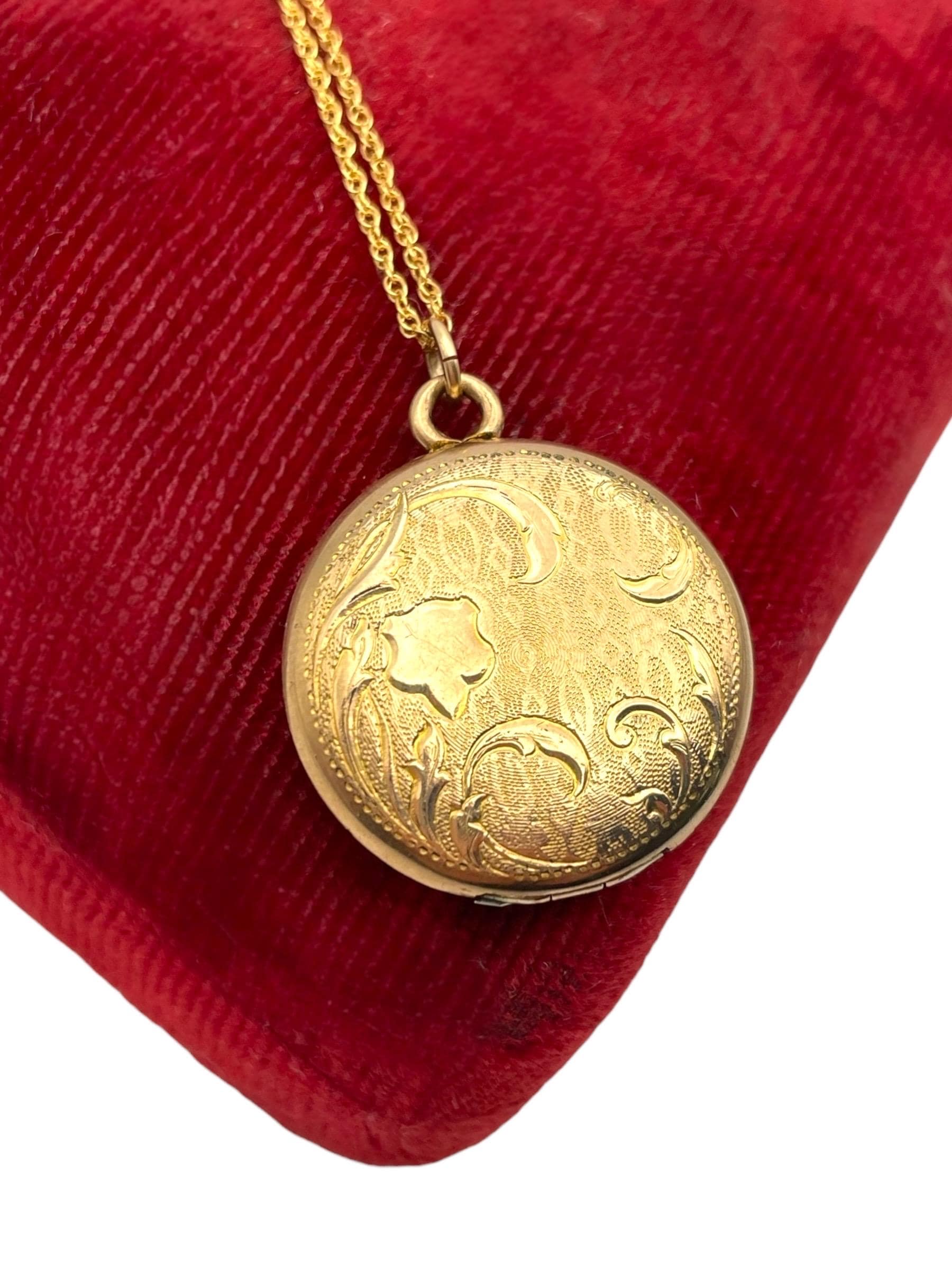 Beautiful round antique gold filled locket. This locket necklace is hallmarked for the FHS Company on the inner photo compartment. This company was in operation from 1890 to 1910.