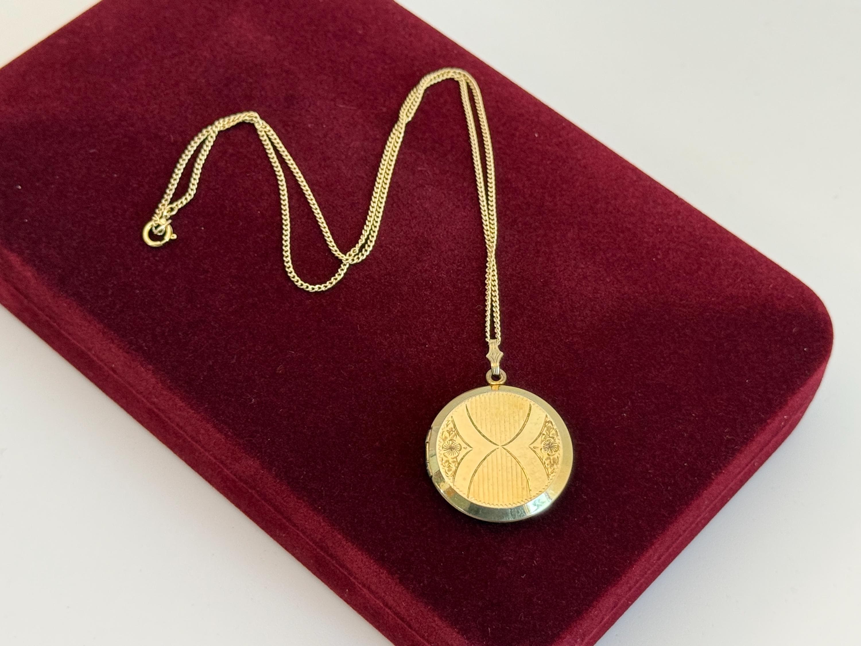 An etched flowery round shaped 12K gold filled locket on a new 18" long 14K gold filled cable link chain. This locket is hallmarked for the Bedford Company. (See NOTE below about this company.) The etched vertical lines in the center are bordered by flower designs that are 2 blooms along with some leafy accents. There is an hourglass shape in the center where the vertical lines are. The back is plain with no design. The locket had beveled edges on both the front and the back. The locket closes securely. It is circa mid century in age.