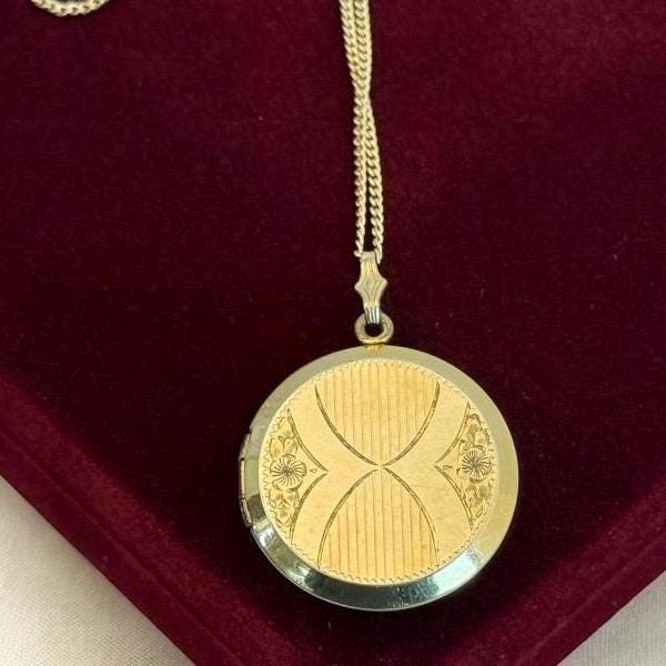 Vintage 12K Gold Filled Etched Round Locket on 14K GF Chain, 2 Photo Pendant