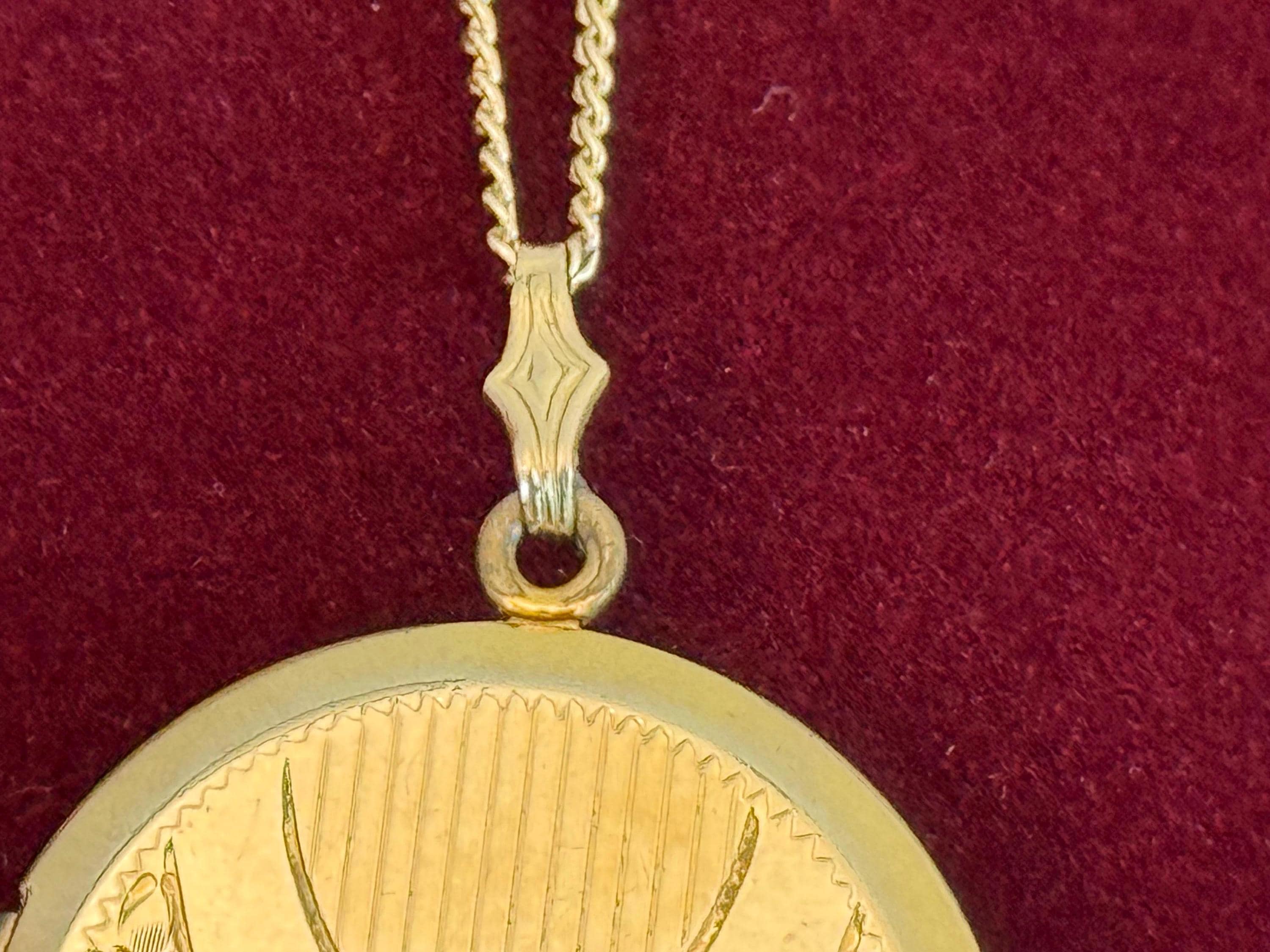 The 12K gold filled locket hangs on a new 14K gold filled curb link chain. The locket’s bale is fanned and has a curled ends: one for the chain and one for the locket. The clasp on the chain closes securely.