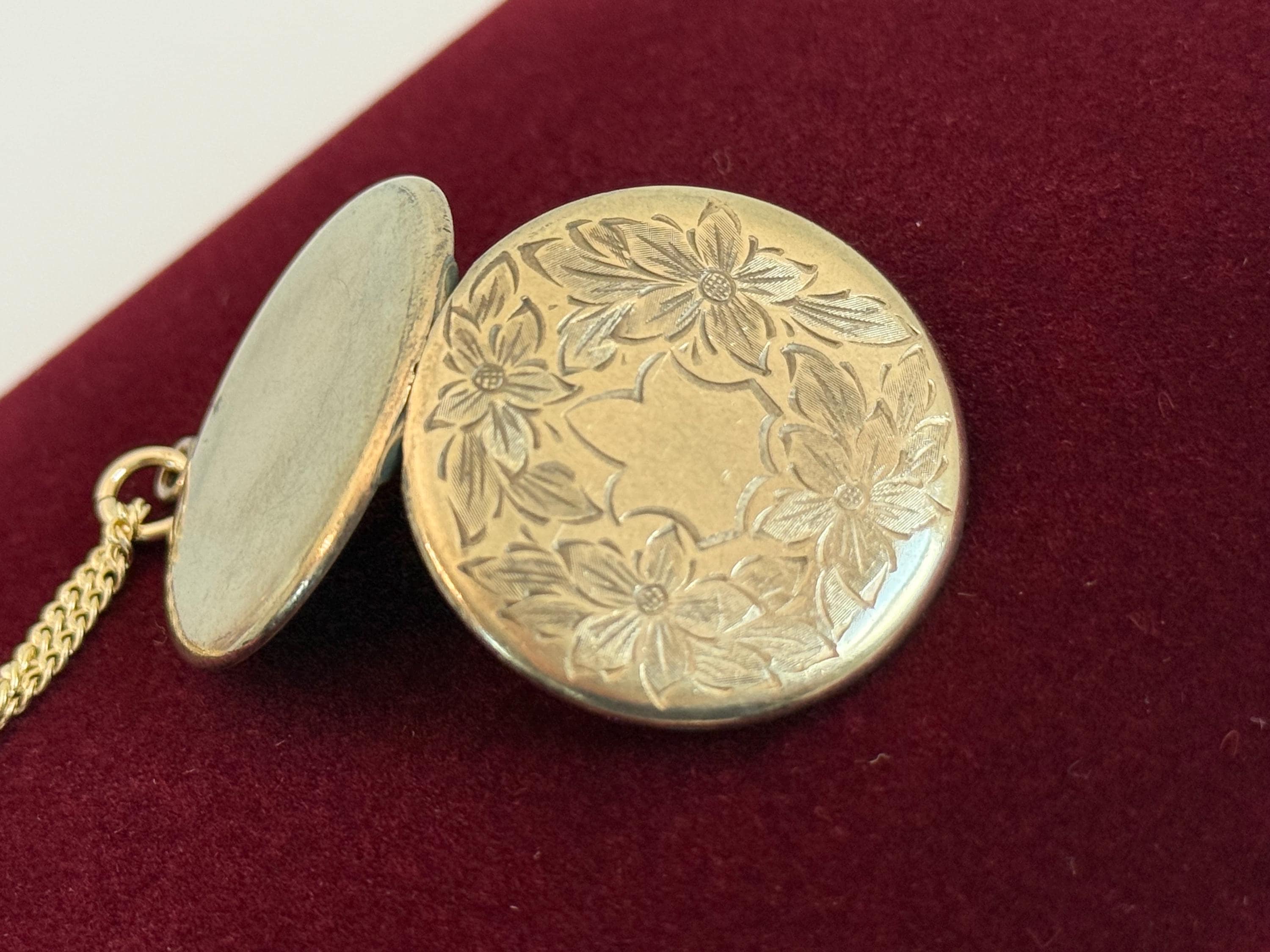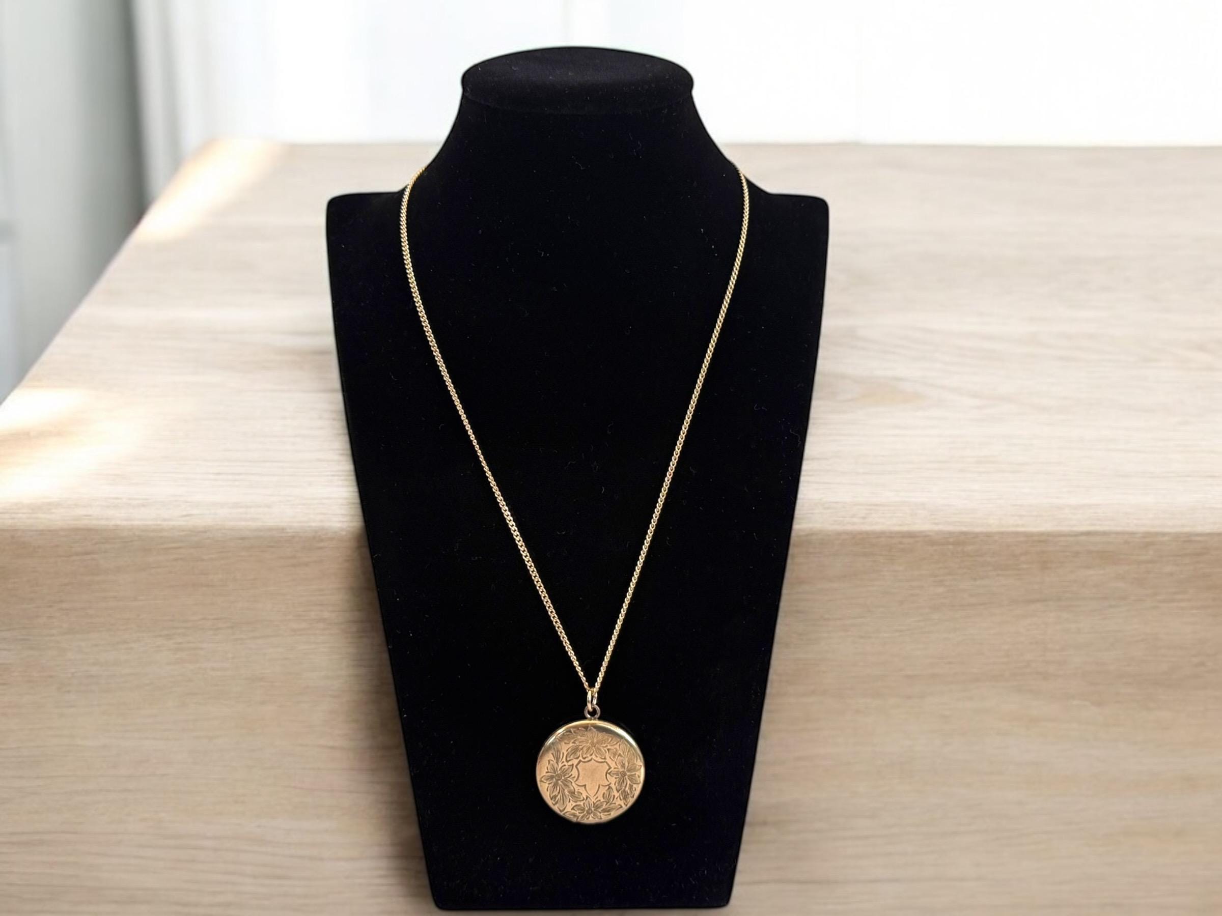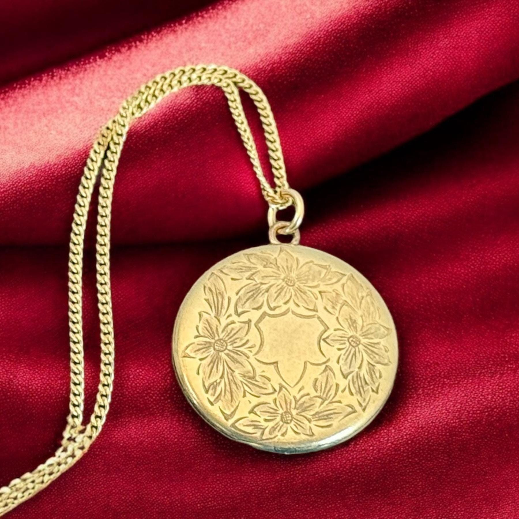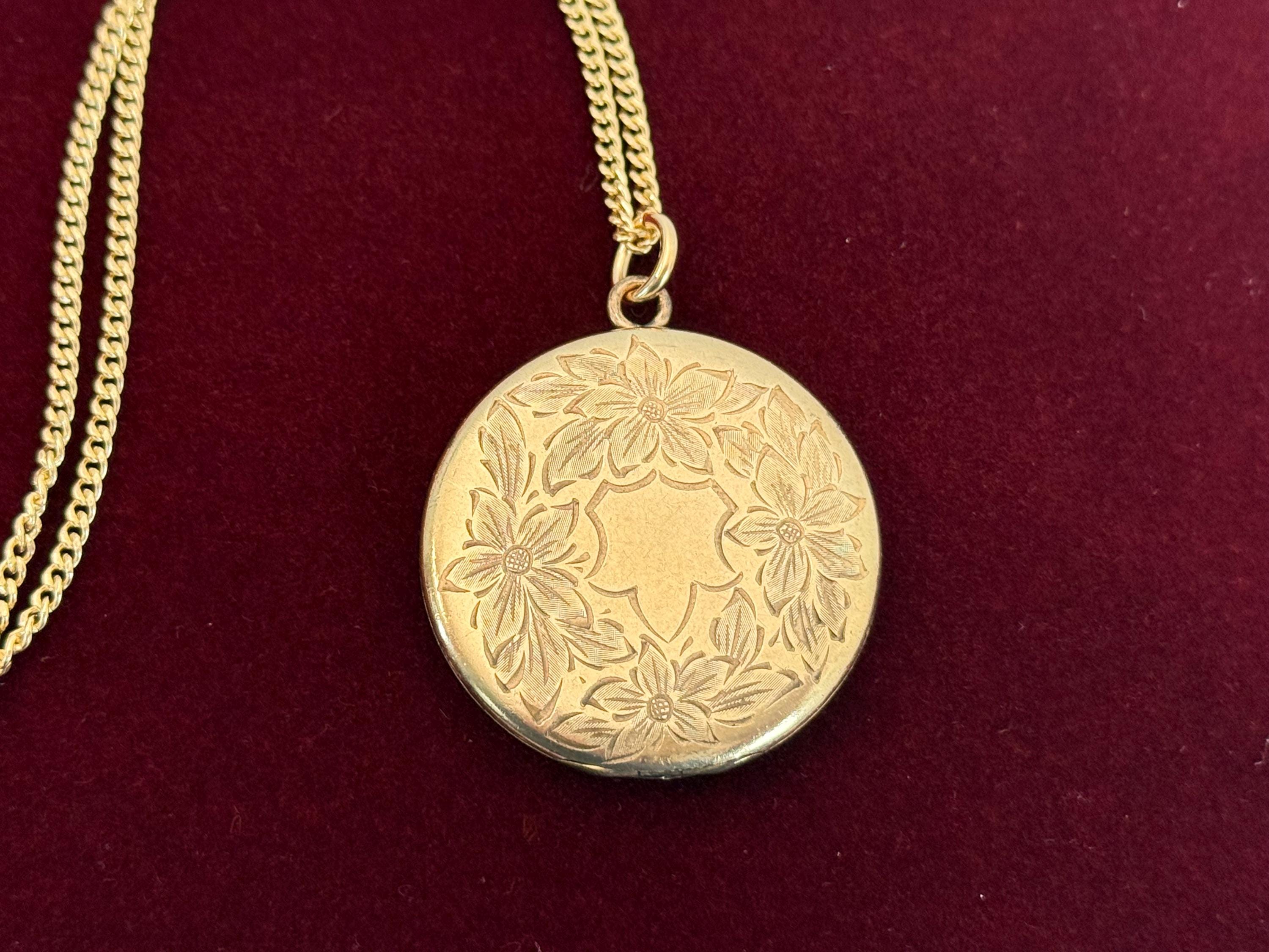 Antique Gold Filled Locket Necklace: Circle w/ Etched Flowers, 14K GF Chain