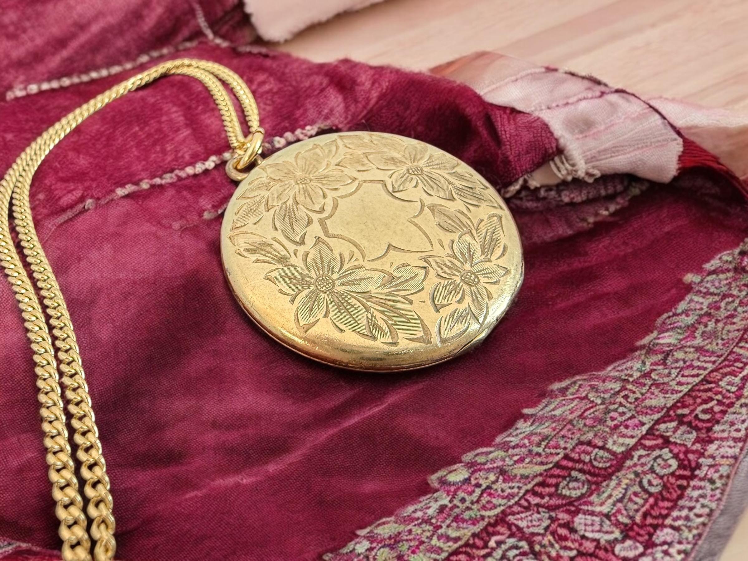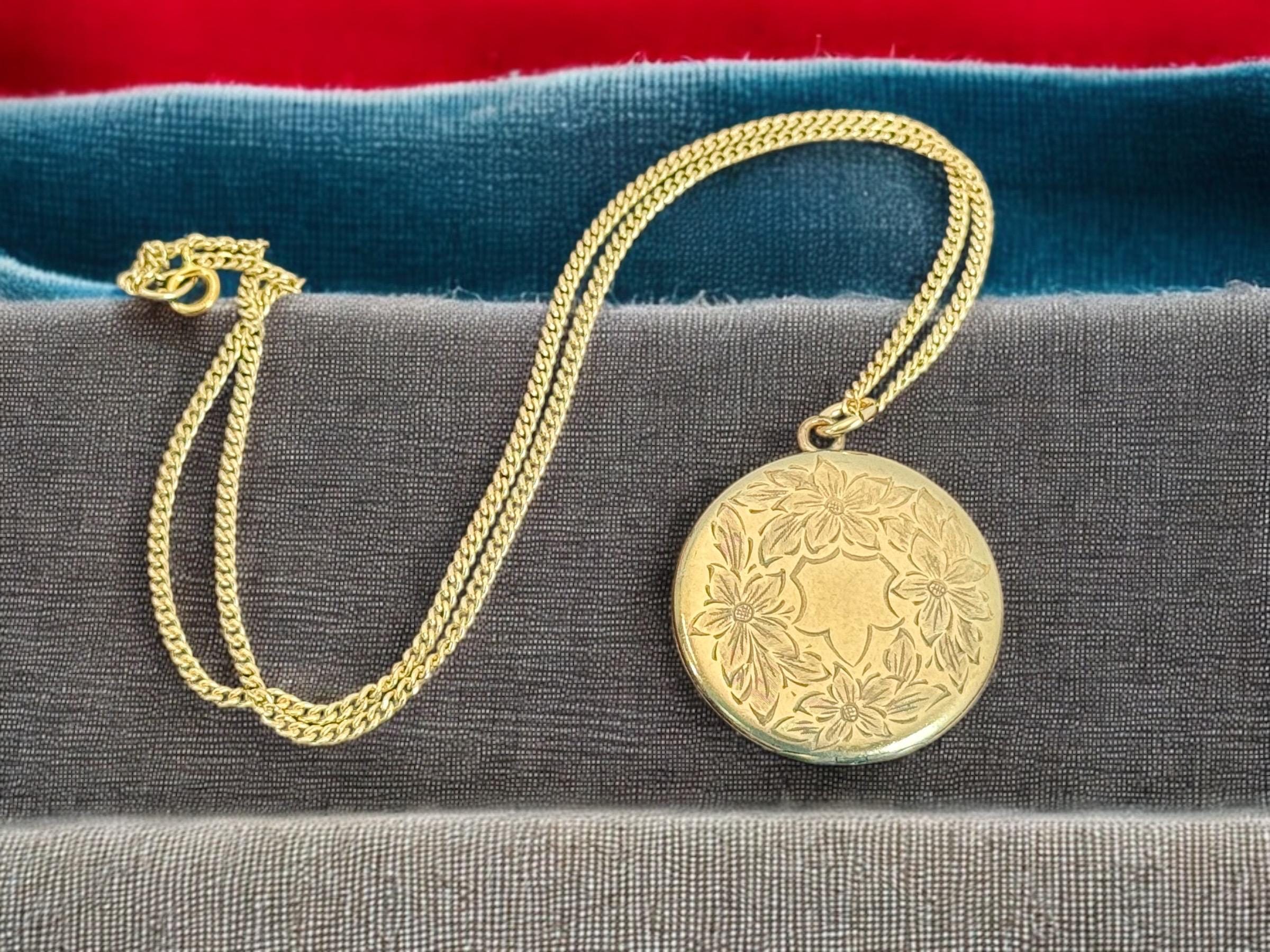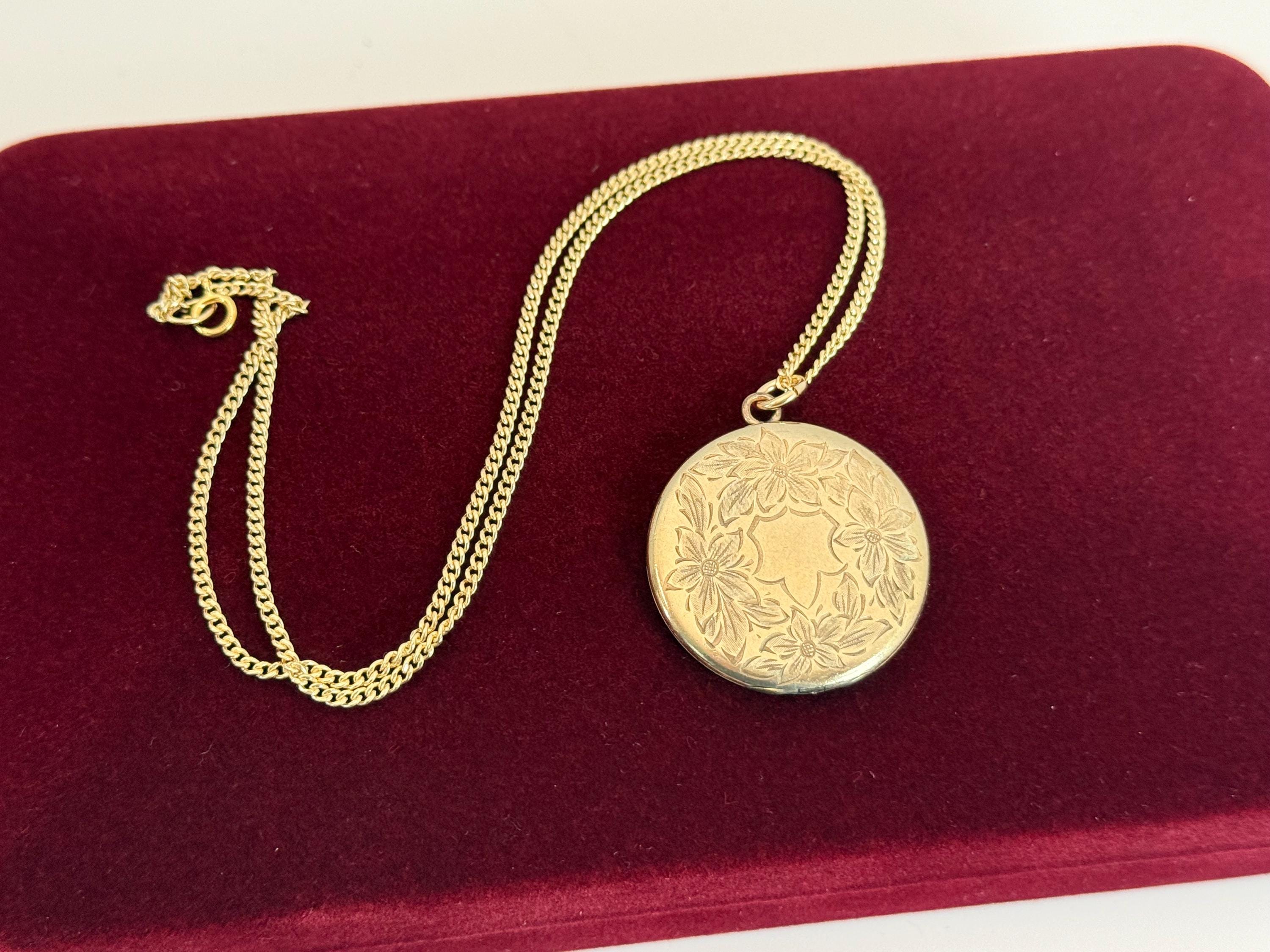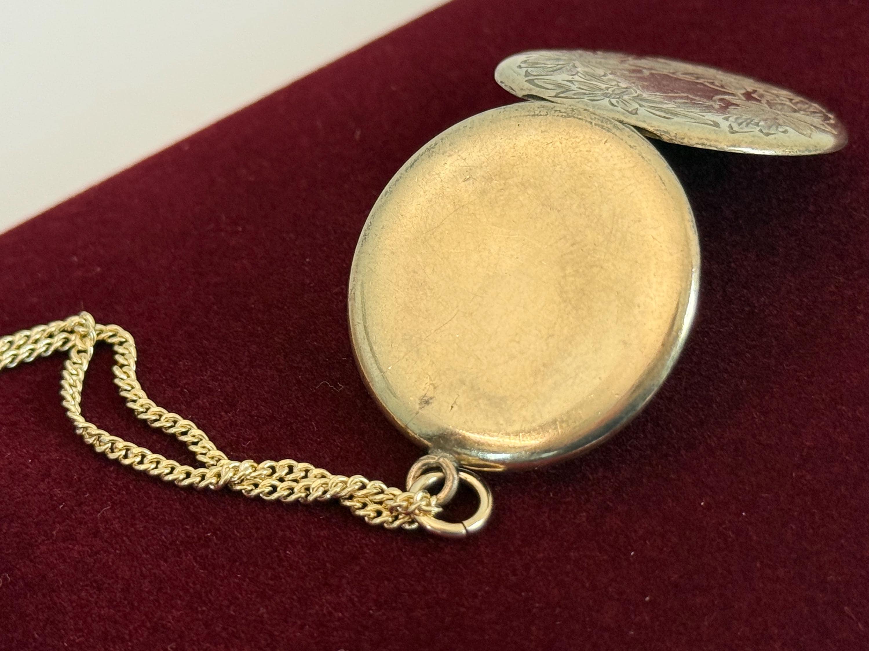 Antique Gold Filled Locket Necklace: Circle w/ Etched Flowers, 14K GF Chain