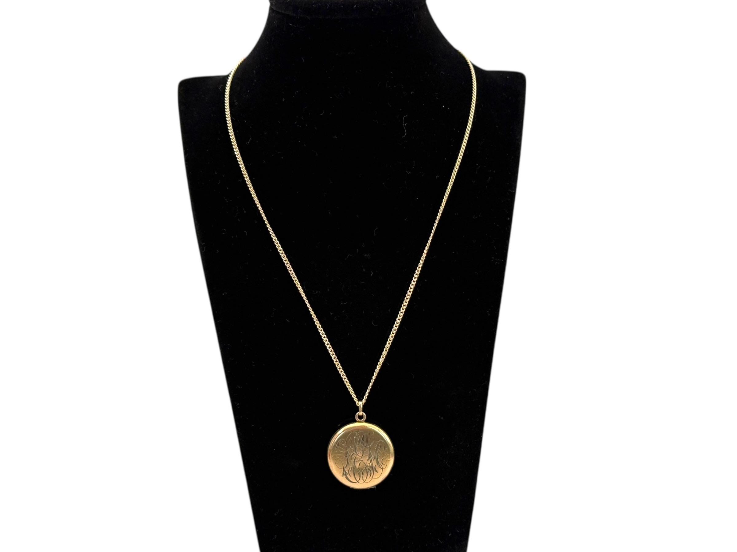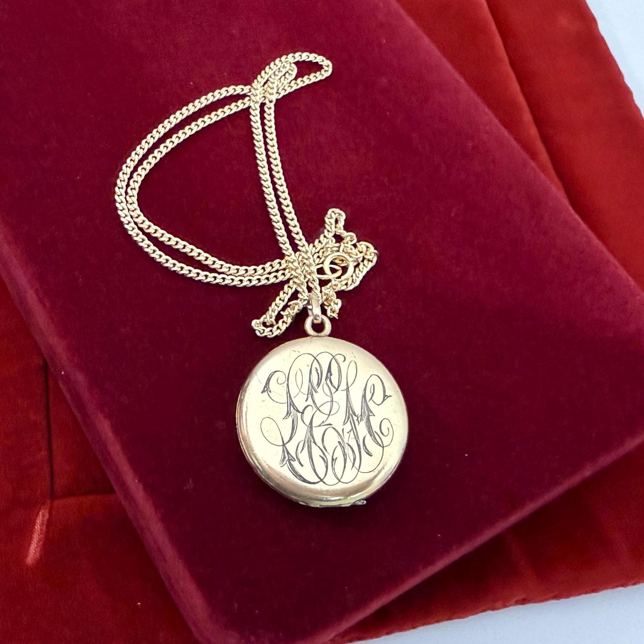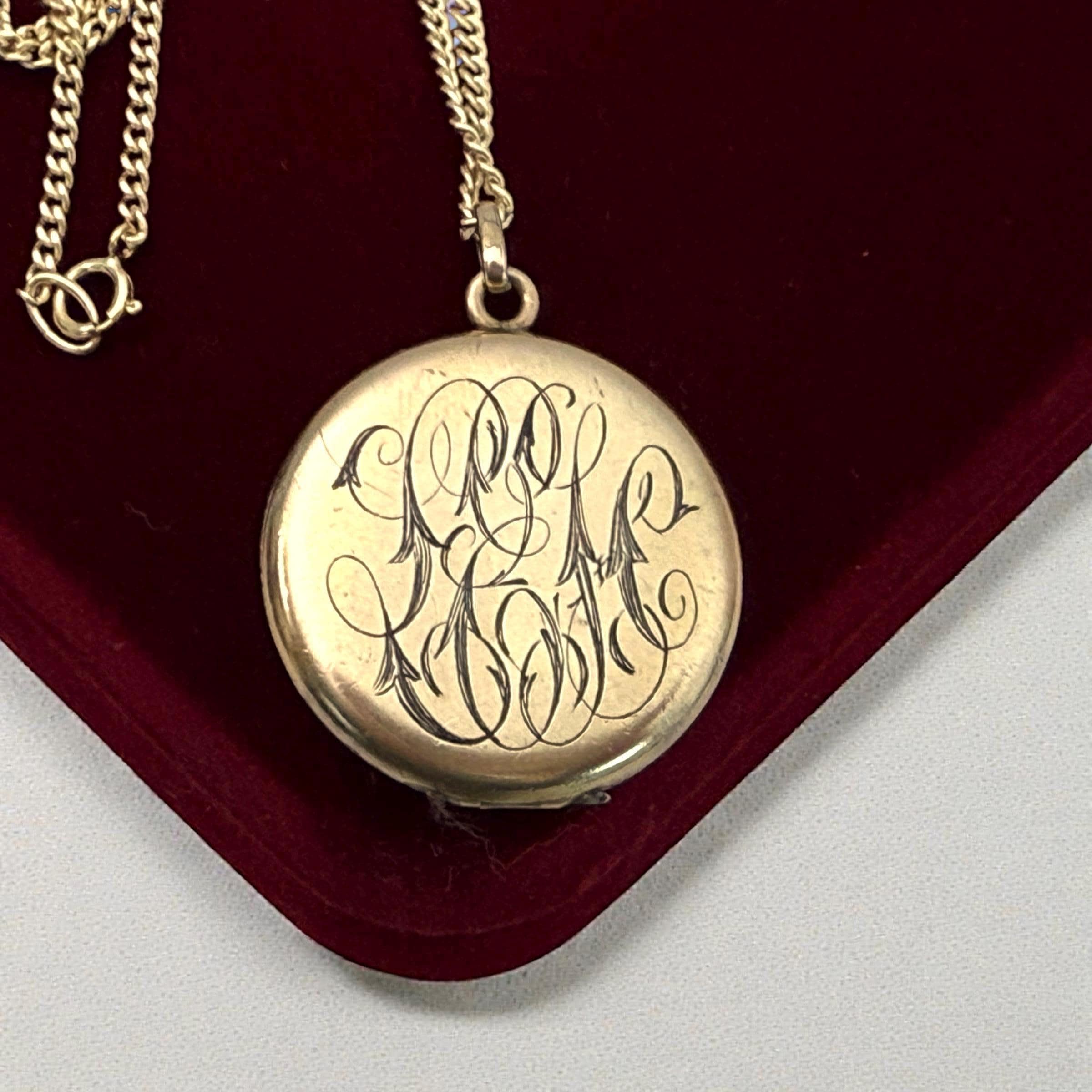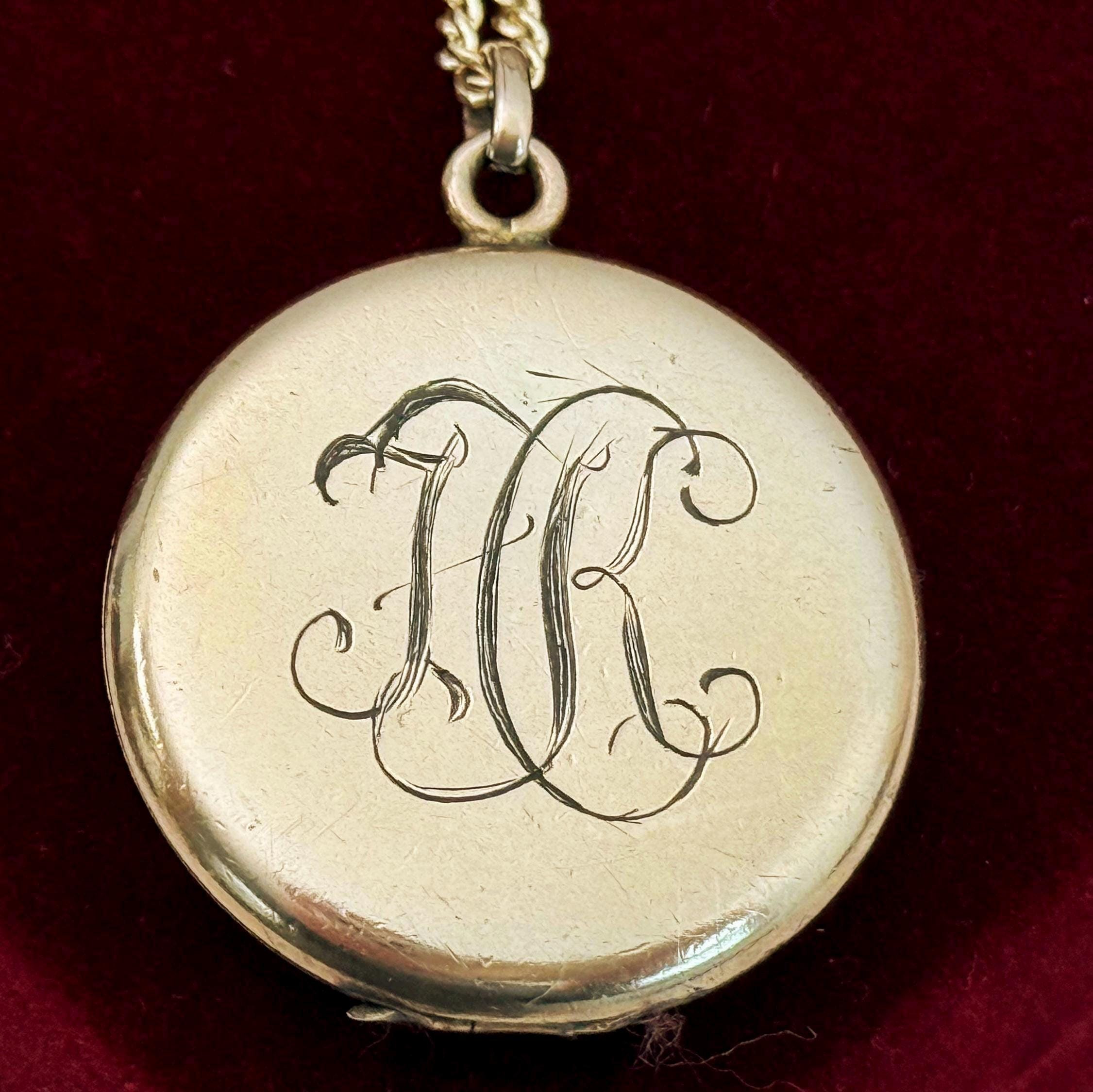 Beautiful round antique gold filled locket featuring a monogrammed front and back. The one has the initials "HK” in cursive script while the other side has three VERY ornate initials that I am unable to decipher but would guess are "LEH". This type of monogrammed locket was very popular during the Edwardian era.