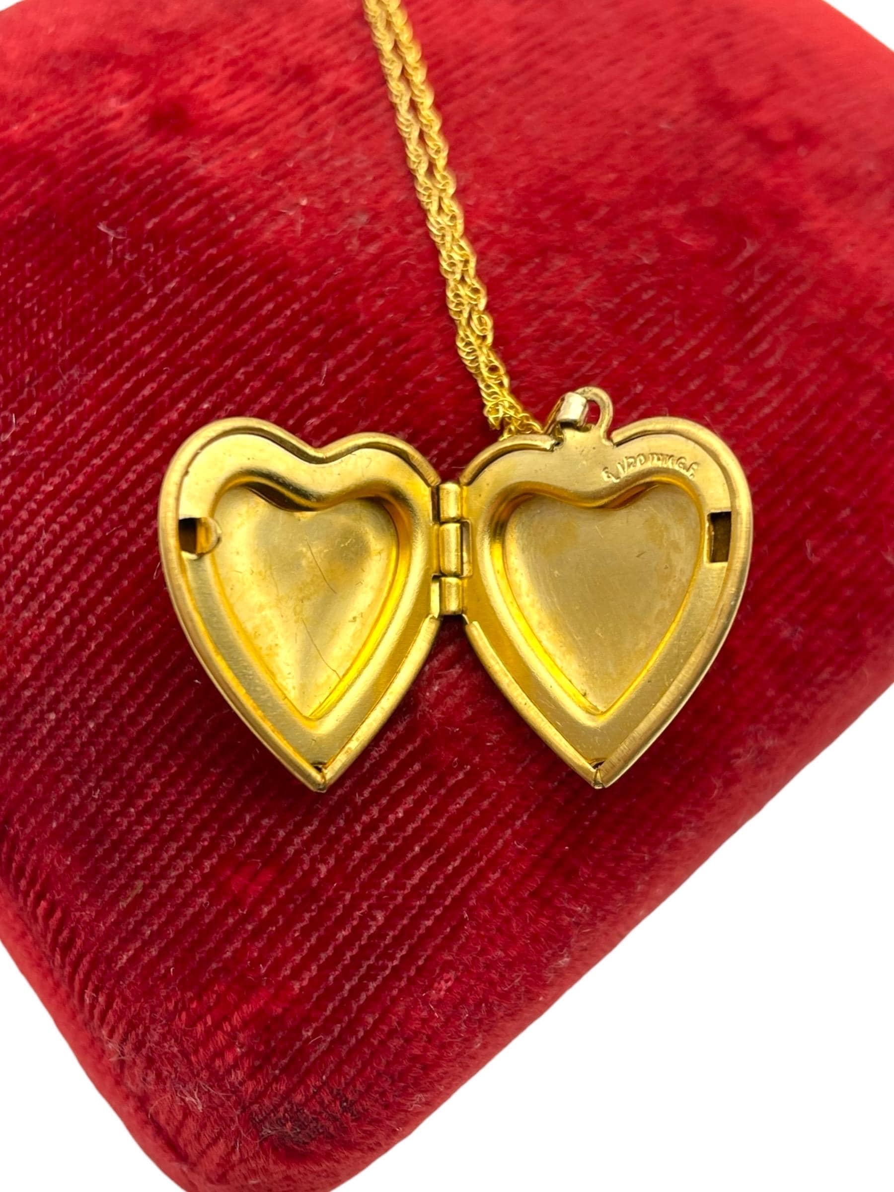 In nice vintage condition. Some light use marks here and there (such as on the back that is plain with no design). See photos for details. Locket opens and closes securely. Chain is new and in great condition. Lovely heart locket!