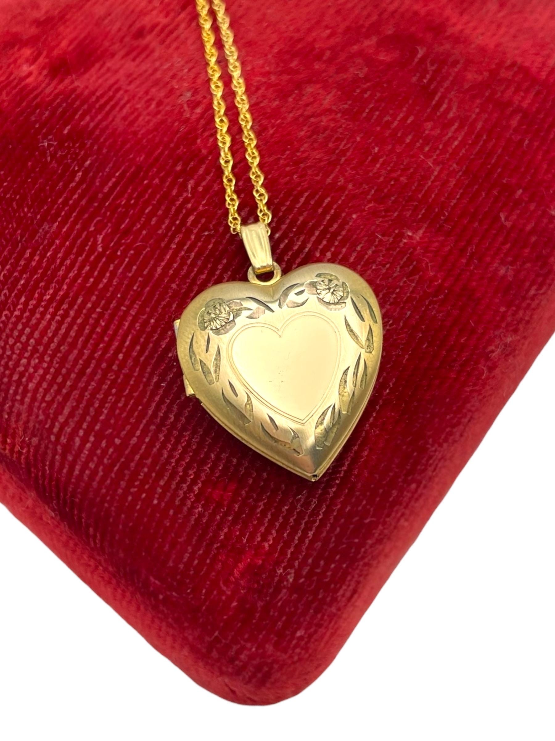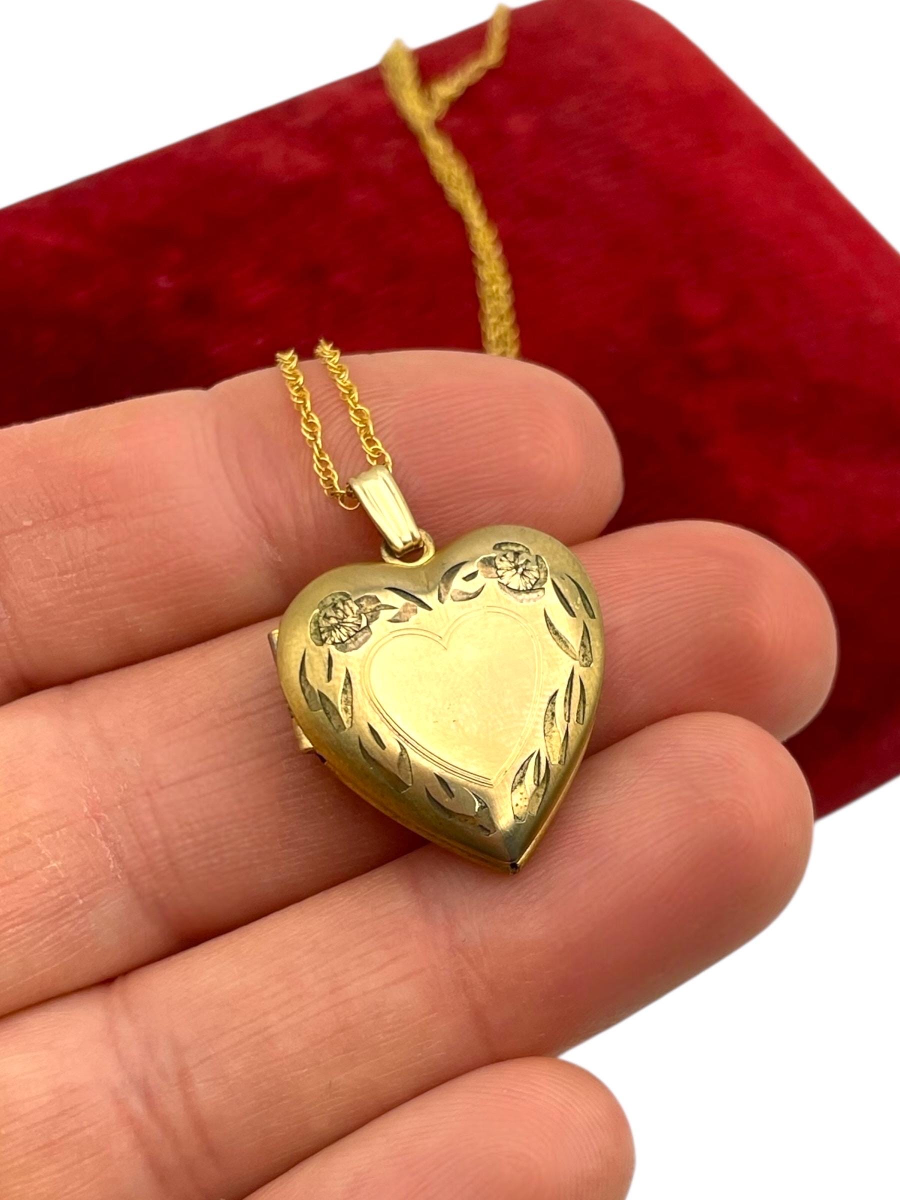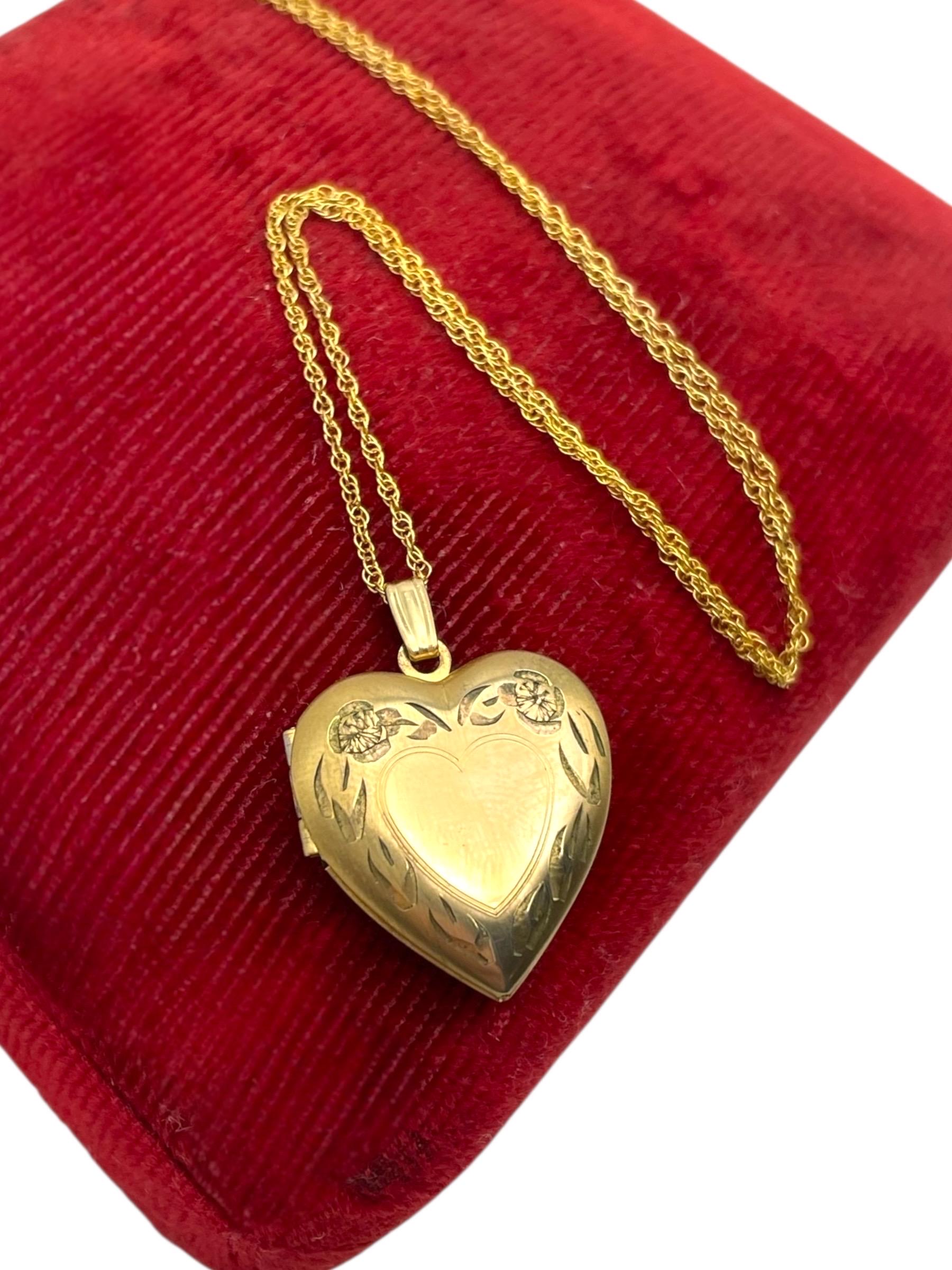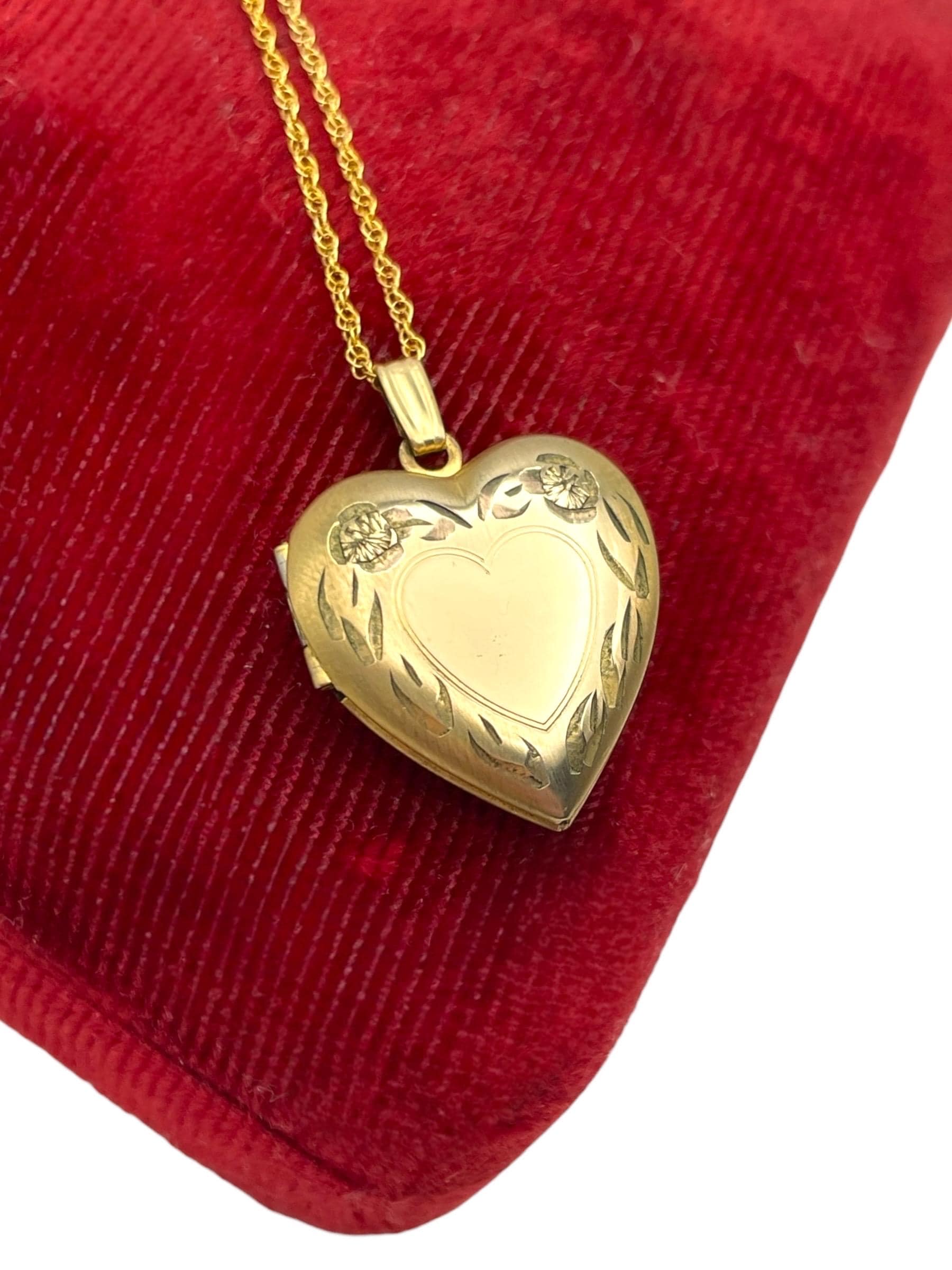 Feminine and classic vintage 14K gold filled heart shaped locket on a 14K gold filled chain. The heart shaped locket pendant has an etched heart on the front with some etched leaves and flowers surrounding it. The interior of the locket is completely empty and can hold two tiny photos (one on each side). No frames are present. The back of this locket is plain with no design. It closes securely with a snap.