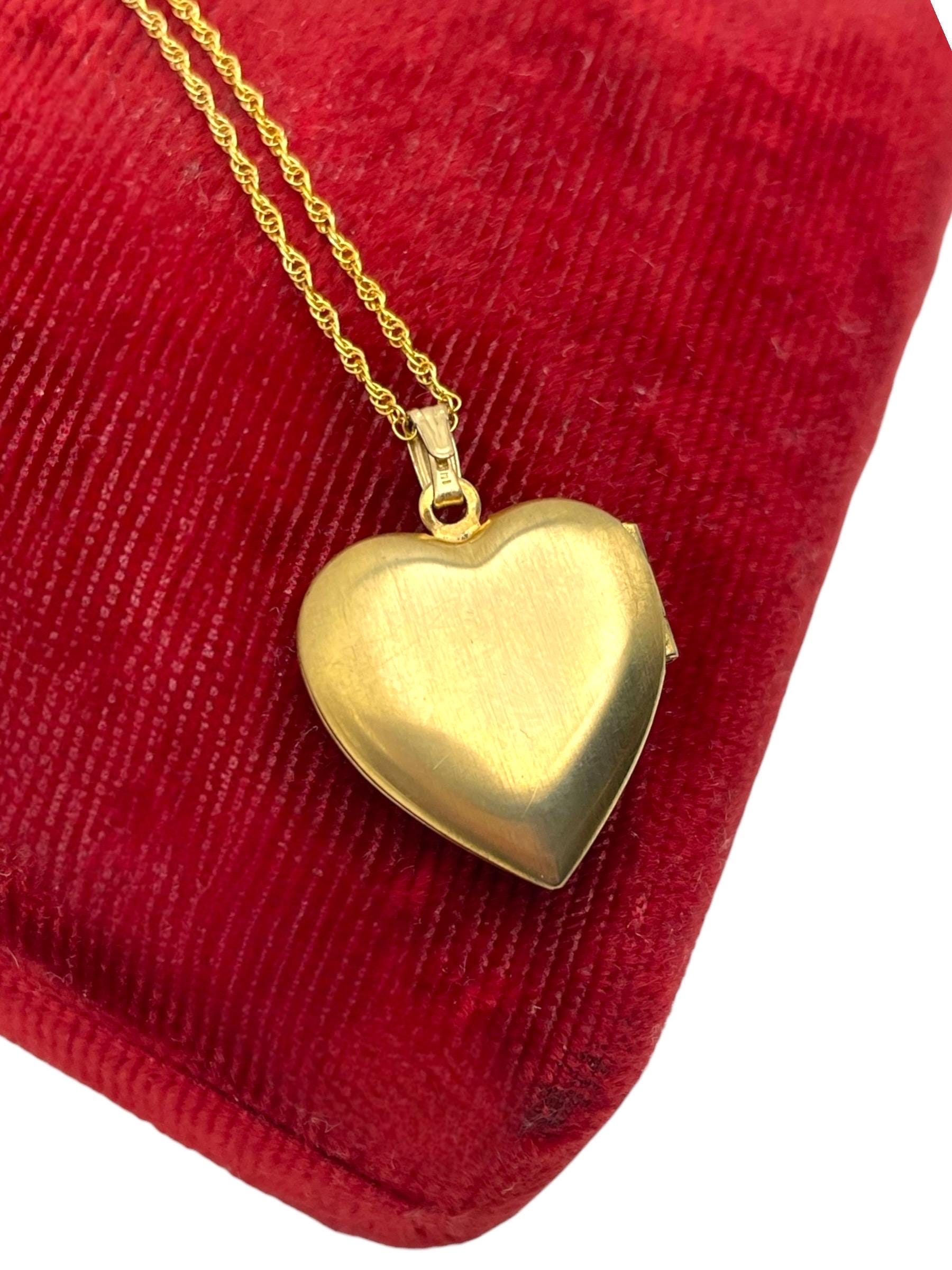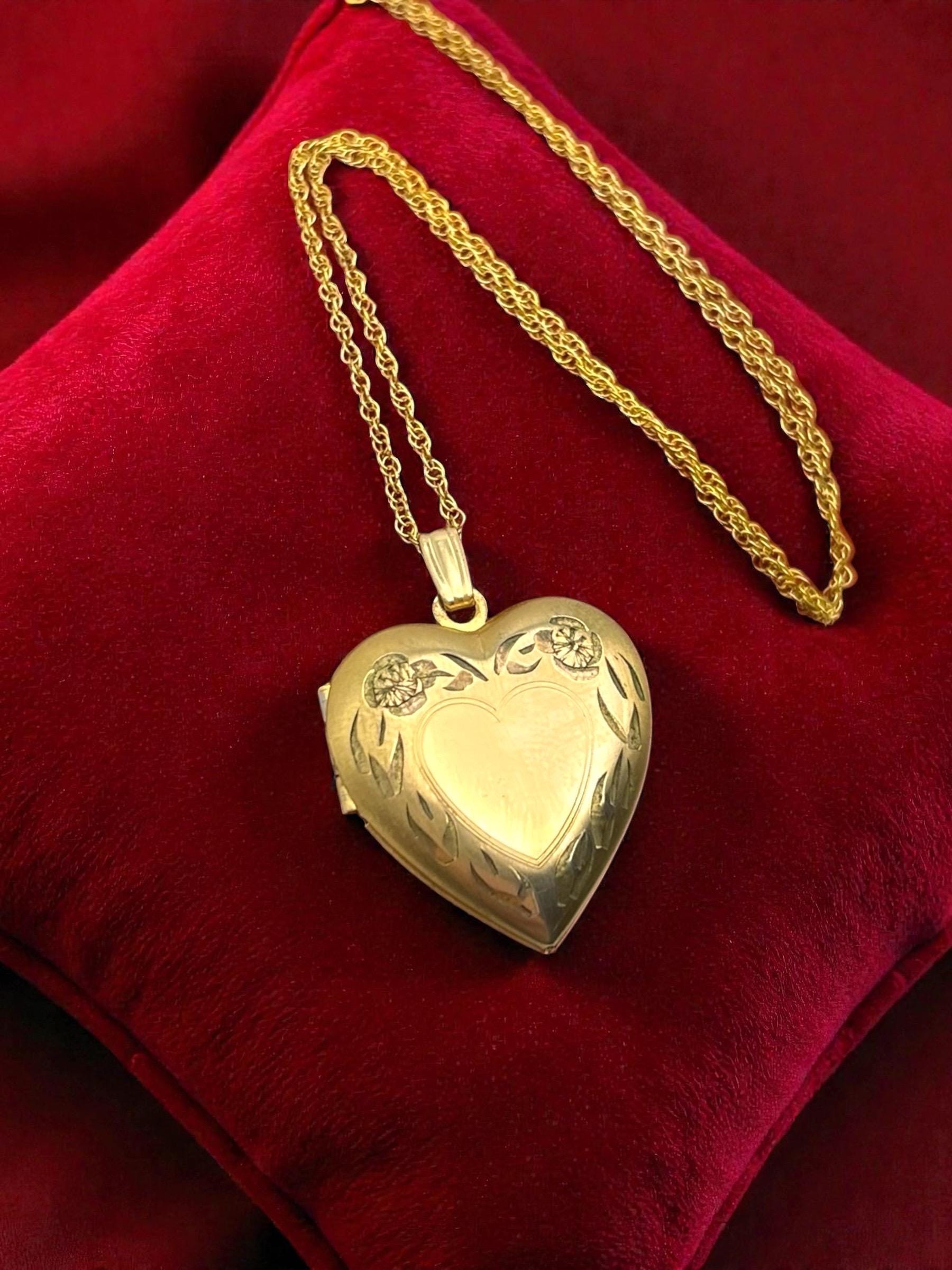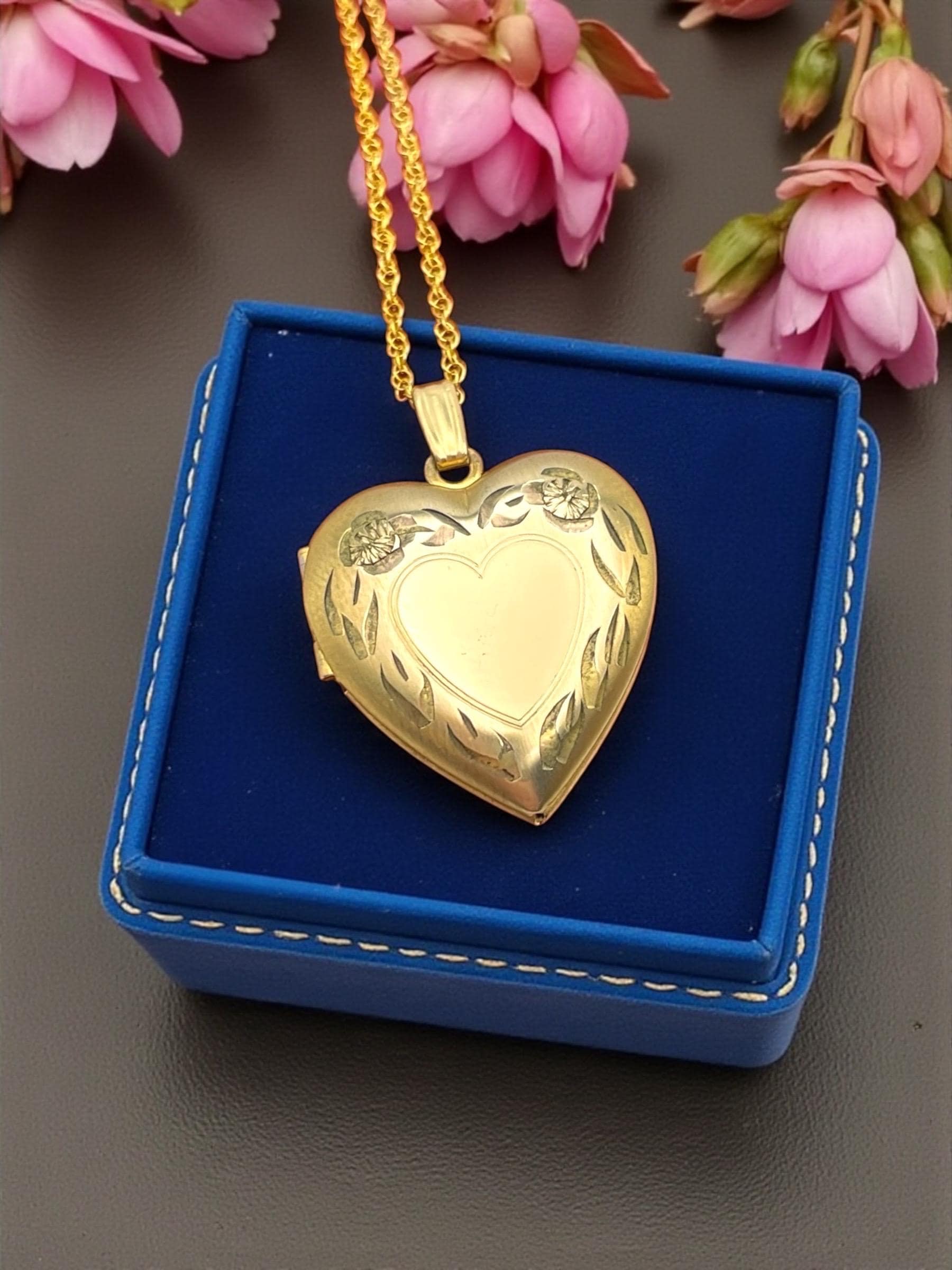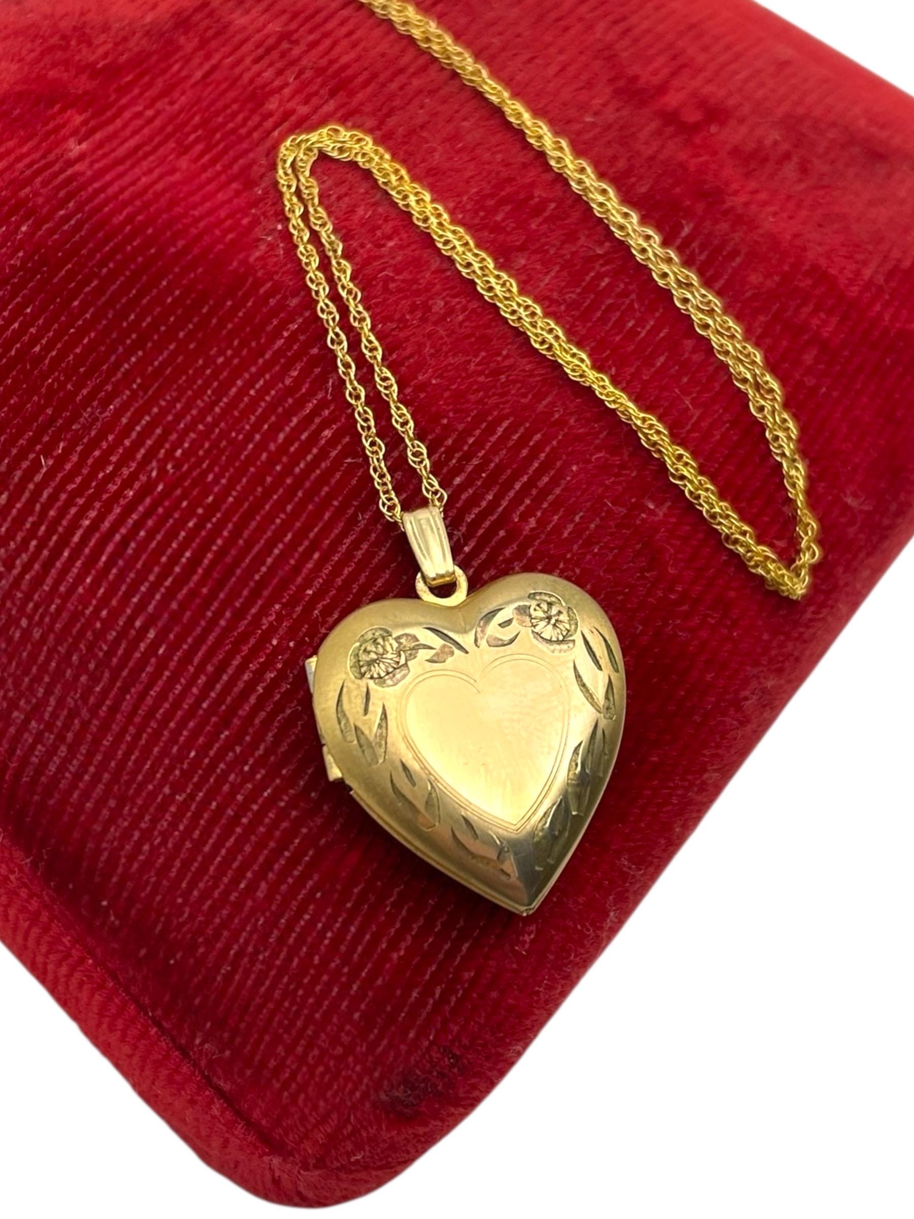 Feminine and classic vintage 14K gold filled heart shaped locket on a 14K gold filled chain. The heart shaped locket pendant has an etched heart on the front with some etched leaves and flowers surrounding it. The interior of the locket is completely empty and can hold two tiny photos (one on each side). No frames are present. The back of this locket is plain with no design. It closes securely with a snap.