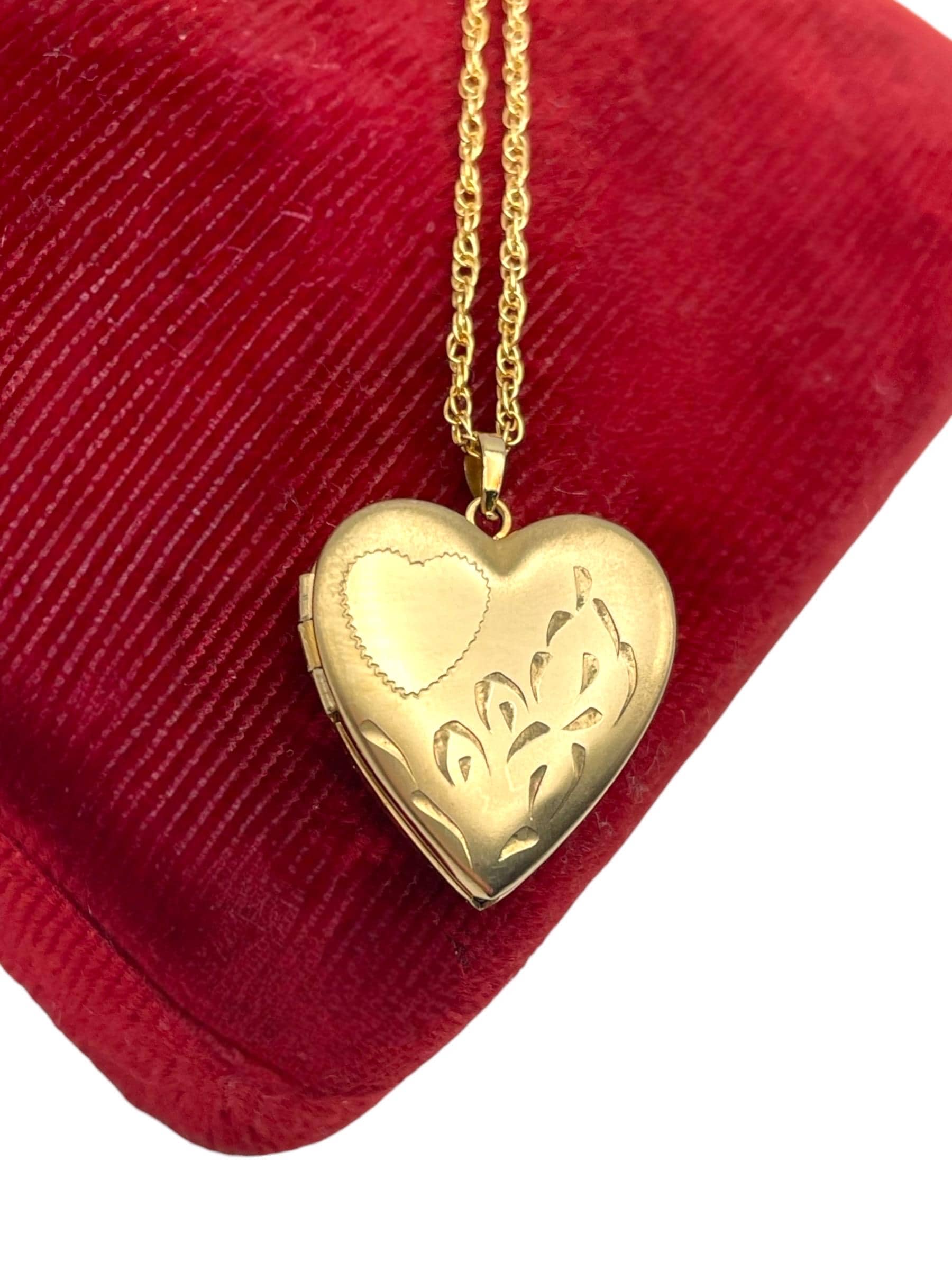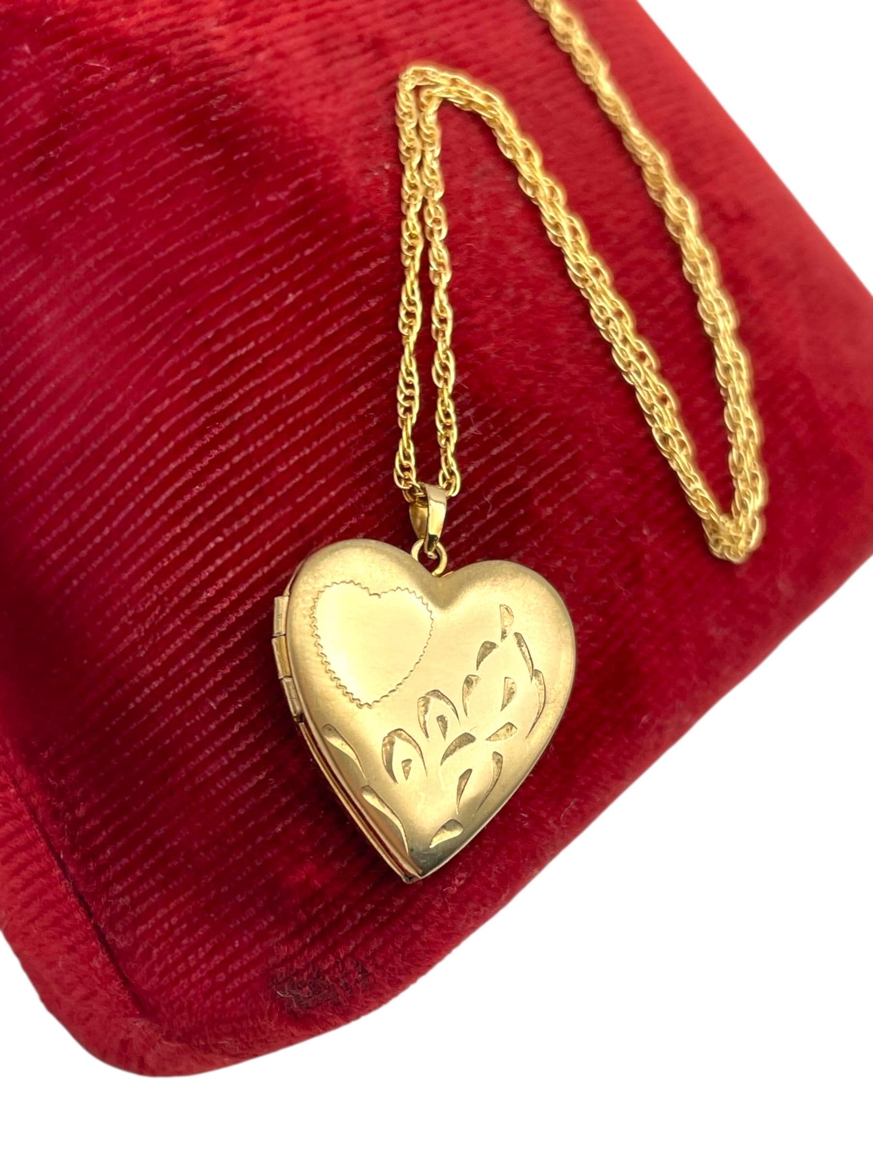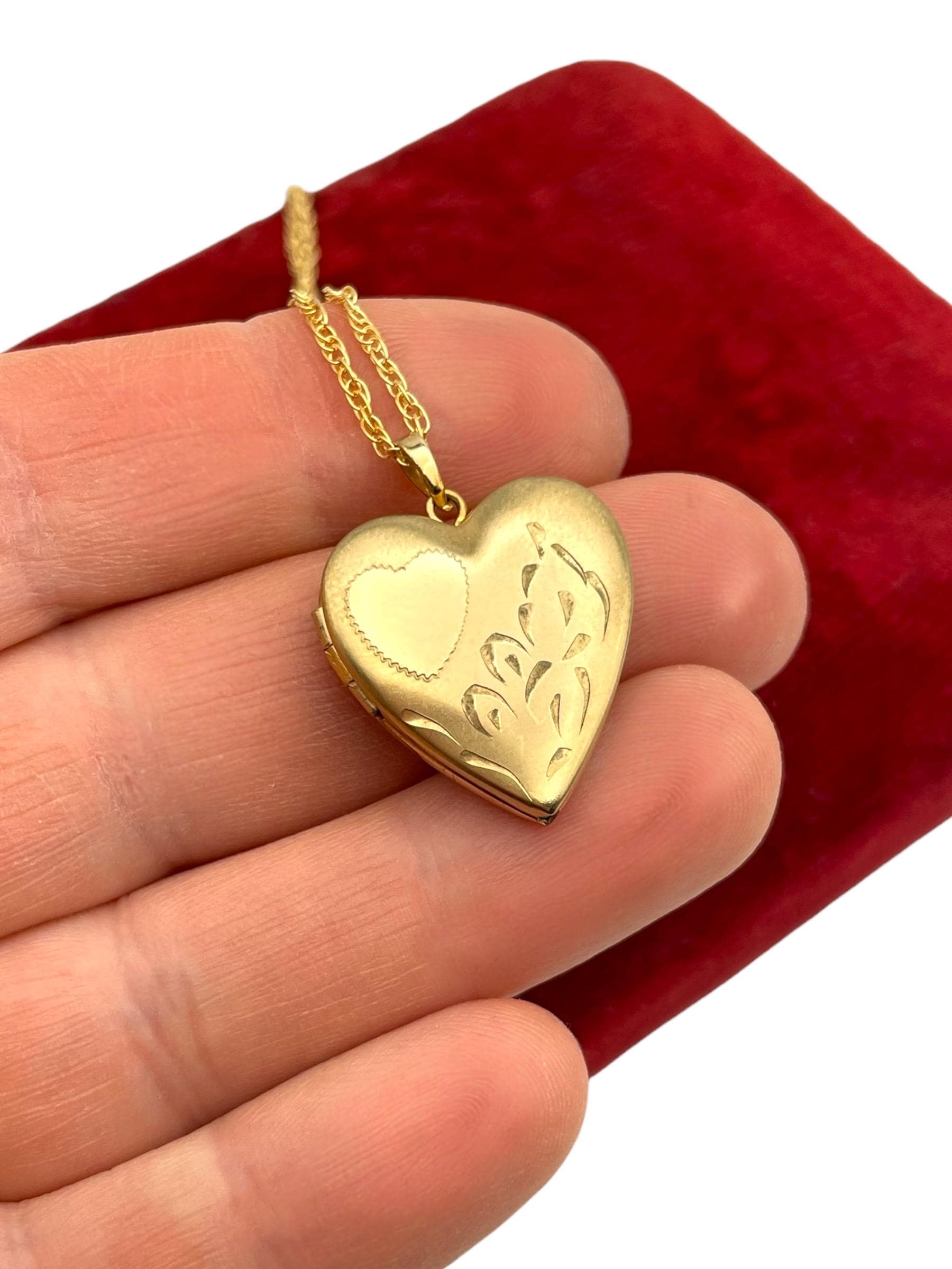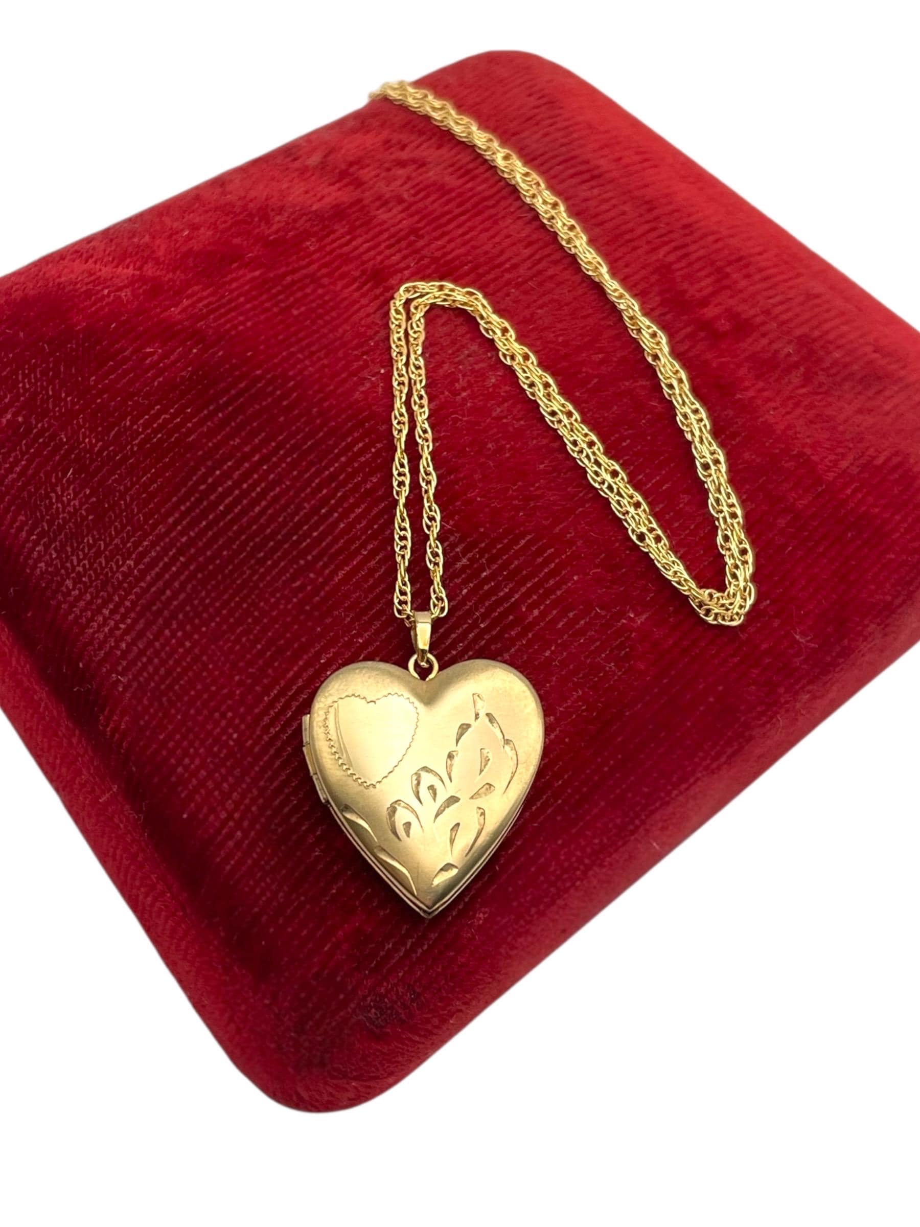 Feminine and classic vintage 14k gold filled heart shaped locket on a gold filled chain. The heart shaped locket pendant has an etched heart on the front left with some etched leaves on the right. The interior of the locket is completely empty and can hold two tiny photos (one on each side). The locket has both original frames intact. The back of this little locket has a shiny finish. It closes securely with a snap.