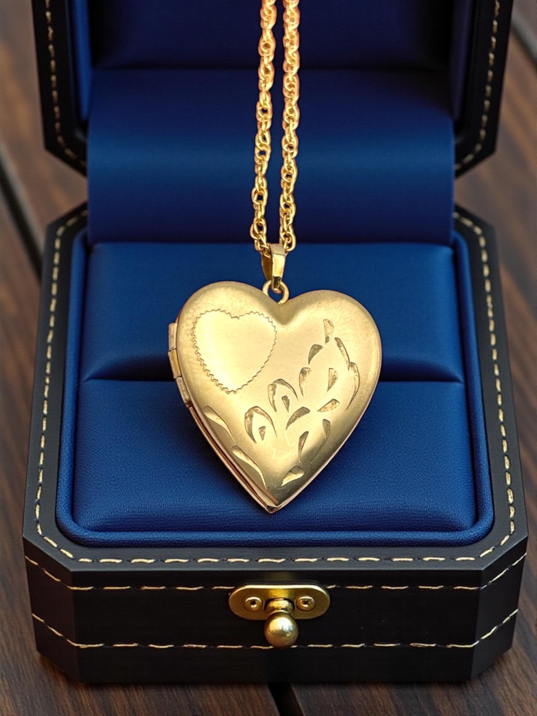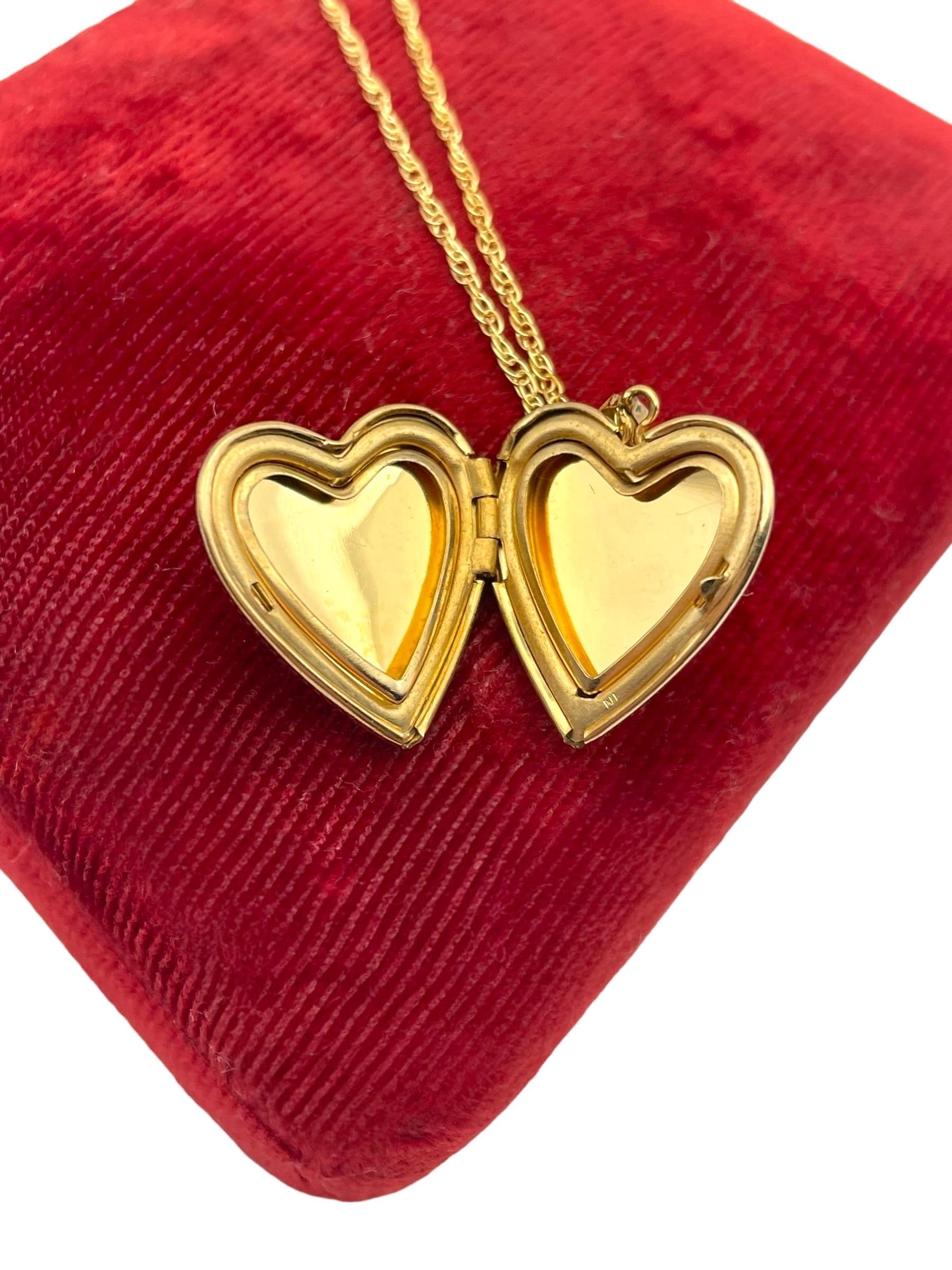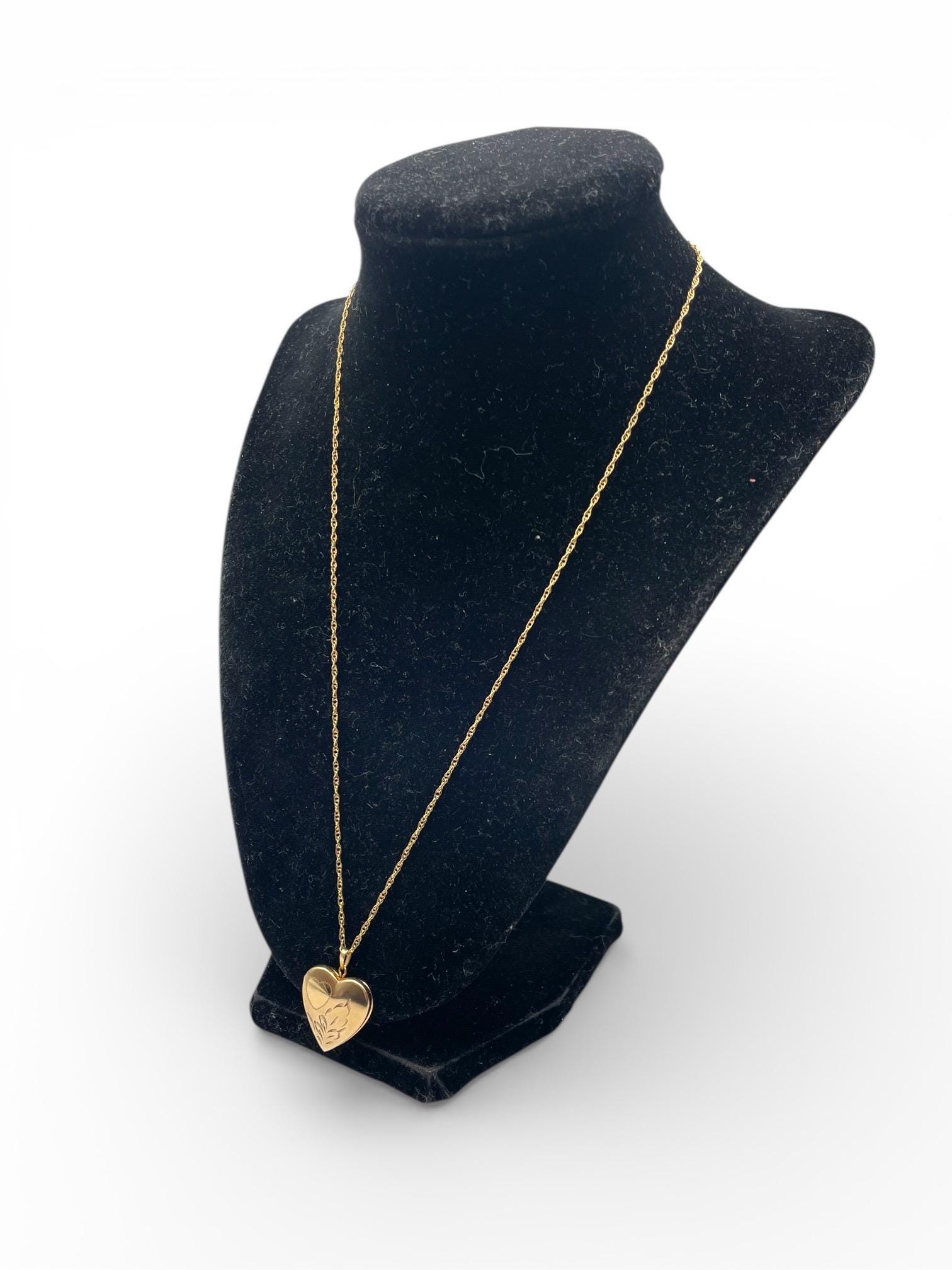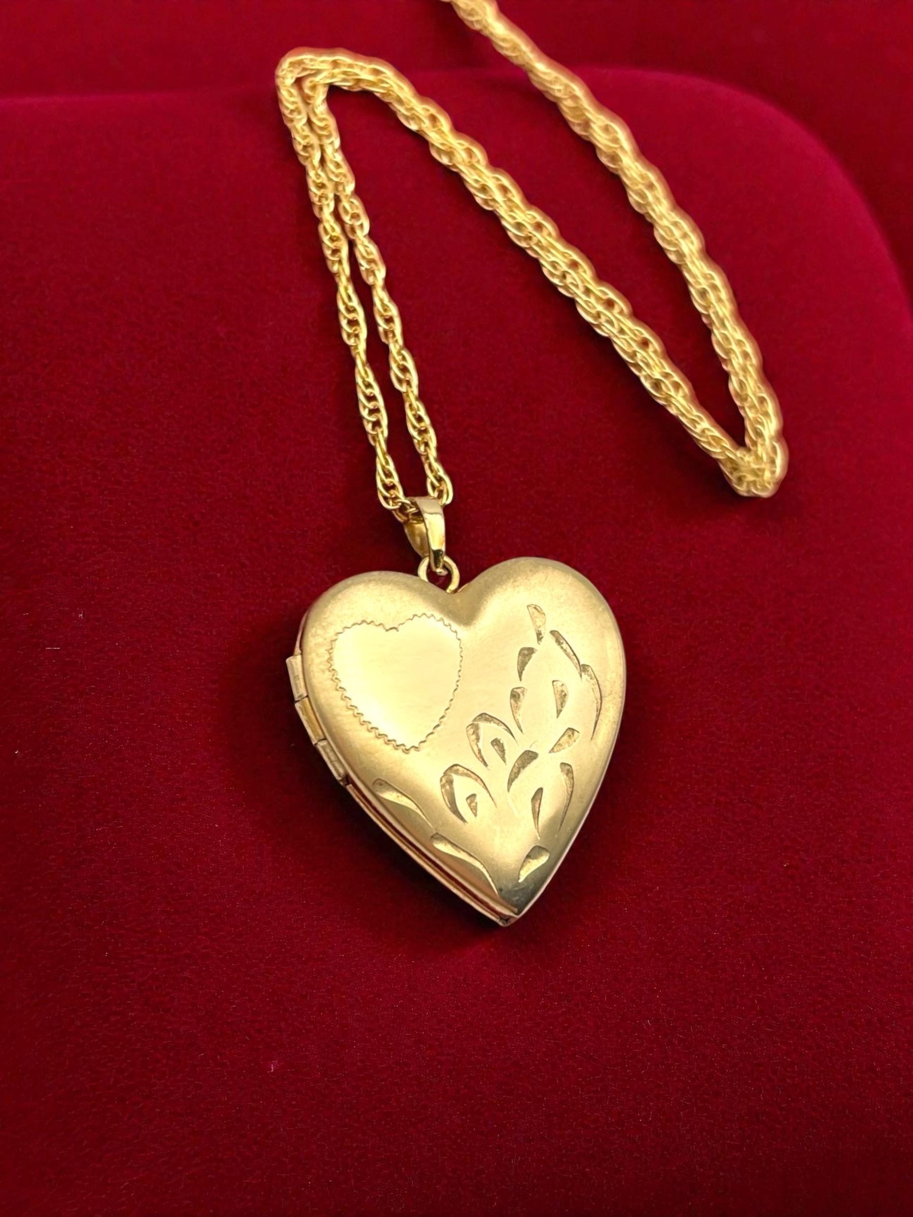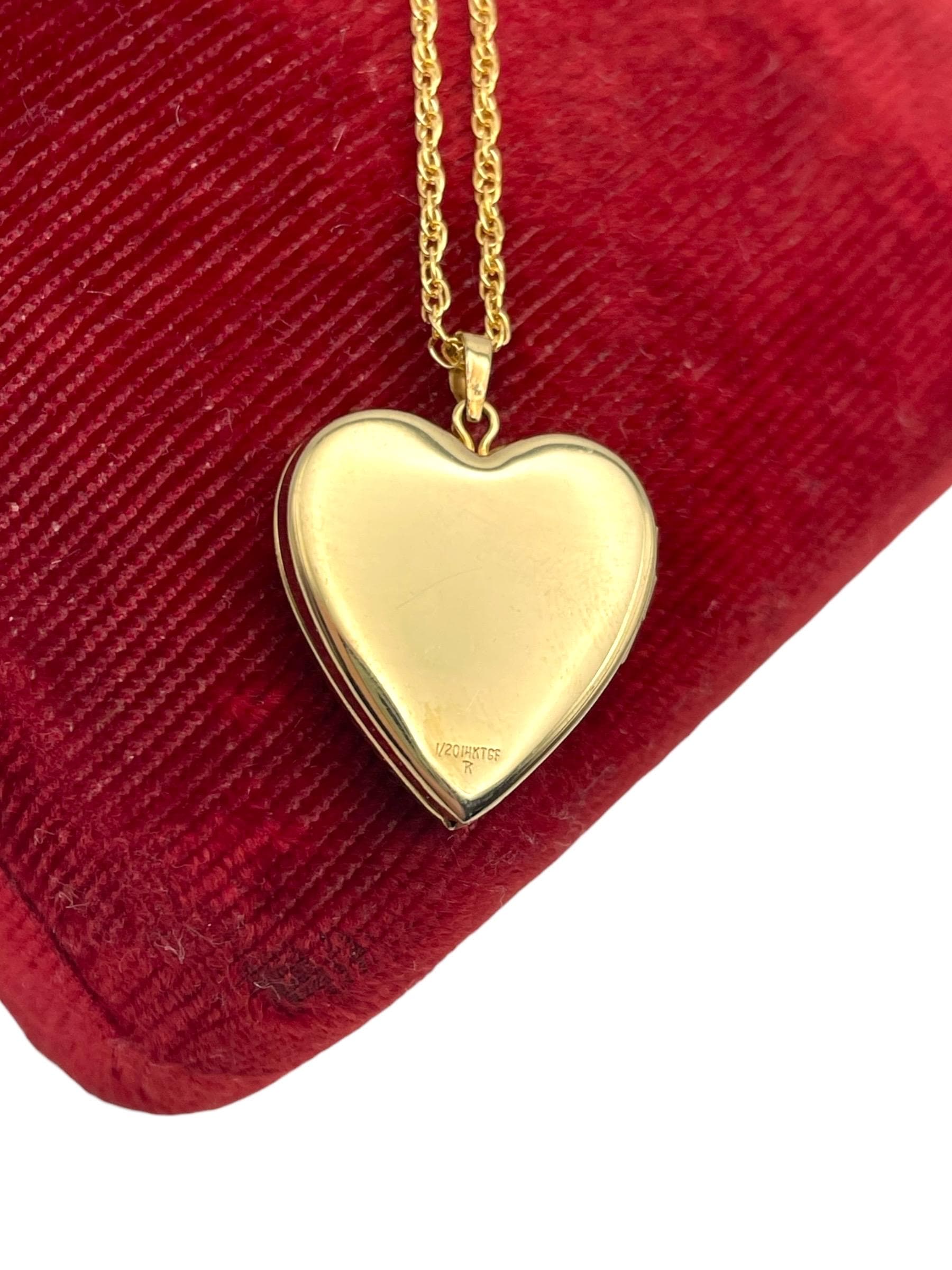 Feminine and classic vintage 14k gold filled heart shaped locket on a gold filled chain. The heart shaped locket pendant has an etched heart on the front left with some etched leaves on the right. The interior of the locket is completely empty and can hold two tiny photos (one on each side). The locket has both original frames intact. The back of this little locket has a shiny finish. It closes securely with a snap.