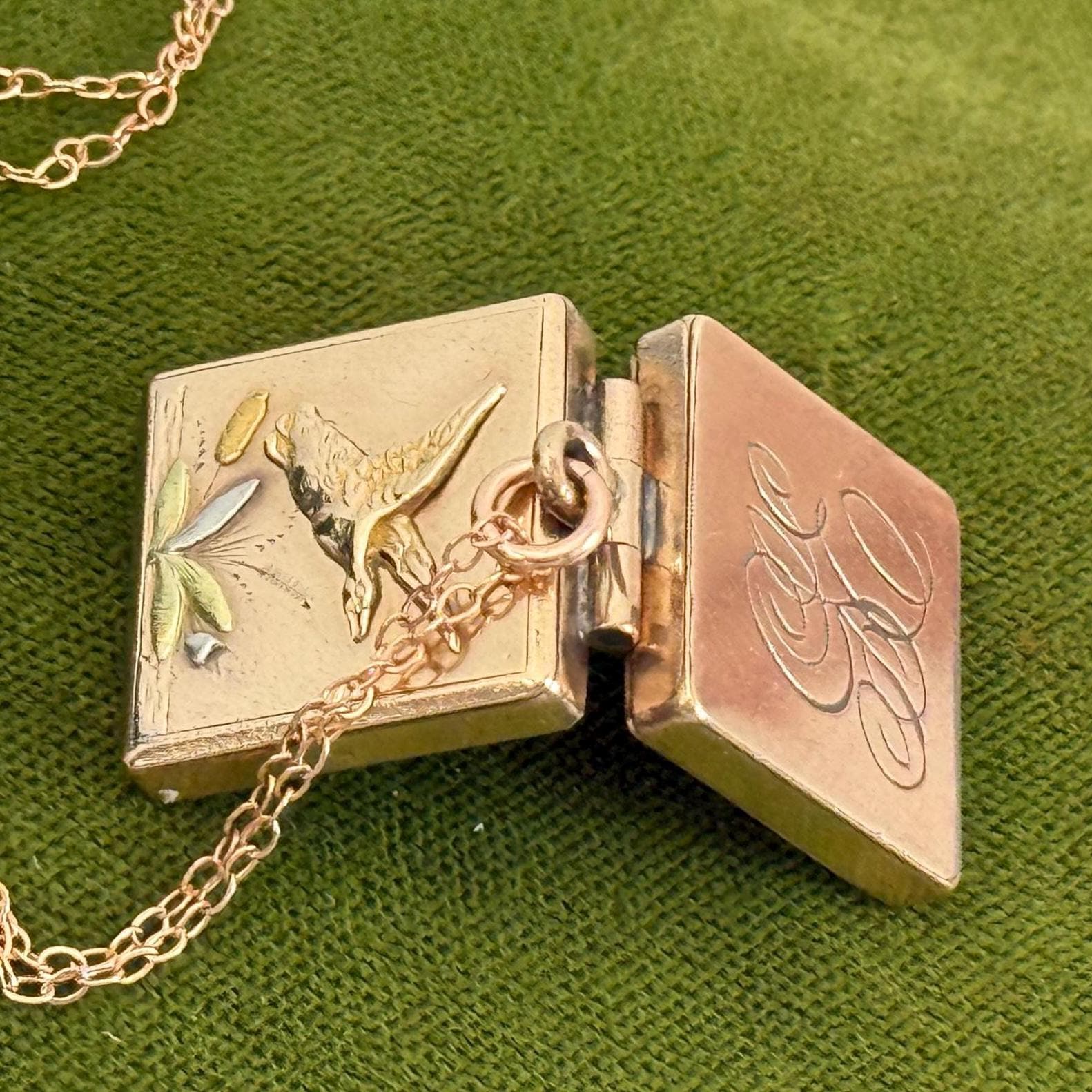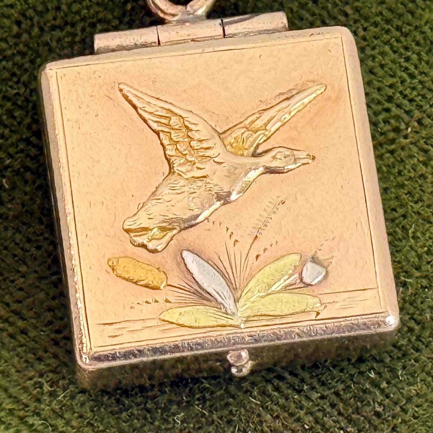 Lovely gold filled square shaped watch fob locket that features 4 different colors on the front and a monogrammed back. The front featured a duck in flight over a cattail frond. The cattail end is a dark yellow gold color, the leaves are a green gold color and there are white gold colored accents around the cattail. The fob itself is a soft rose gold color.