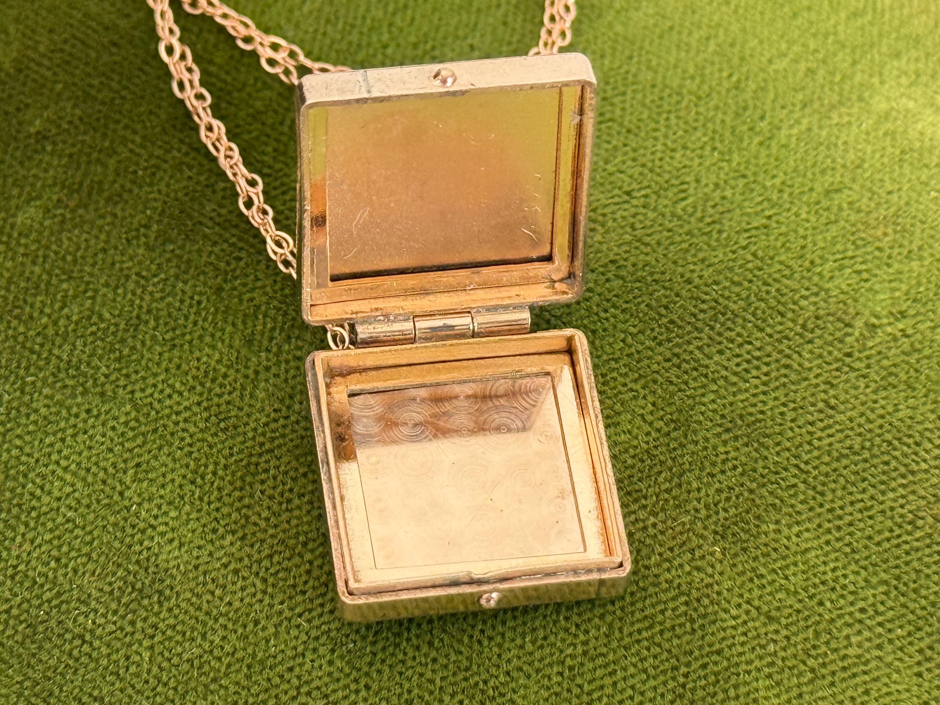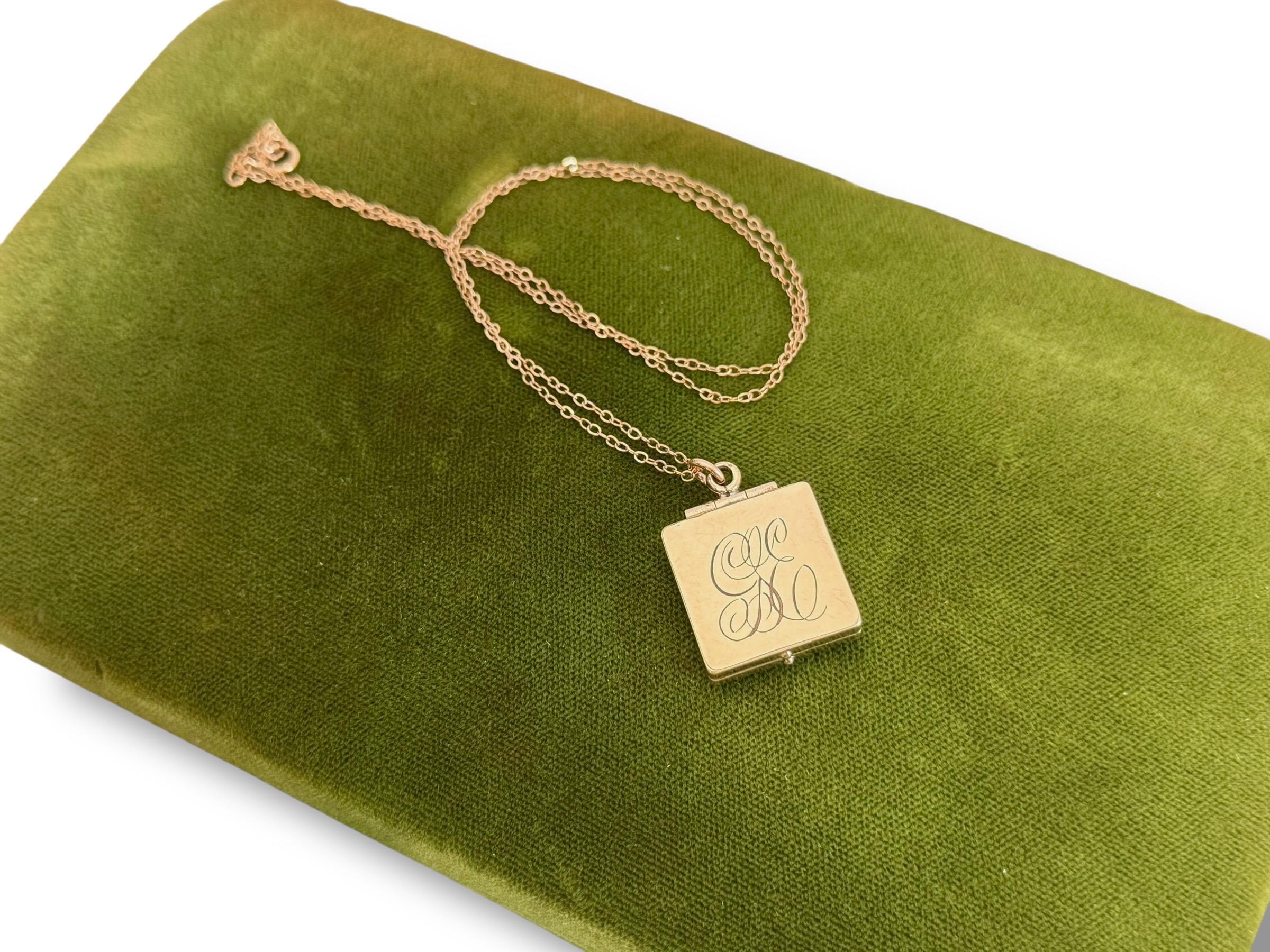 The back of this square fob locket is engraved with the initials GSE in an old cursive font.