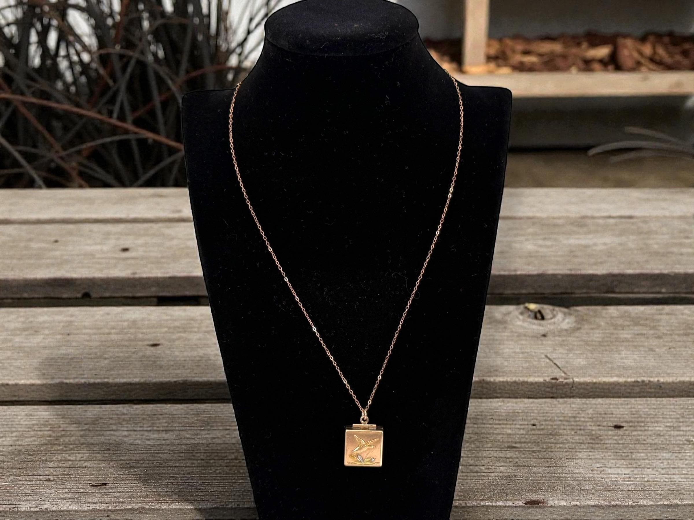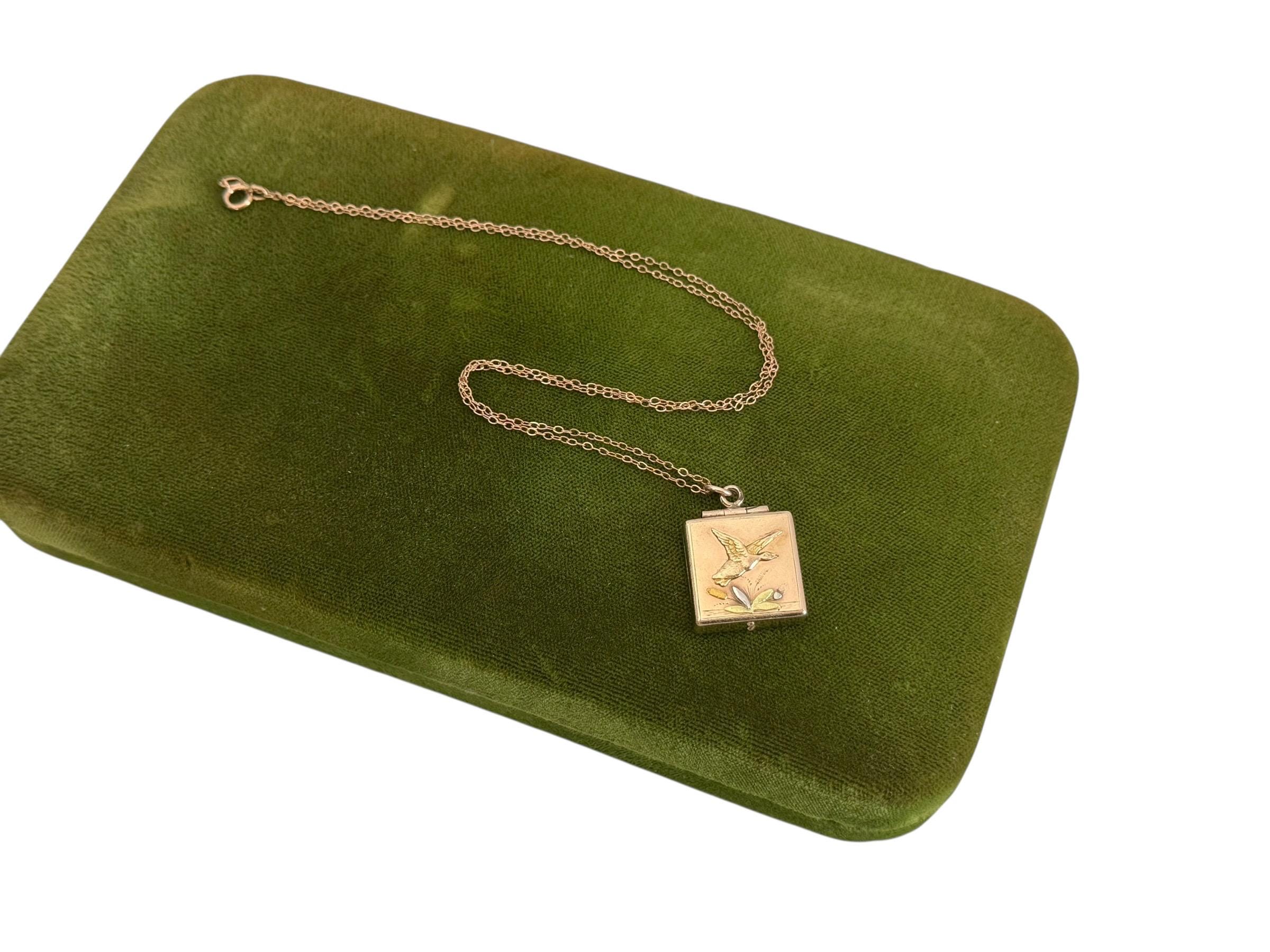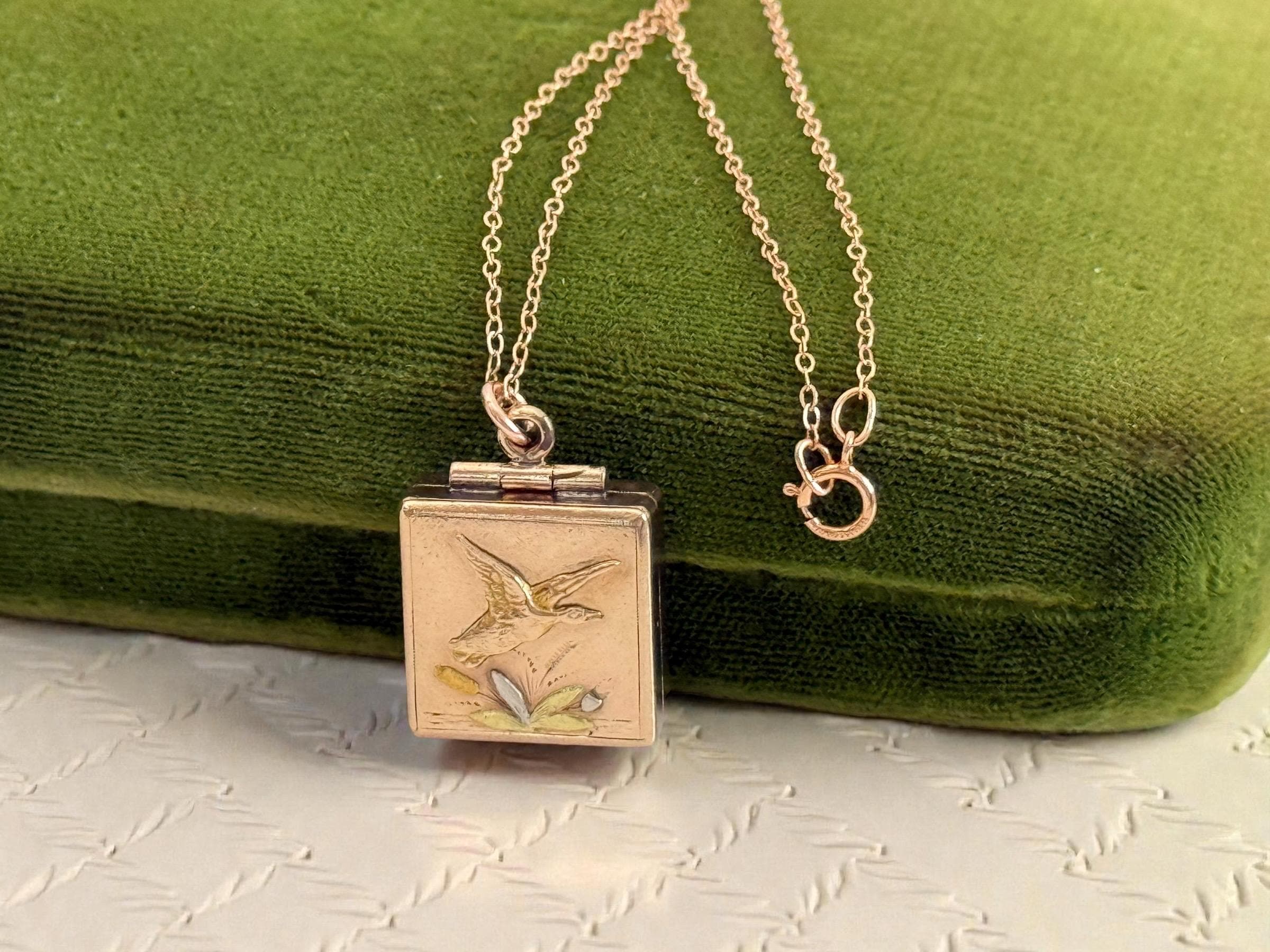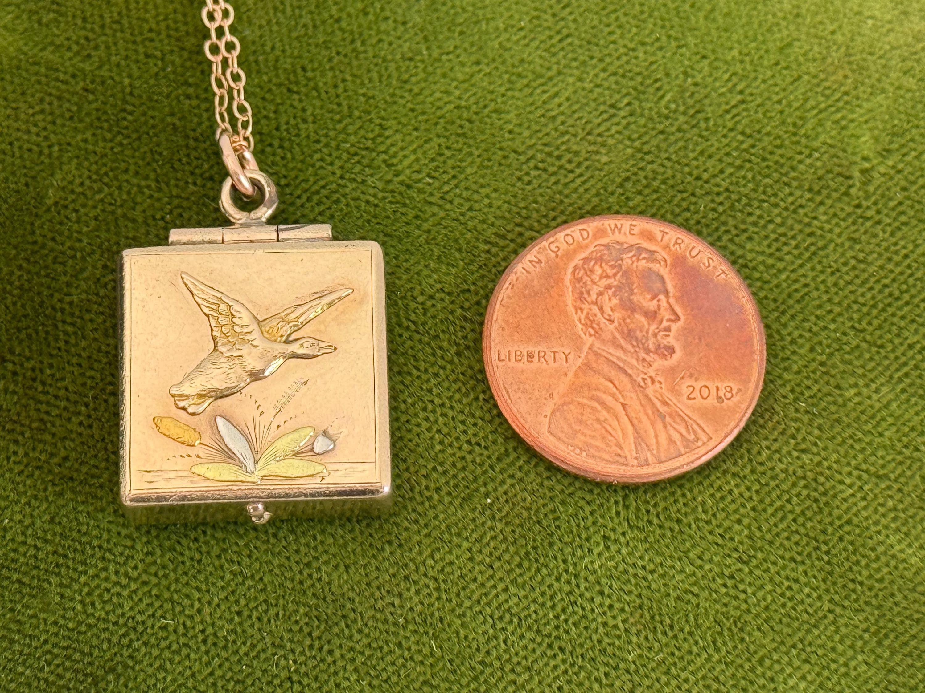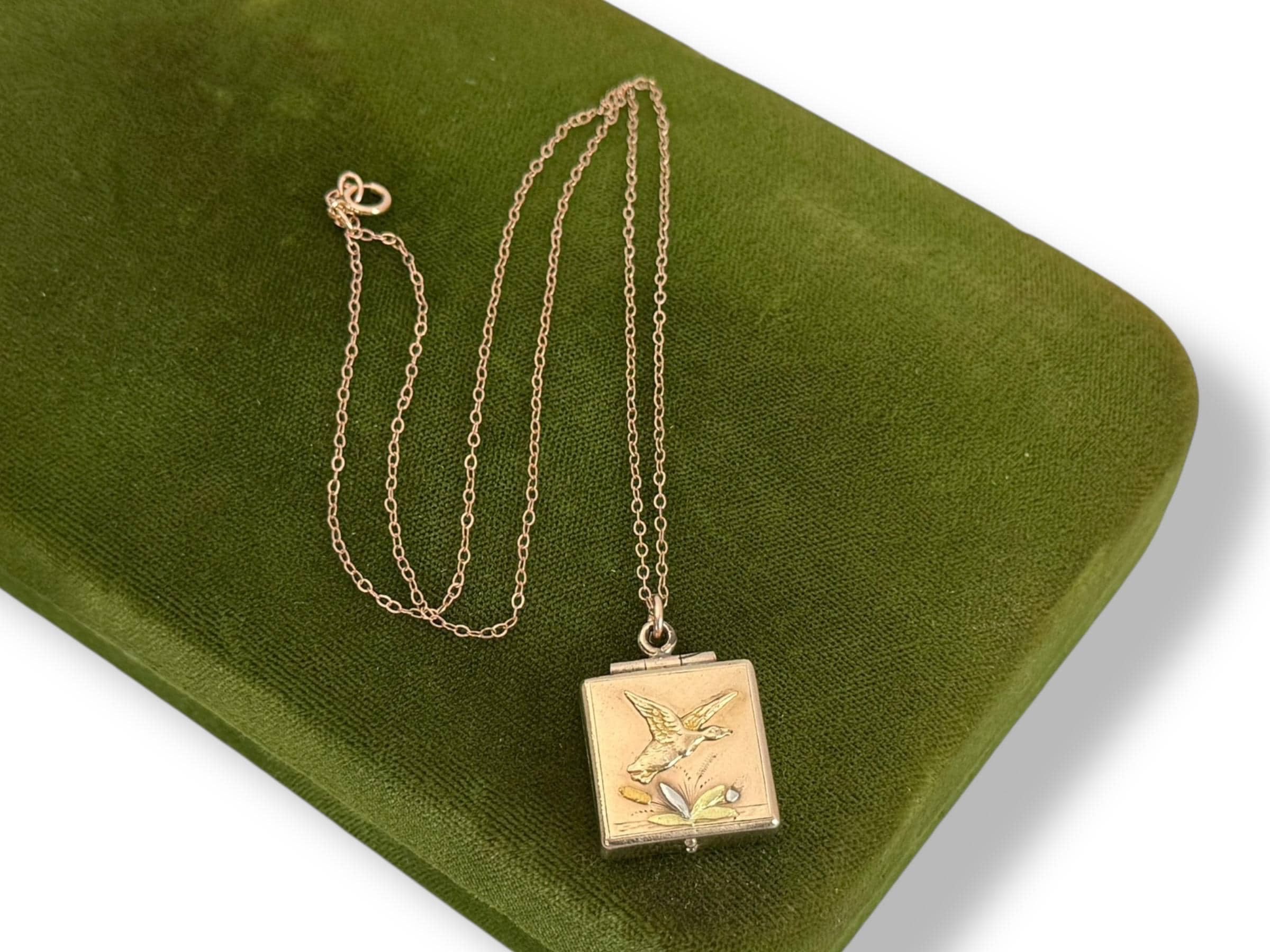 Antique Rose Gold Filled Locket: Duck & Cattail Fob, 14K GF Chain