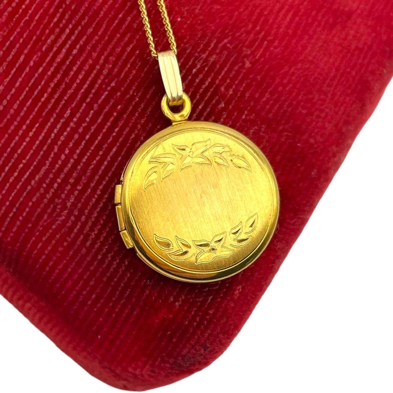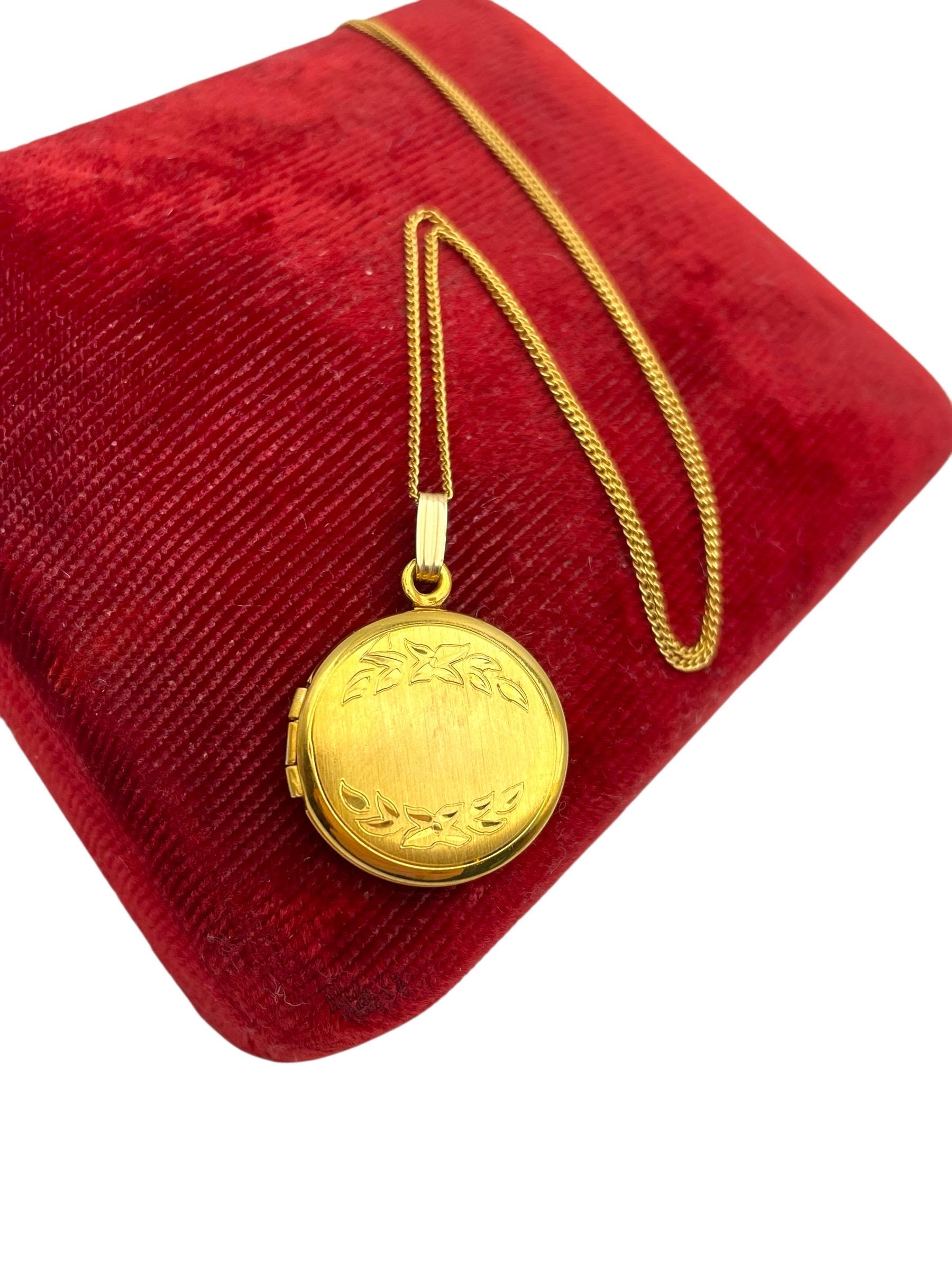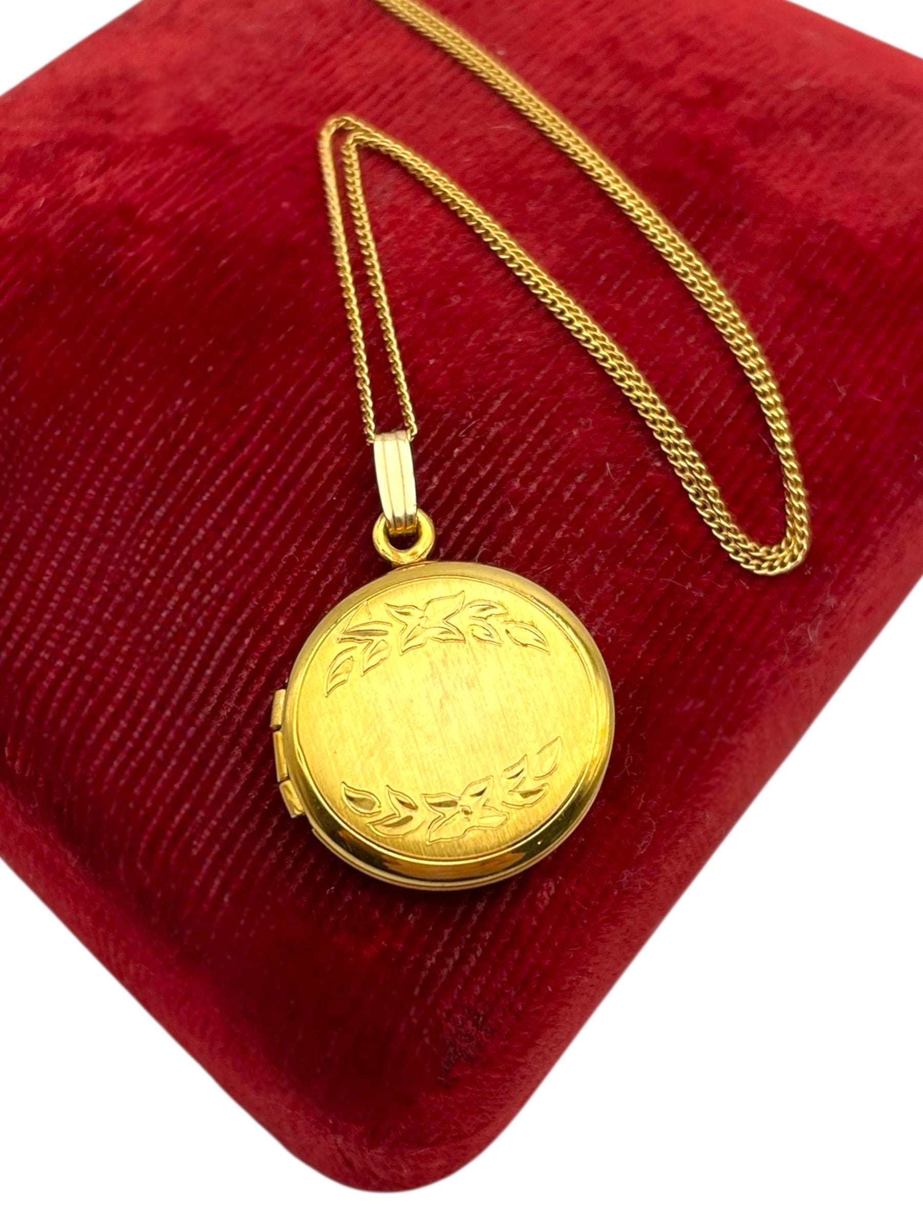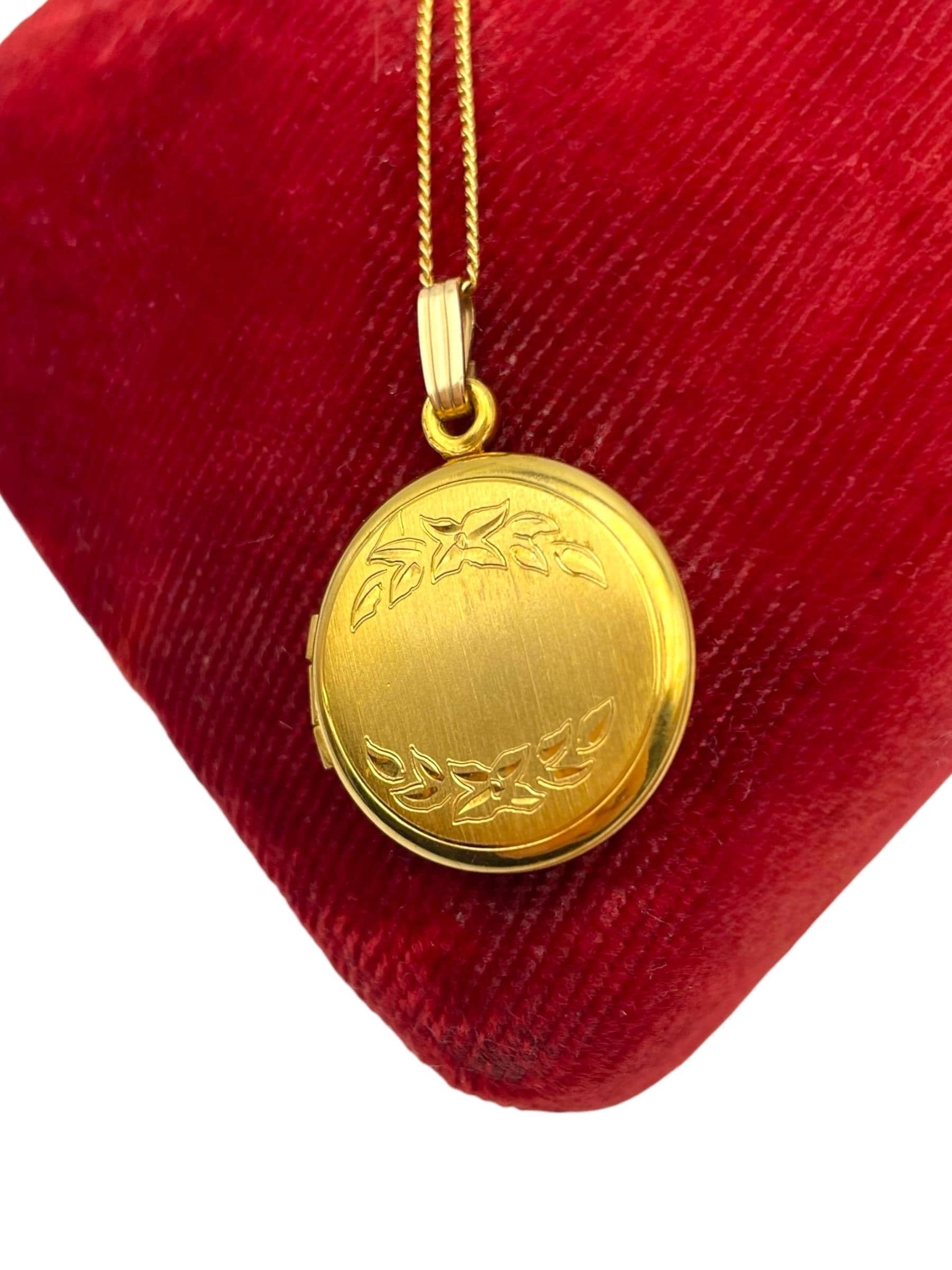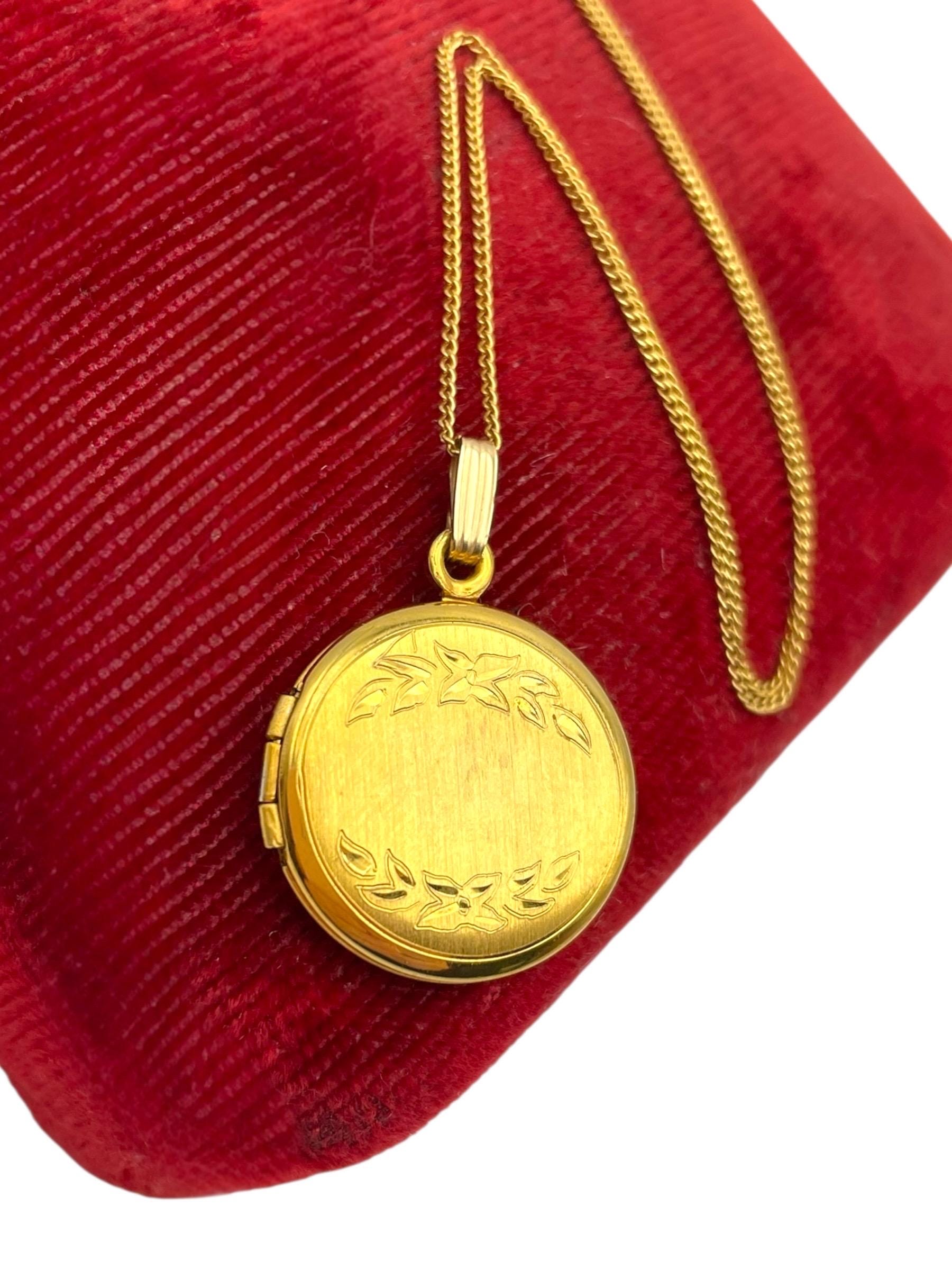A sweet round gold filled locket with an etched flower and leave design on the front. The back is plain with no design and a shiny finish.