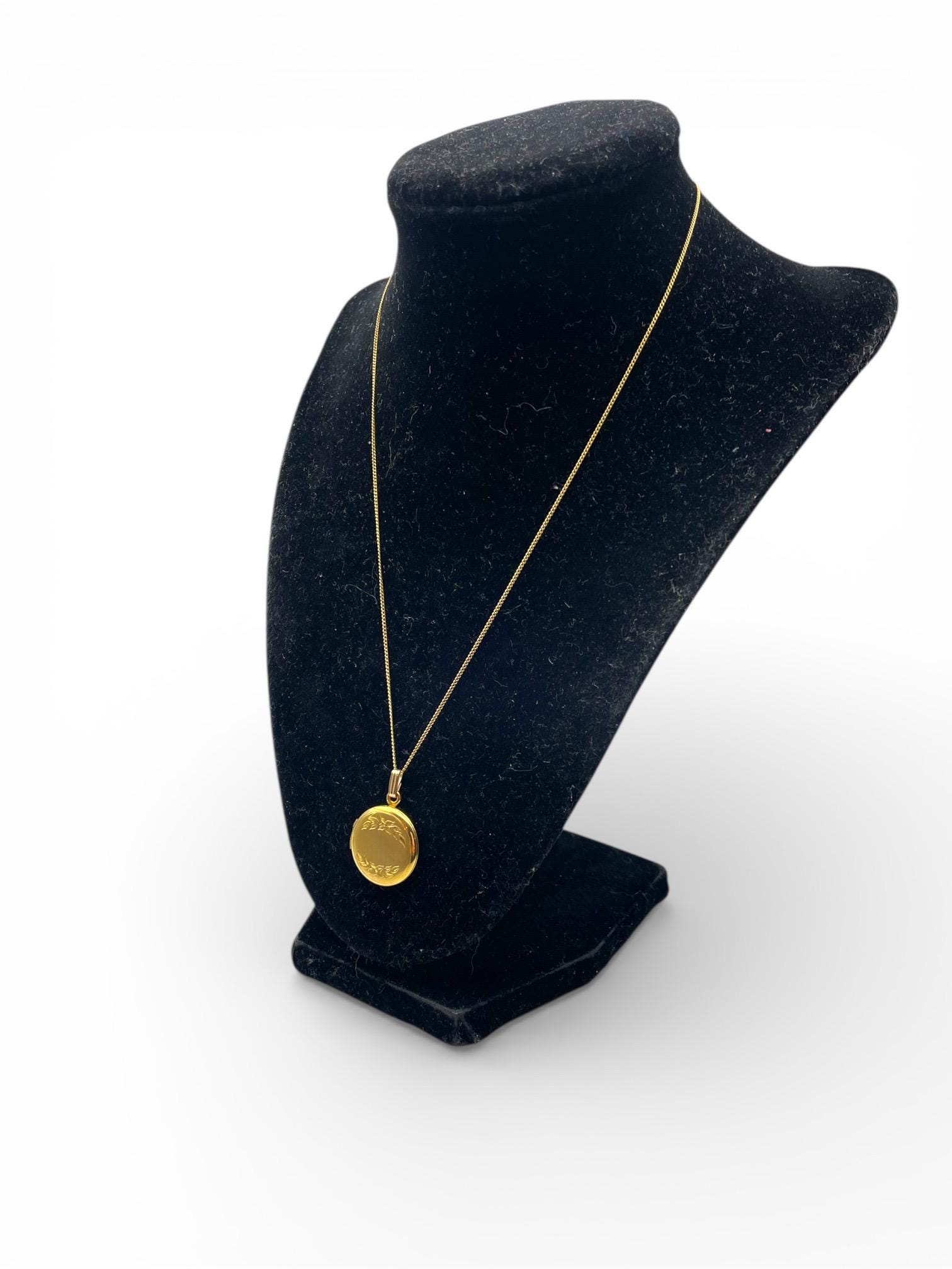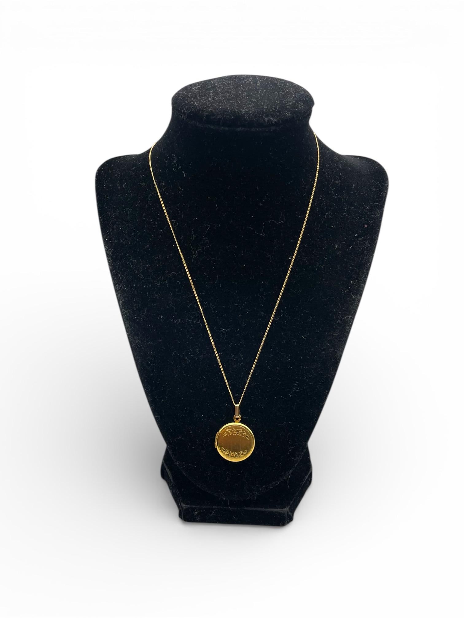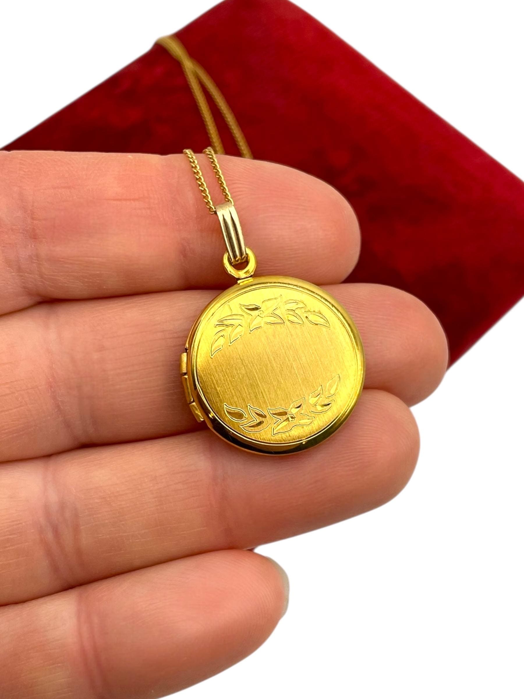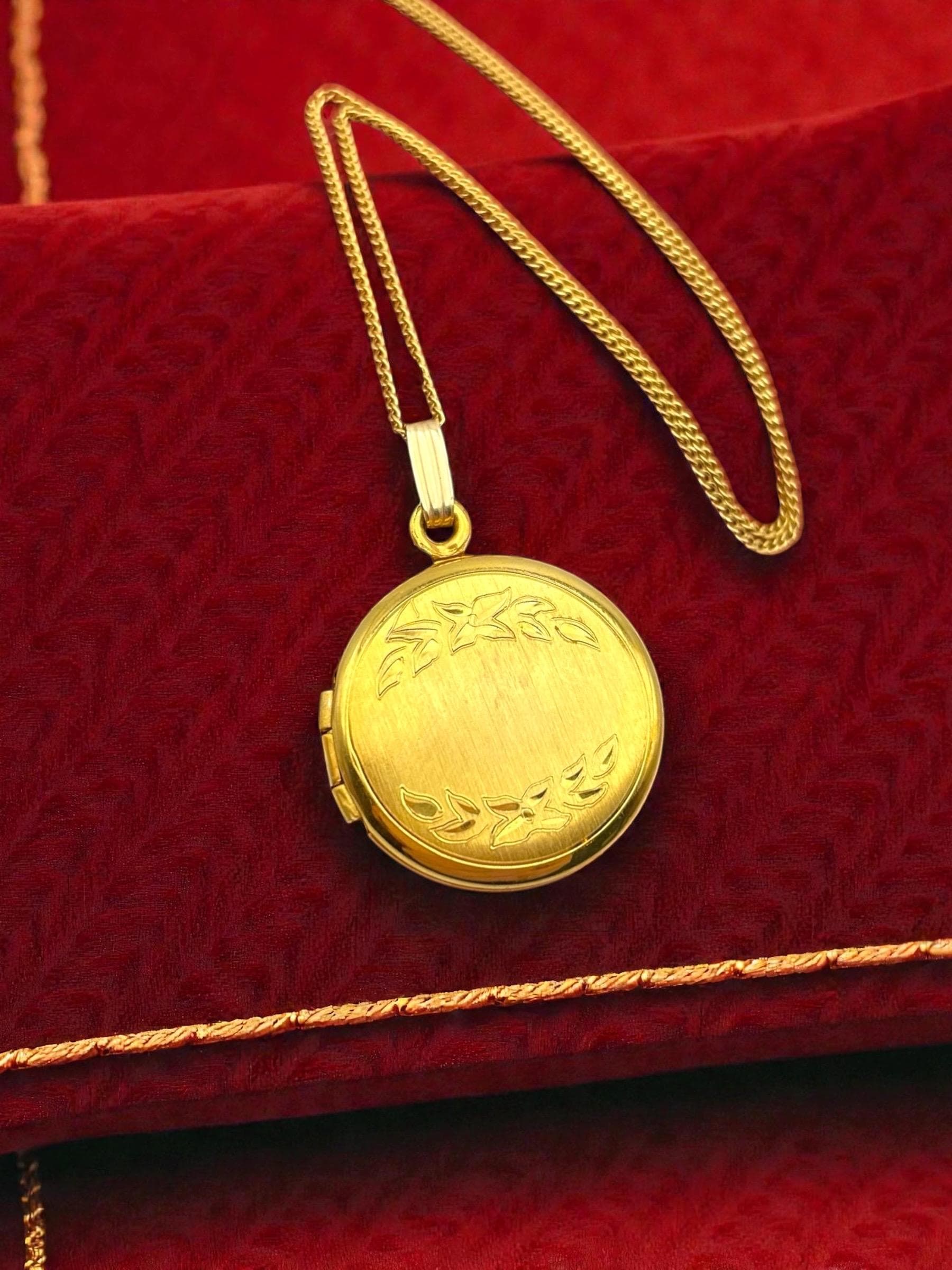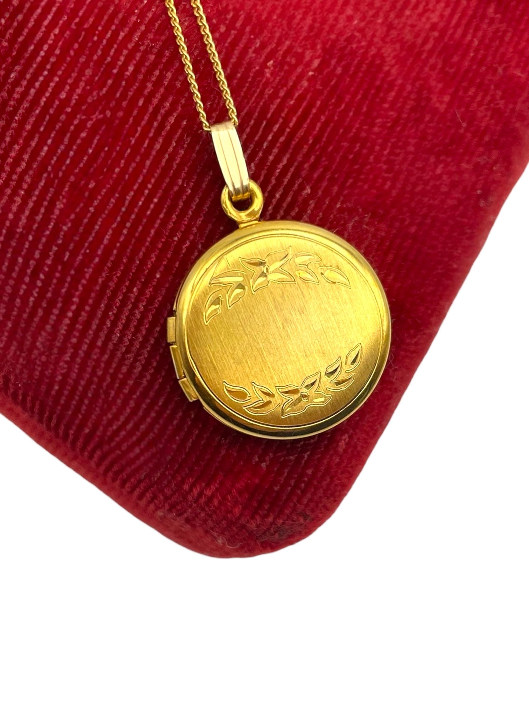 A sweet round gold filled locket with an etched flower and leave design on the front. The back is plain with no design and a shiny finish.