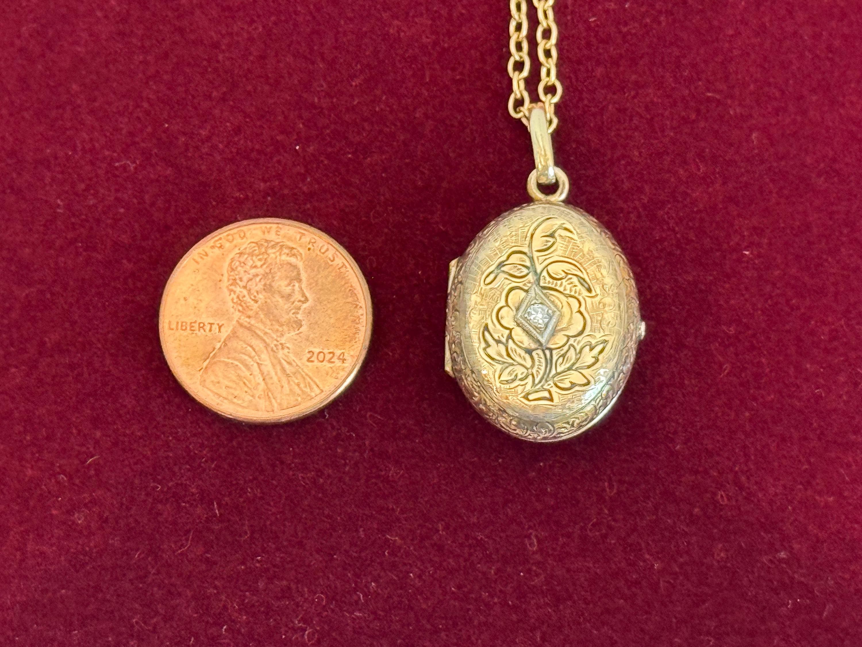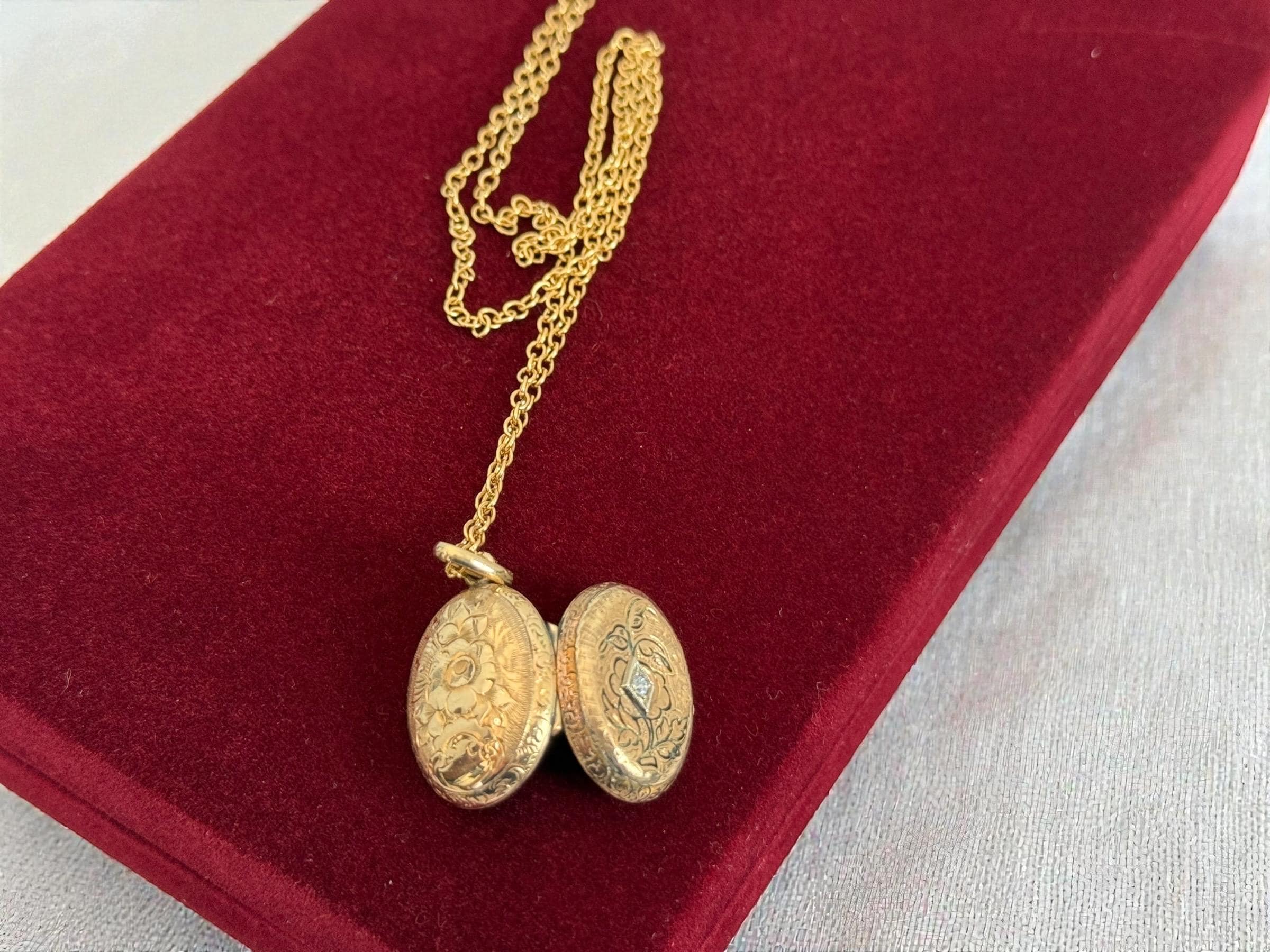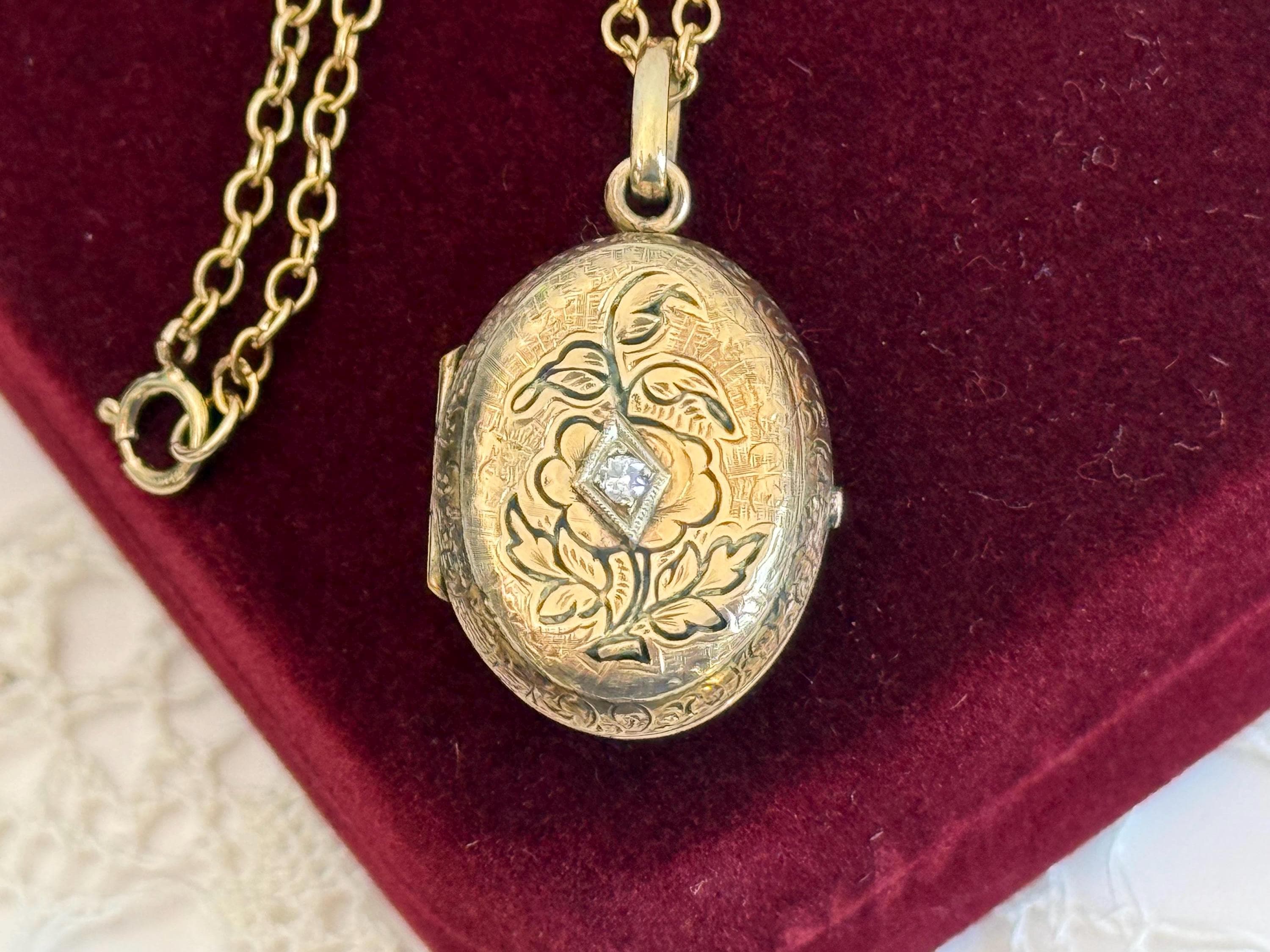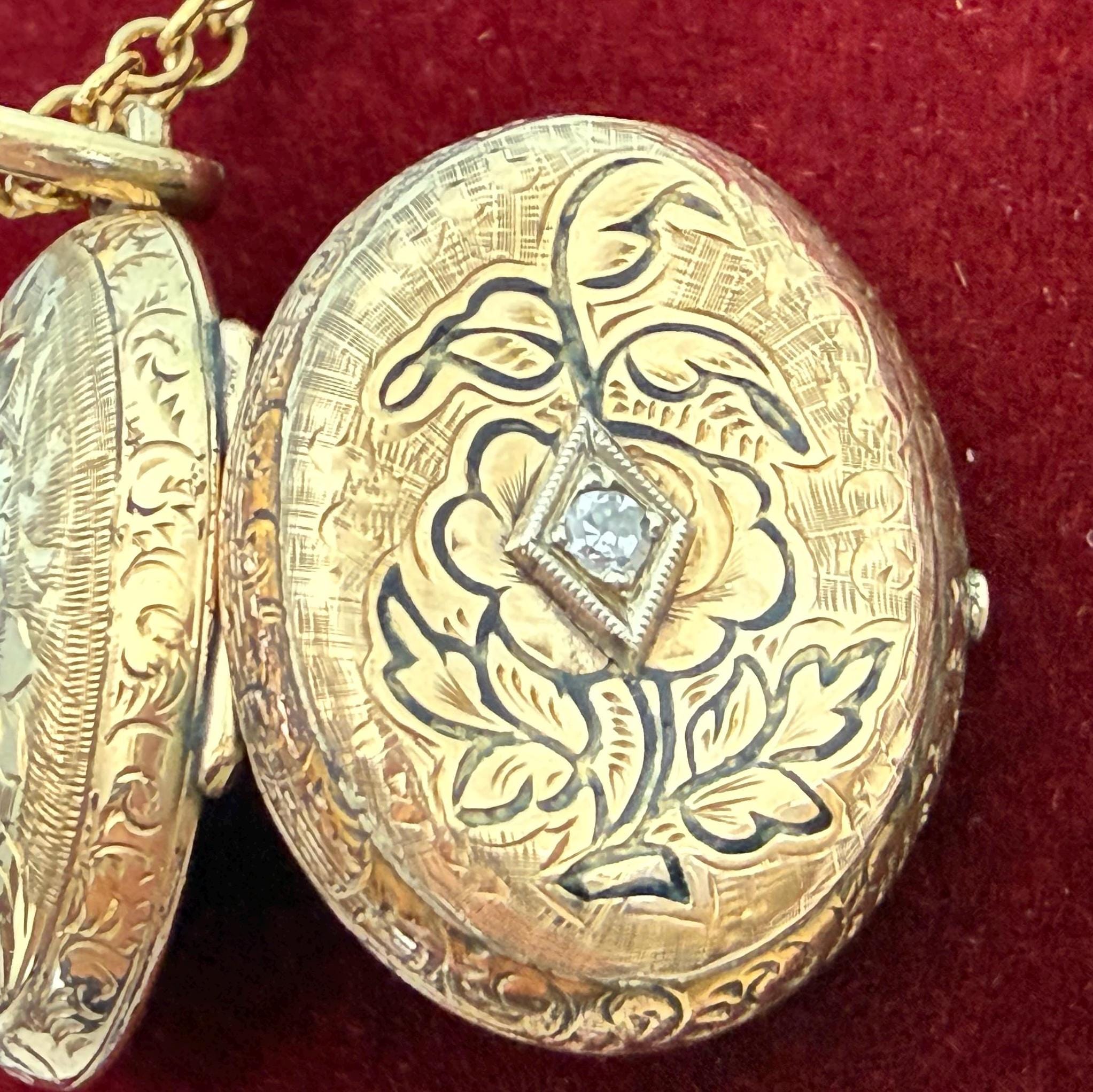 Victorian Mourning Locket: Etched Floral Design, Diamond Accent, 14K Gold Filled Chain