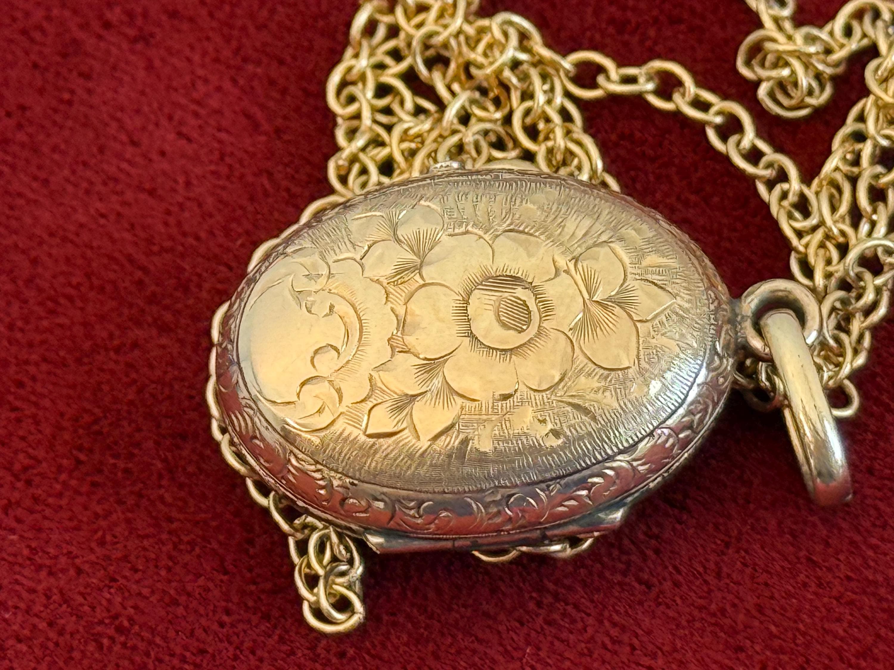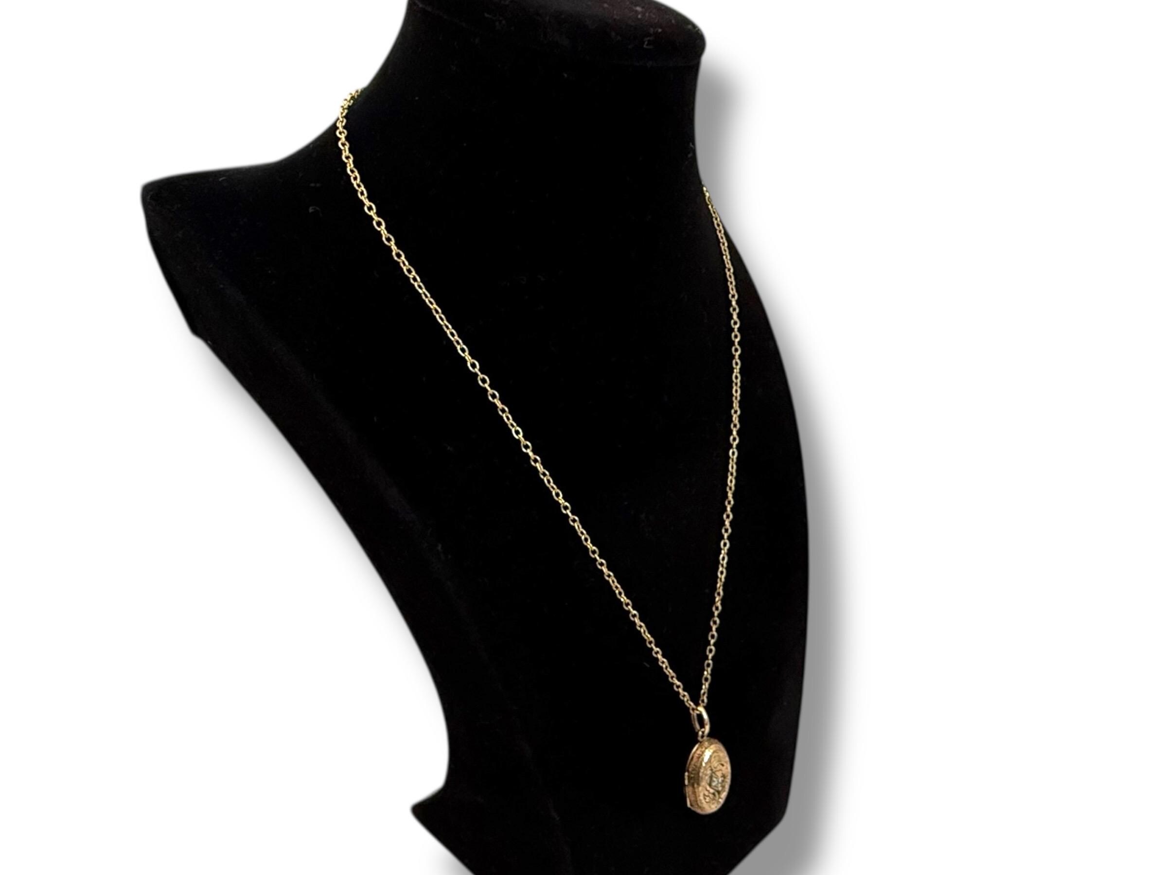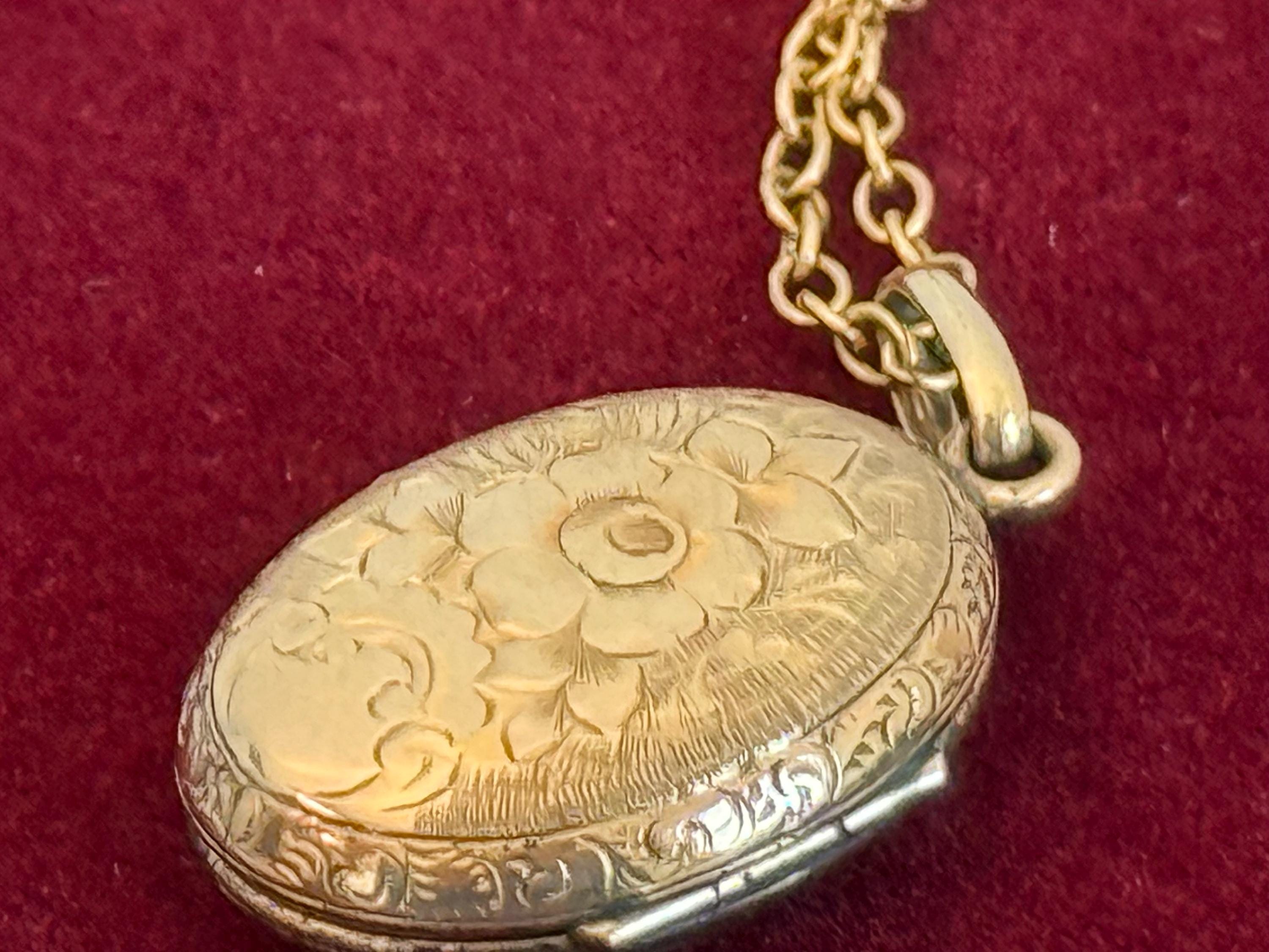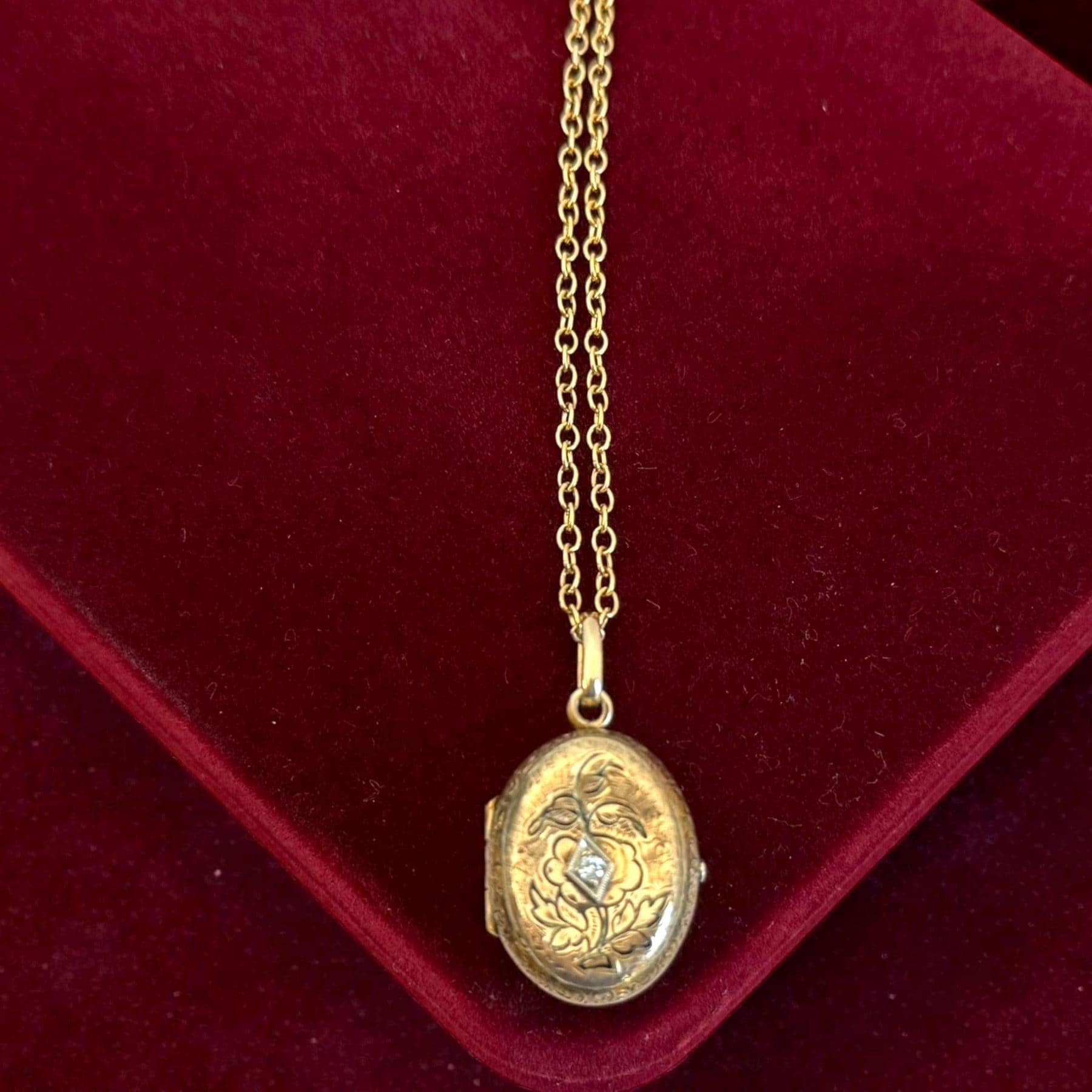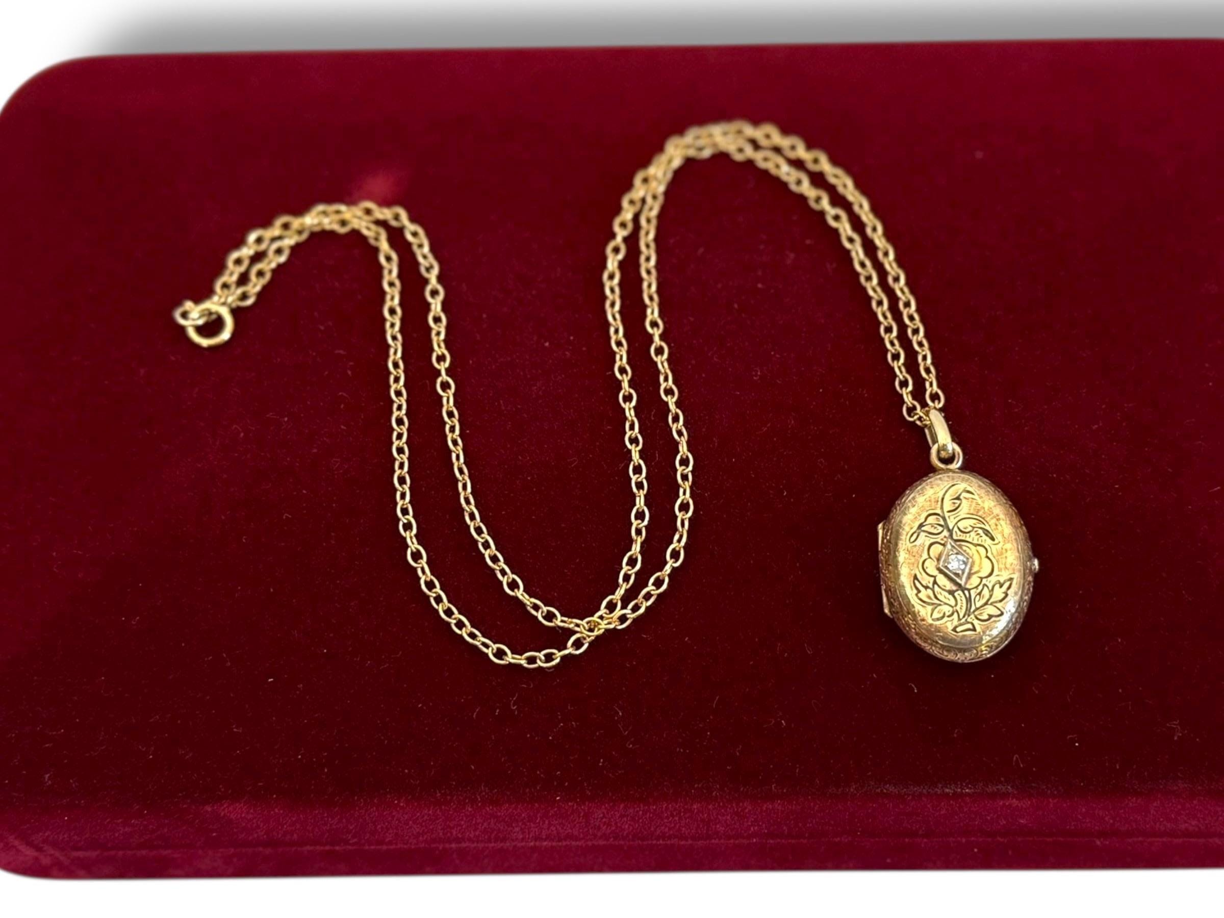 Victorian Mourning Locket: Etched Floral Design, Diamond Accent, 14K Gold Filled Chain