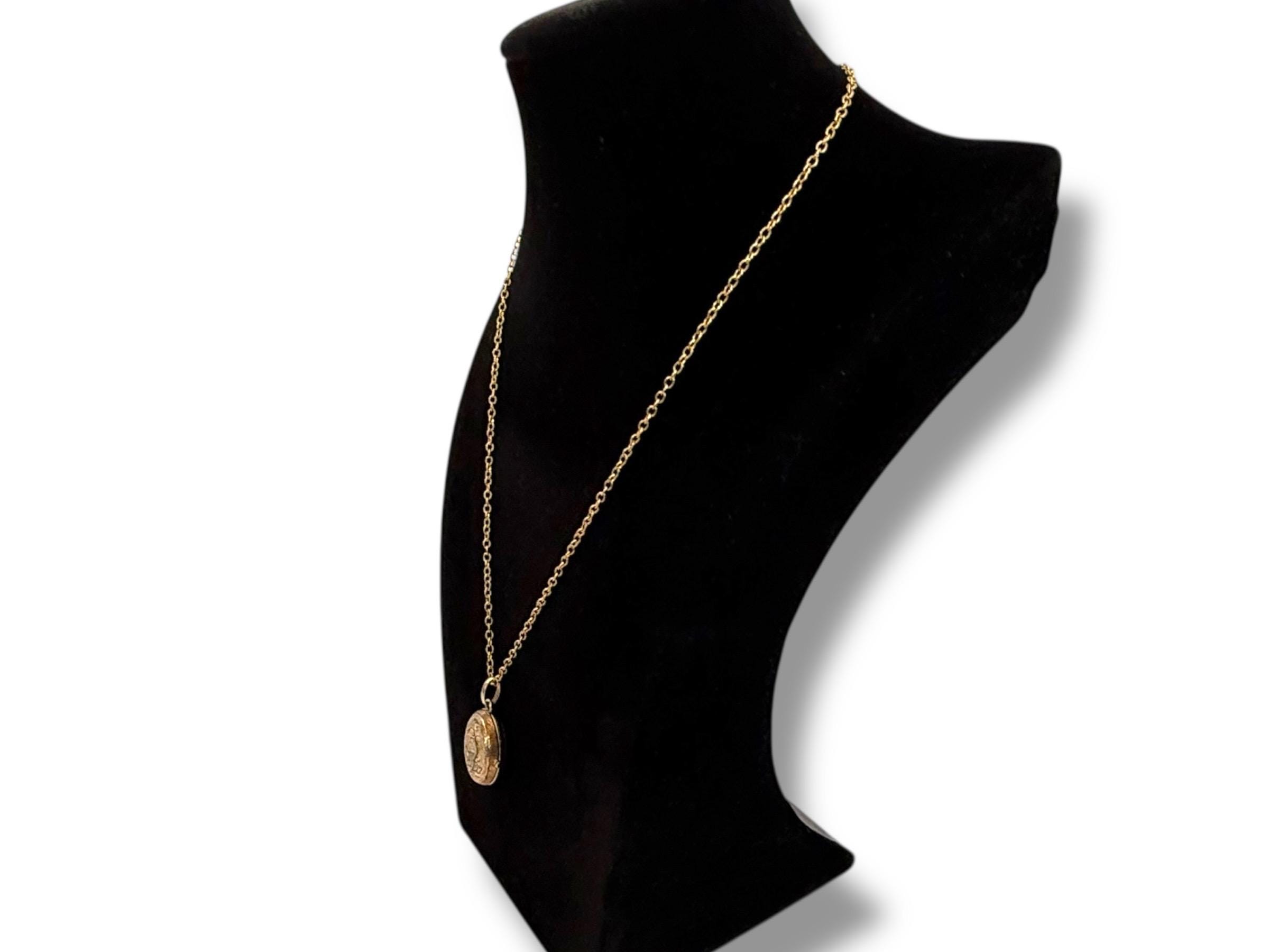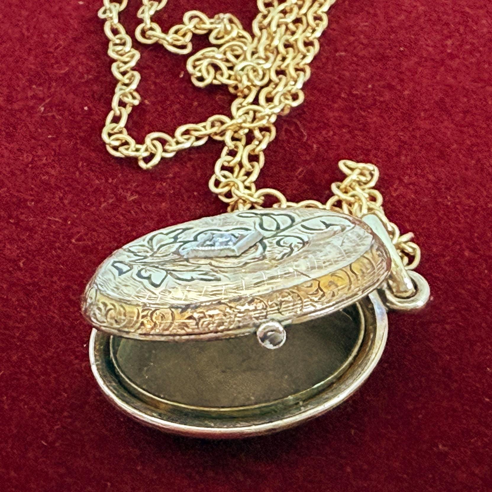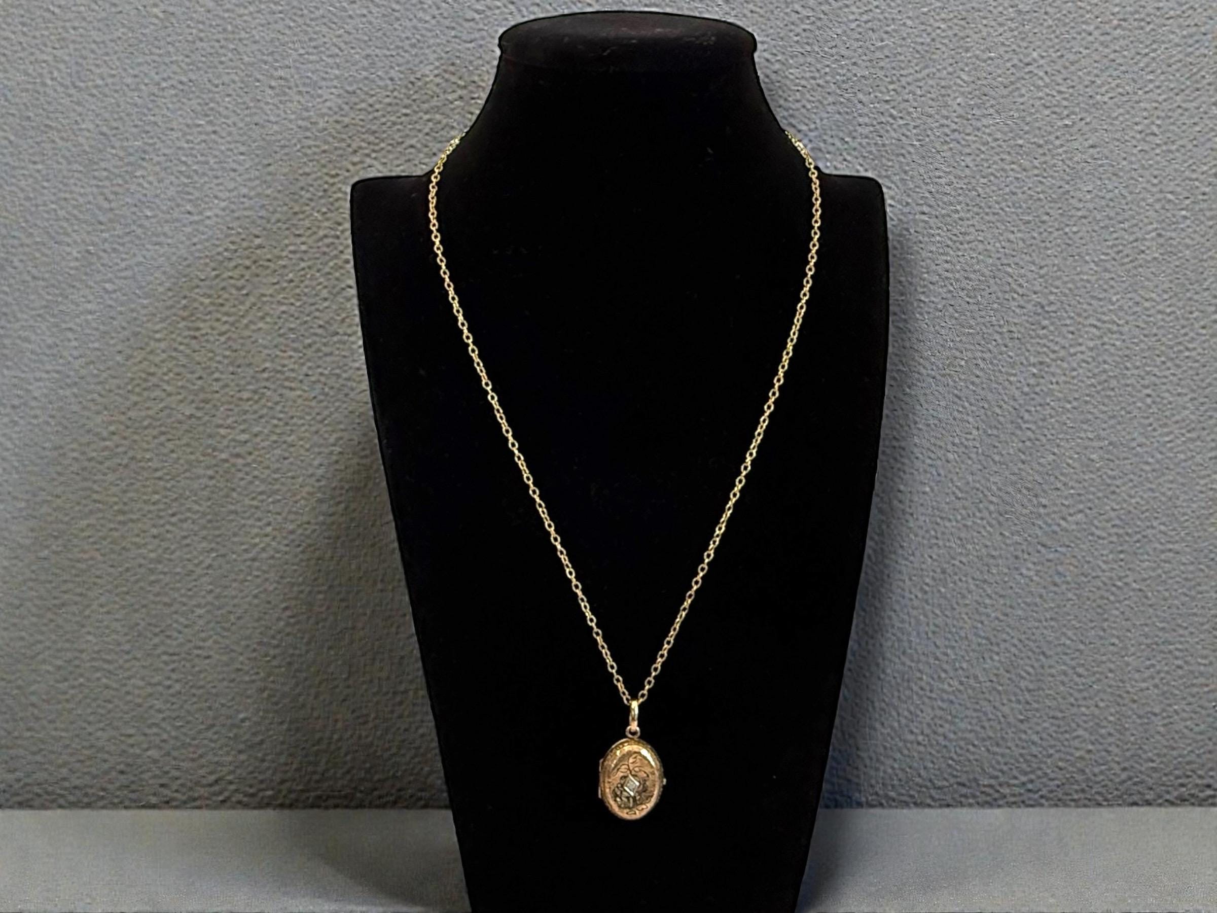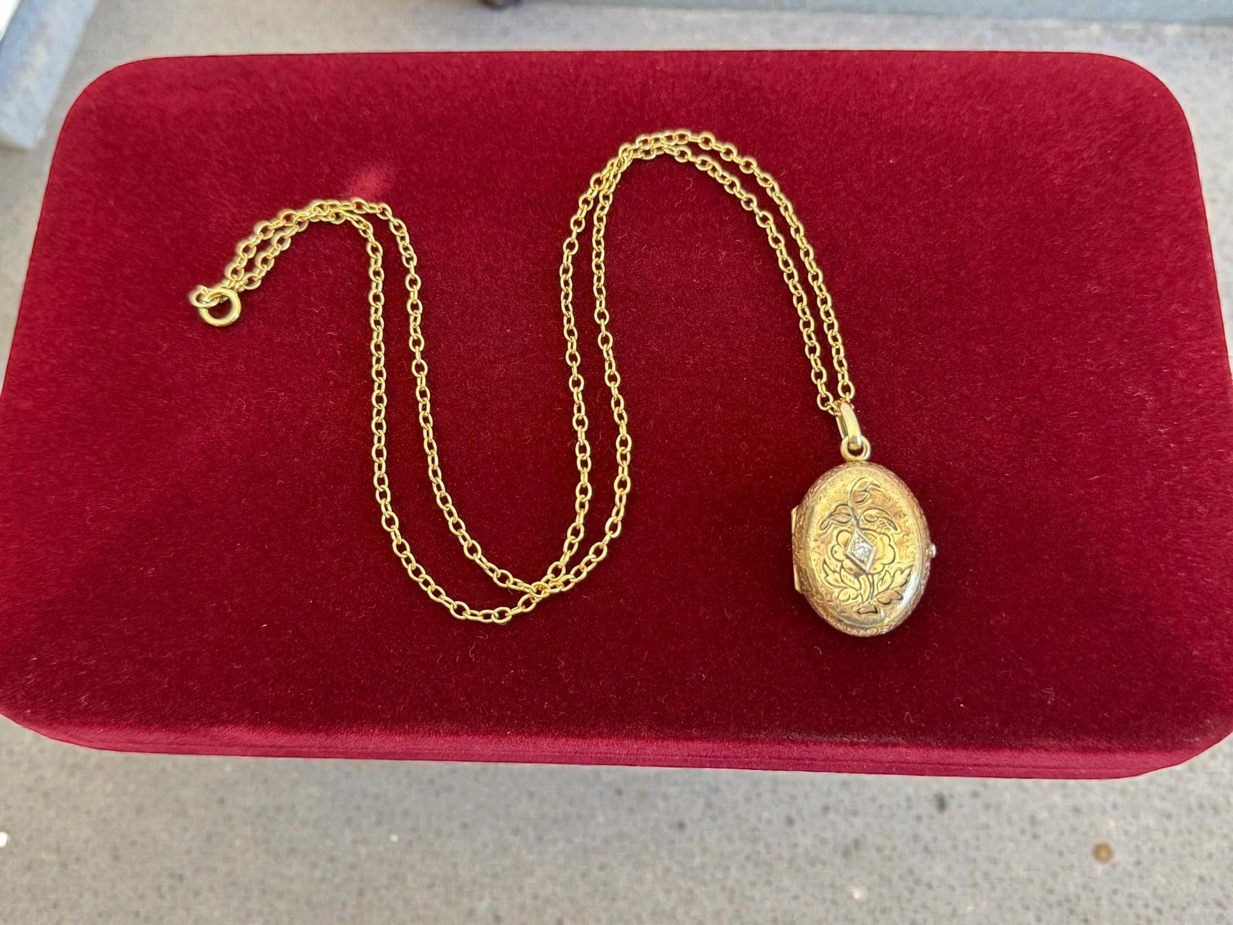 Victorian Mourning Locket: Etched Floral Design, Diamond Accent, 14K Gold Filled Chain