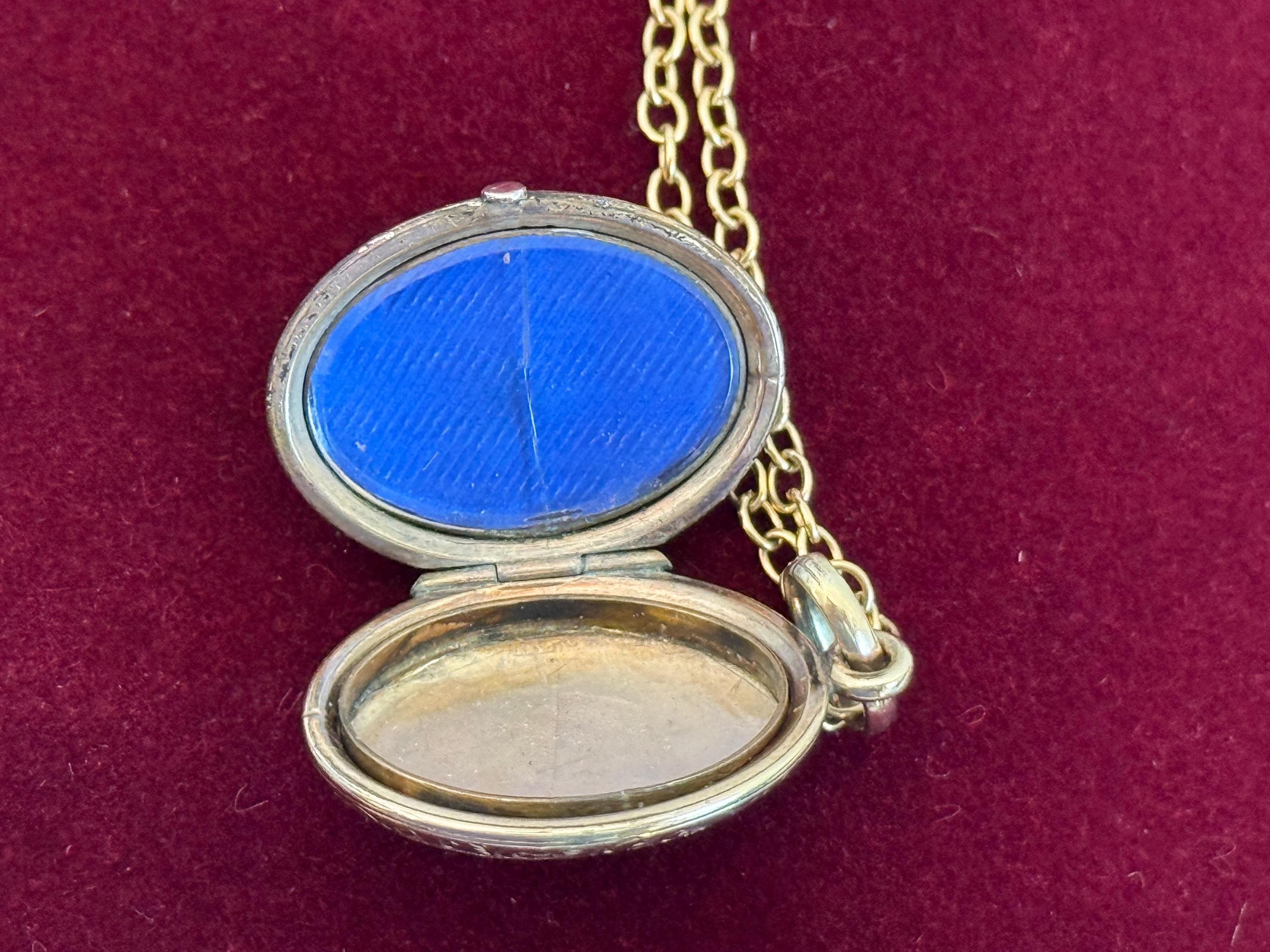 The reverse side of this antique locket has an ornate etched floral design that covers the complete back. The locket is slightly domed, and has 2 wells inside that have beveled glass covers. One side has a blue fabric backing under a beveled glass cover and the other side has only the frame.