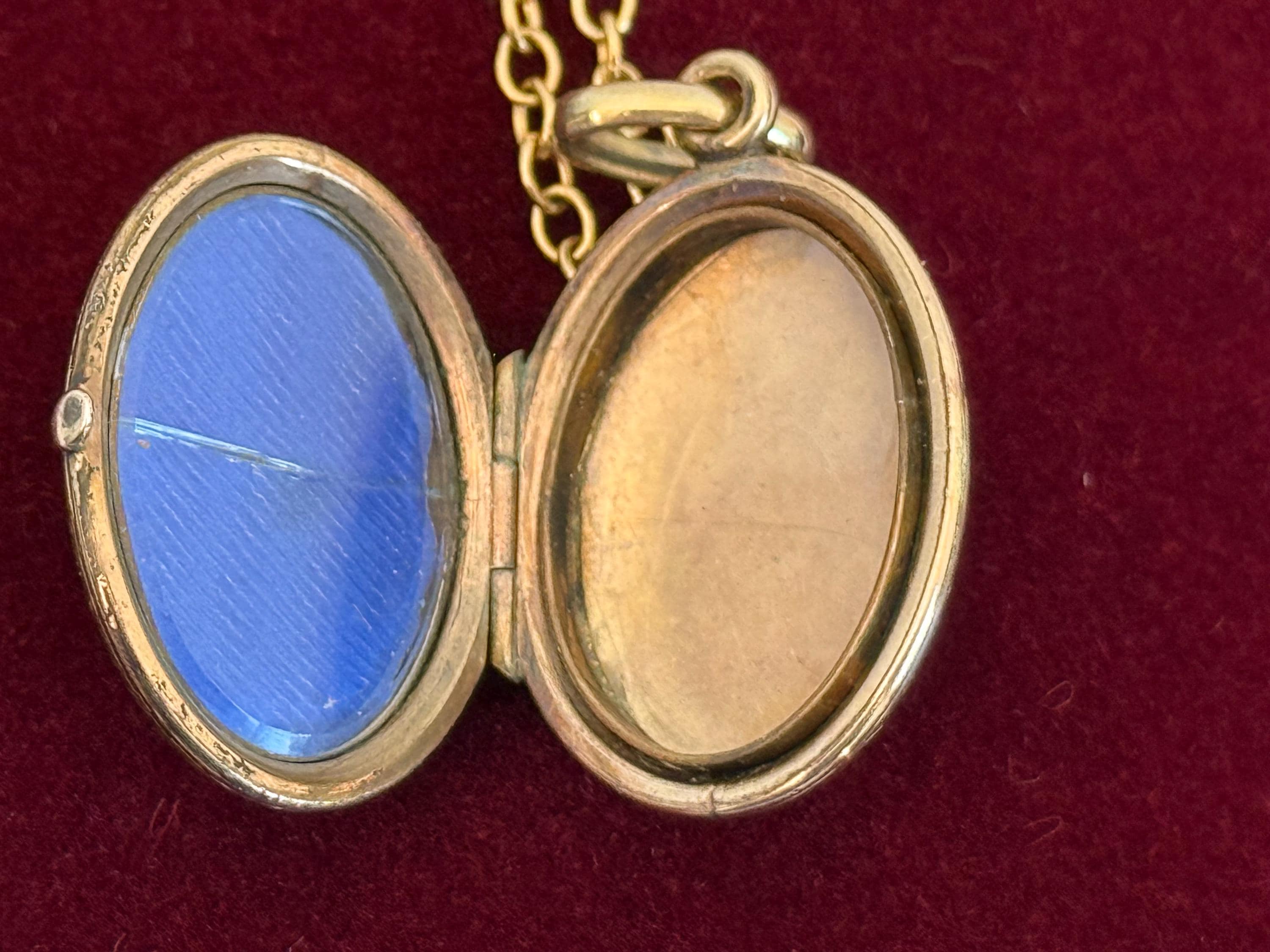 The locket is in nice antique condition with typical wear for an item that is circa late 1800s. The front has a slight concave shape (depression) where the diamond is set. The inner glass frame has a crack and inside, there is wear to the gold plate where the base metal is exposed. See photos for detail. The new 14K gold filled chain is in good condition.