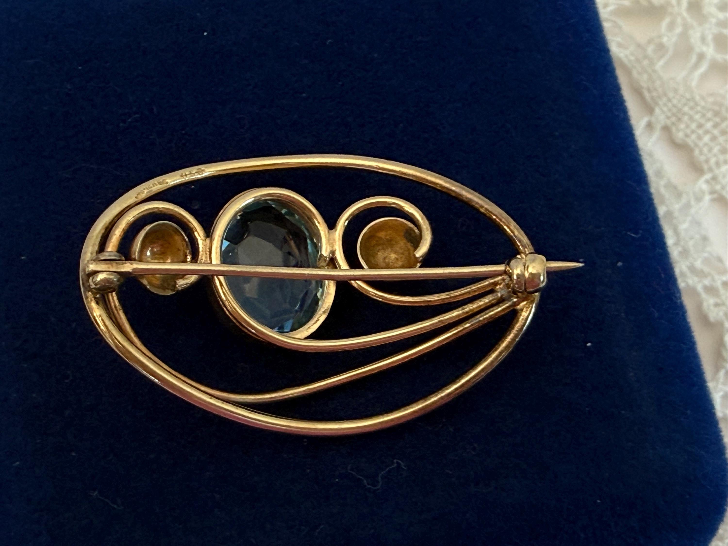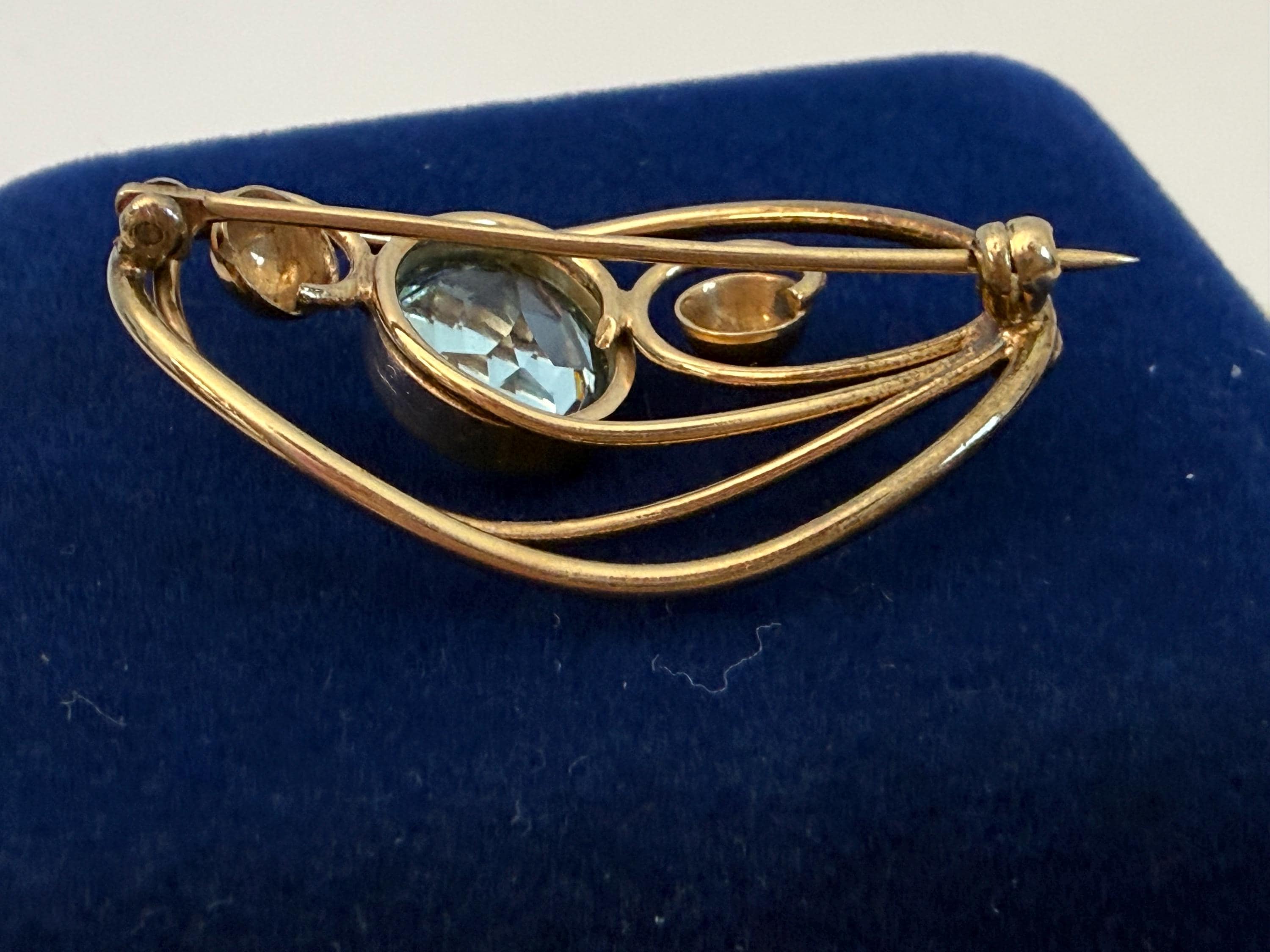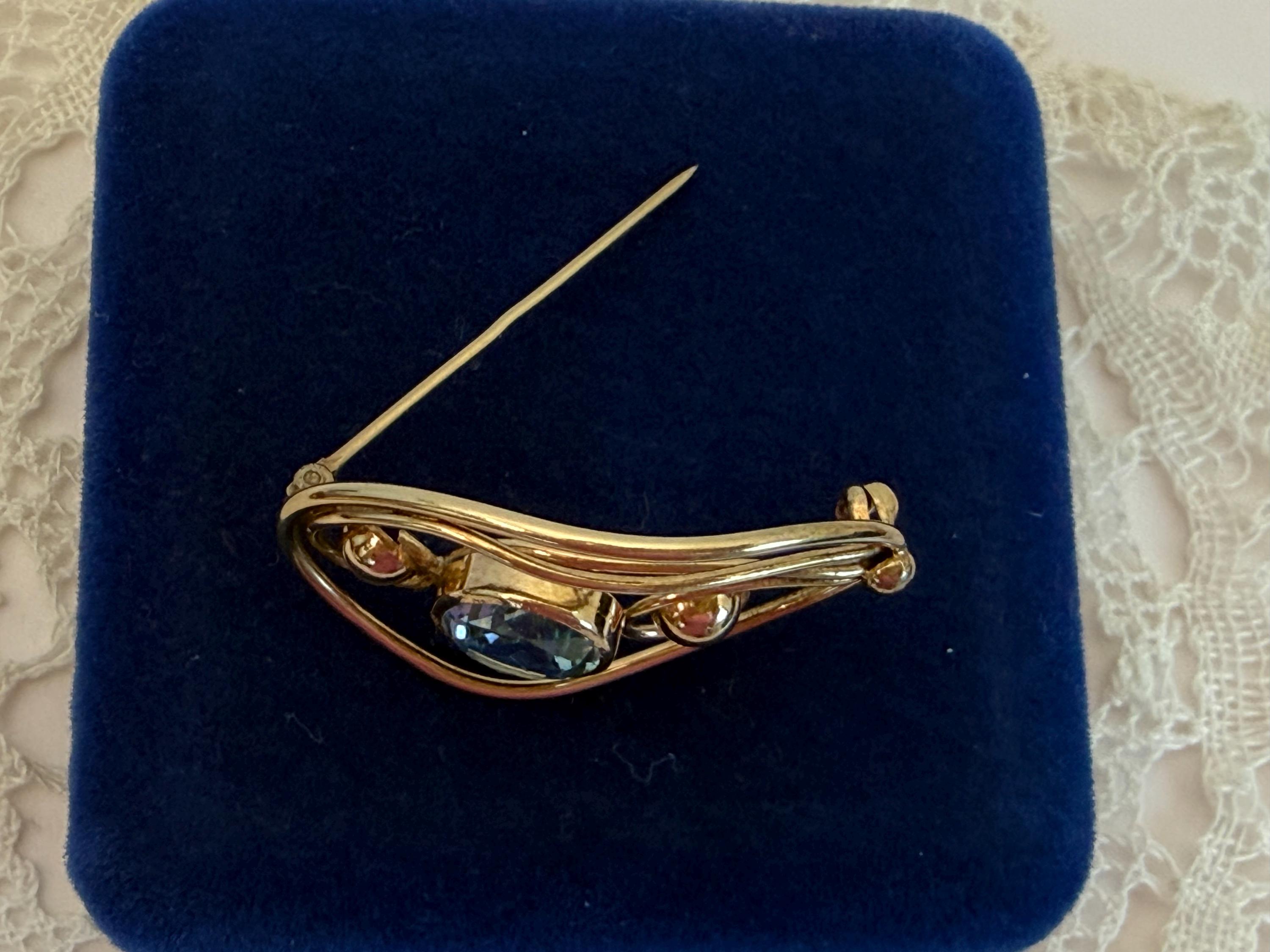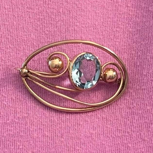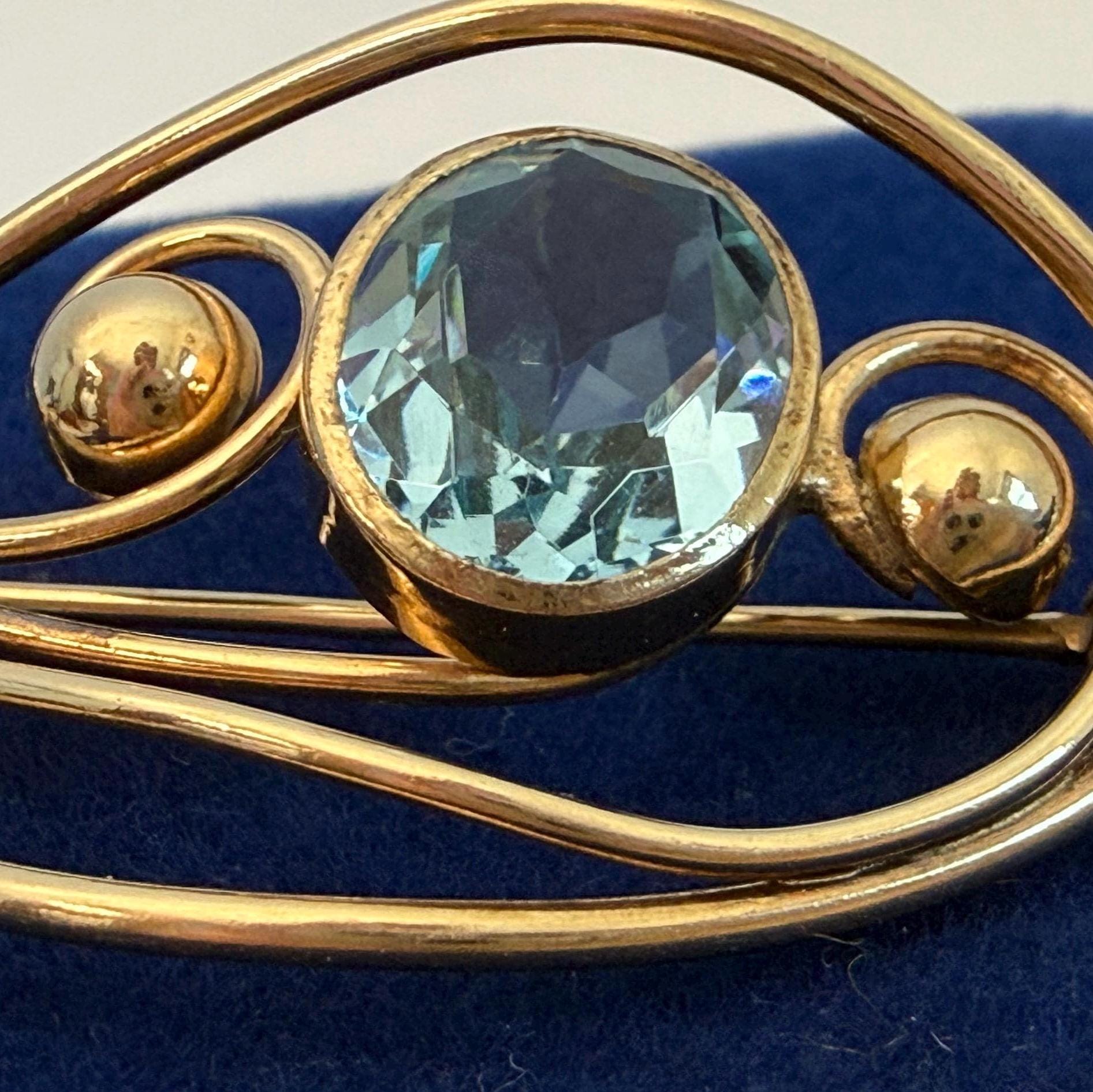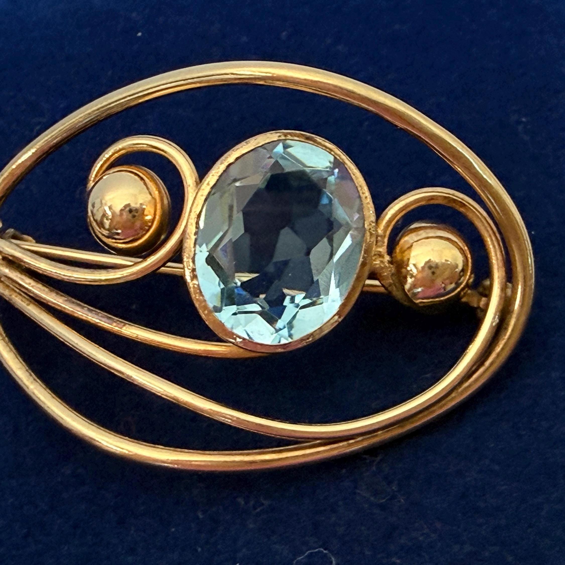Description: A vintage 12K gold filled brooch in an eye-catching design with an oval faceted simulated aquamarine (glass) gem. The oval shaped brooch has an older style C clasp (prior to 1930s when safety clasps were introduced.) It was made by the Harry S. Bick Company and is signed on the back.