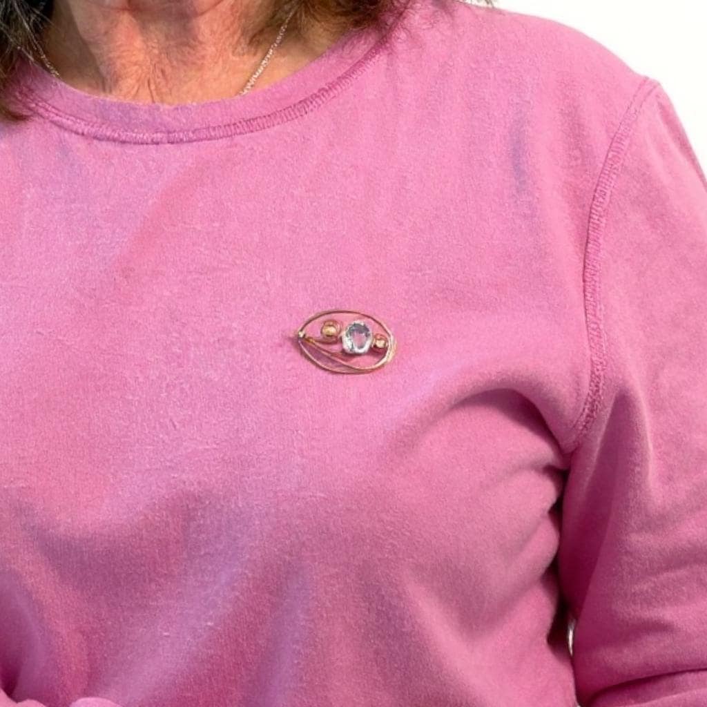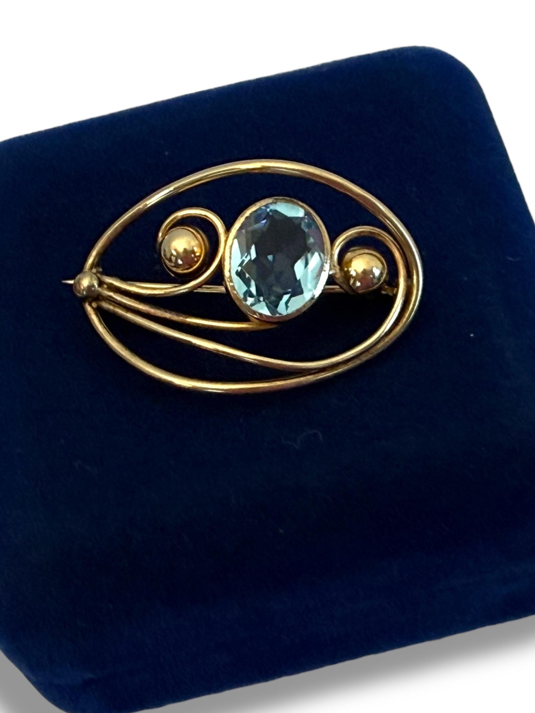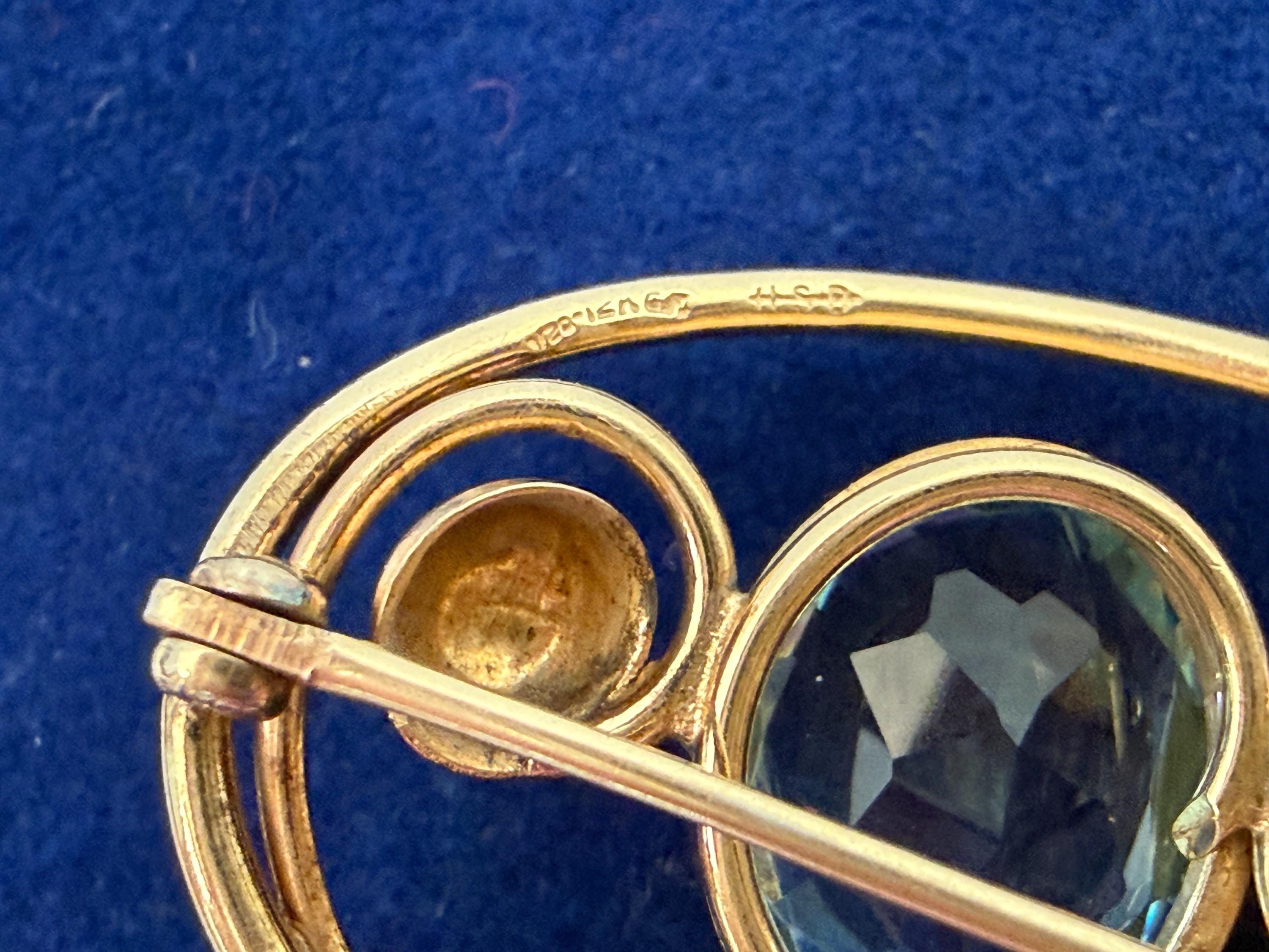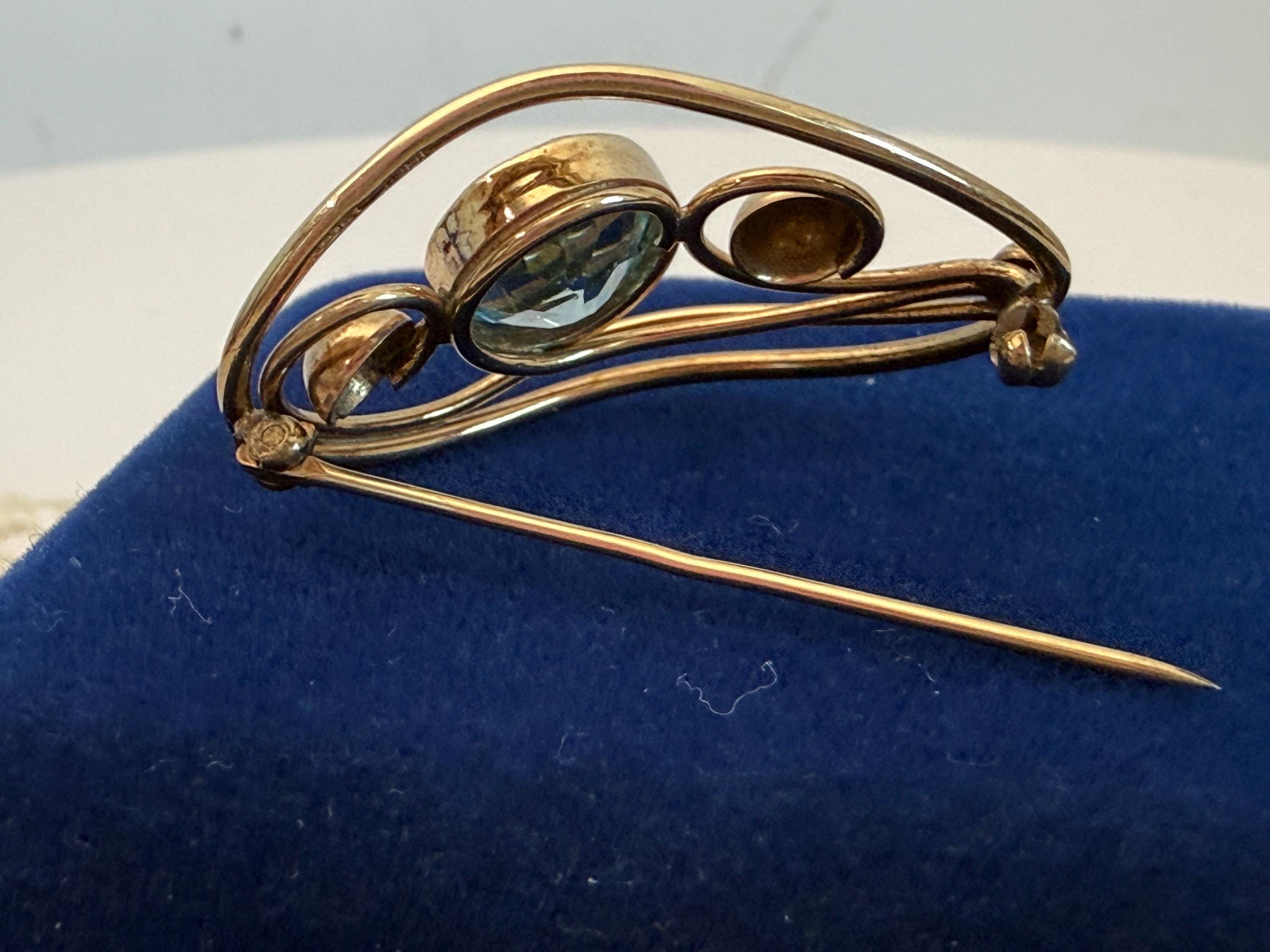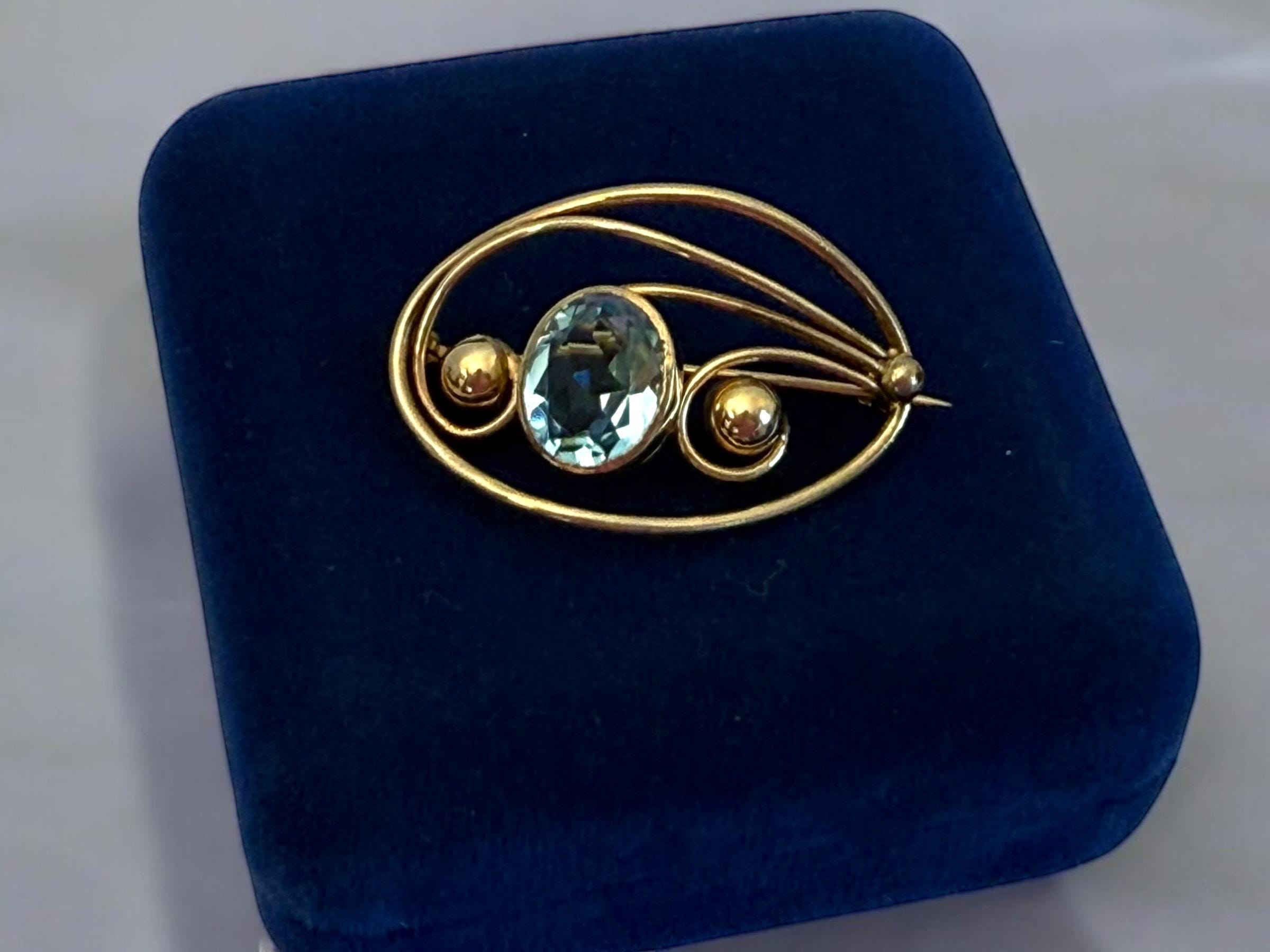 Description: A vintage 12K gold filled brooch in an eye-catching design with an oval faceted simulated aquamarine (glass) gem. The oval shaped brooch has an older style C clasp (prior to 1930s when safety clasps were introduced.) It was made by the Harry S. Bick Company and is signed on the back.