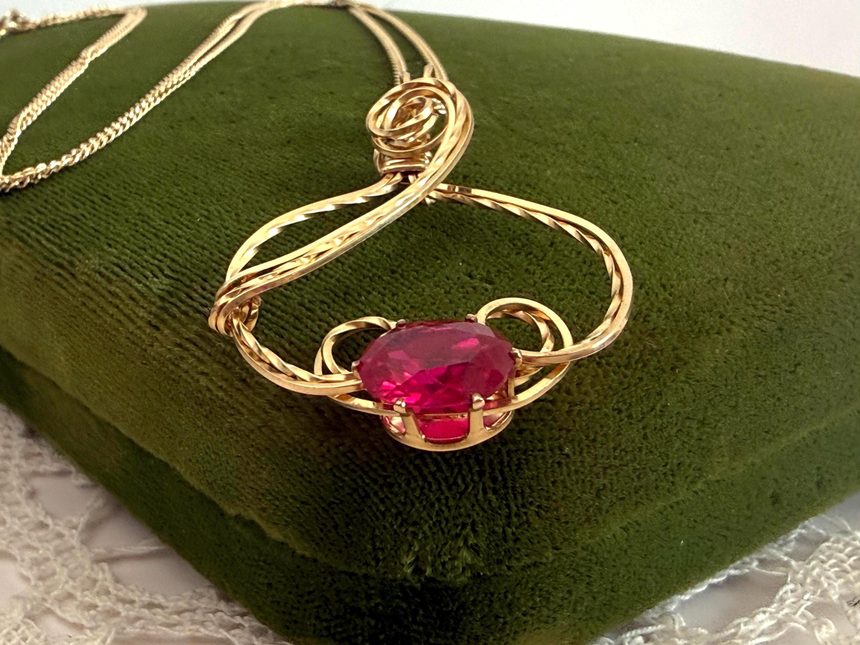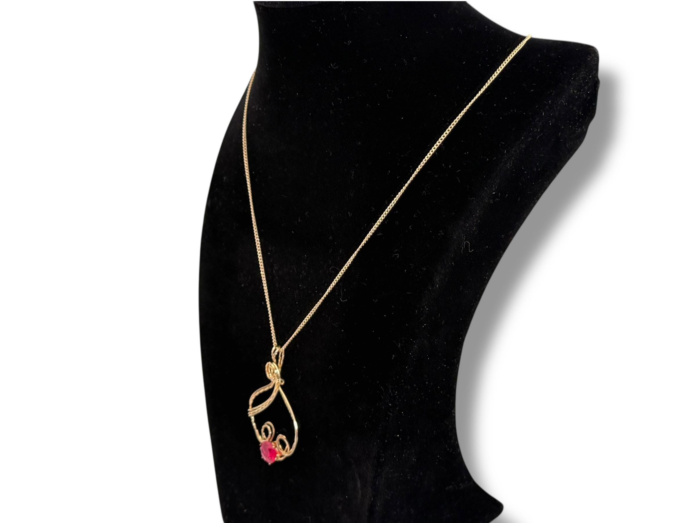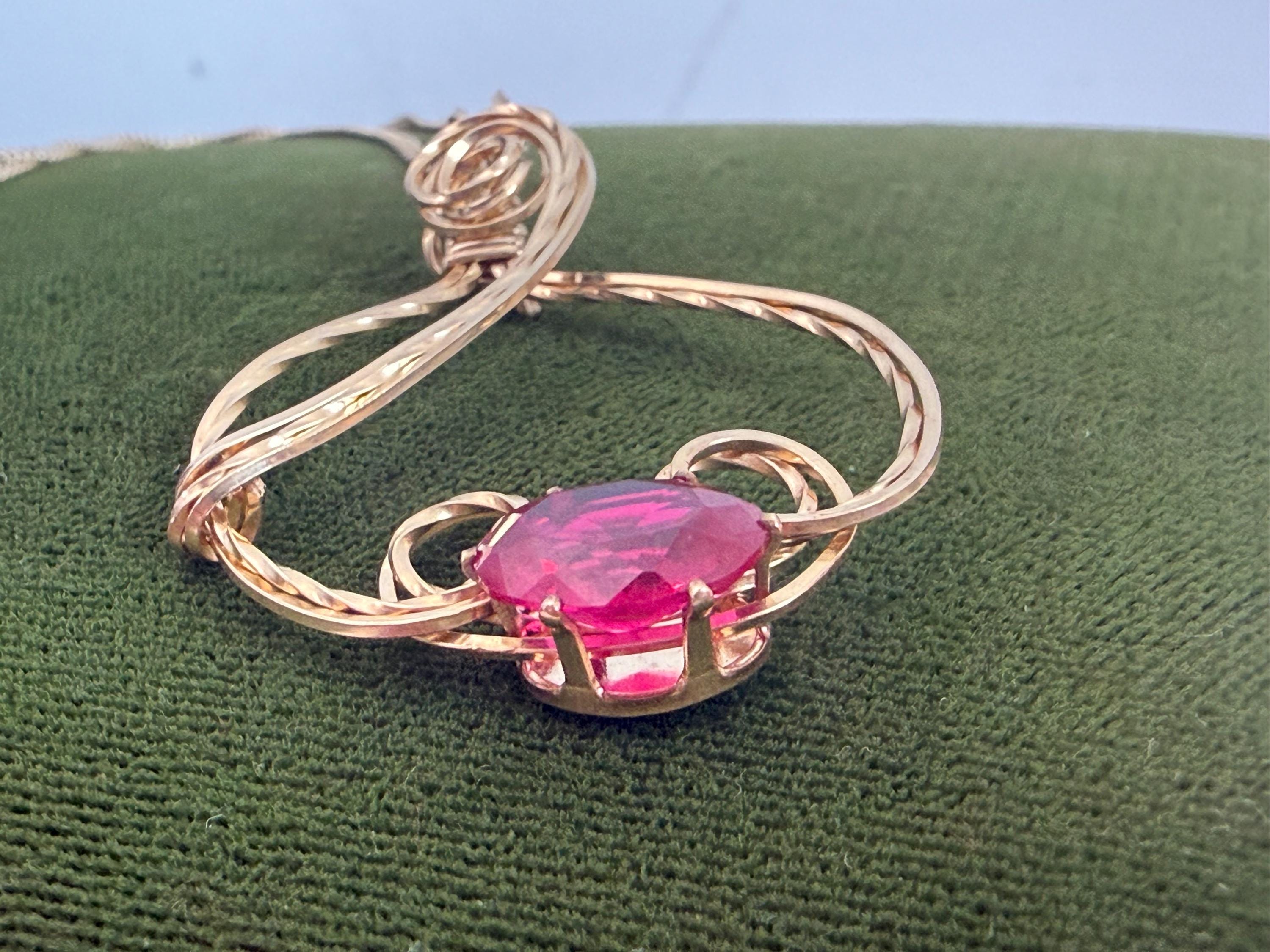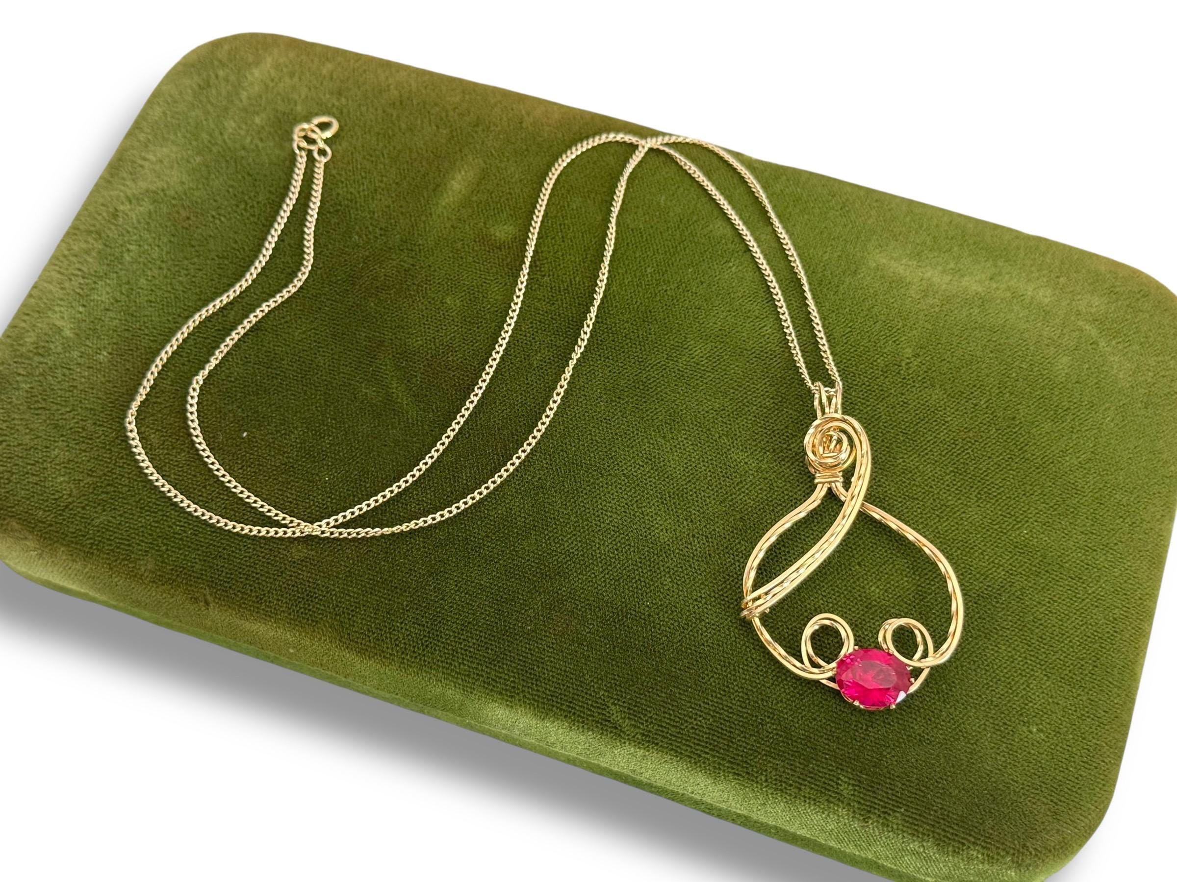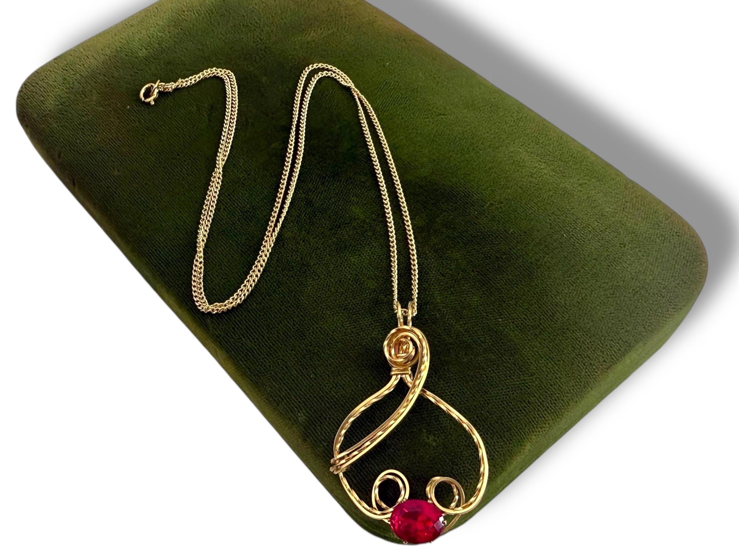 Beautiful vintage and very unique gold filled pendant with a very dark red/pink lab created ruby at the bottom in an openwork frame. The stone is prong set. The mod pendant hangs on a new 14K gold filled curb chain.