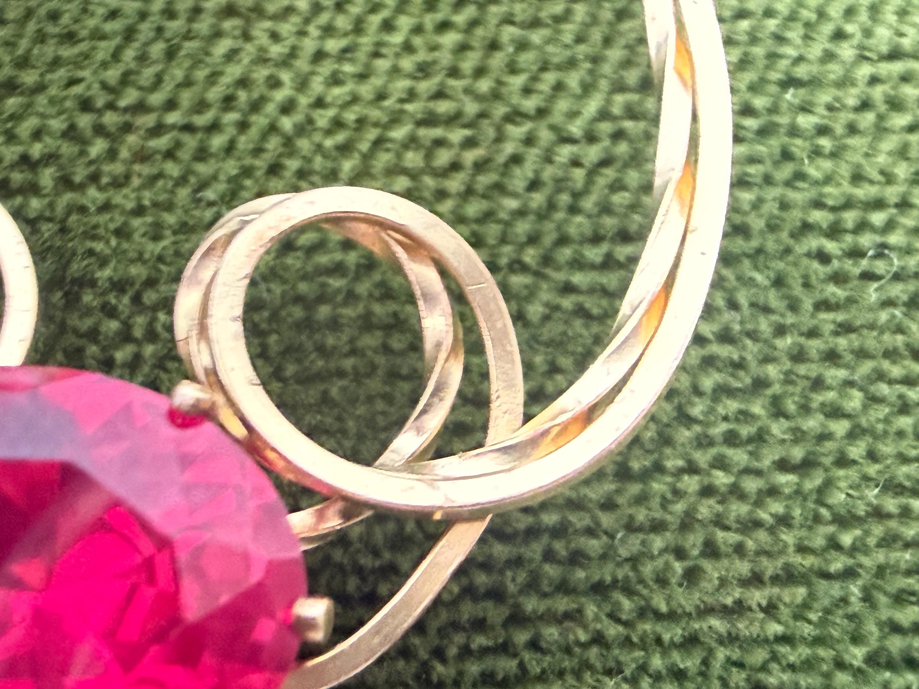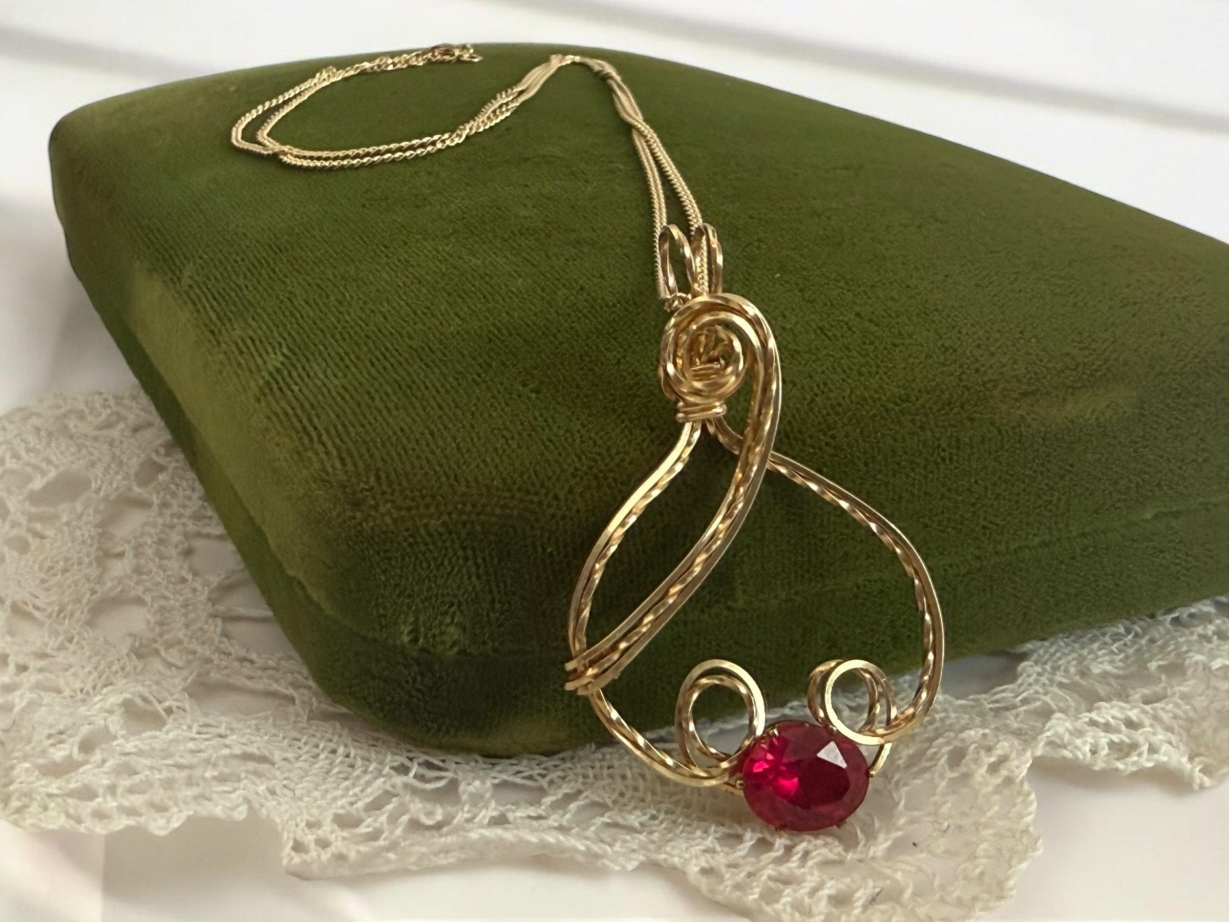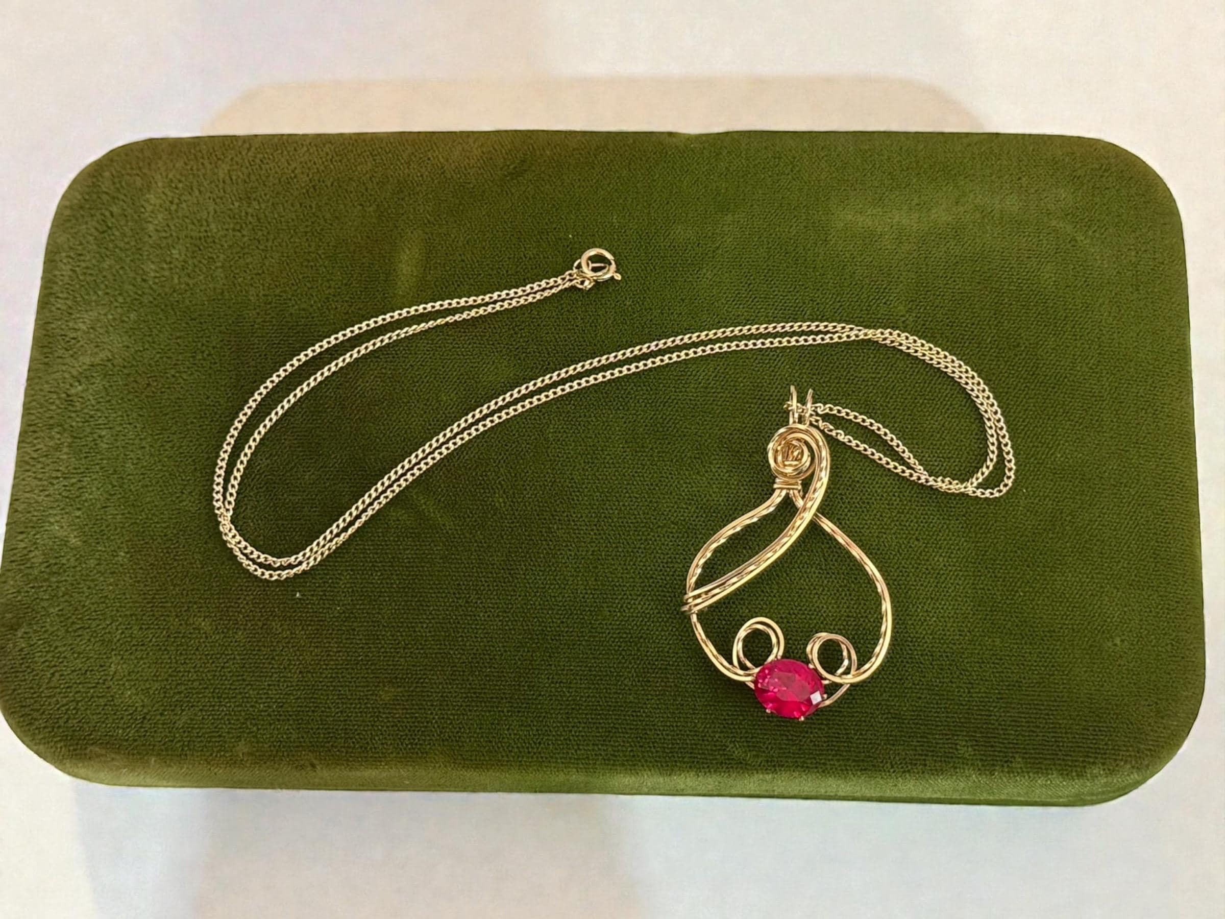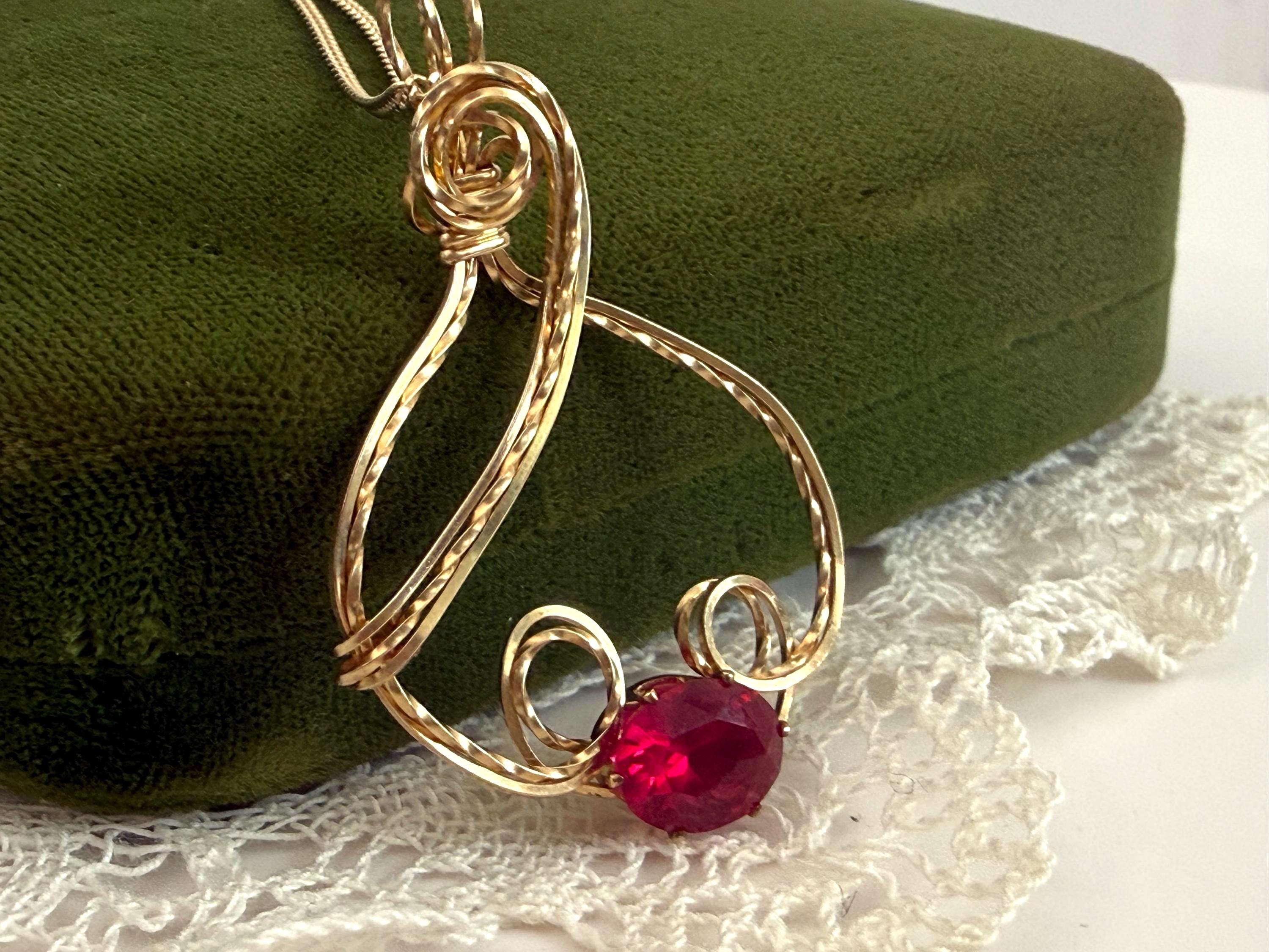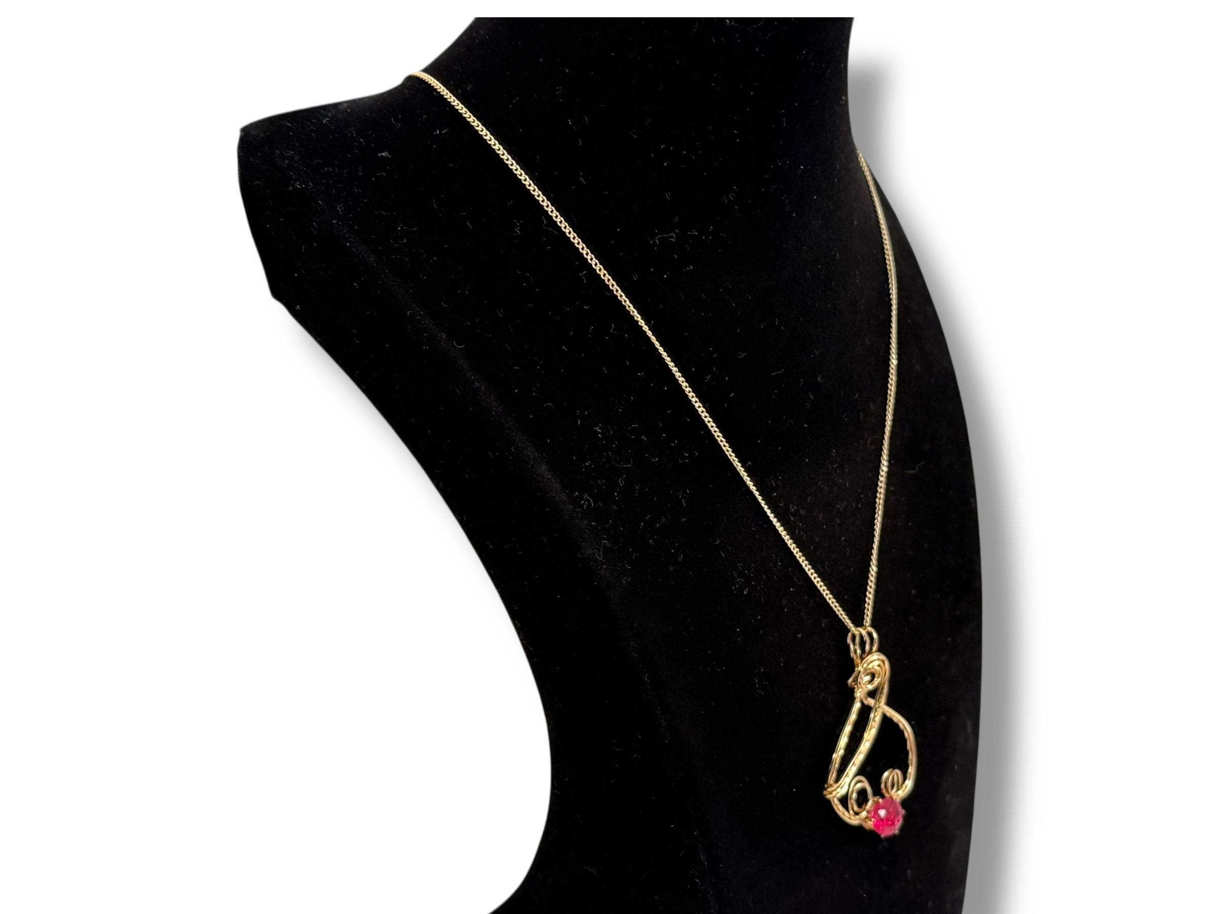 Beautiful vintage and very unique gold filled pendant with a very dark red/pink lab created ruby at the bottom in an openwork frame. The stone is prong set. The mod pendant hangs on a new 14K gold filled curb chain.