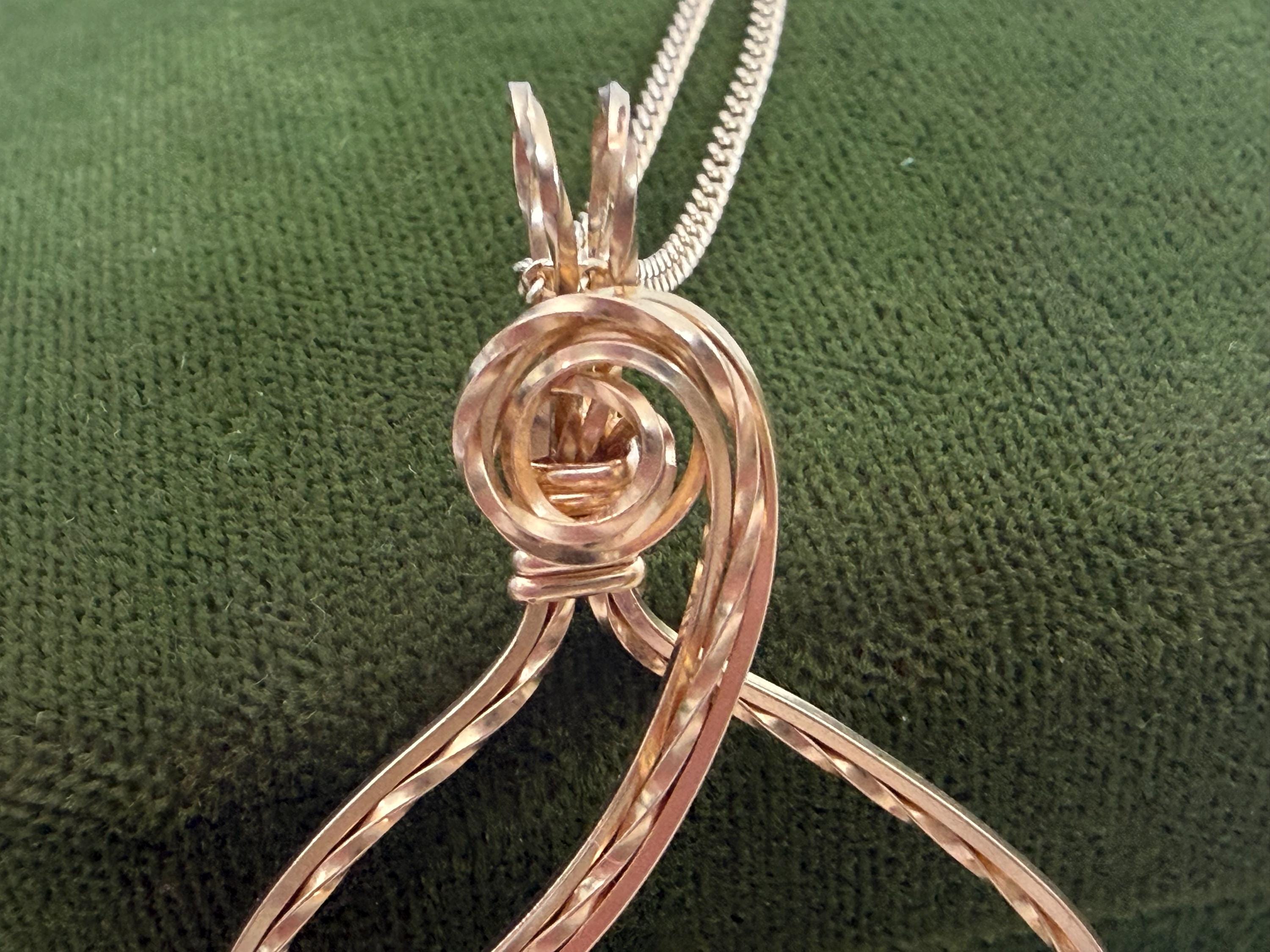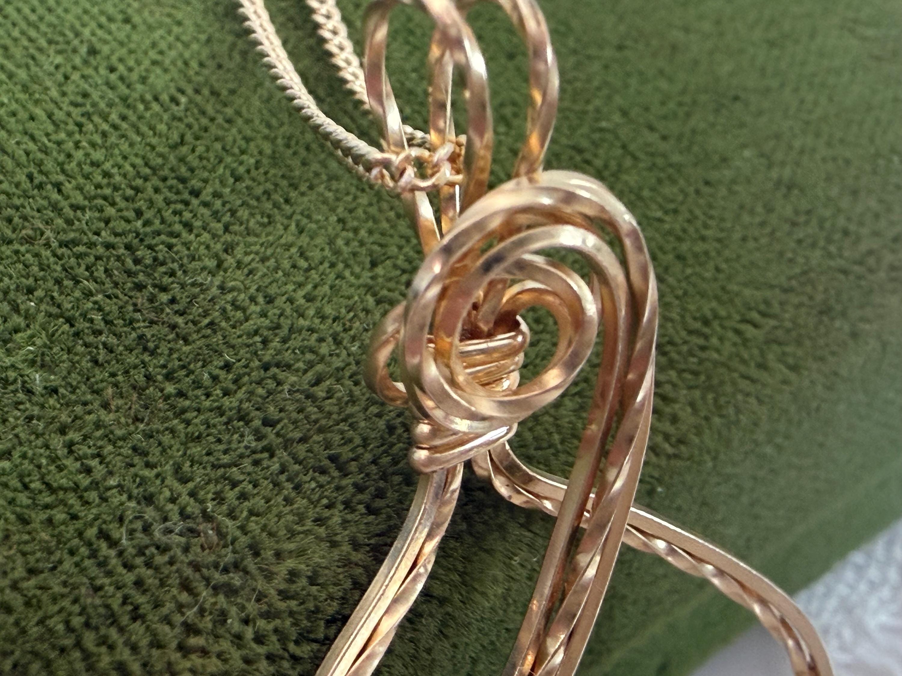 The pendant hangs on a 14K gold filled twisted rope chain. The spring ring clasp on the new 20” long chain closes securely.