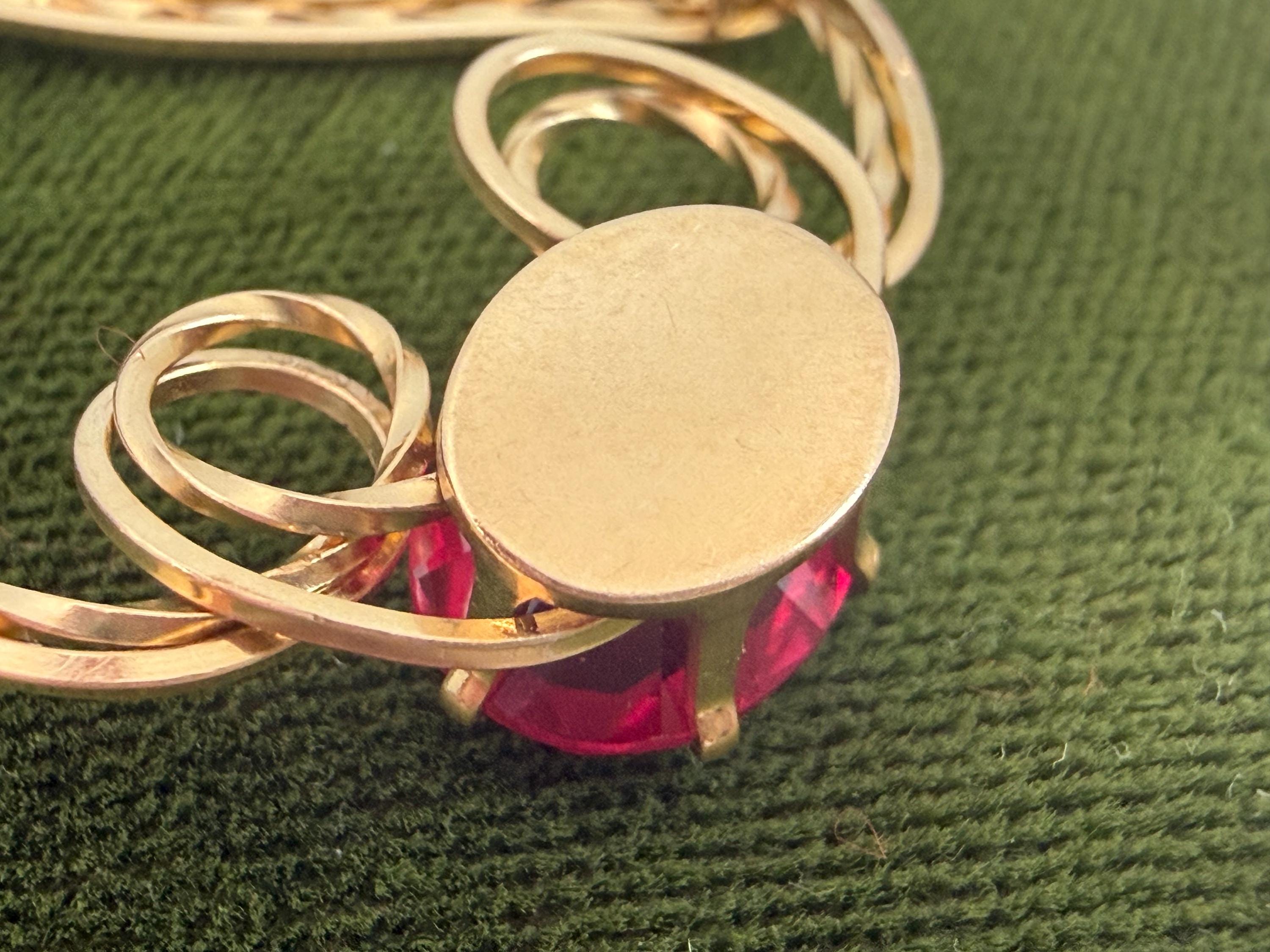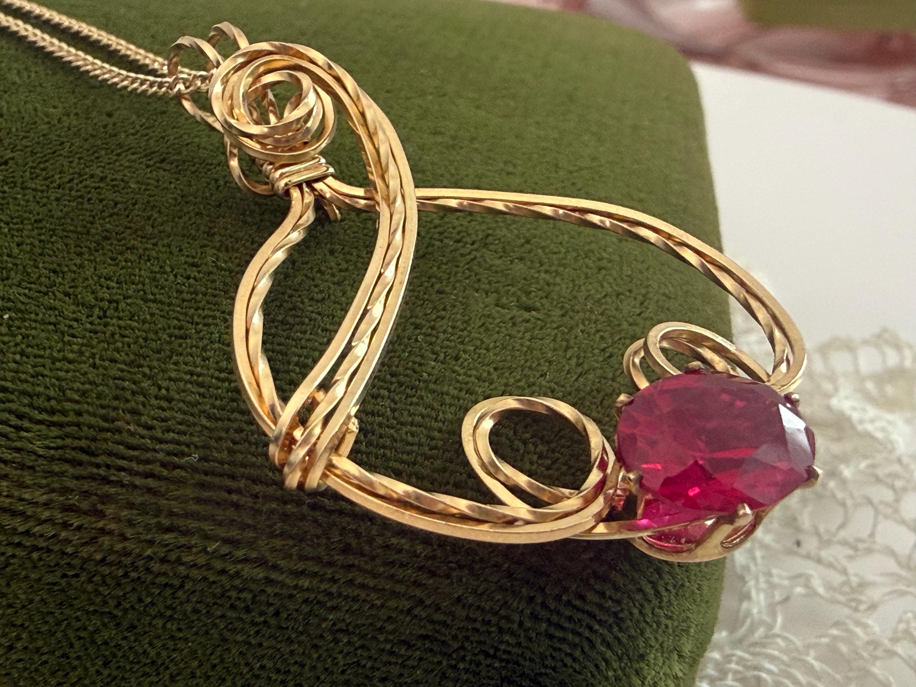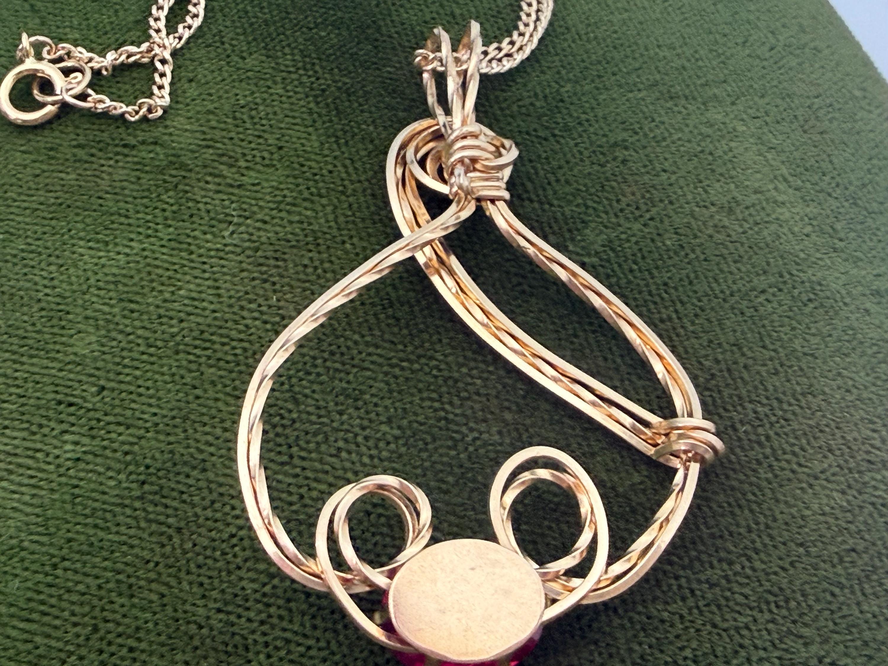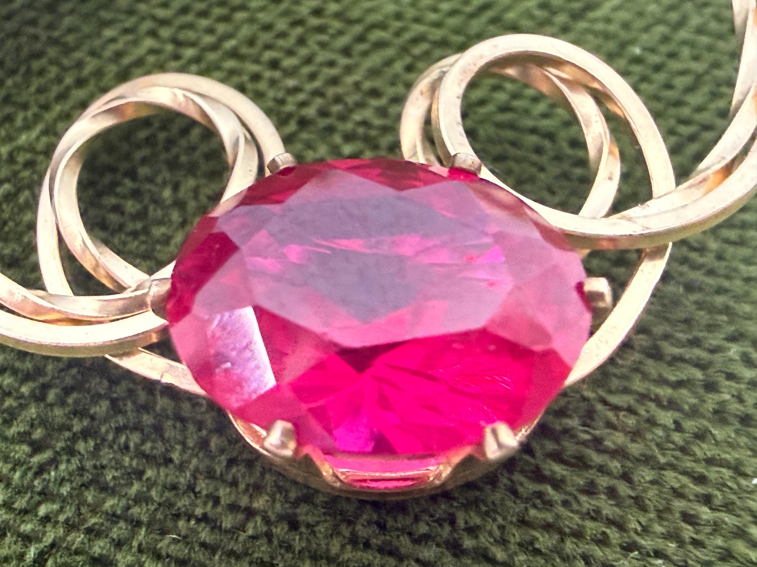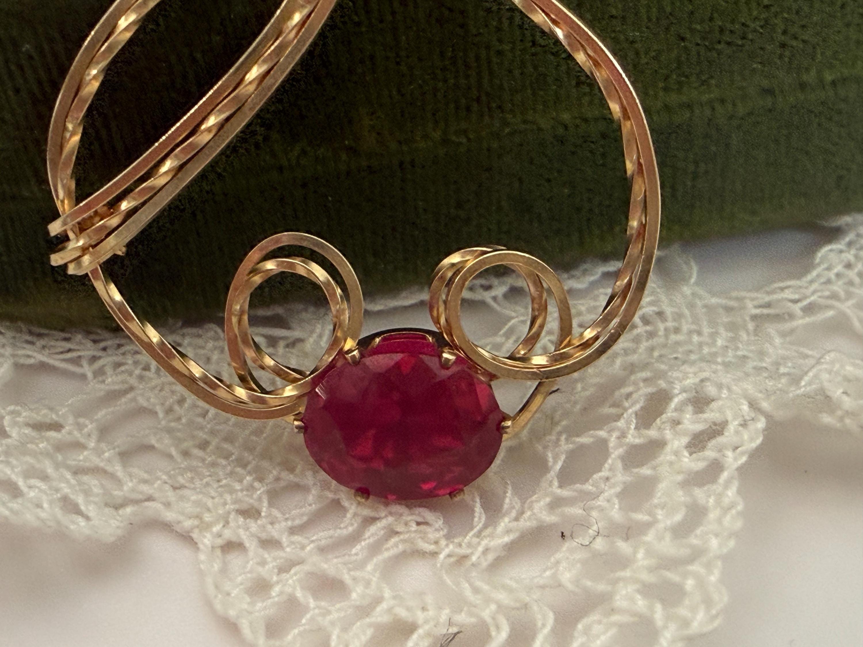 Vintage Open Work Pendant Necklace: Dark Pink / Red Gem on 14K GF Chain